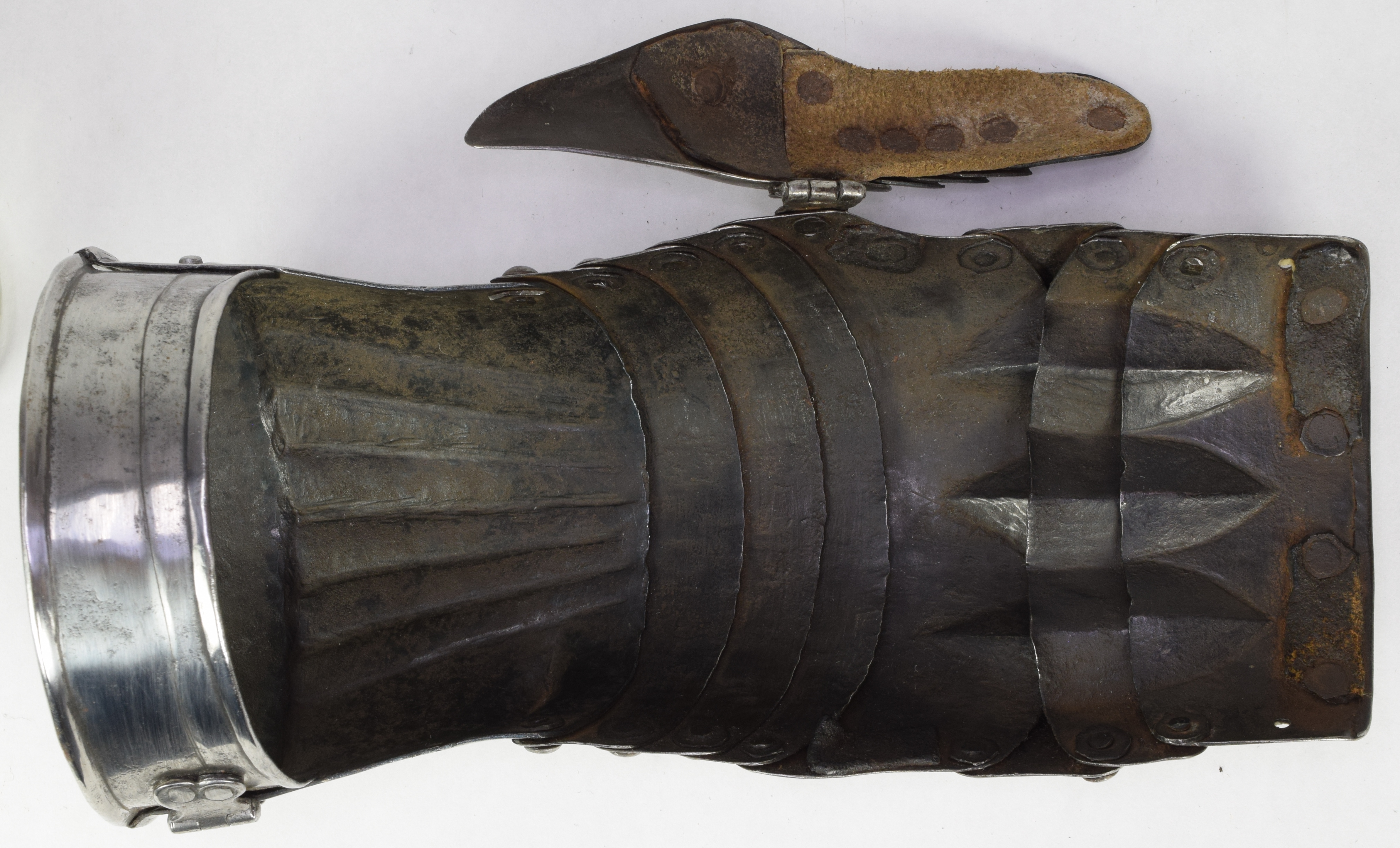 Gauntlets of steel. Very early 'Maximilian' form. Narrow cuff of close-fitting form. Inner plate opens on a hinge and spring-pin. Recessed border and simple spray of flutes. Metacarpal of 3 narrow lames and one larger lame near the knuckles. Knuckle plate formed with a rounded ridge over each knuckle. Base of the fingers covered by 2 mitten plates. The large metacarpal and final finger plates are fluted in a 'V' to fit to the knuckle plate. The base of the thumb covered by a plate hinged to the main metacarpal plate. Remainder of the thumb covered by a series of overlapping plates rivetted to a leather base. The form of the finger covering is a simple form that would have been used in lower quality or infantry armours. The main form of the gauntlets is similar to the pair of gauntlets on a harness in the Waffensammlung of the Kunsthistorisches museum in Vienna - illustrated on plate 104 (harness described on page 228-9). Cleaned. Small thumb plates, rivets and most leathers restored.