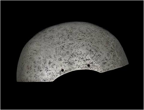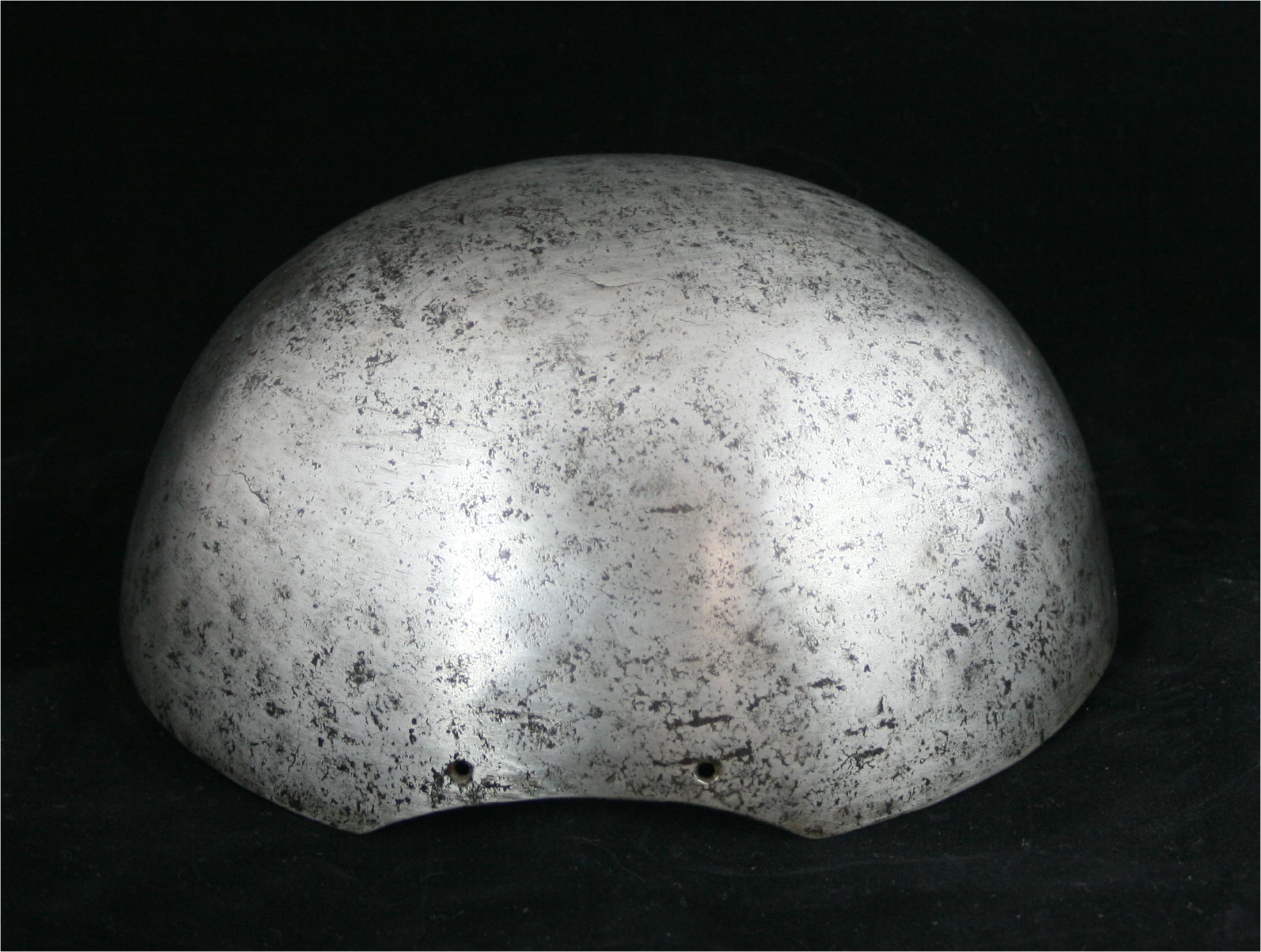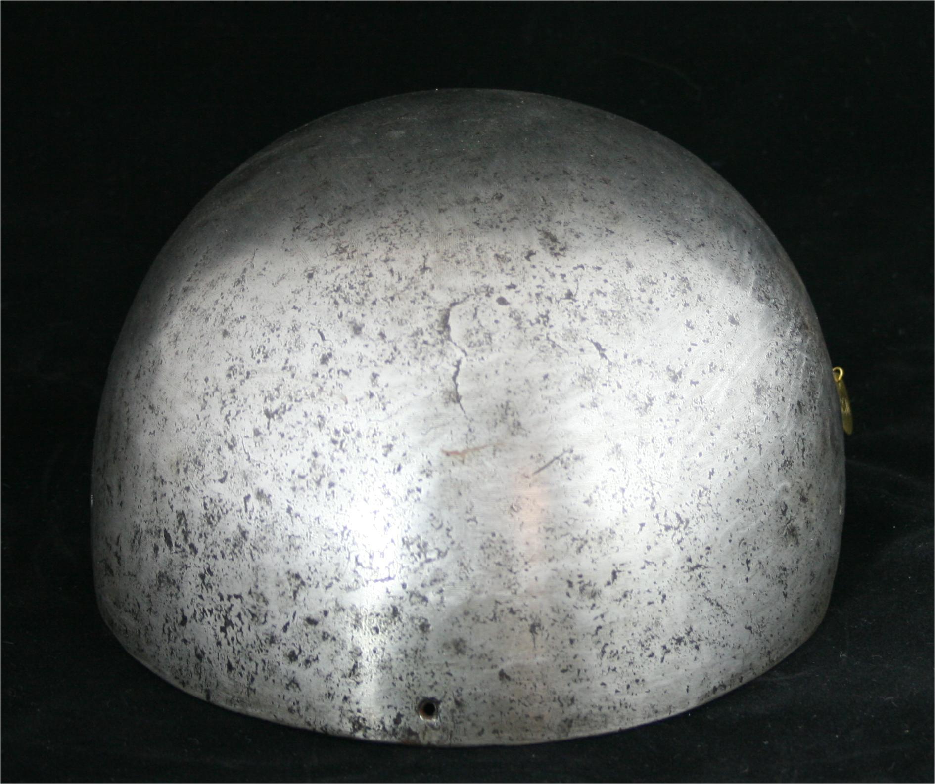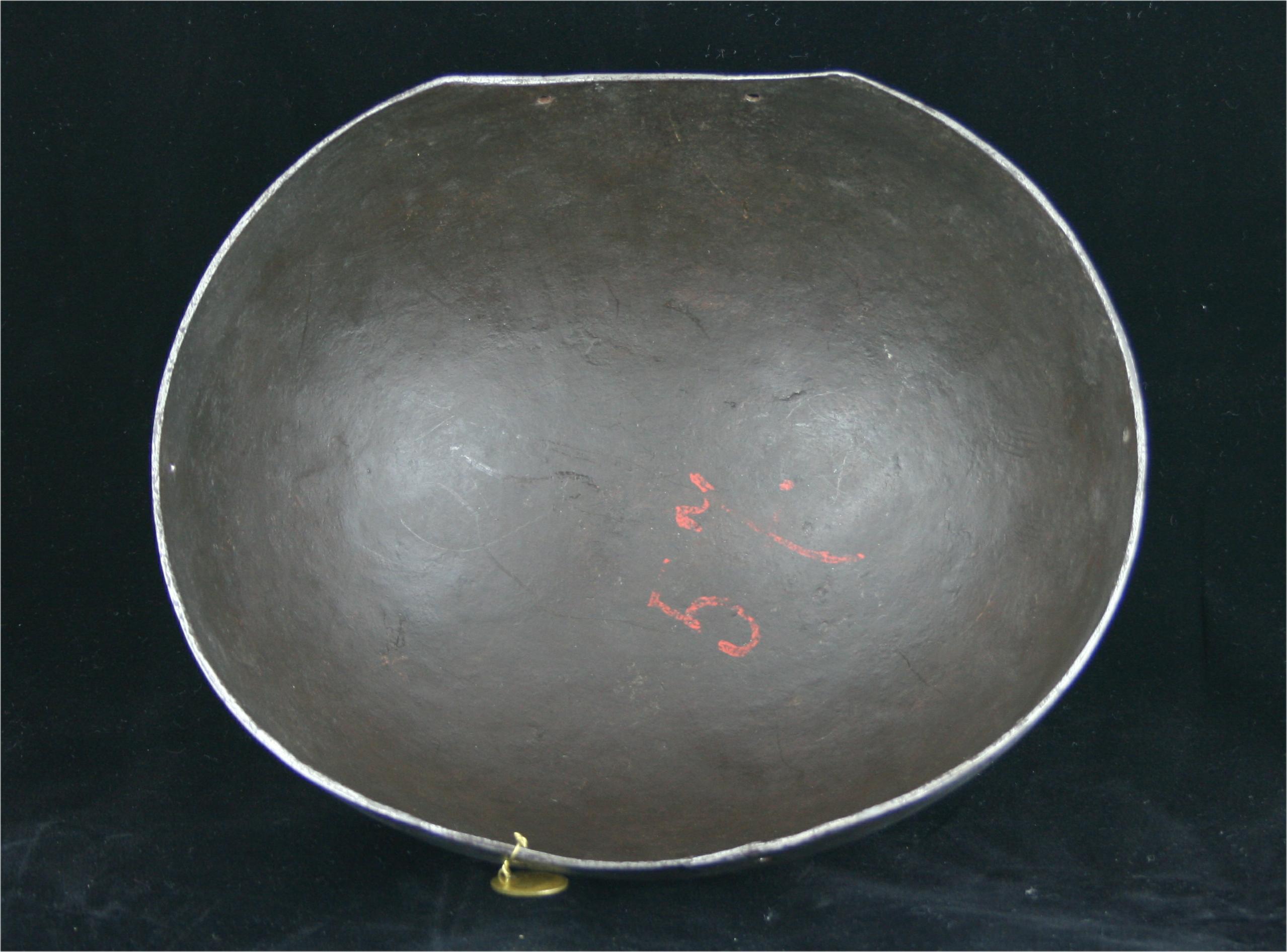 One piece bowl cut out over the ears. Pierced with 2 small holes above each ear and one at the front and back. Painted with 57 inside. Brass tag stamped 650 attached to one side.