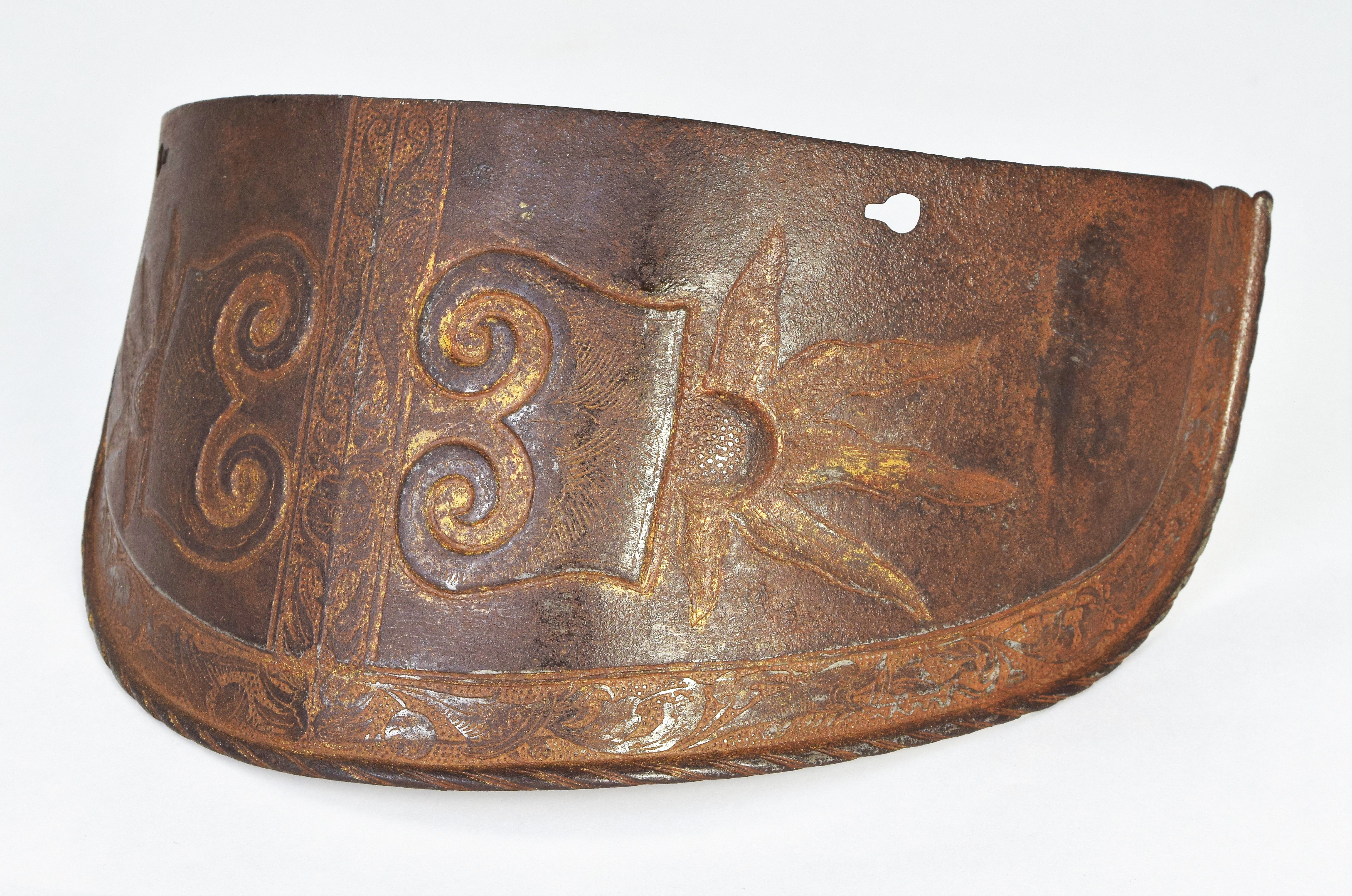 Single plate. Inward turned roll around the bottom edge extending up the sides. For the left leg. Two keyhole slots at the top for attachment to the upper tasset plates. Embossed and recessed decoration with etching. Recessed border around the edge with etching. Central band of etching. Purportedly from the Madrid Real Armeria after the Spanish Civil War (according to the seller), also attributed possibly to the Lisbon armoury. The decoration on each side is a fire steel and stone creating fire. This symbol is associated with the Order of the Golden Fleece.