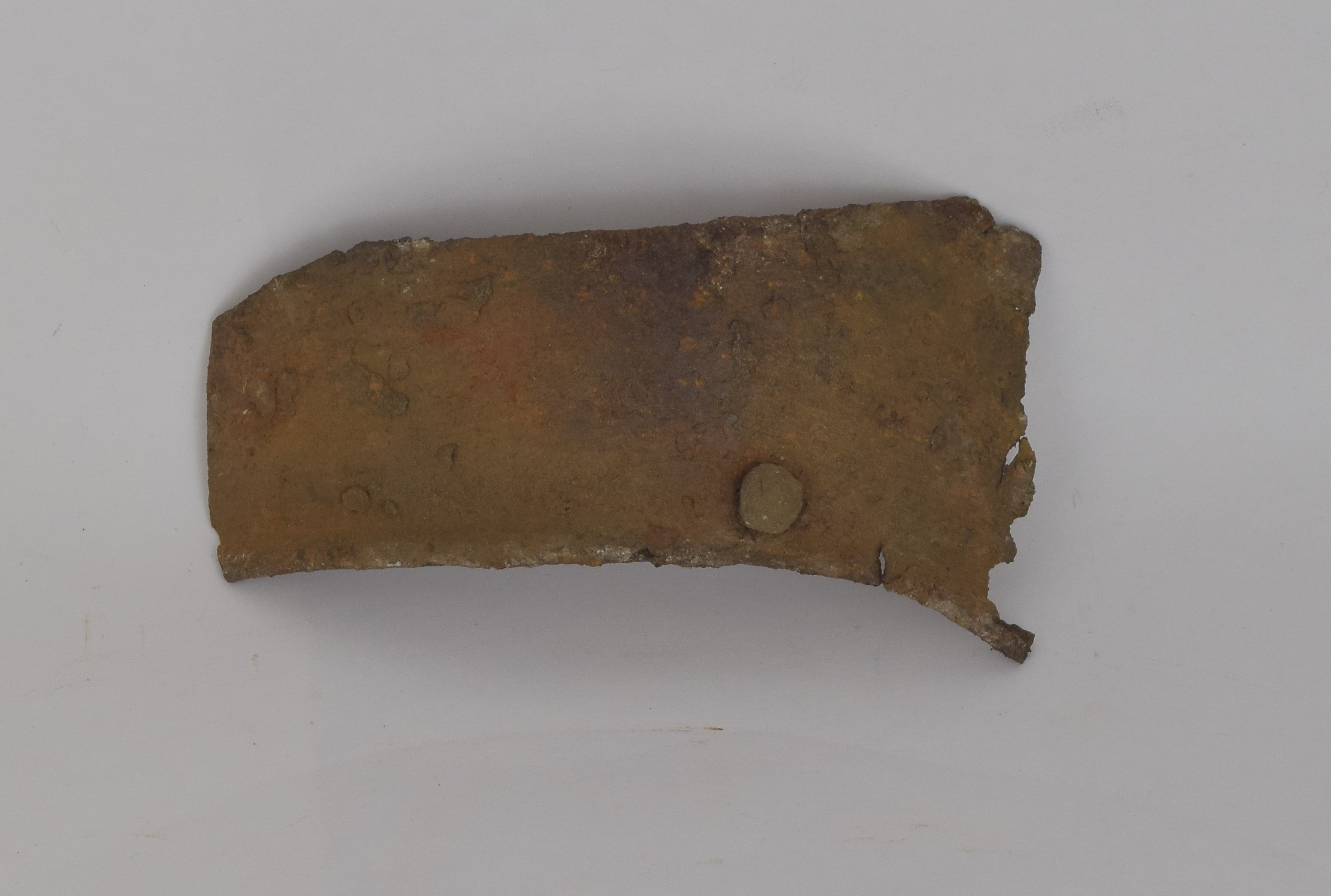 Broken and oxidized. Covering the inner arm above the elbow. Lower edge with a narrow inward turned rolled and roped border. From the personal collection of Claude Blair.