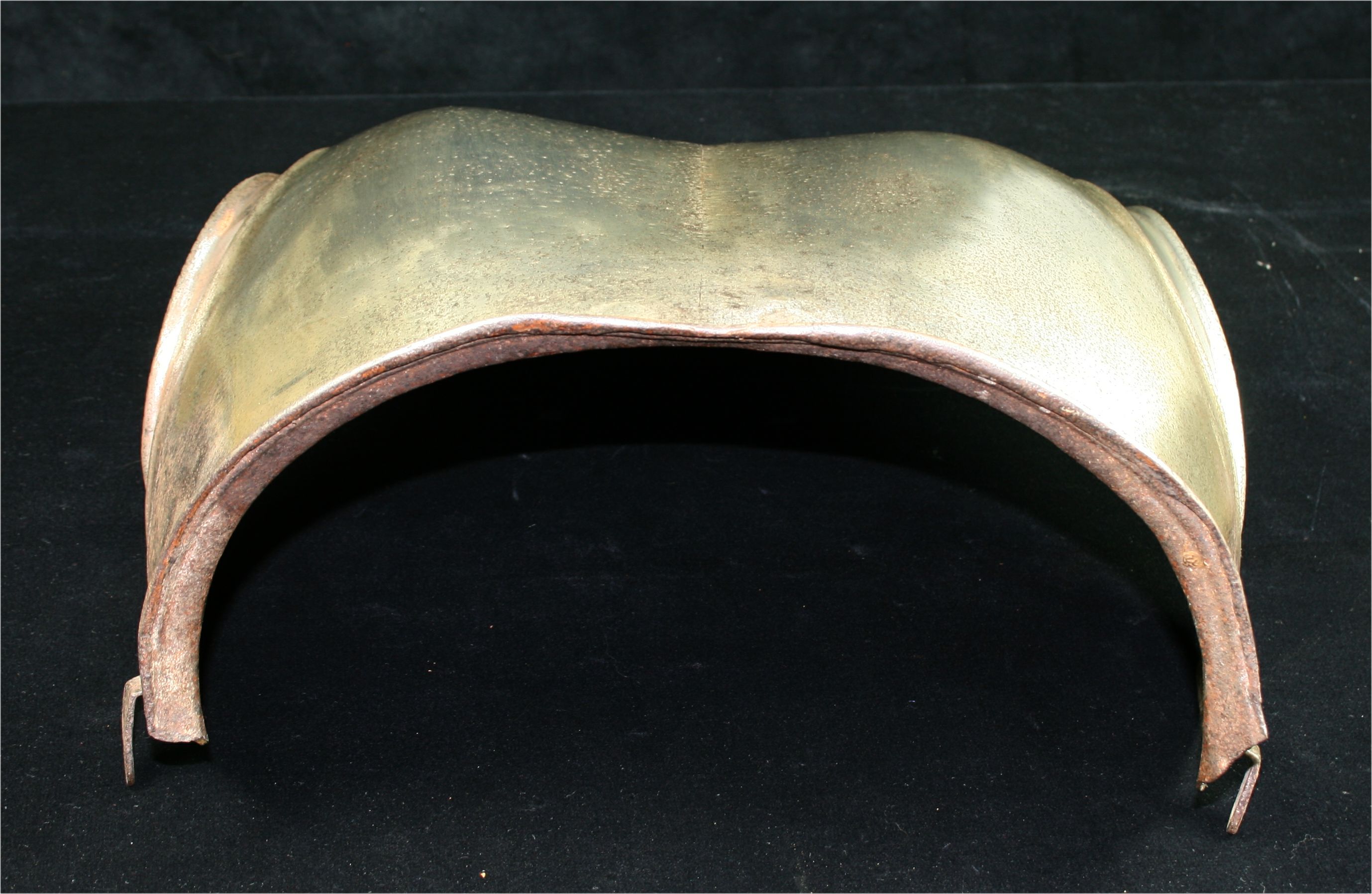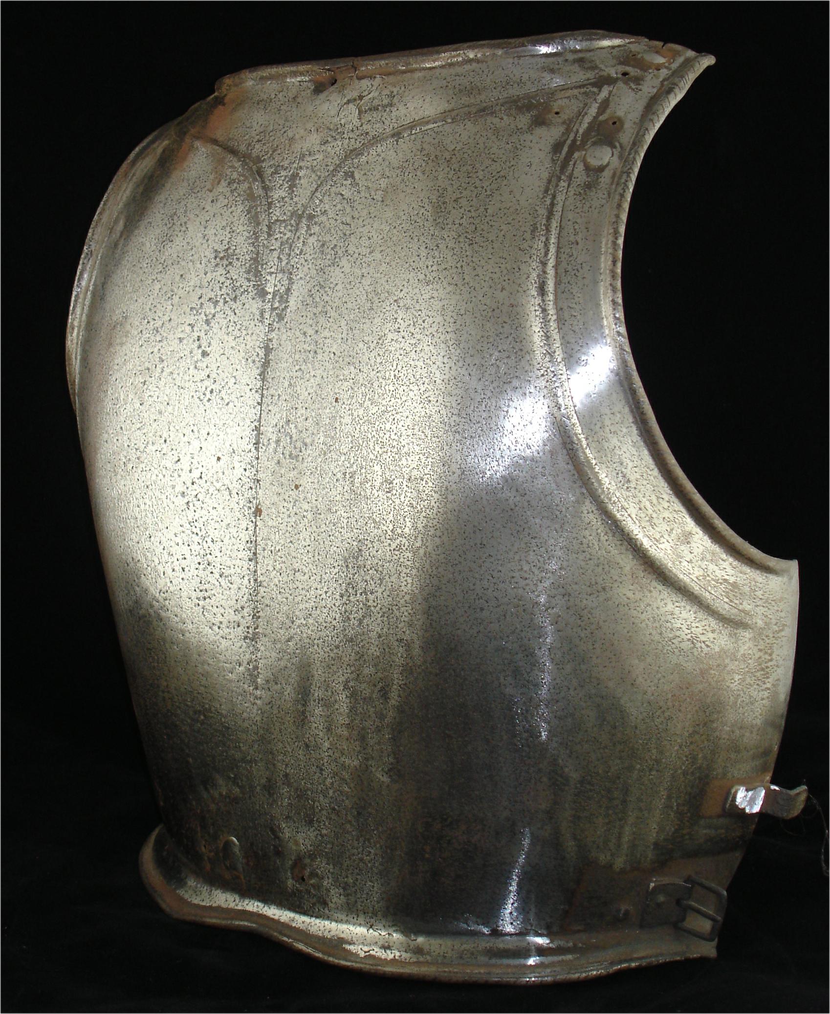 Good form, designed for use without a fauld. Arm, neck and bottom edges with rolled and slightly roped borders. Arm and neck rolls formed over wire, the roll on the waist flare is smaller in diamer and shows no sign of ever having wire inside. Raised decorative bead running parallel to the arm holes and along the neck (descending at the center of the back). The decorative bead also roped. Engraved line at center - along the backbone. Rusted and cleaned.