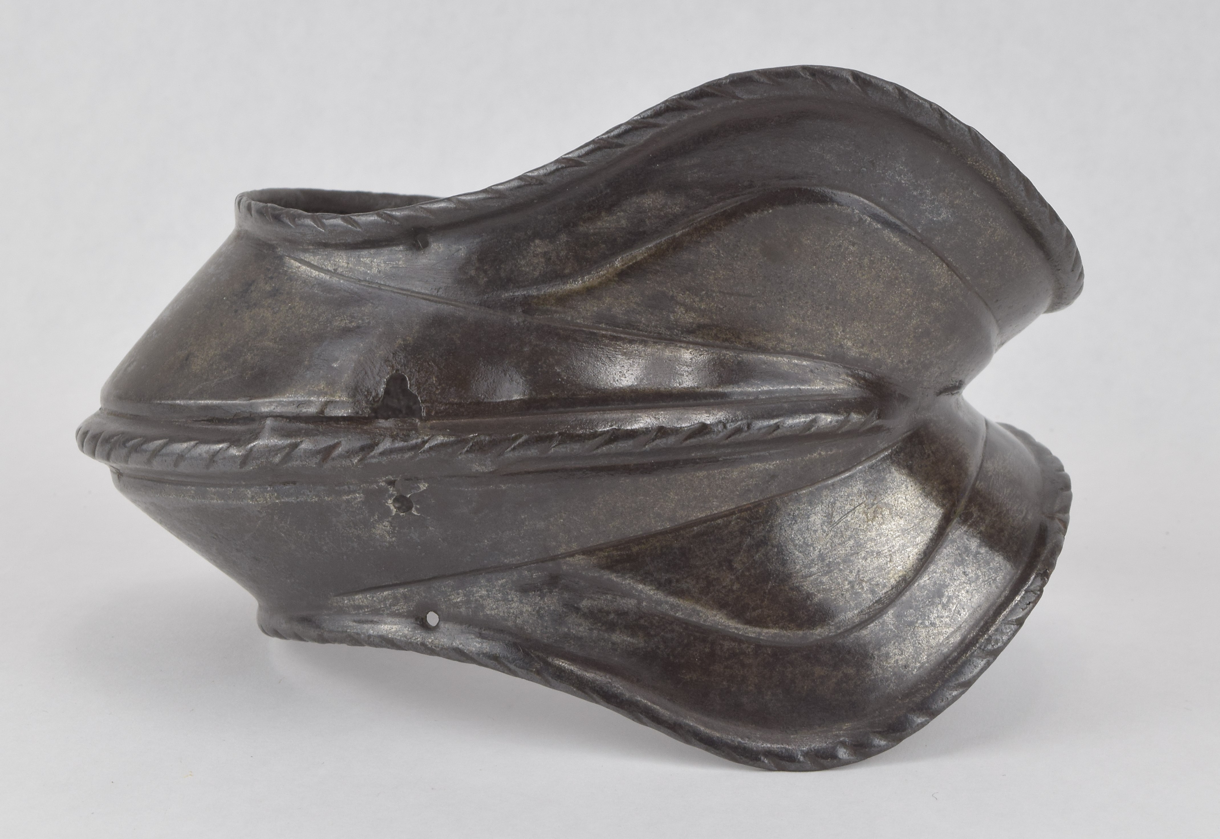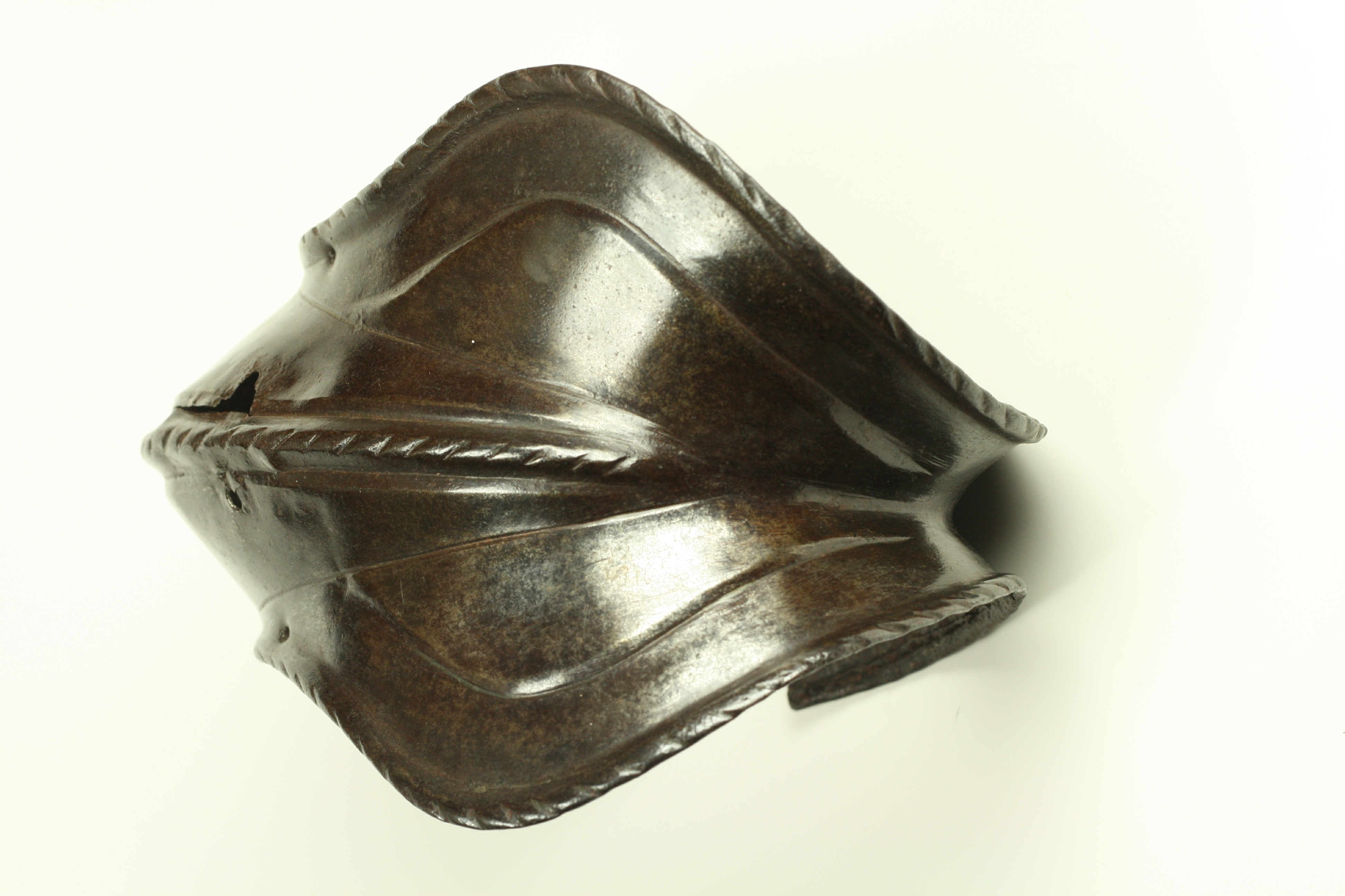 Italian. Of nearly bracelet form. There is a narrow gap of app 1/2 inch between the rear edge of the cop and the wing. The cop is asymetric, being flatter at the back and rising to a peak at the center from slightly behind the point of the elbow through the wing. The wing is slightly larger on one side than the other indicating that this is a right elbow. The outer edges are rolled and roped for their entire length. The roll is bordered by a recessed border on the front portion of the wing. There is a central raised roped band running along most of the raised portion of the cop. There are 2 holes on the front and one at the back for attachment of the cop to the vambrace plates. There is an old collection number in white paint ('178') on the back of the wing. Some delaminations on the inside.