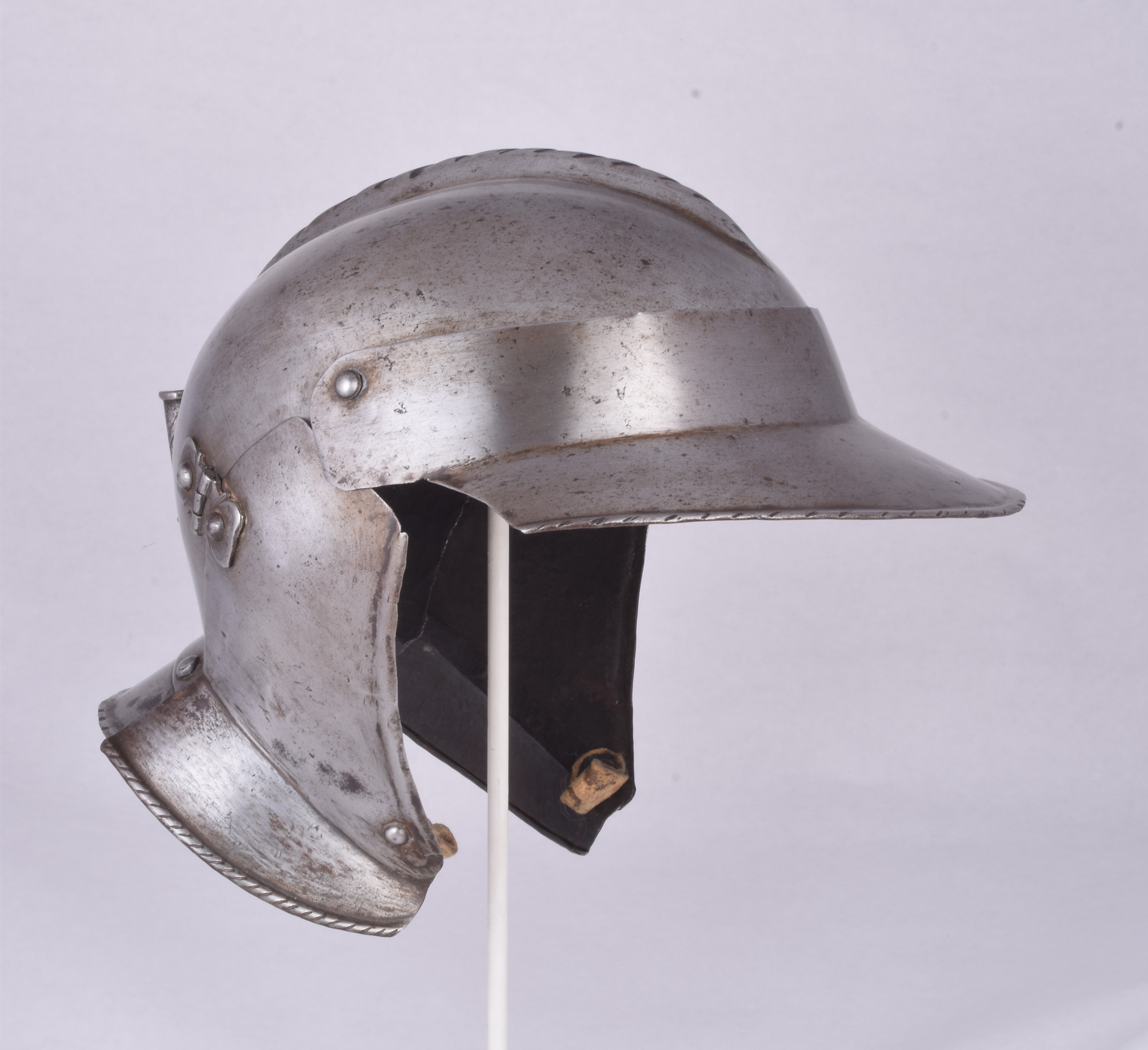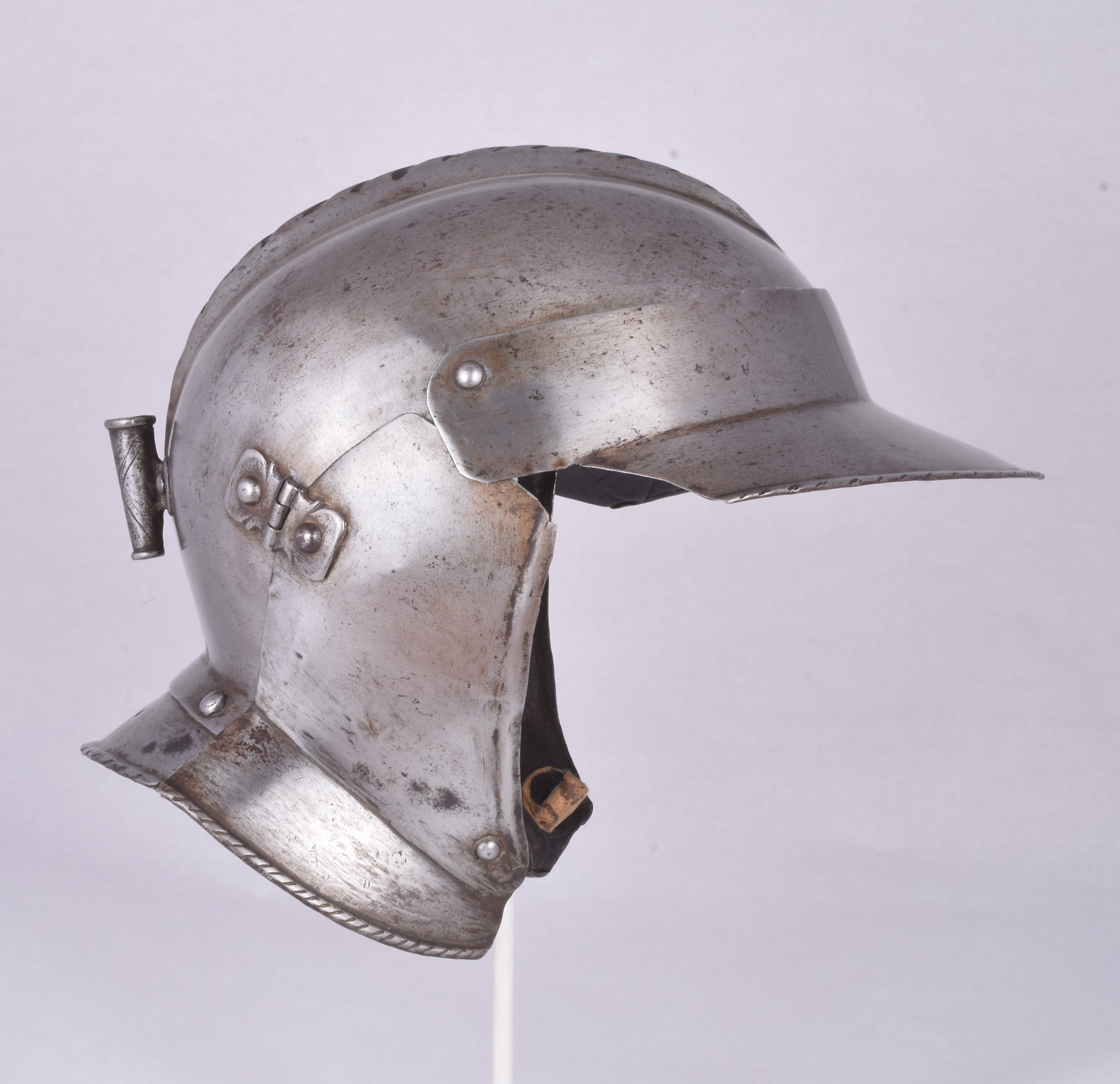 Small, low combed with a movable fall and cheek plates. The bowl formed in one piece with a low central, roped comb. The fall is secured to the bowl by two rivets that allow it to be raised. The upper part of the fall is taller than many, extending the skull slightly. The fall overlaps the cheek plates, locking them in place when it is down. The tail is a separate piece riveted to the inside of a flare on the back of the skull. It is more typical for this to underlap the skull. The outer edge is rolled inward and roped. Cheek pieces are secured to the skull by external hinges. This is not typical of later pieces where hinges are generally inset. The cheek plates have rolled and roped borders at the lower edge. The lower edge of the cheek plate extends the flare of the neck plate. The flare is formed as a separate piece riveted solidly to the cheek plate. The face hole of the cheek plates is formed with a simple hollow bump. There is a decorated iron plume holder at the back of the skull. This is an example of a very early form of burgonet. It would have been used with a simple Maximilian armour, possibly with a splint armour. That is how it is displayed in this collection. Similar to item number A-182.