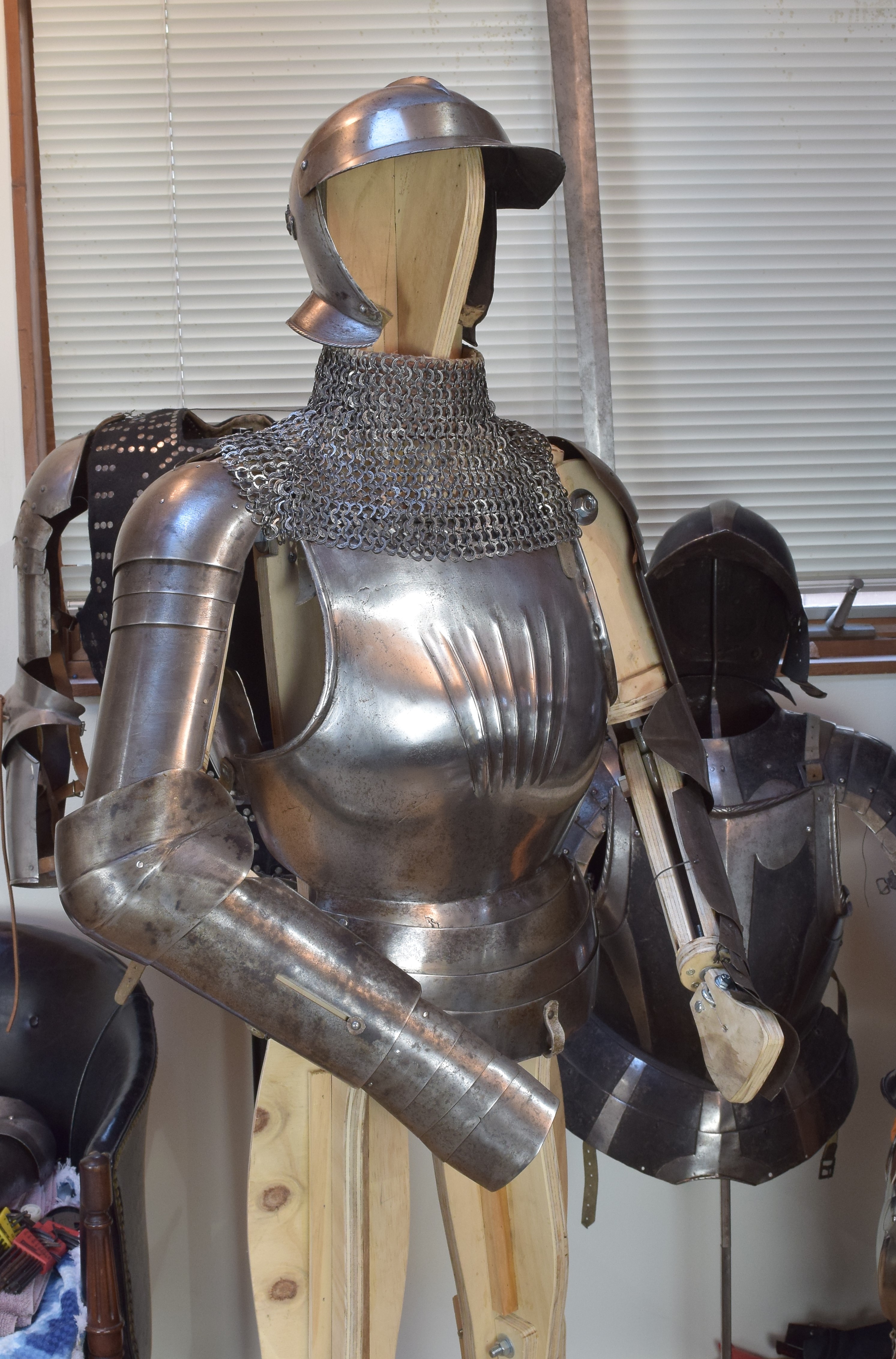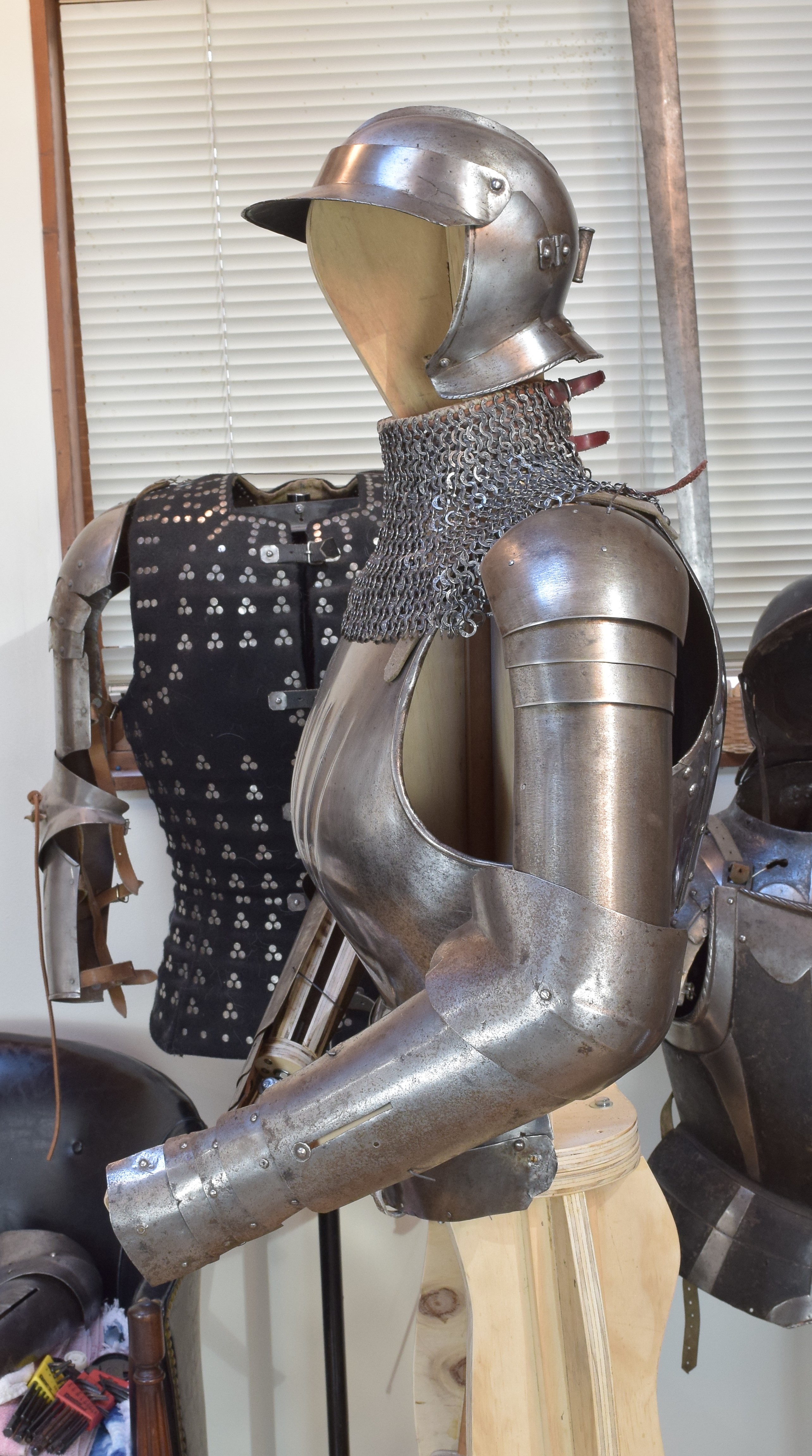 Consisting of elbow, forearm and hand protection. Elbow covering the outside and point of the elbow with a simple slightly tapered form puckered to fit to the bend of the elbow and with a central band formed by 2 one sided flutes. Forarm of gutter formed with a central slot to secure the hand protection. Hand protection on three leathers. Hand protection of three plates secured to a fourth wrist plate. The slot allows the wrist/hand protection to be retracted. Leathers replaced and broken. Holes for Y strap across the elbow and a strap in the center of the vambrace. The images of the half suit show this piece with additional pieces of armor - item number A-212 and item number A-270 - and a modern upper and right arm made to complete the look. The modern pieces are marked on the interior 'WCA' and are obviously modern rolled steel.