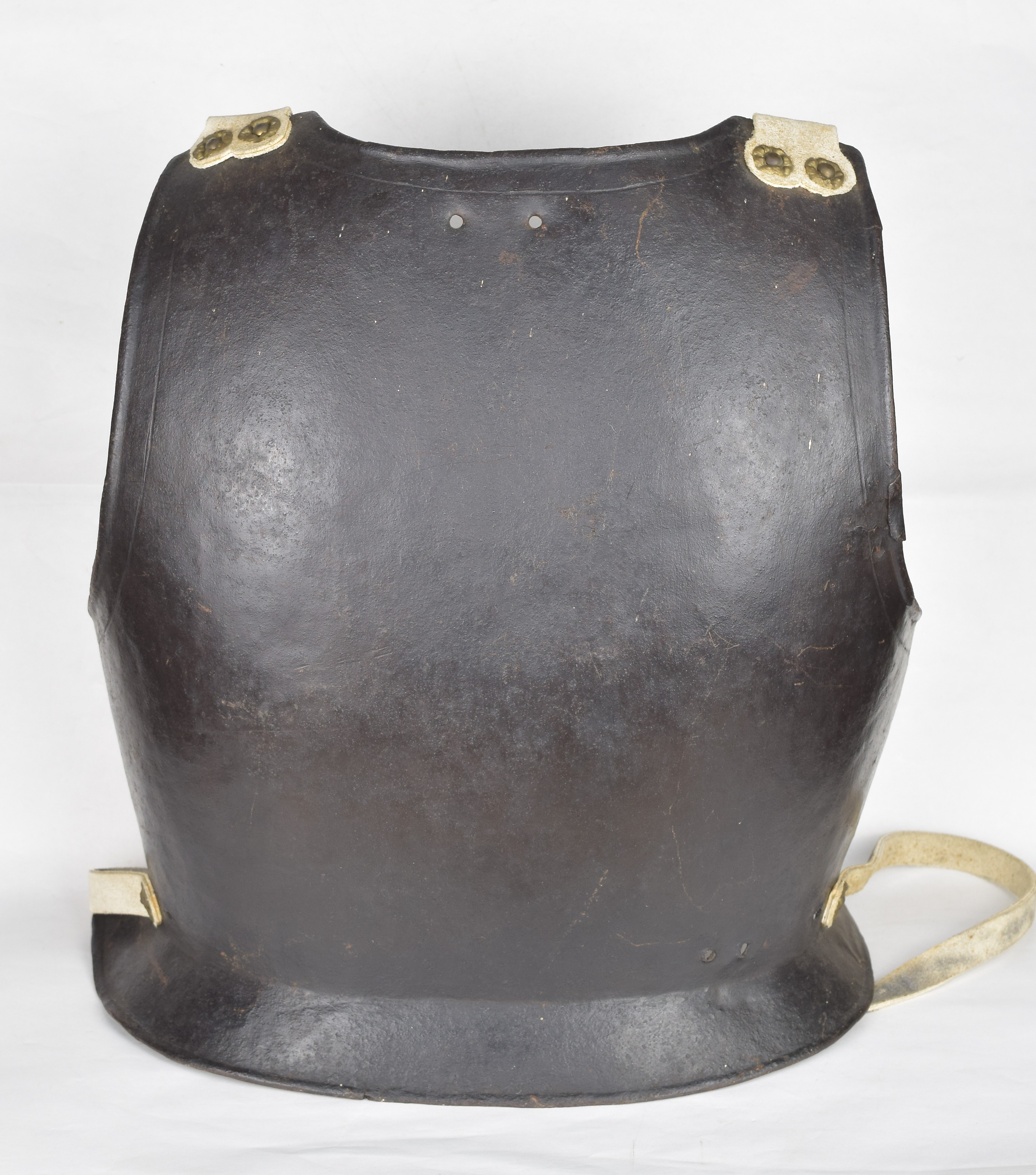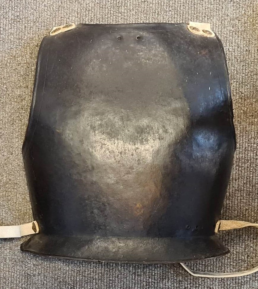 Simple back formed to the body with a narrow flare at the waist. Plain inward turns at the arms, neck and base of the flare. Single engraved lines at the neck and arm holes. Modern straps simulating buff at the shoulders and waist to secure the breastplate. Black rough from the hammer finish. Marked internally '14' matching the breast and tassets.