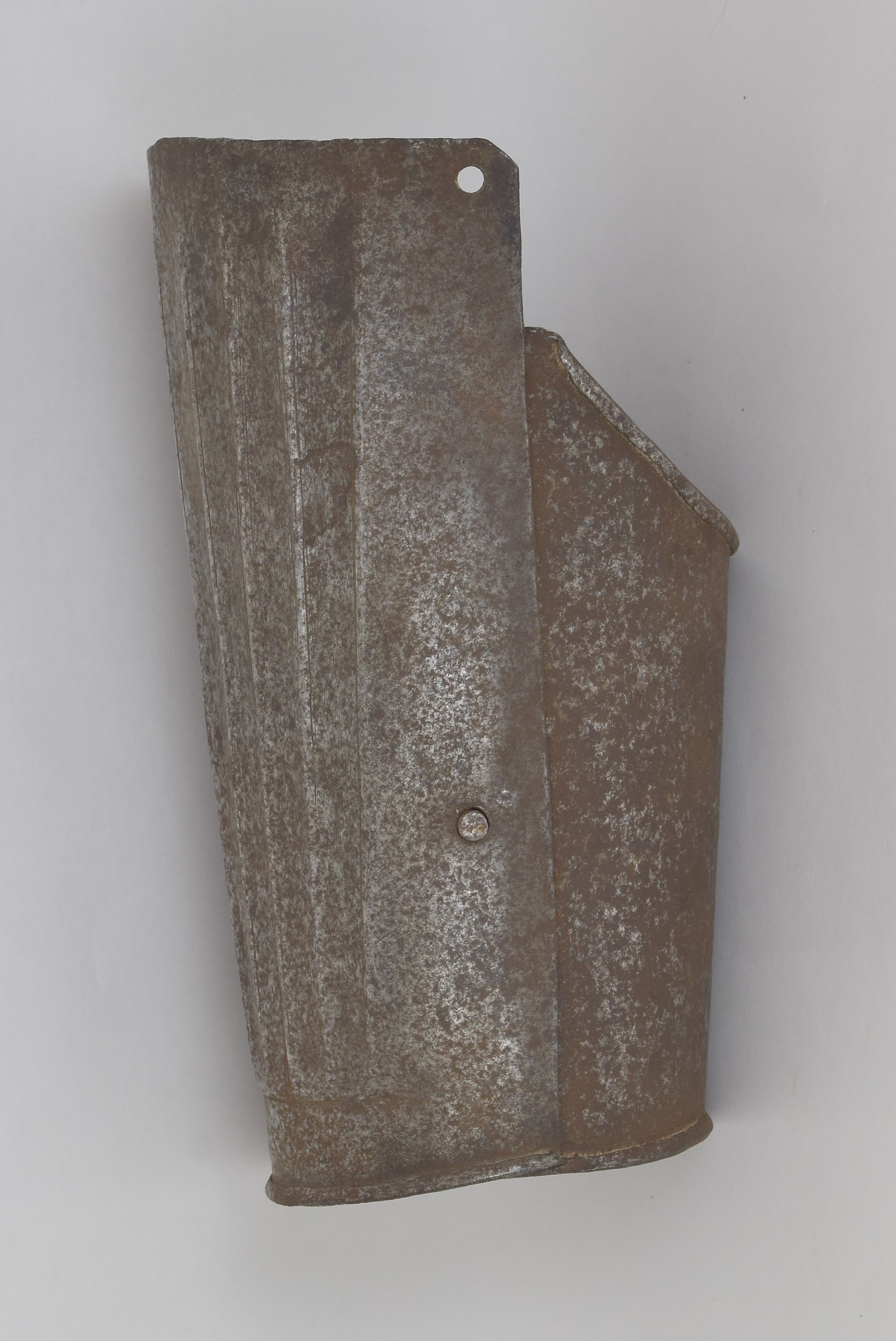 Formed of two plates. The outer vertically fluted with a recessed border parallel to the inward turned roll at the wrist. Plates secured by a hinge on one side and a pin on the innter plate engaging a hole in the outer plate. Pierced for rivets to secure lames for the (lost) elbow cop. One vambrace is of the period, the other appears to be a pretty good 19th/20th c. copy made to match.