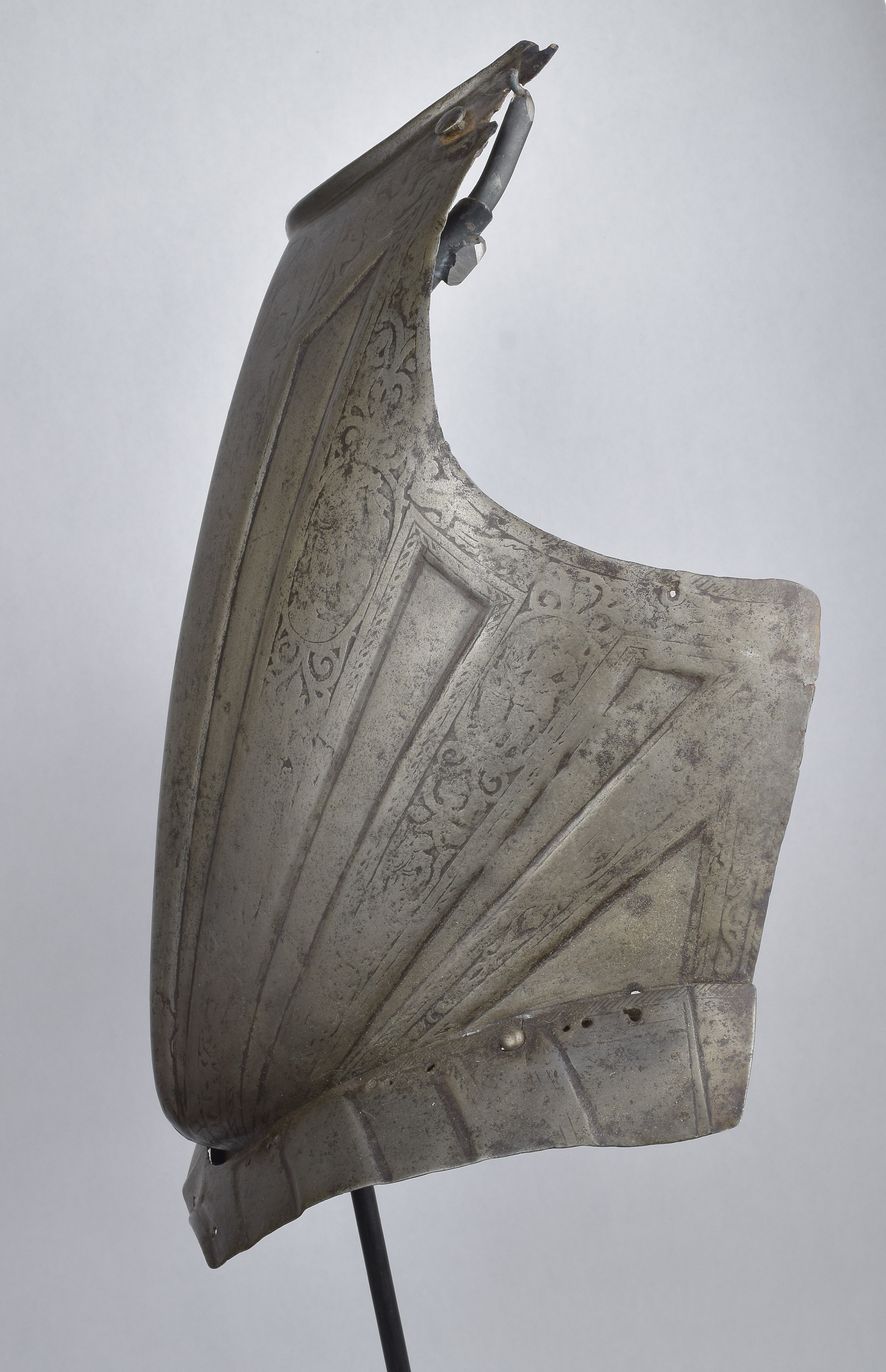 This style of raised and recessed bands with etching seems to be relatively rare. A similar breastplate is preserved in the Fitzwilliam Museum in Cambridge (HEN.M.7A-1933) described as North Italian c. 1580.