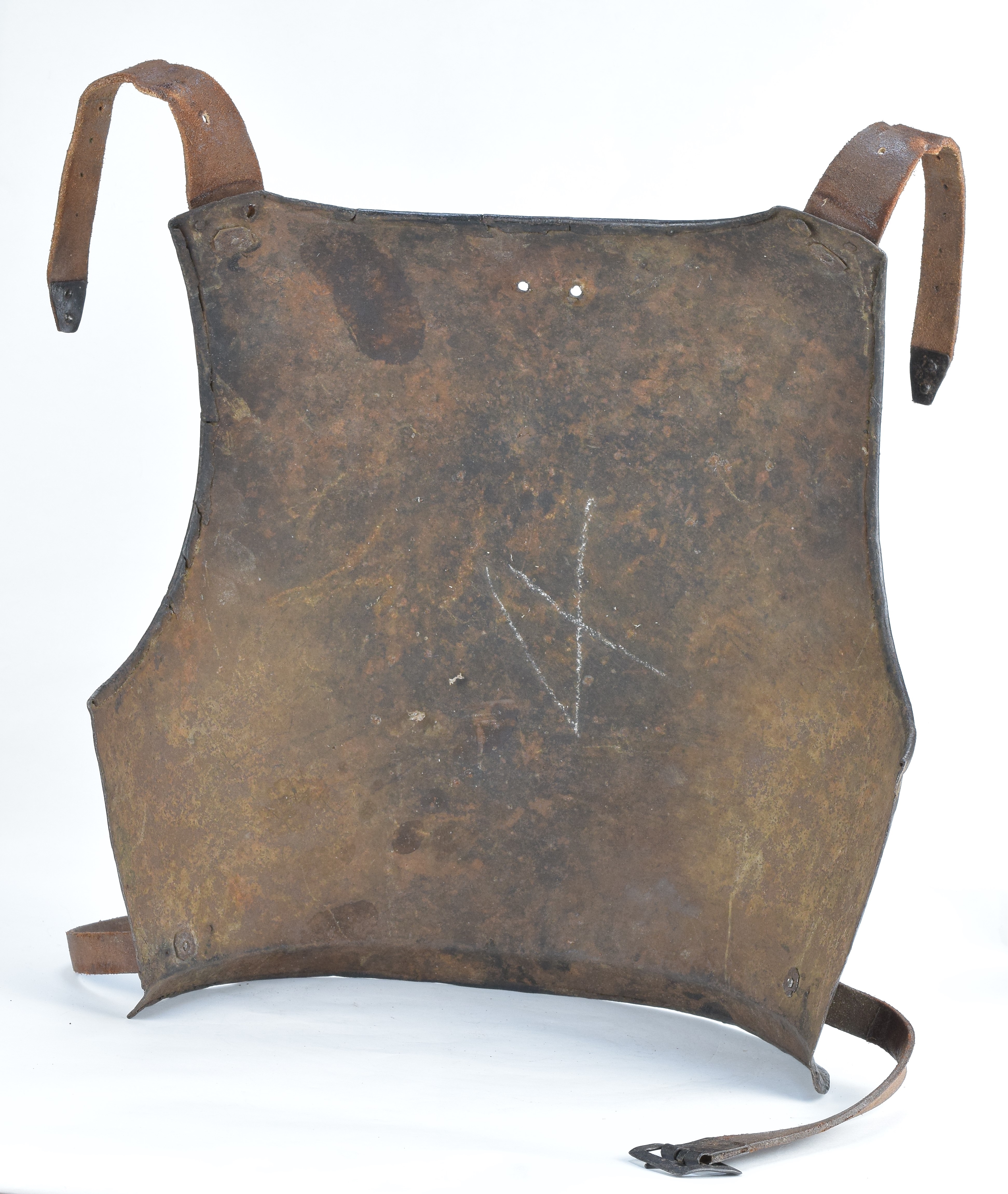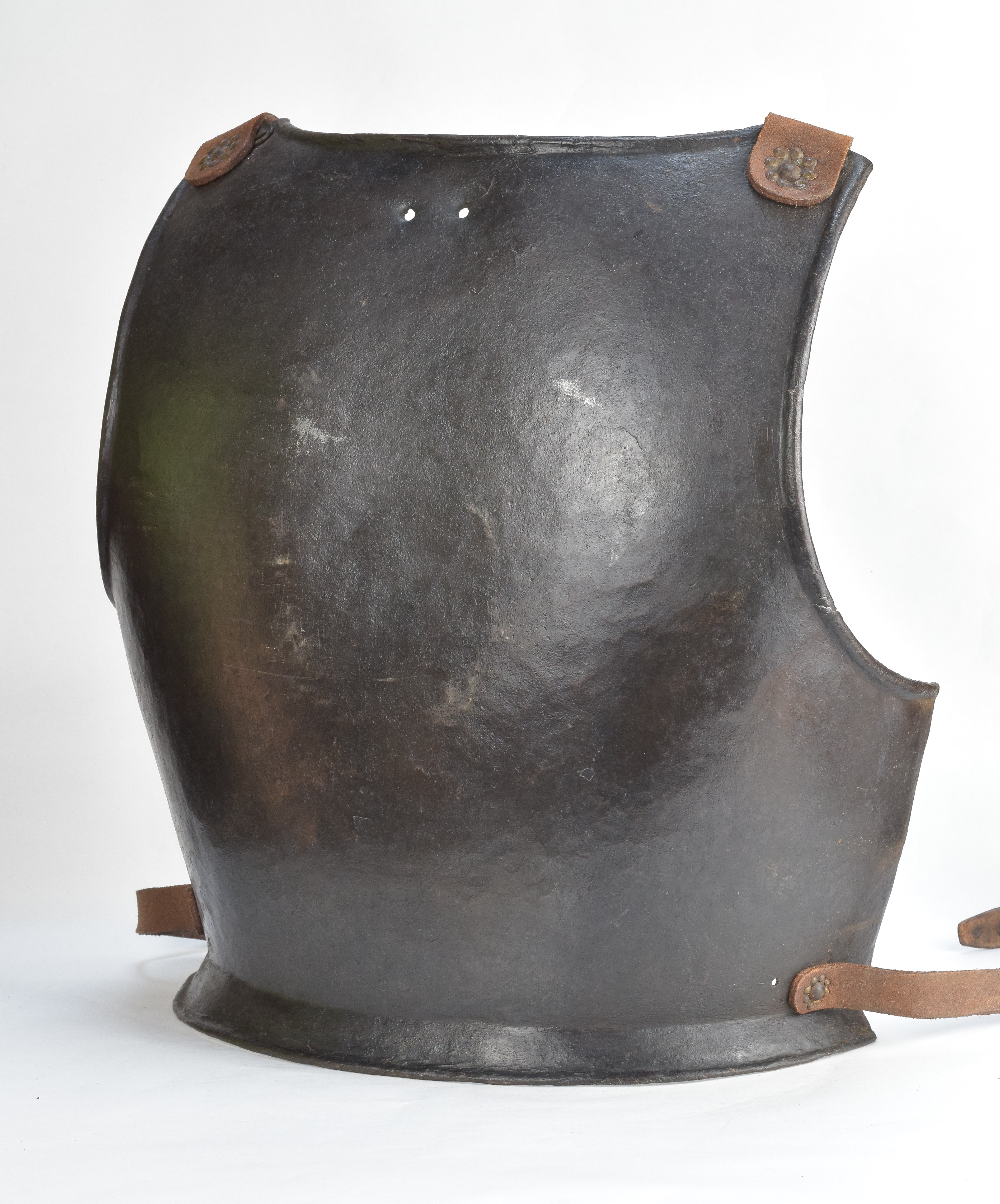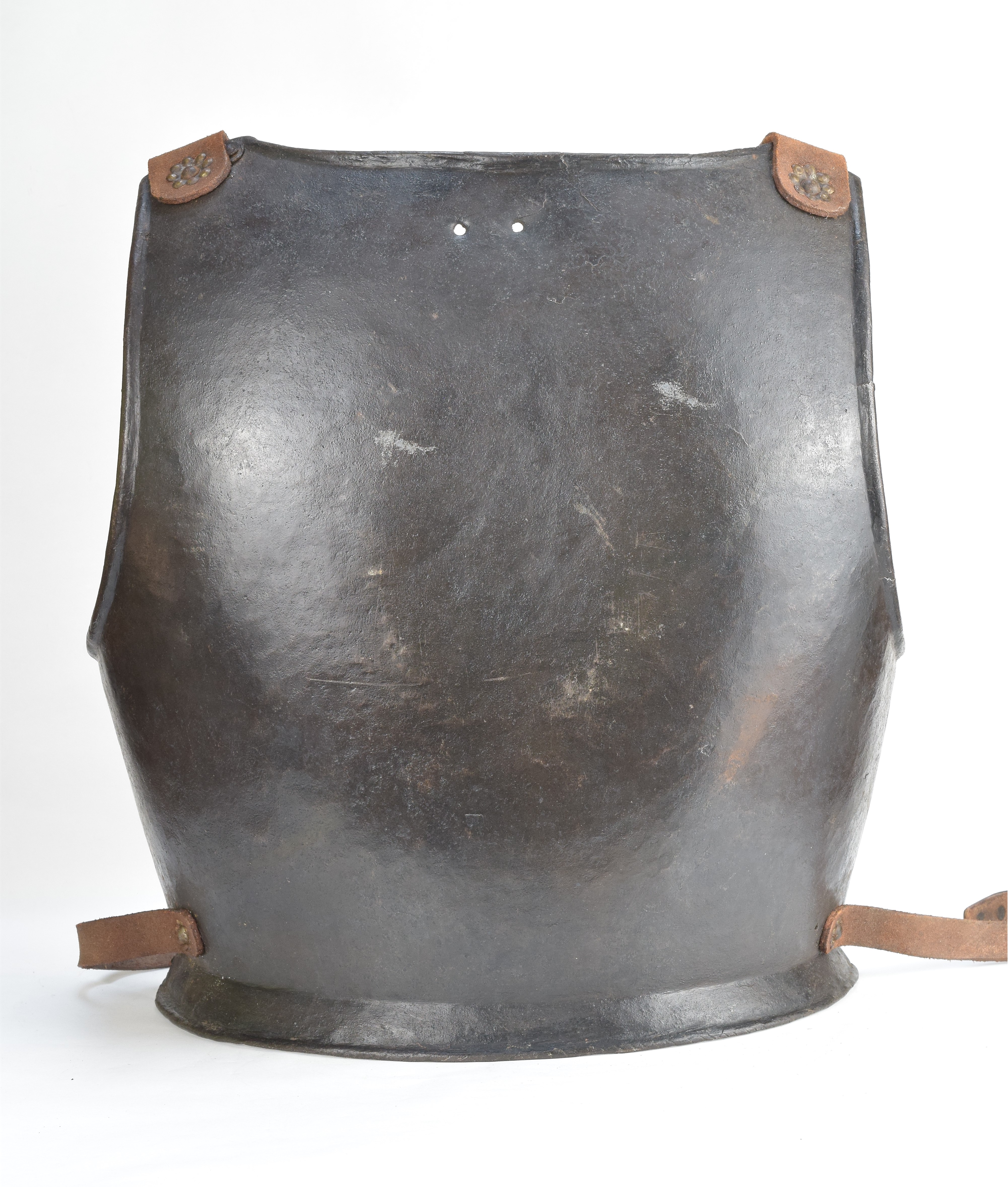 Formed to the shoulder blades. Flared at the waist. Inward turned rolled borders at the neck, base of the waist flare and armholes. The neck and waist rolls are lightly roped matching the breastplate. Straps at the shoulders to secure it to the breastplate. Waist belt secured to the sides of the backplate, the left side carrying a buckle. Surface rough from the hammer with (likely) later blackened finish. Size, shape and finish match the breastplate. Straps later. Shoulder straps matching those on the breastplate. Top of the backplate with a pair of crude holes. These seem to have been used to hang the armor for storage (working life or later). The waist belt seems to be an even later replacement than the other leathers.