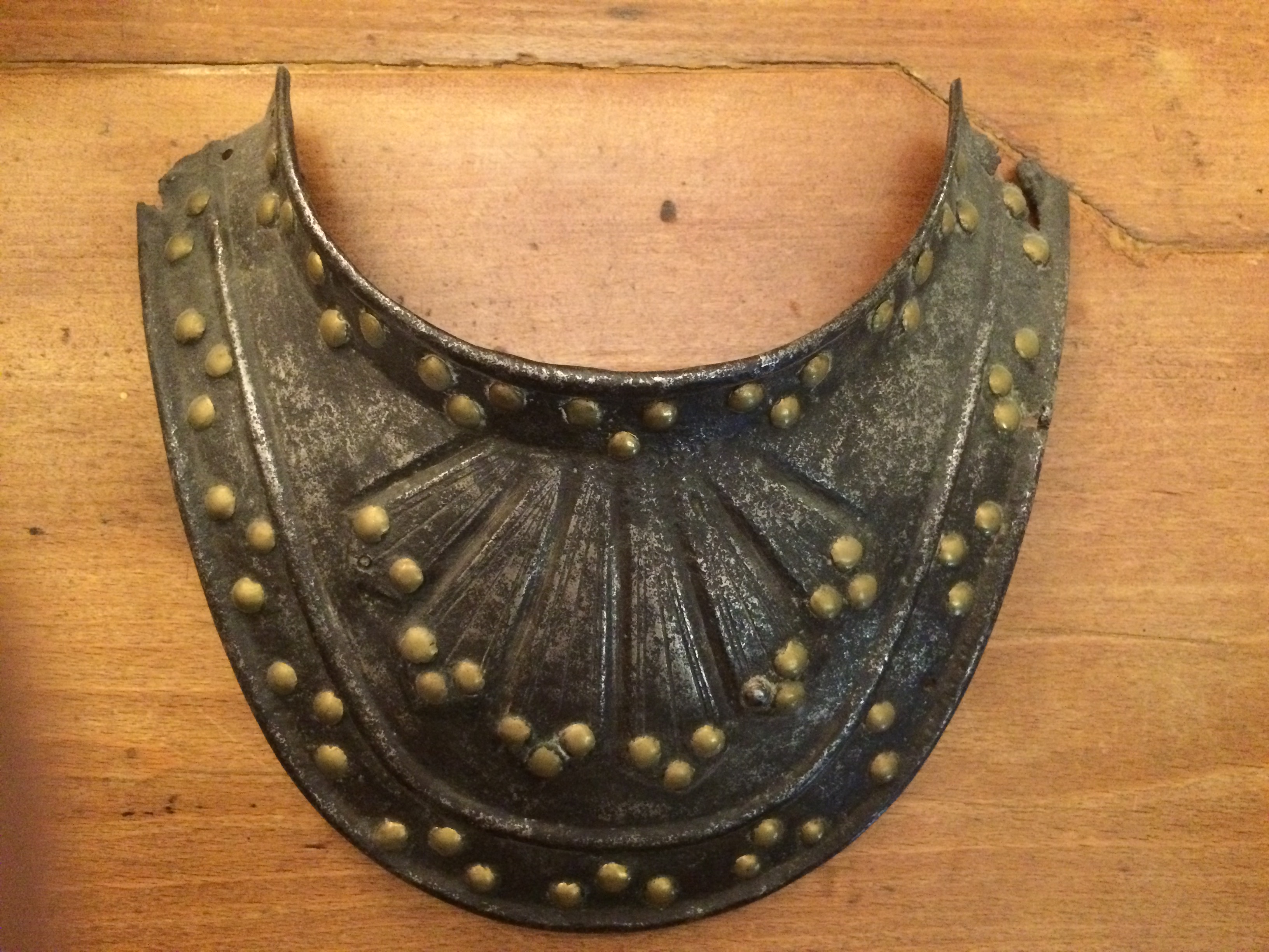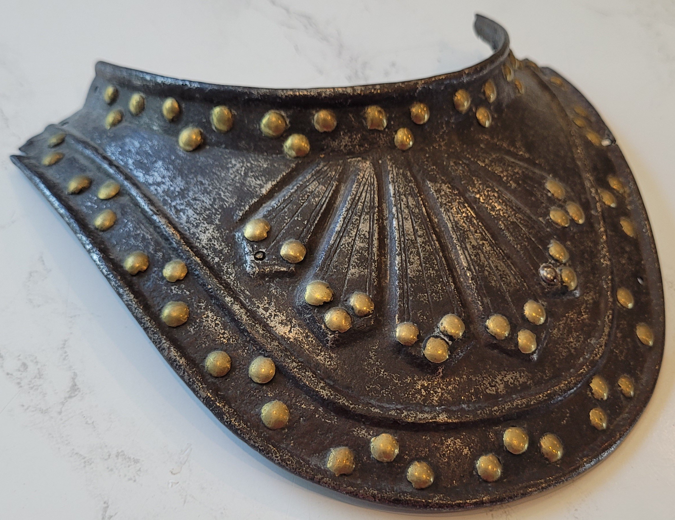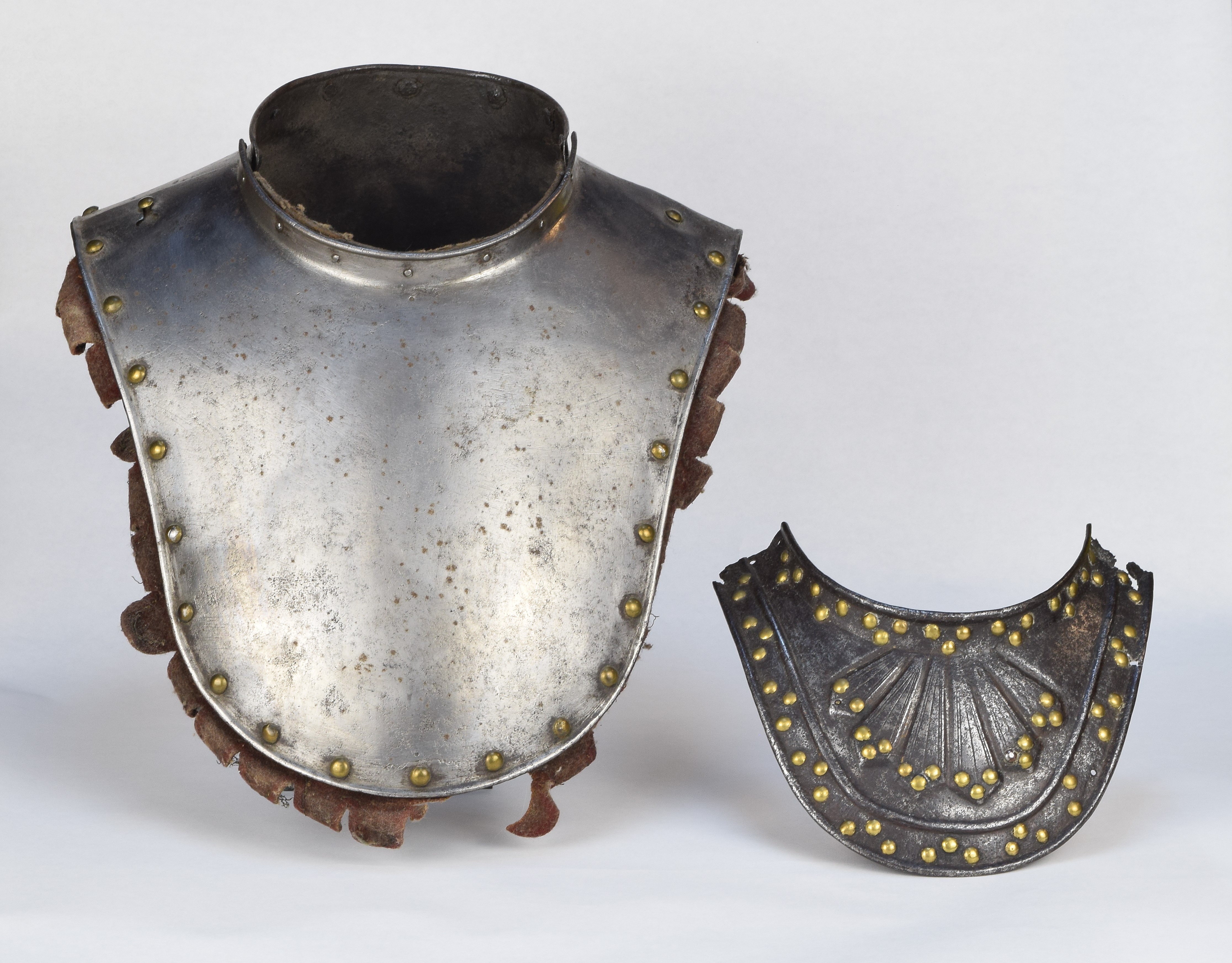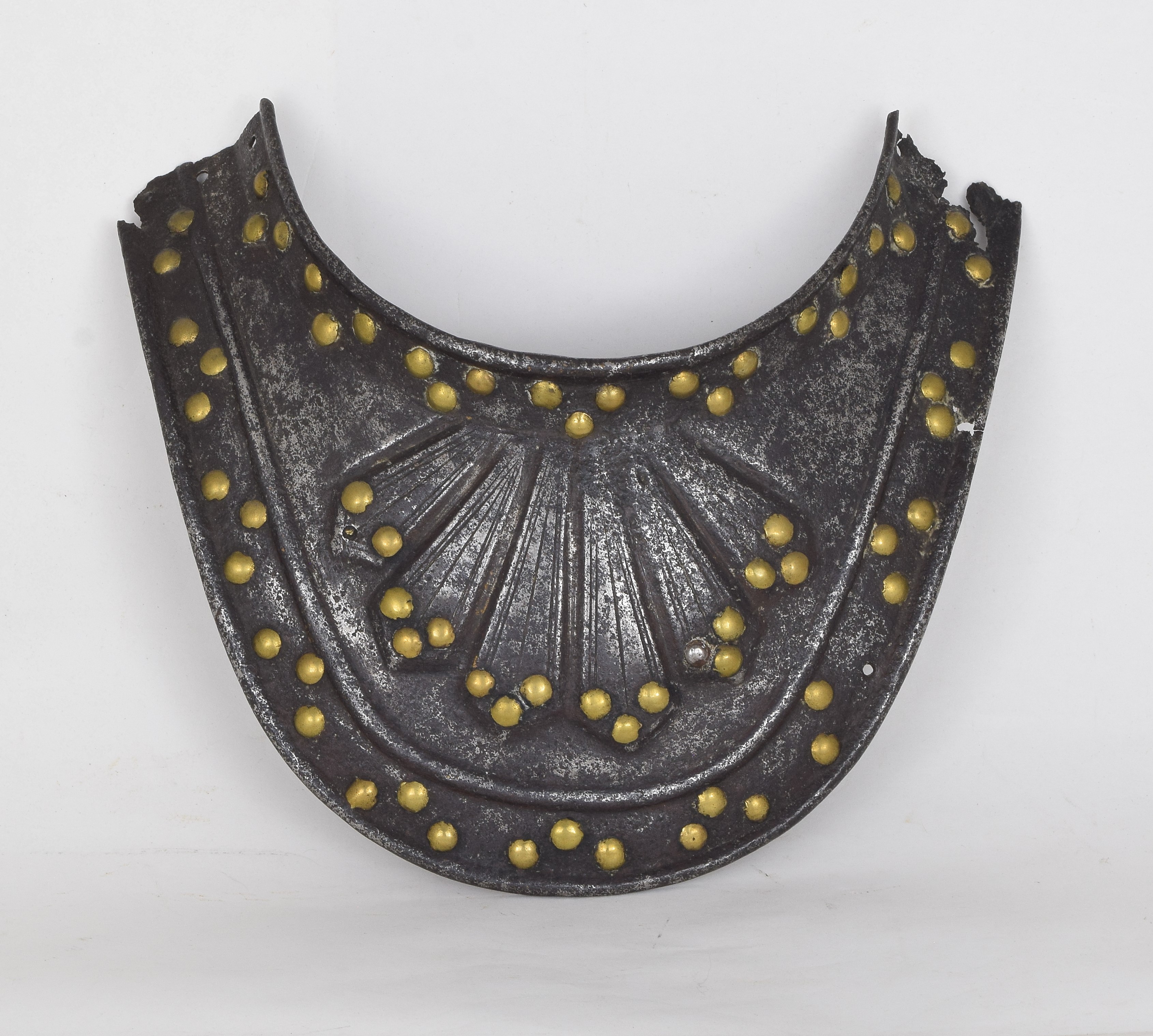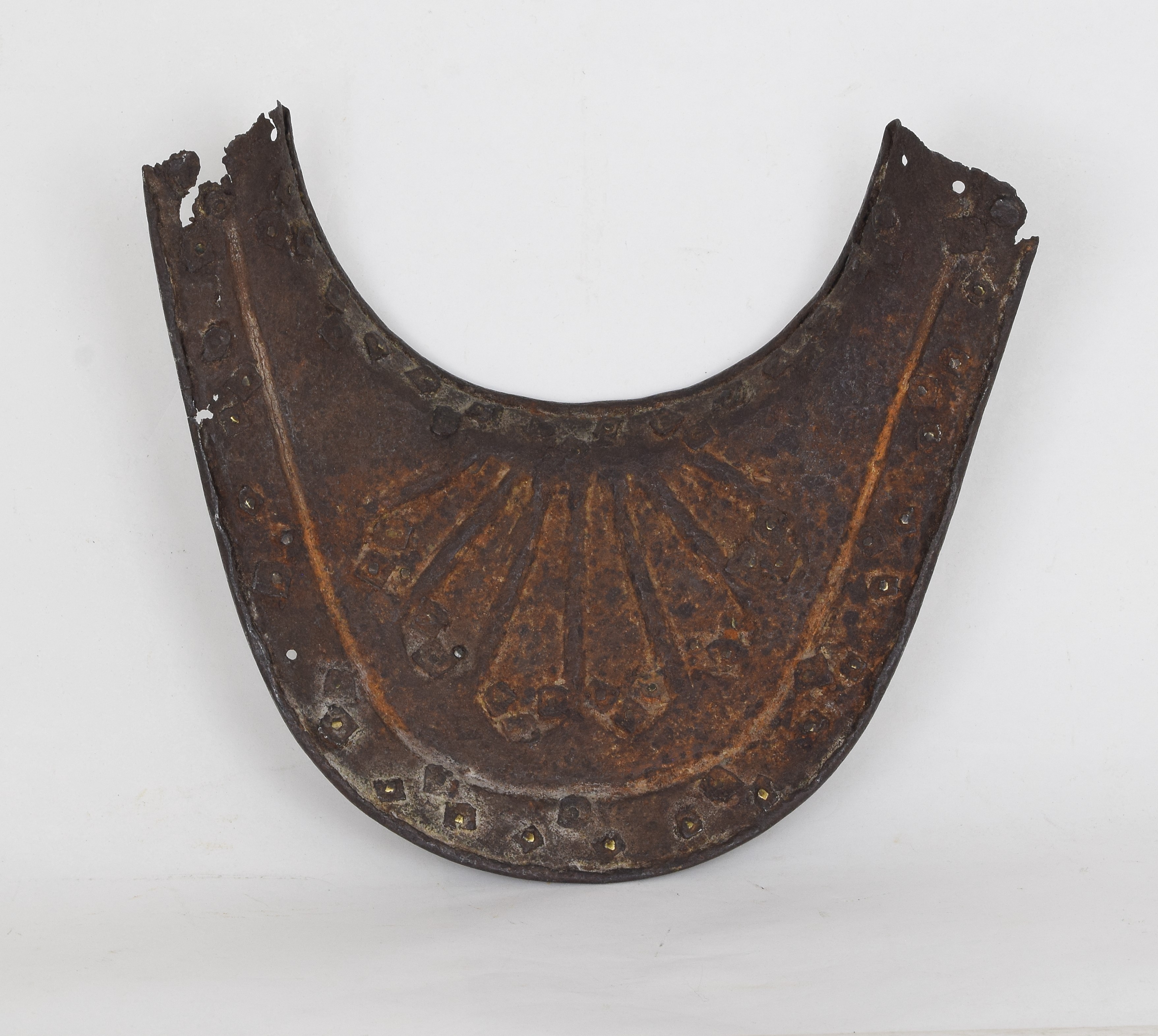 Probably French. Originally part of a gorget that would have had one plate front and back. The gorget would have been worn without a breastplate - it extends down the chest and it has a full roll at the edge. This would have formed the front of the gorget. The single plate is flared to form a short integral neck protection and it extends down over the chest. The neck and outer edge have a narrow, straight, plain inward turned roll. The outer edge has a parallel raised ridge. The front is decorated with a spray of 6 embossed, tapered bands that end in blunt points. Each is engraged with five lines. The neck, ends of the bands and outer border are decorated with sets of three copper alloy capped rivets. This style of decoration with rivets is typical of the 17th c. This style of gorget was normally worn over clothing or a buff coat and without a breastplate.