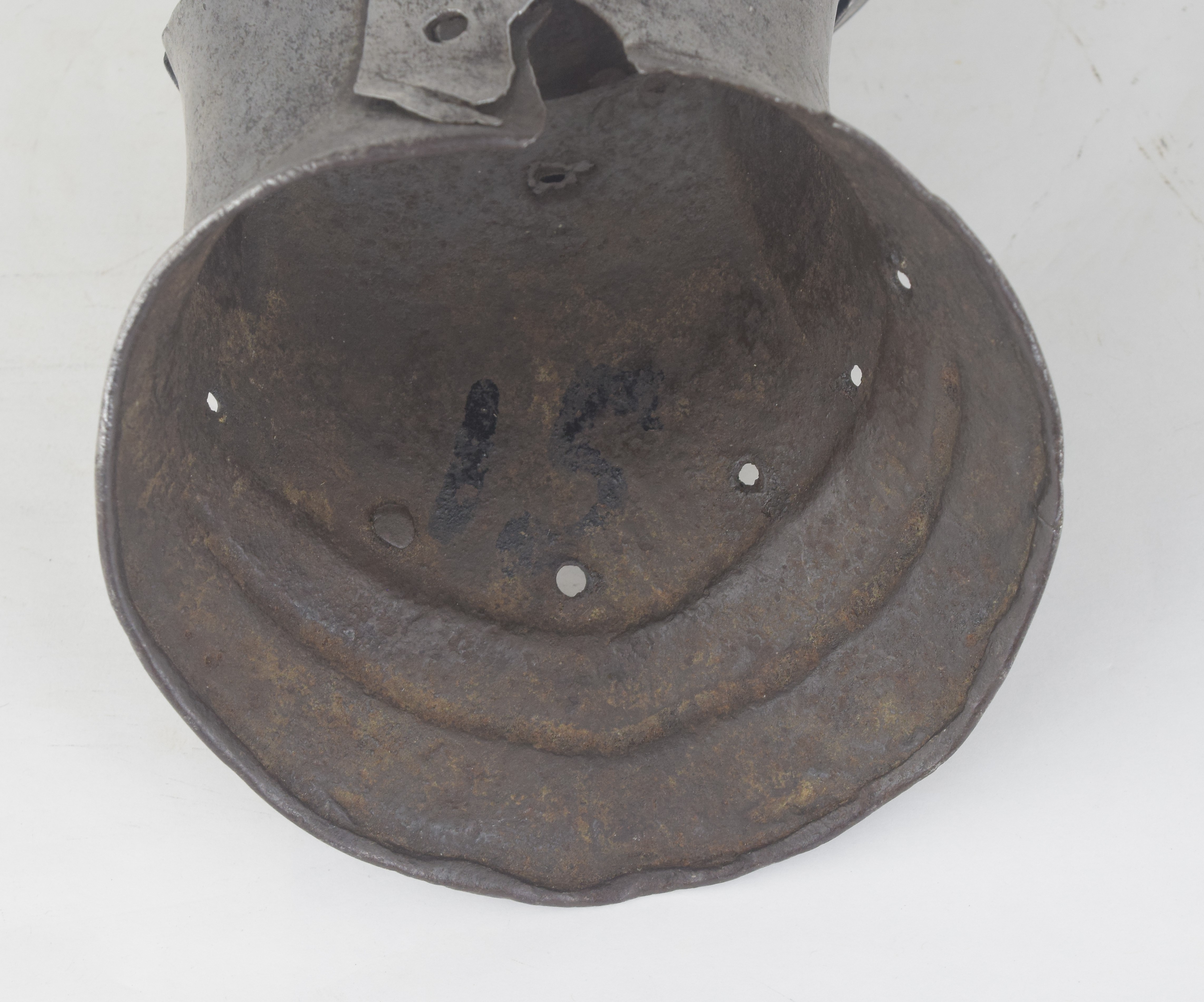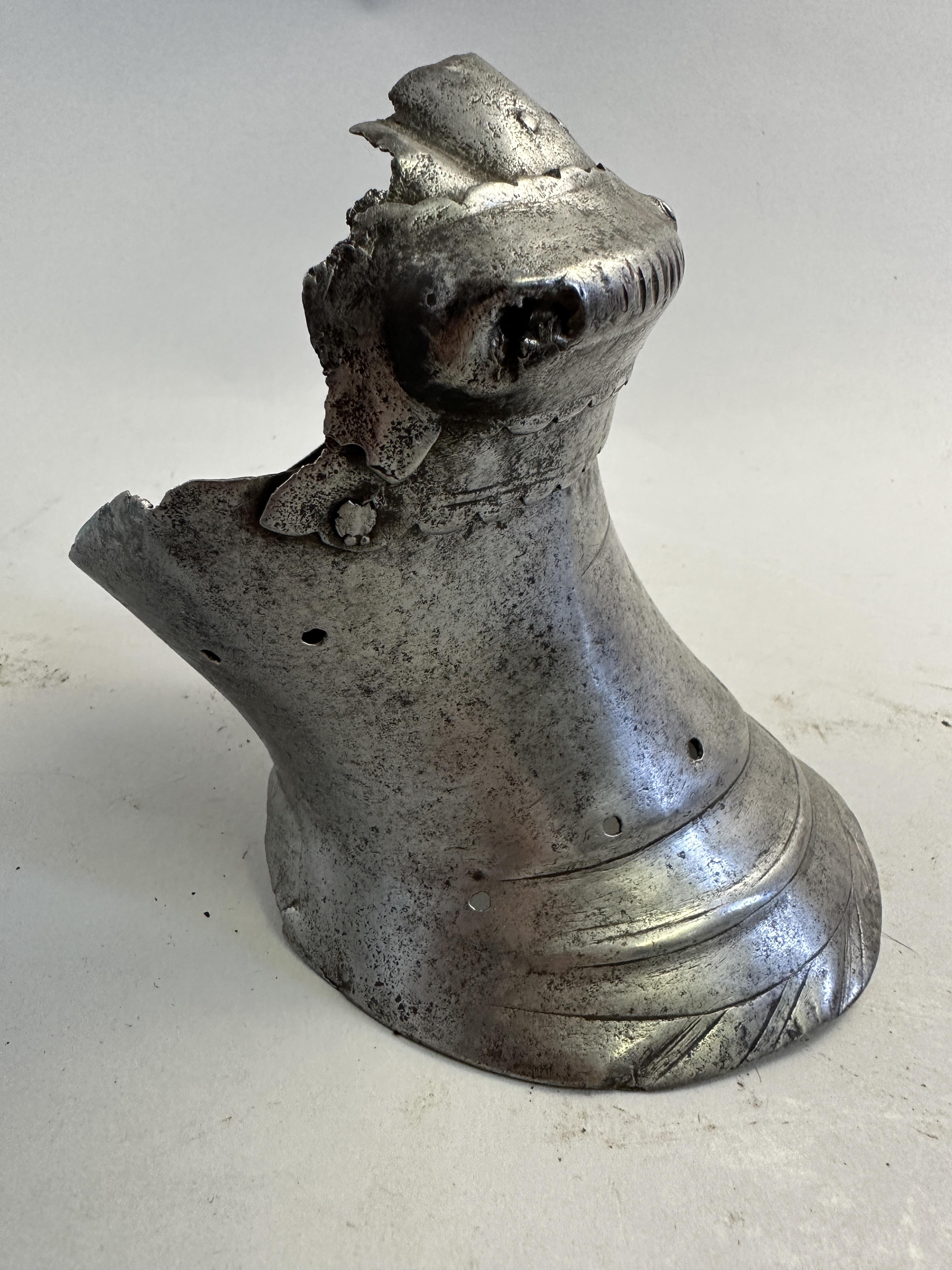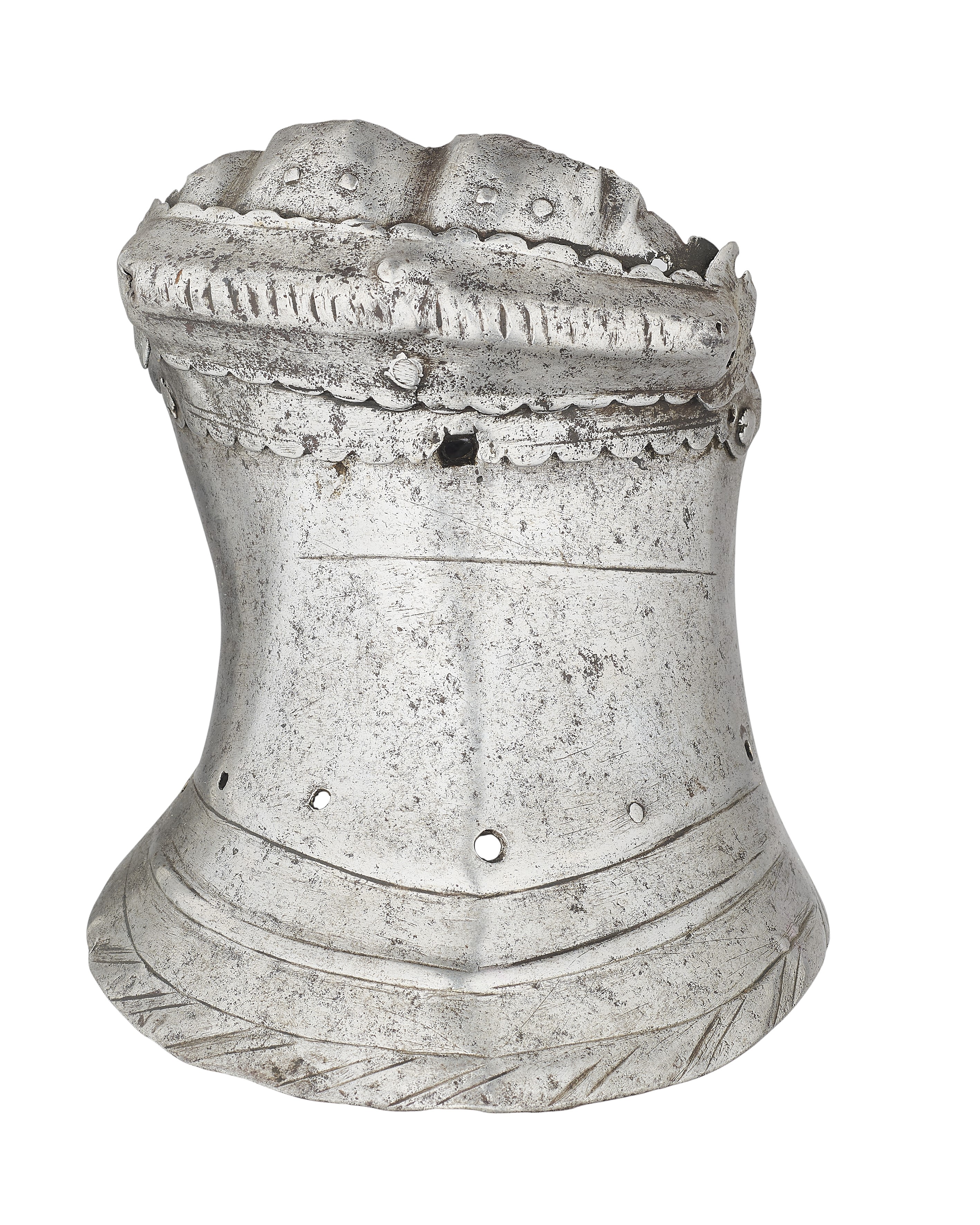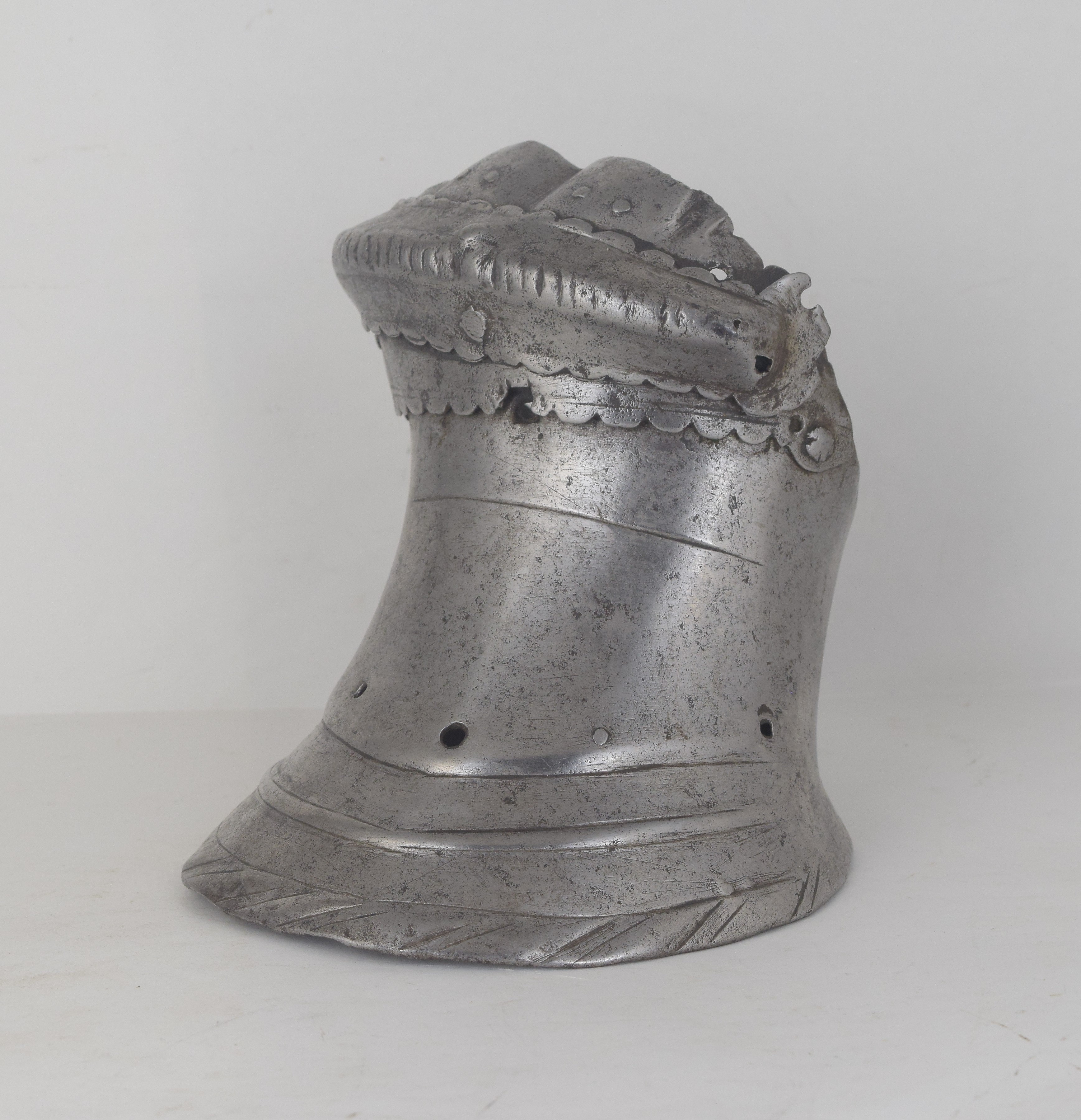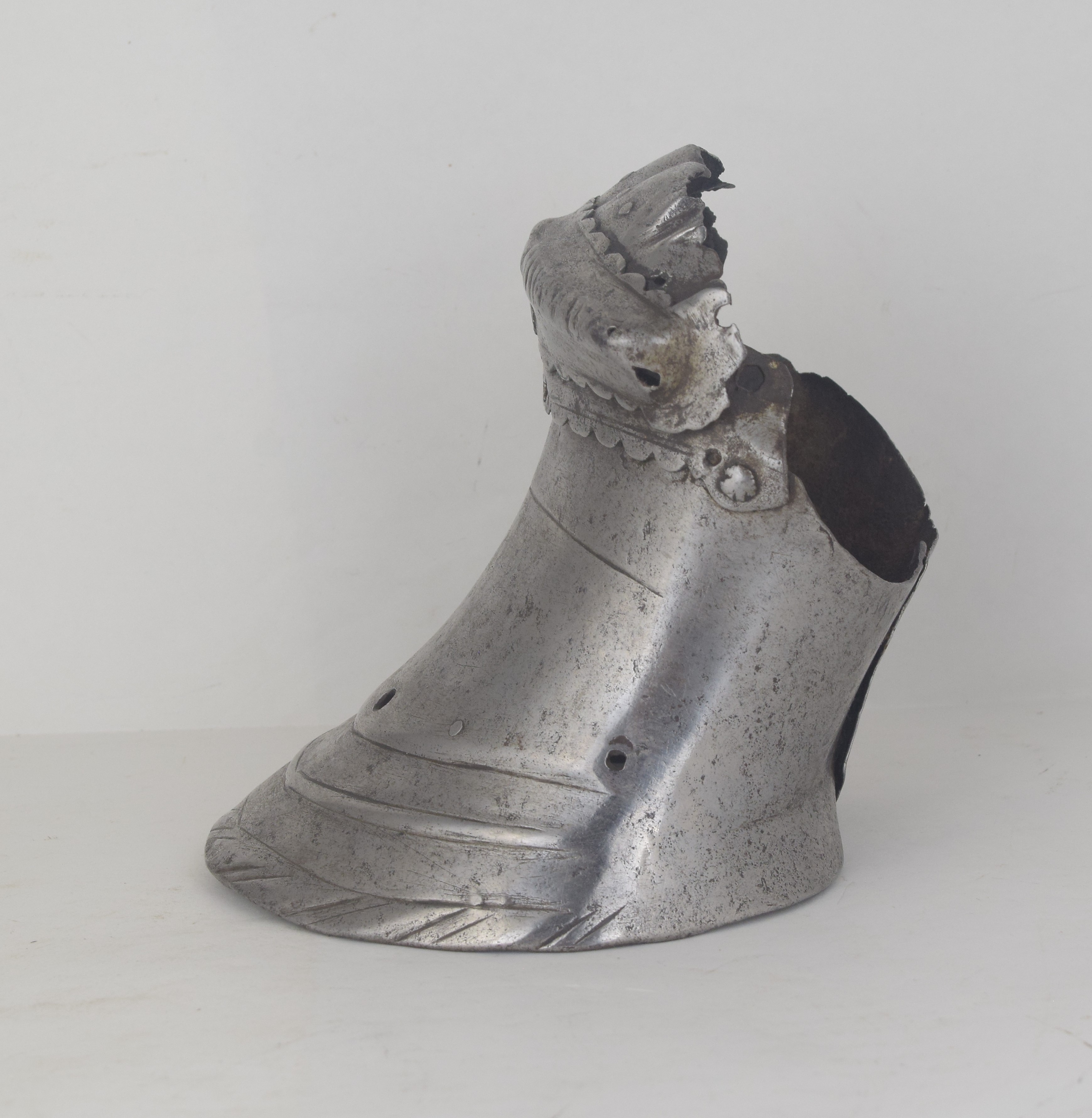 Western European, possibly Flemish. One piece slightly flared cuff extending over the base of the hand. Single metacarpal plate. Roped knuckle plate and a single finger plate. The finger plate retains pairs of rivets in each finger, indicating that it was originally equiped with scaled finger plates for the individual fingers. The cuff with a crease aligned with the center of the back of the hand and two additional creases at the sides forming a "boxed" shape. There ia a single horizontal engraved line at the outside of the wrist which extends between the boxed creases. The border of the cuff formed with a file roped inward turn and a doubly recessed border. The border is interesting - the inward turn is narrow but the "roped" area is much wider. The exposed interior shows that the "roping" is actually partially embossed. Edges of the metacarpal and knuckle plate with scalloped edges. The overall form of the cuff and back of hand is similar to item number A-207. This one appears to be somewhat earlier. The ends of the knuckle plate are lost, so the original pivots have been replaced with rivets that stabilize the plates into position. A very similar pair of gauntlets are displayed with the "Pembroke" armor in the Royal Armouries (II.164), where the description indicates that they are "associated" with the armor.