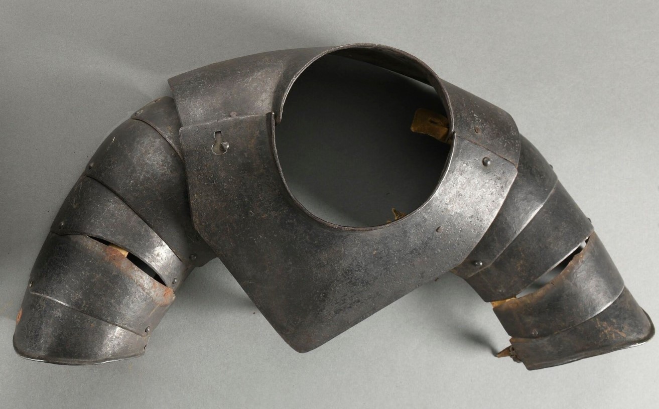 Gorget constructed of a single plate front and back. The front plate with a central crease. The bottom edge pointed at the center. Rear plate formed to the shoulder blades. Neck of the plates flared to form an integral collar. Upper edge of the collar with a plain inward turn. Two plates joined by a pivoting rivet at the left and a pin engaging a keyhole slot on te right. Matching shoulders of 5 plates each. The bottom plate with a plain inward turn on the edge. Each with a buckle at the front. The top plate of the shoulder relatively flat, the next more rounded to mimic the point of the shoulder. Shoulder plates secured to each other by sliding rivets at the back and internal leathers at the center and front. Shoulders secure to the gorget plates with three leathers - two to the rear gorget plate, one to the front. The leather on the right front can be detached - it is secured to an internal rivet with a large flat head that forms a button. Overall rough from the hammer with an old black finish. The edges of the shoulder plates and gorget main plate decorated with parallel incised lines. Leathers broken.