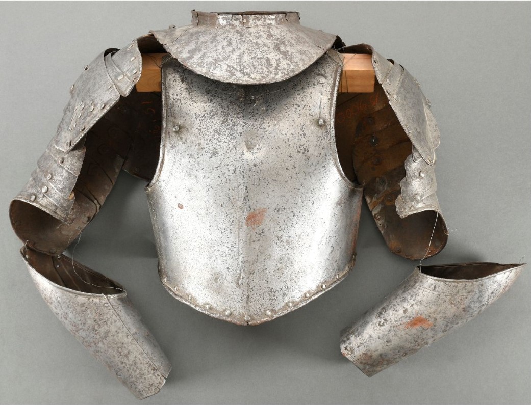 Formed of two plates. The outer shaped to the elbow. Inward turned rolls at the upper edge. Wrist decorated with single incised line. Hands missing.