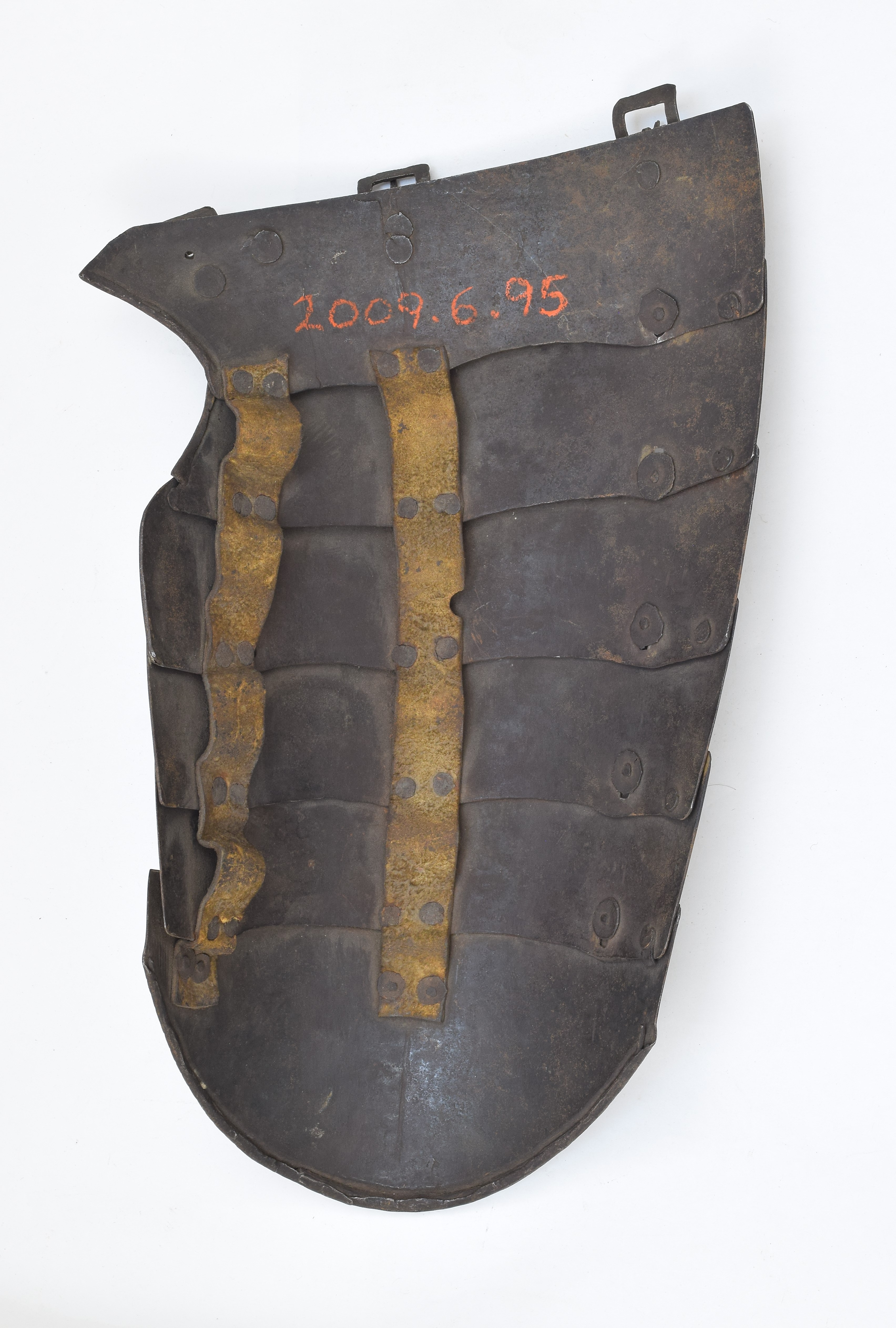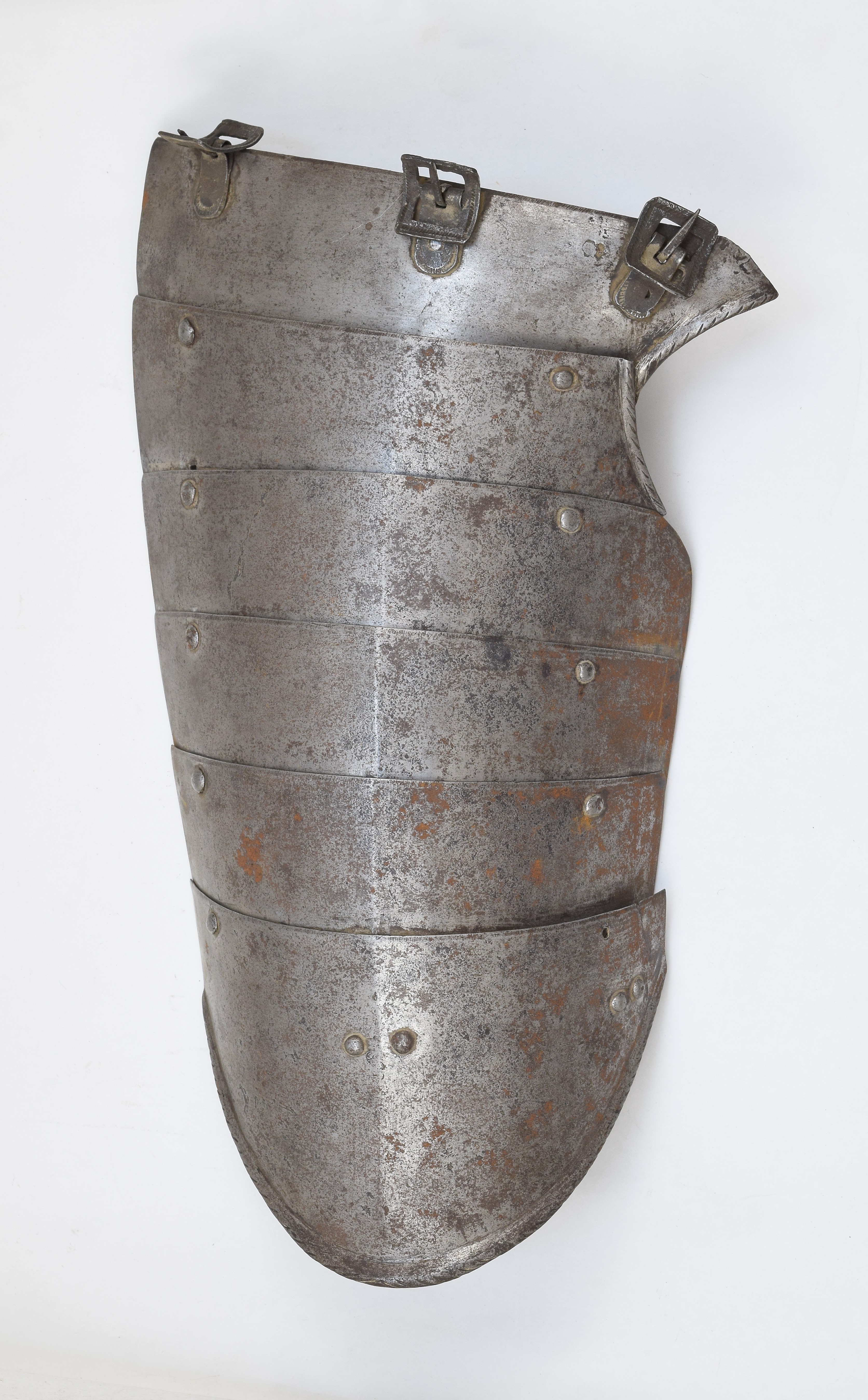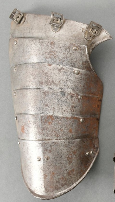 For the right leg. Constructed of 6 plates. The top 3 plates cut out at the crotch. The crotch edge of the top two and the lower edge of the bottom plate with inward turned roped rolls. The roll on the lower plate nicely tapered and the roping changing direction at the center. Three original buckles on the top plate to secure it to the fauld. The buckles and buckle mount plates decorated with stamped decoration. It appears that the lateral buckle is in its original position, the other two have been moved over time - likely to fit with different strap confituations for different breastplate/faulds. Plates connected by sliding rivets laterally and leathers centrally and medially. Leathers probably working life. There are rivets at the lateral edge for an additional narrow leather strip. The bottom roll turned over wire. The plates with a central crease and the upper edges with a filed bevel. I do not see any sign of mounts for a strap to secure the tasset to the leg. This is normal for short tassets, but long tassets tend to have been secured - this may be an in between style. Painted internally in red/orange paint 2009.6.95.