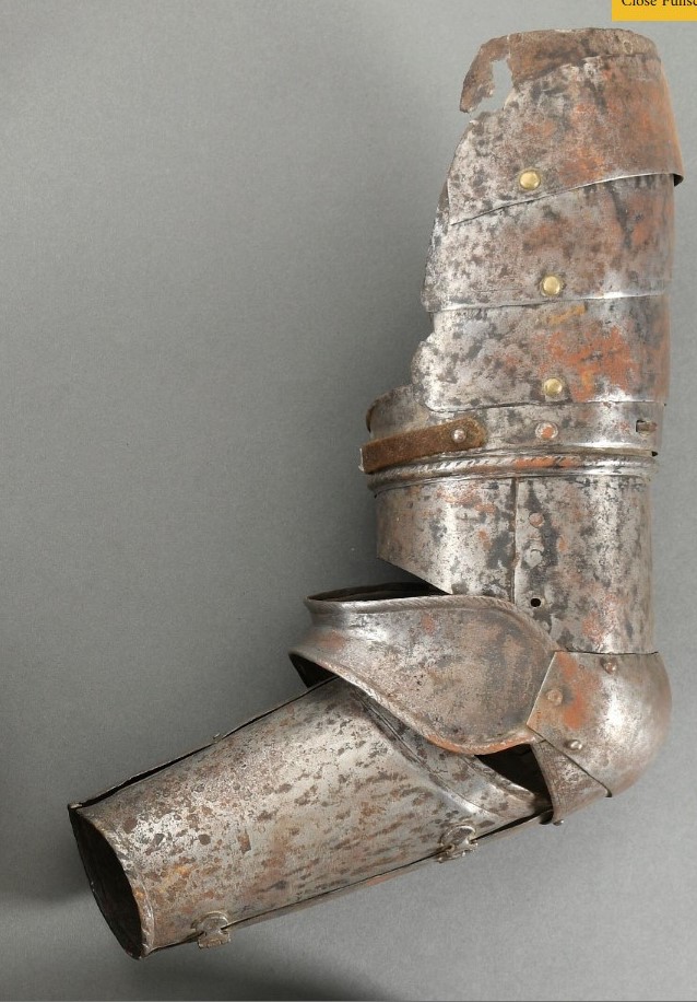 Composed of various associated pieces. The upper 3 plates appear to form part of item number A-398. The plates were originally secured by sliding rivets at the back and leathers at the center and front. The 4th plate appears to be associated. The 4th plate has a ccentral slot which engages the peg at the top of the turning collar. Upper canon including a turning collar. Of two pieces the upper with a roped bump engaging a flare at the top of the lower plate. Each of bracelet form, joined with an overlapped seam. The cop joined directly to the upper canon. Cop of bracelet form. Later (almost certainly 20th c.). Joined to the vambrace by a single lame. The vambrace formed of two pieces joined by a pair of hinges laterally and a pin engaging a hole medially. The wrist and inner elbow with inward turned roped rolls. The vambrace appears to be have been made to be used with a floating elbow and is probably mid 16th c.