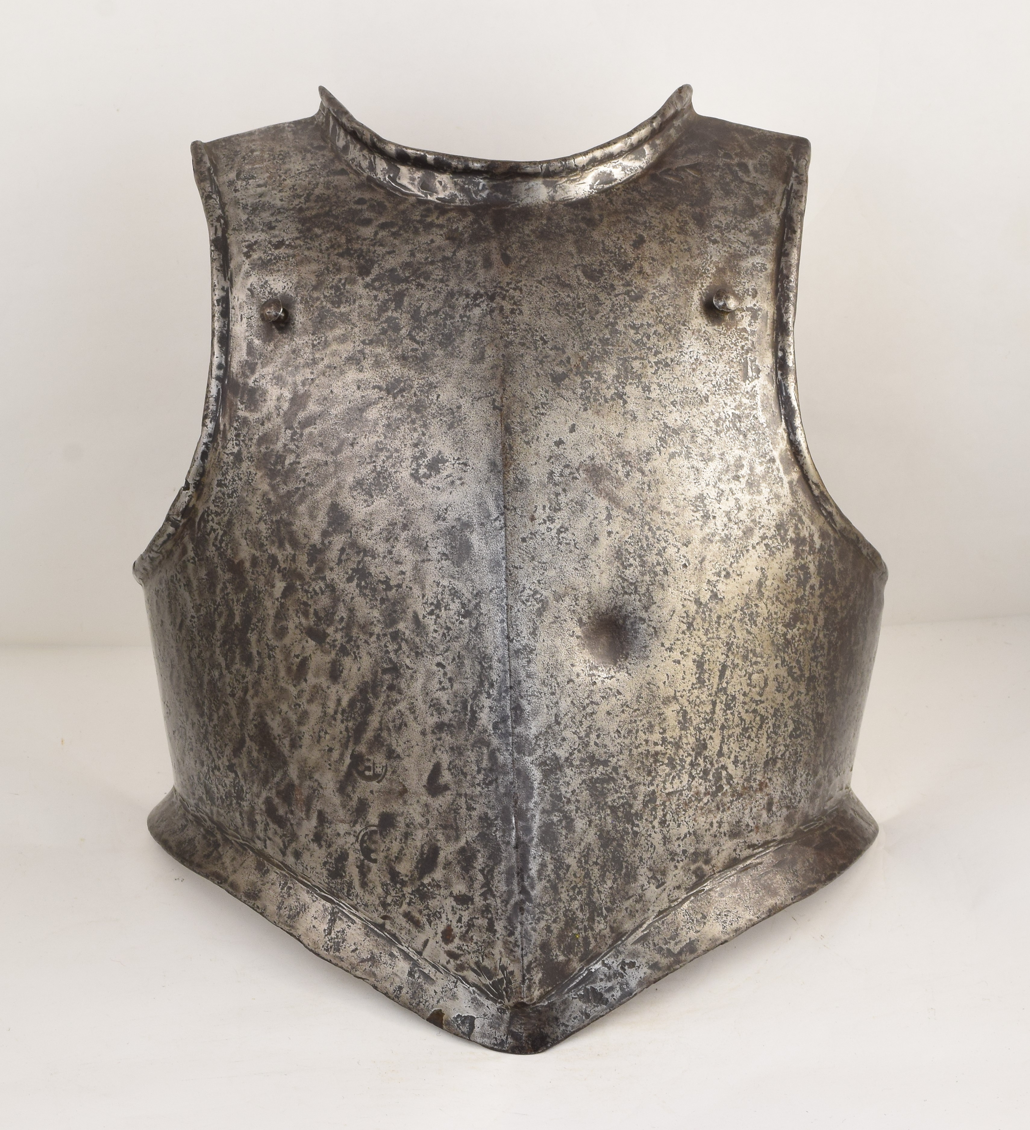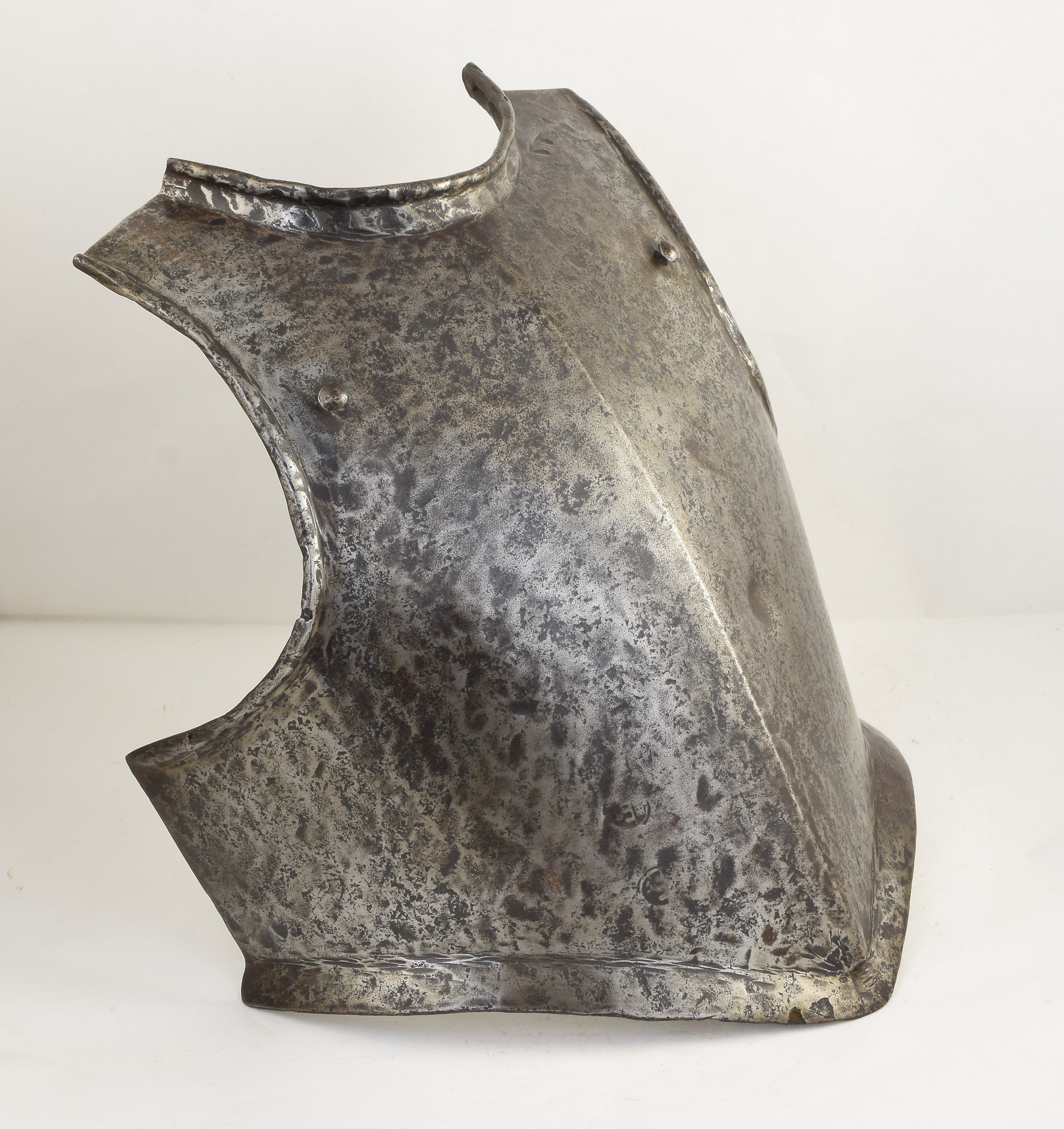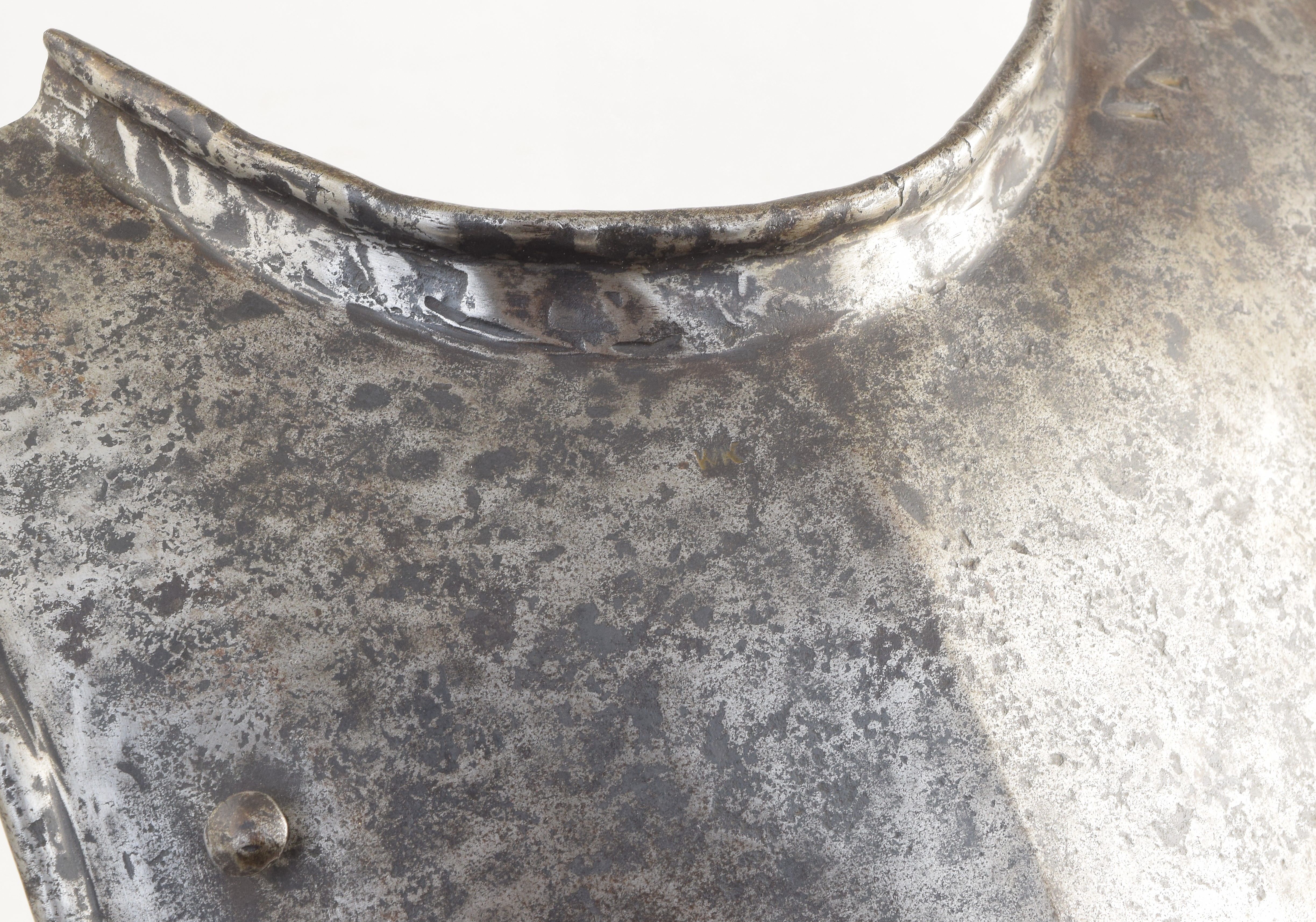 Breast with short peascod and central crease. Neck drawn up to a short integral collar. Neck and arm holes rolled. Single proof mark on the left side. Studs on each side of the chest to secure shoulder straps on the backplate. Rough from the hammer surface with small amounts of old black finish coated in modern varnish or wax (browning) with some recent oxidation. Significant signs of delamination at the sides. The surface is particularly rough, showing aggressive tool marks at the neck and waist. Marked "WK" near the neck on the right side and double marked with incomplete circular marks lower on the right center. The WK mark is described and illustrated on page 54 of "The London Armourers of the 17th Century" by Thom Richardson. It lists and illustrates the mark on harquebusier's pots (RA II.235 and IV.1603) both dated to 1650 but no maker is identified. The large circular mark appears to be a form of the mark described on page 92. It is found on a large number of pieces and Thom indicates that it appears to be a mark applied to the material on pieces intended to be shot proof. The incomplete marking is typical of this stamp - it is so large that it seems it was usually incomplete. I include an image that shows the piece half cleaned - the viewer's left side has had the varnish removed with cotton cloth and acetone and a light scrubbing with 000 steel wool. This leaves the original surface including the stable black oxide, but removes the modern discoloration and coating.