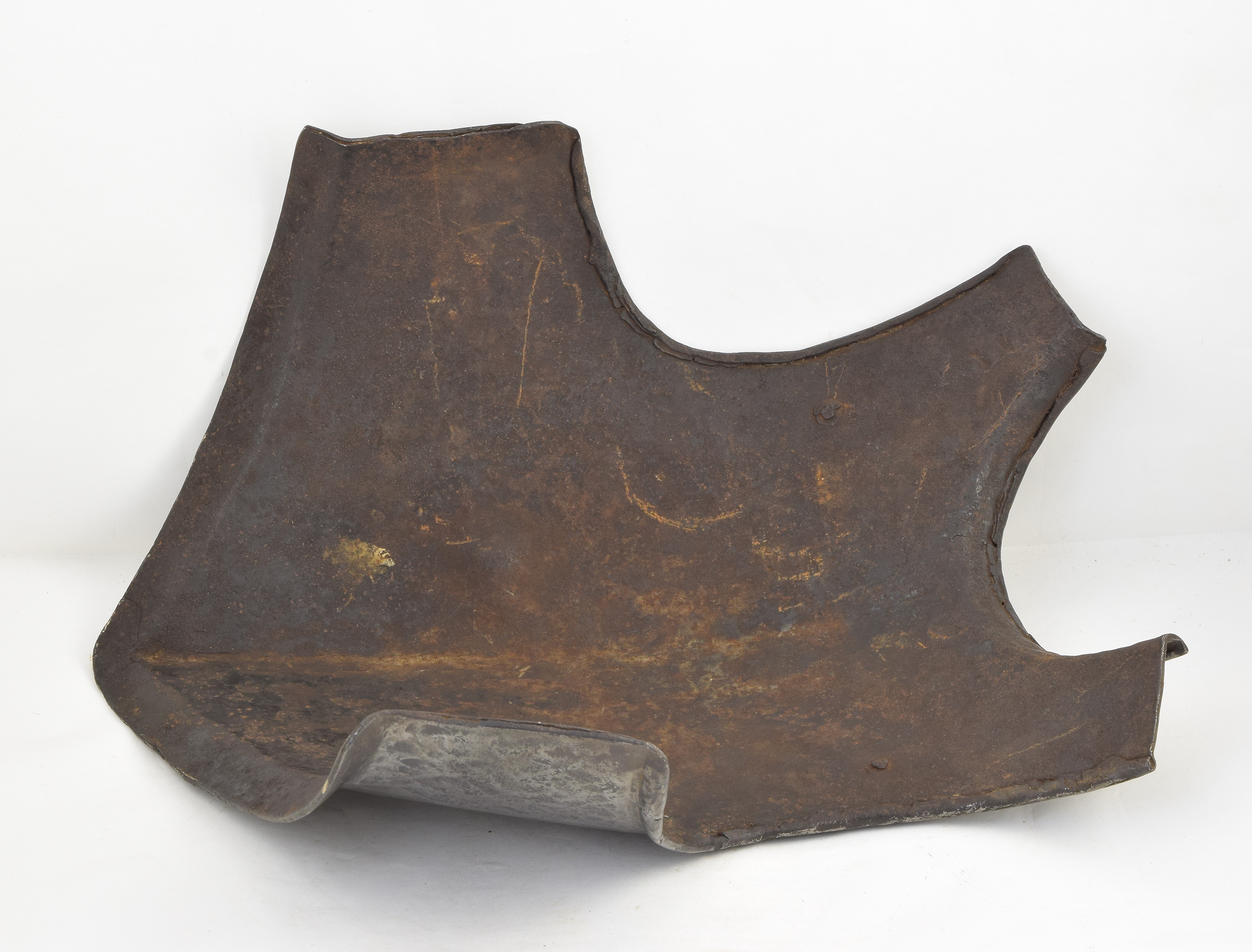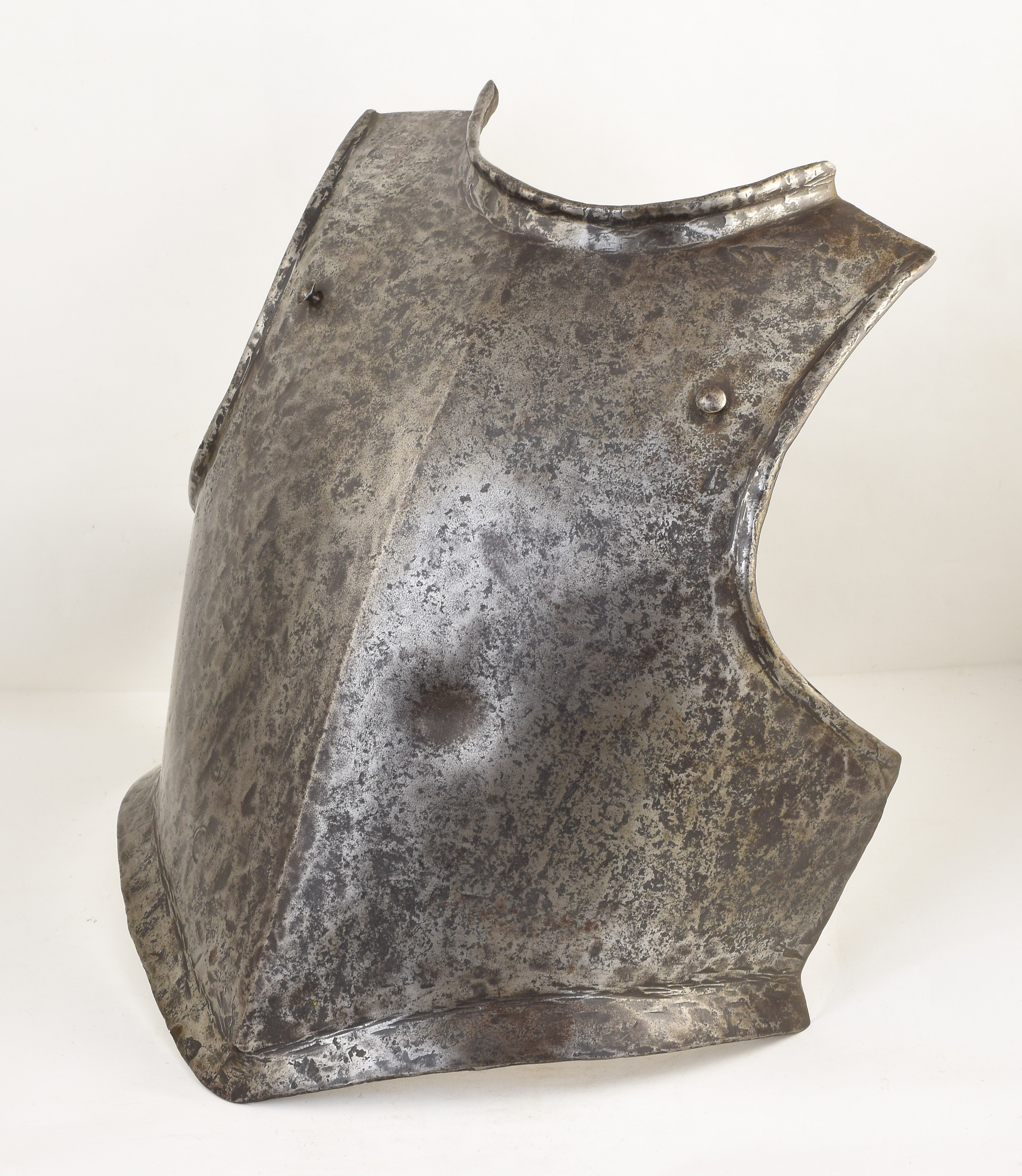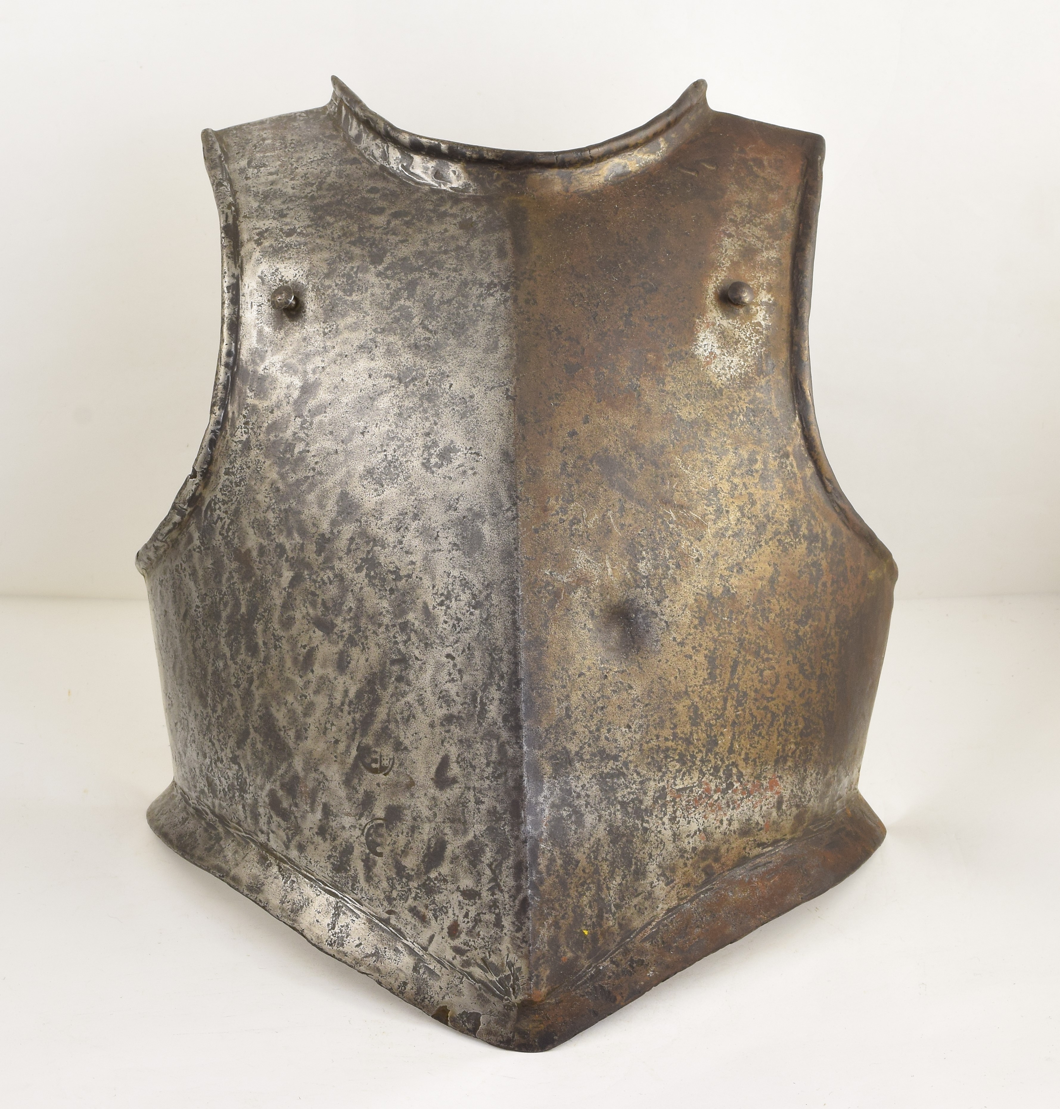 Breast with short peascod and central crease. Neck drawn up to a short integral collar. Neck and arm holes rolled. Single proof mark on the left side. Studs on each side of the chest to secure shoulder straps on the backplate. Rough from the hammer surface with small amounts of old black finish coated in modern varnish or wax (browning) with some recent oxidation. Significant signs of delamination at the sides. The surface is particularly rough, showing aggressive tool marks at the neck and waist. Marked "WK" near the neck on the right side and double marked with incomplete circular marks lower on the right center. The WK mark is described and illustrated on page 54 of "The London Armourers of the 17th Century" by Thom Richardson. It lists and illustrates the mark on harquebusier's pots (RA II.235 and IV.1603) both dated to 1650 but no maker is identified. The large circular mark appears to be a form of the mark described on page 92. It is found on a large number of pieces and Thom indicates that it appears to be a mark applied to the material on pieces intended to be shot proof. The incomplete marking is typical of this stamp - it is so large that it seems it was usually incomplete. I include an image that shows the piece half cleaned - the viewer's left side has had the varnish removed with cotton cloth and acetone and a light scrubbing with 000 steel wool. This leaves the original surface including the stable black oxide, but removes the modern discoloration and coating.