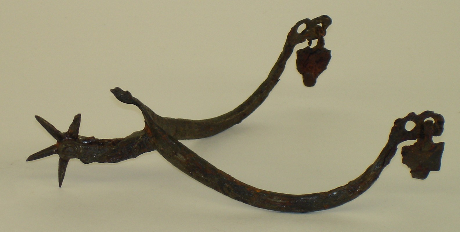 Iron. flattened half-round profile arms tapering toward the terminals. down turned at the center, each of curved form. Terminals of figure 8 form retaining the lower strap mounts on each terminal. Short up-curved stalk for the rowel. Rowel is a delicate 6 pointed form. Extension to the body at the center is drawn up into a decorative terminal of a simple acorn form.