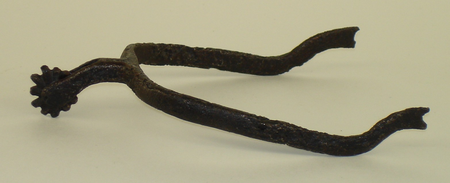Iron. Remains of multi-pointed rowel. Rectangualr down-curved stalk. Arms of flat cross section straight for most of their length, with the ends curved up. Terminals missing.