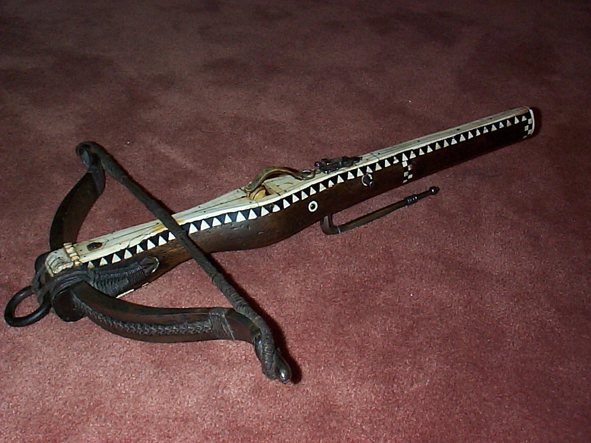 Crossbow. Steel prod of heavy form. Tiller with swell at the prod and nut, tapering to the butt. Top of tiller overlayed with bone. Upper edge of the tiller decorated with alternating triangles of white and black-stained bone. Bone nut. Very nice early form.