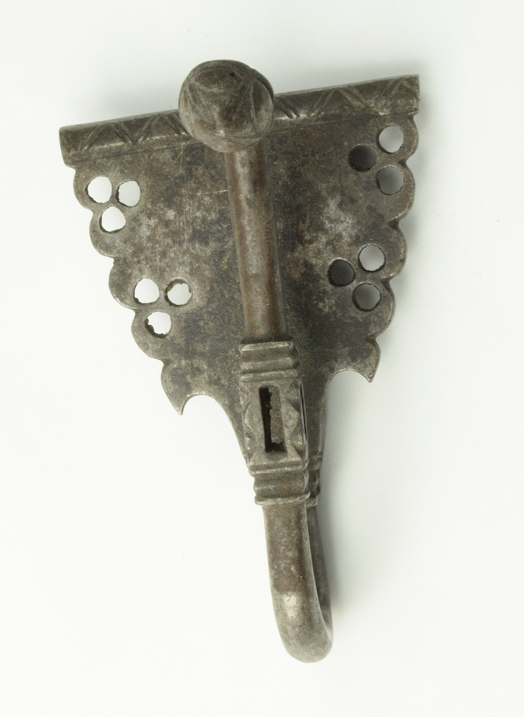 Sword hanger. Polish/Hungarian. Base composing a belt loop. decorated with trefoil piercings and filed decoration at the edges. Hook incorporating a central square section pierced with rectangular slots. Tip of the hook swelled into a flower form. Brown patina with some wear.