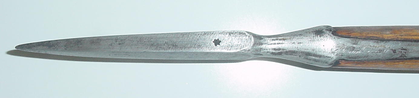 Measurements taken from one example of 6. First measurements in inches, centimeters in parentheses. Length of this one is 15 feet. Others vary between 14 feet 9 1/2 in. and 15 feet 2 1/2 in. Using the 15 foot one and measuring from the end of the point, the neck is 4 1/2, whole head 6 and straps end 28 1/2 in from the point. Circumfrences - base of head 2 15/16(7.5) then at each 12 in. increments from the point 3 1/8(8), 3 3/8(8.5), 3 5/8(9.3), 3 13/16(9.7), 3 15/16(10), then the same until I get out to 9 feet where it is 4 1/8(10.4), 4 1/4(10.8), 4 3/16(10.7), 4 1/8(10.4), 4 1/16(10.3), 3 15/16(9.9), 3 5/8(9.4). All measurements peformed using a sewing tape with metal end so they are likely just slightly large, but consistently so. Additional measurements taken on some other pikes at the 4 foot from the back spot (roughtly the wide spot). They measured 4 5/16(11), 4 1/4 (10.7), 4 9/16(11.5) and 3 15/16(10).