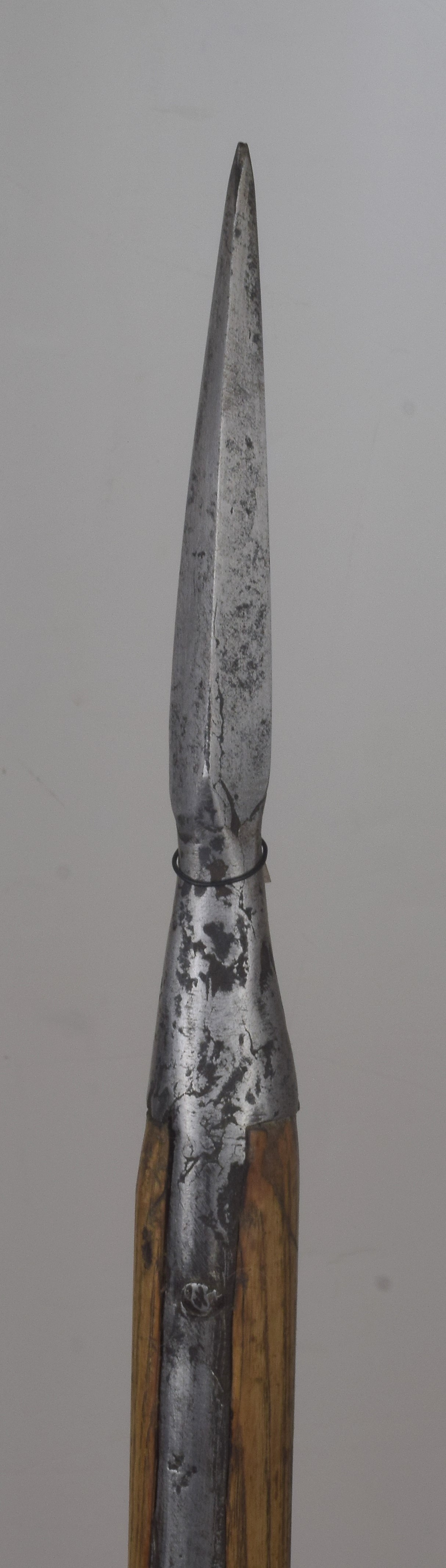 Pike. Recently obtained directly from the Luzern Zeughaus (arsenal), this pike has been in storage and periodic use there since the late 15th/early 16th Century. Shows hand forging and lamination, with square/diamond section point, round ferrule, and side straps xx inches long. It is mounted on a hand-hewn tapering round-section arsenal shaft of ash, which is old and original to the period of use. It was common for the arsenals to periodically replace polearm shafts as they showed signs of damage or rot, so it is virtually impossible to determine the age of a polearm shaft. This is certainly not a museum or collector replacement. Markings were also added at various times. Shaft is plain. All show storage and handling marks and some have scattered worming, but all are fully sound and serviceable. Some have painted inventory numbers. Pikes of this exact style and description are pictured and described in Katalog der Waffen-Sammlung im Zeughause zu Solothurn, by Dr. Rudolph Wegeli, published 1905. Some even bear the same star or boot-shaped maker’s marks, as well as a horseshoe mark with two points above. Pikes of this type are also described in “Katalog der Historischen Sammlungen im Rathause in Luzern”, a published inventory of weapons in the Luzern Zeughaus. It is extremely rare to find a group of historical weapons of this age from their original source with no alterations. While pikes were common in the 16th and 17th Centuries, very few now survive in their full length.Overall lengths vary between 14' 1"" to 15' 4"", most being just over 15 feet. Metal is forged iron and length varies between 20"" and 35"", with side straps set in hand cut dados in the shaft. Straps fastened with iron head nails from the period of the shafts, but some are later replacements. LZ-12, 15', 4""blade, 6"" head, 22 1/4"" straps.