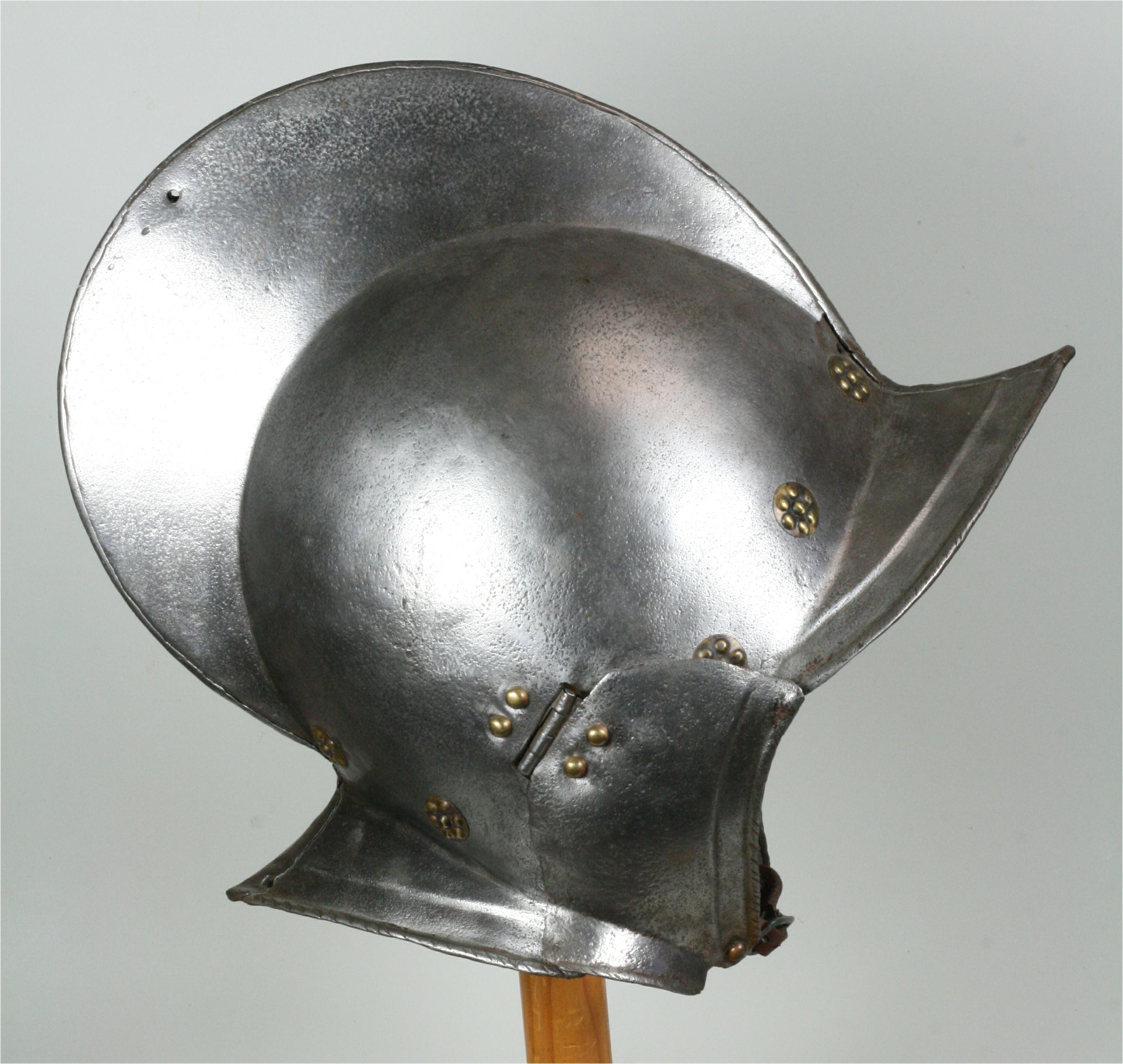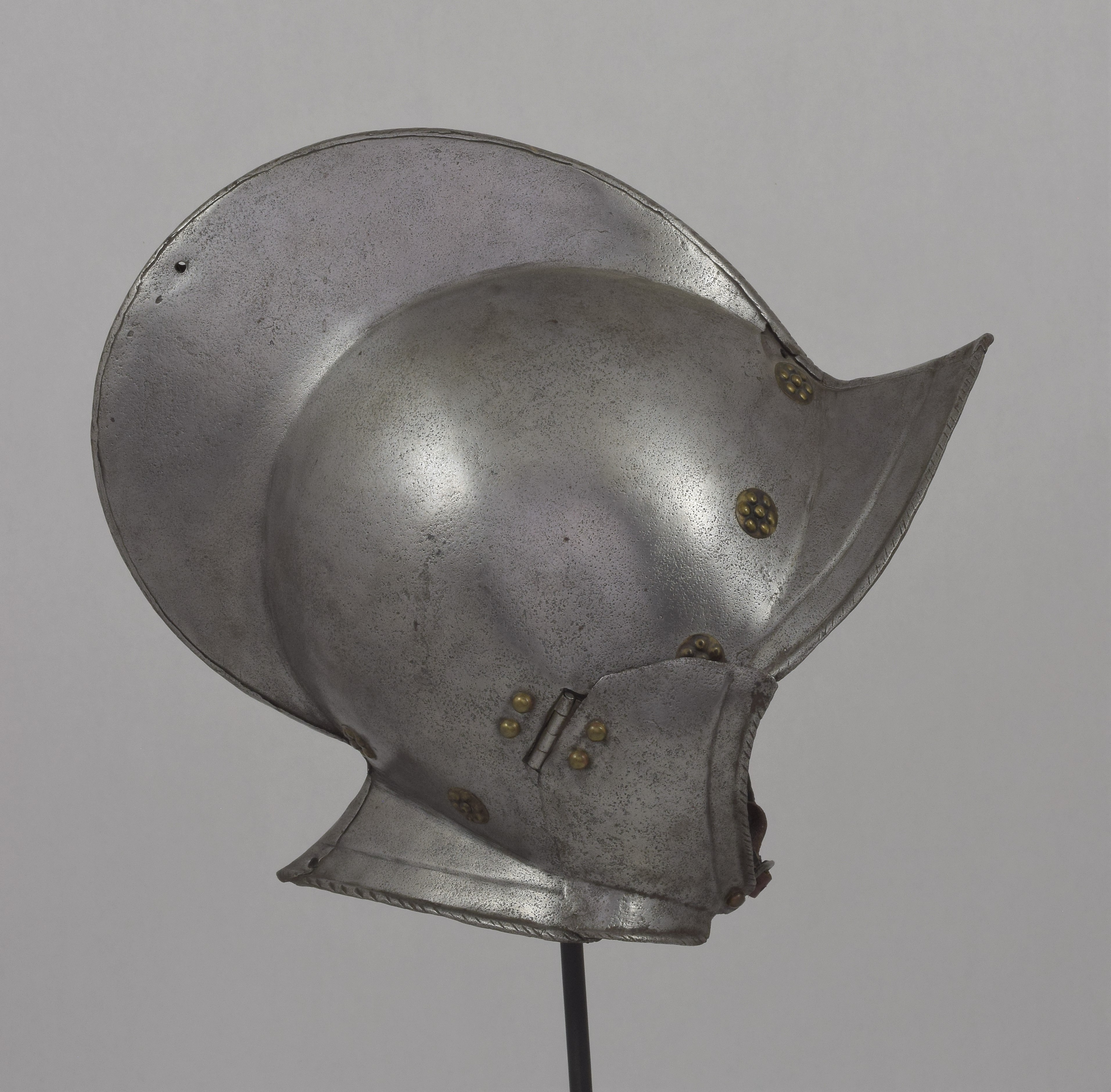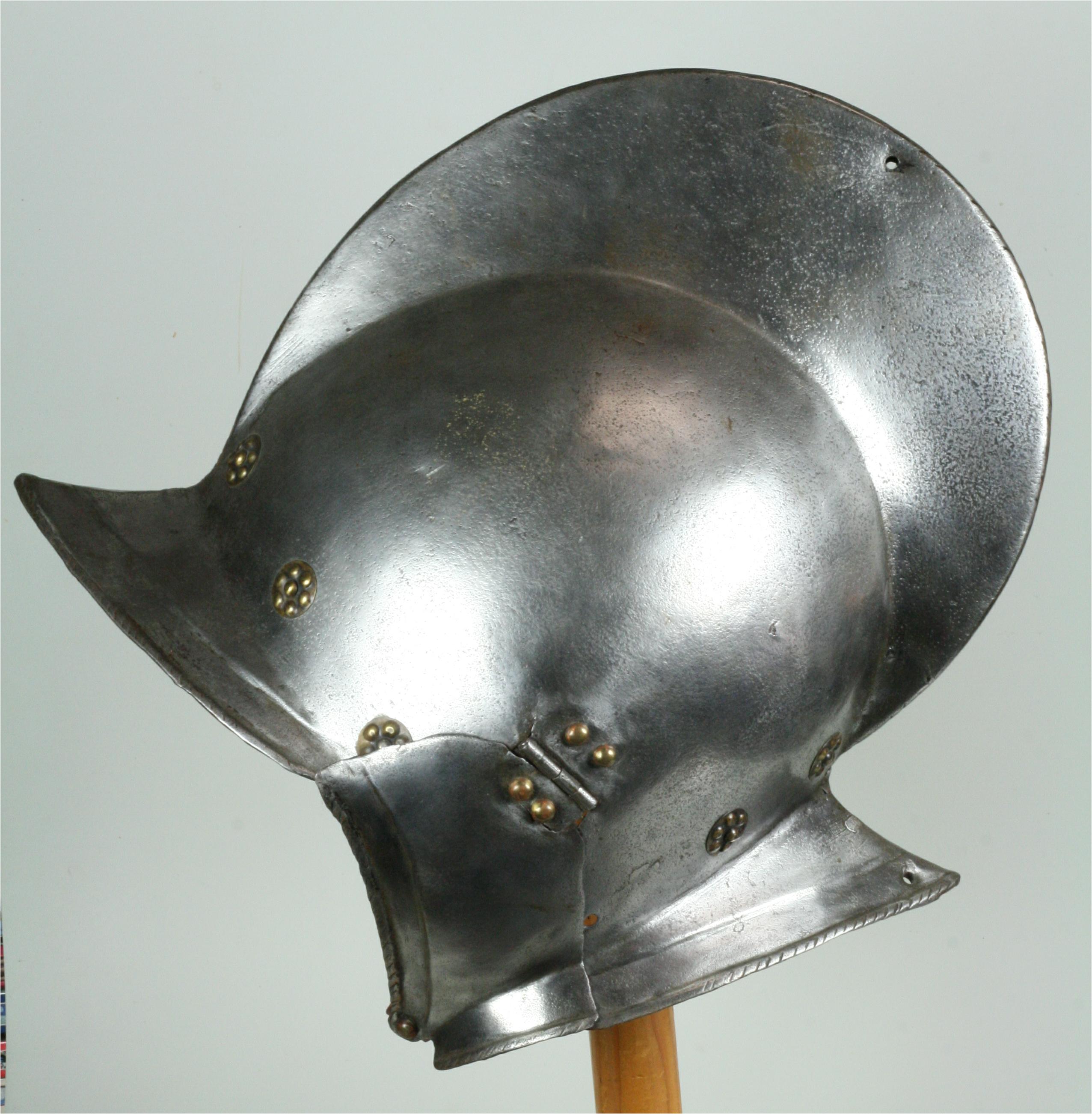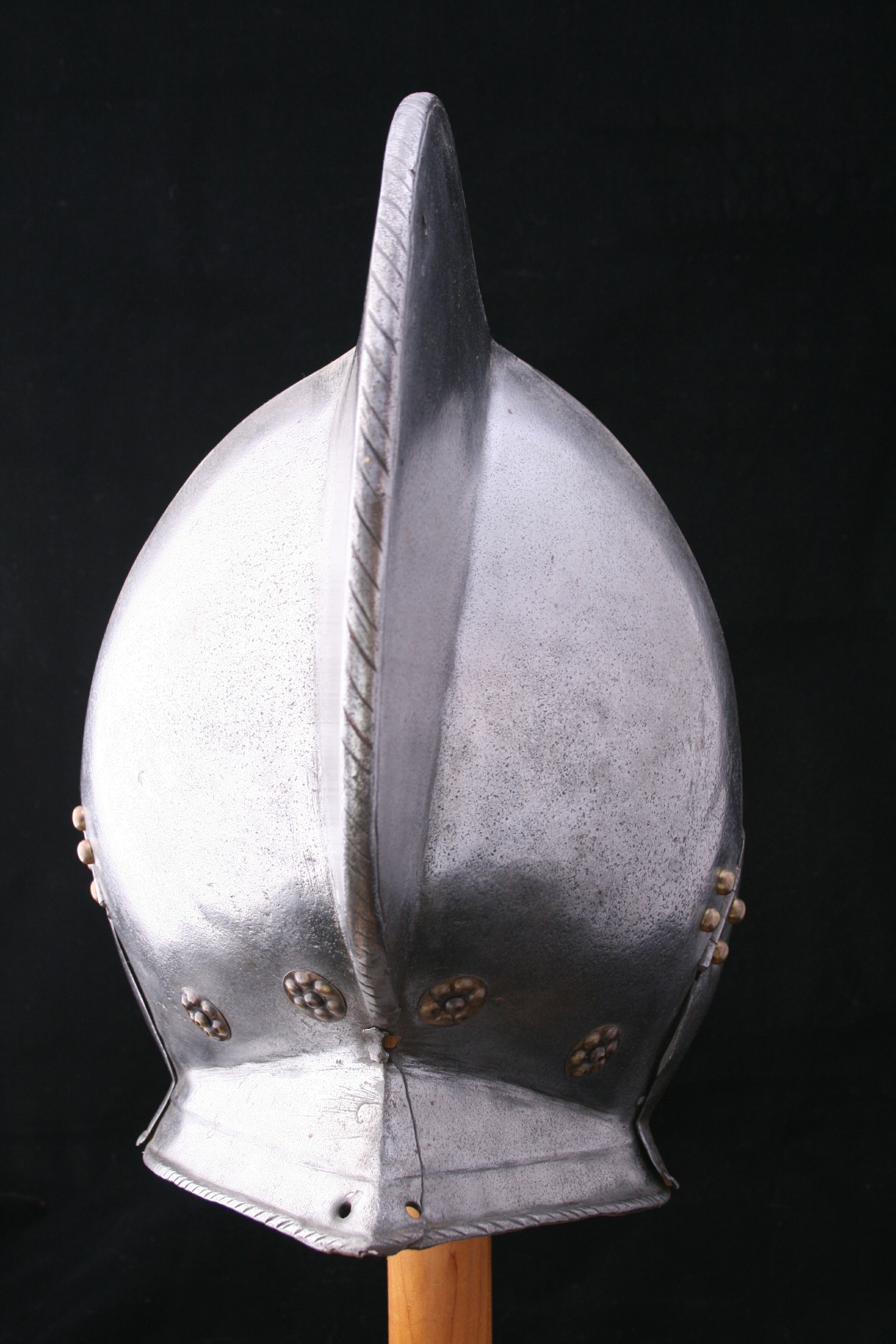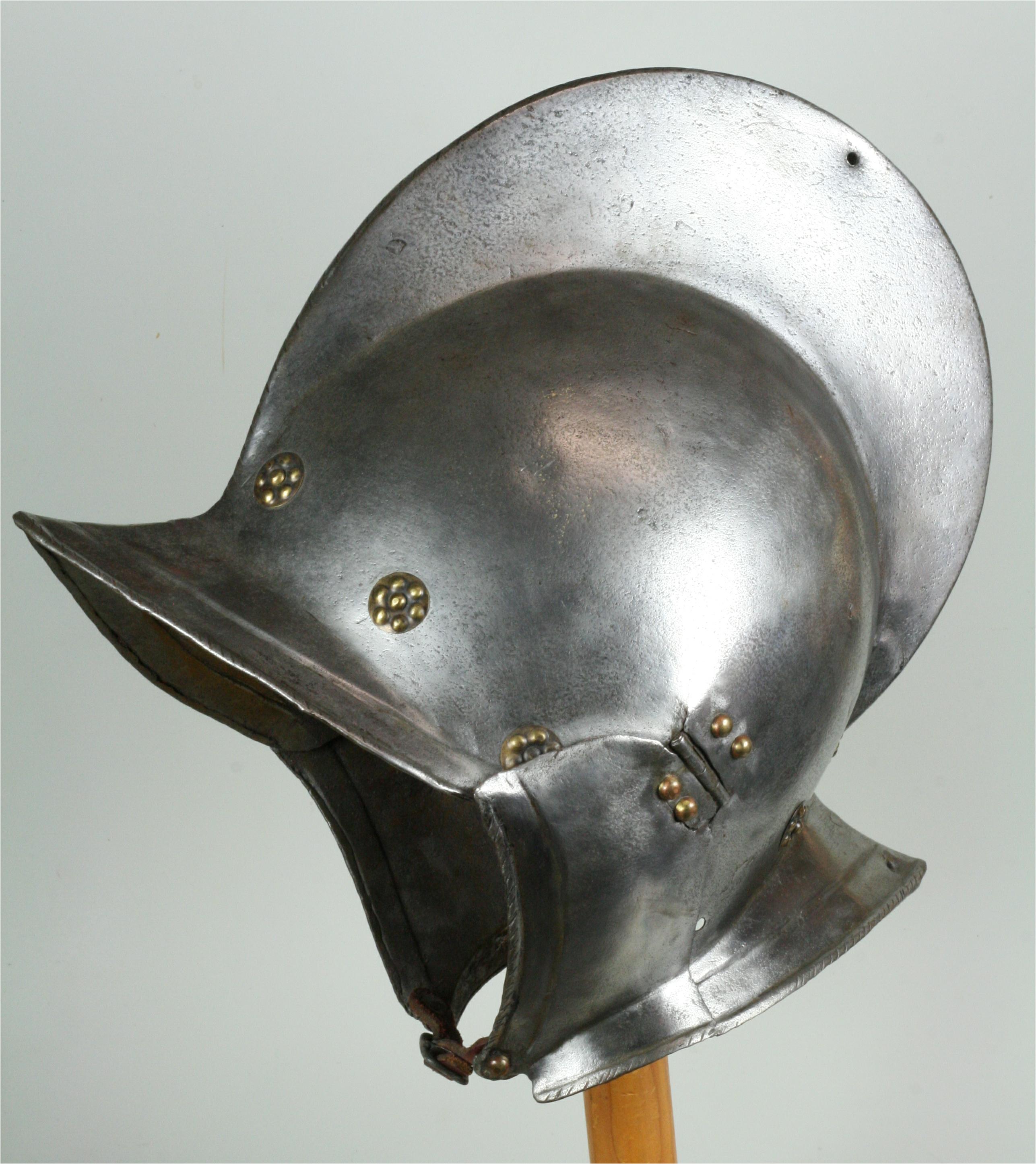 Burgonet. 2 piece skull with origninally smooth surface. Extremely high, rear-swept comb. Pointed brim and tail integral to the bowl, each with rolled, roped and recessed borders. Small, original cheek plates with rolled, roped and recessed borders. The form of the bowl is remeniscent of morions at the time with aggressively pointed brow and neck. Shows signs of significant pitting and later cleaning. Rivets and decorative washers replaced. There seem to be some signs of likely original deep scratches from the cleanup of the piece at the back next to the crease and at the base of the comb.