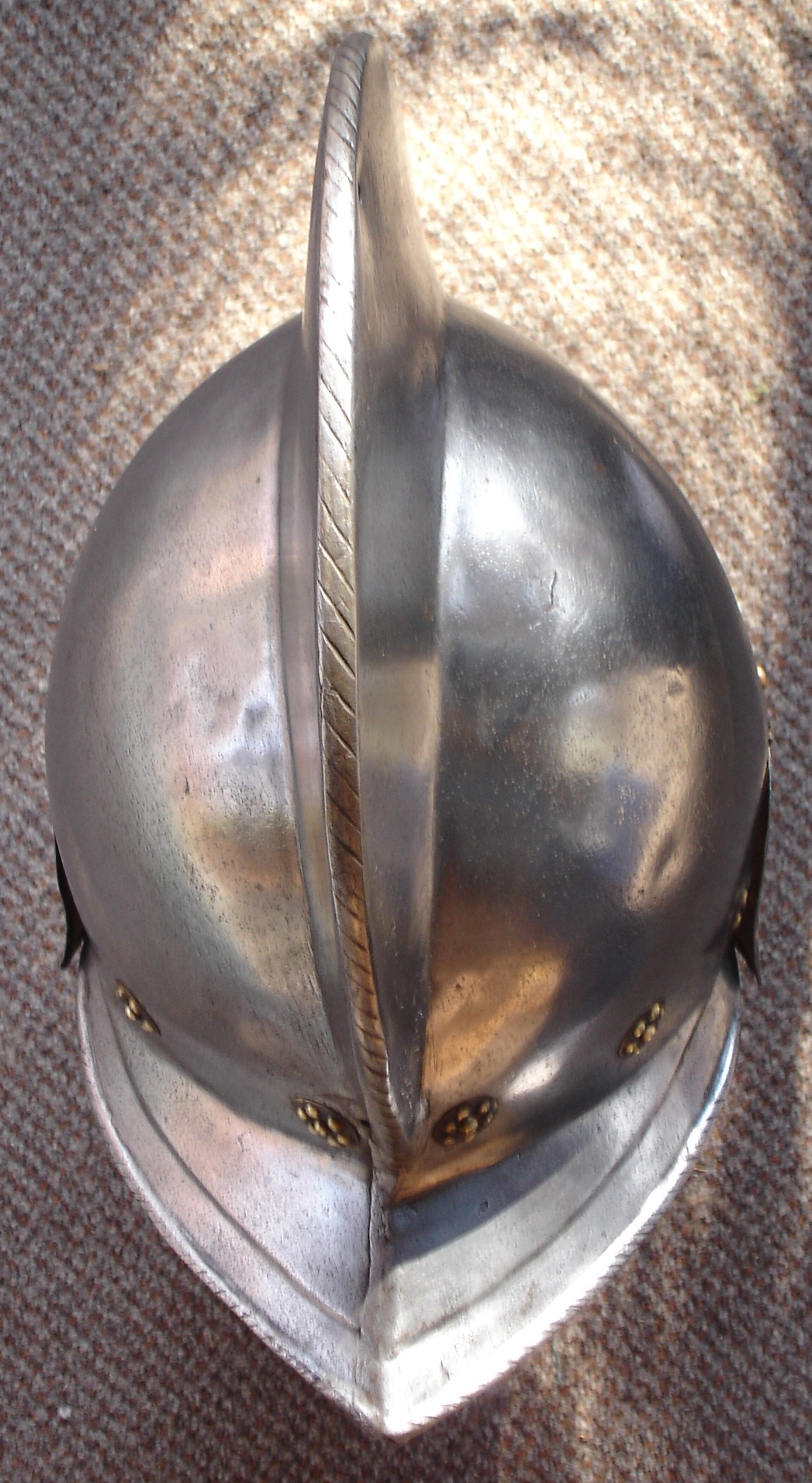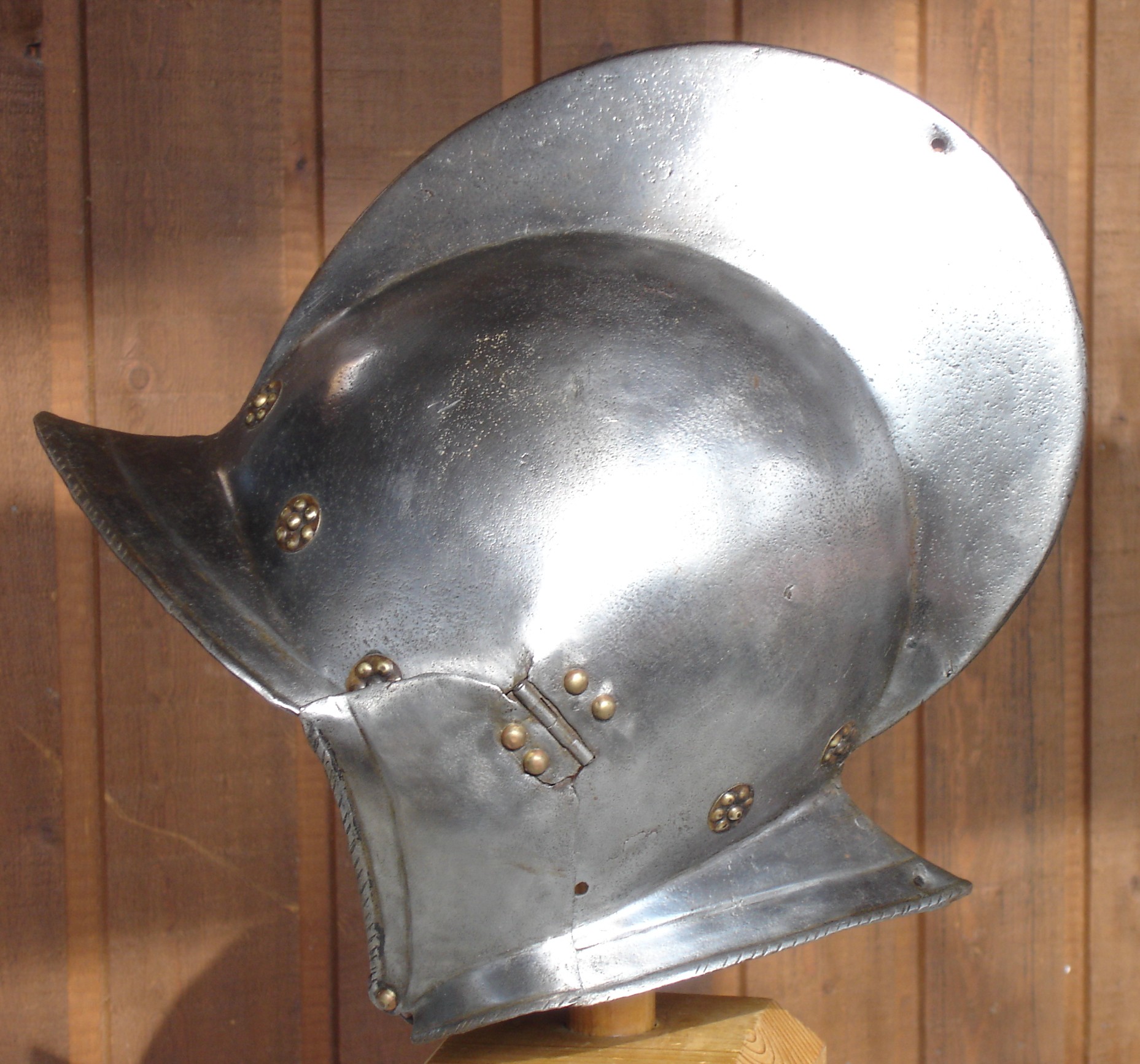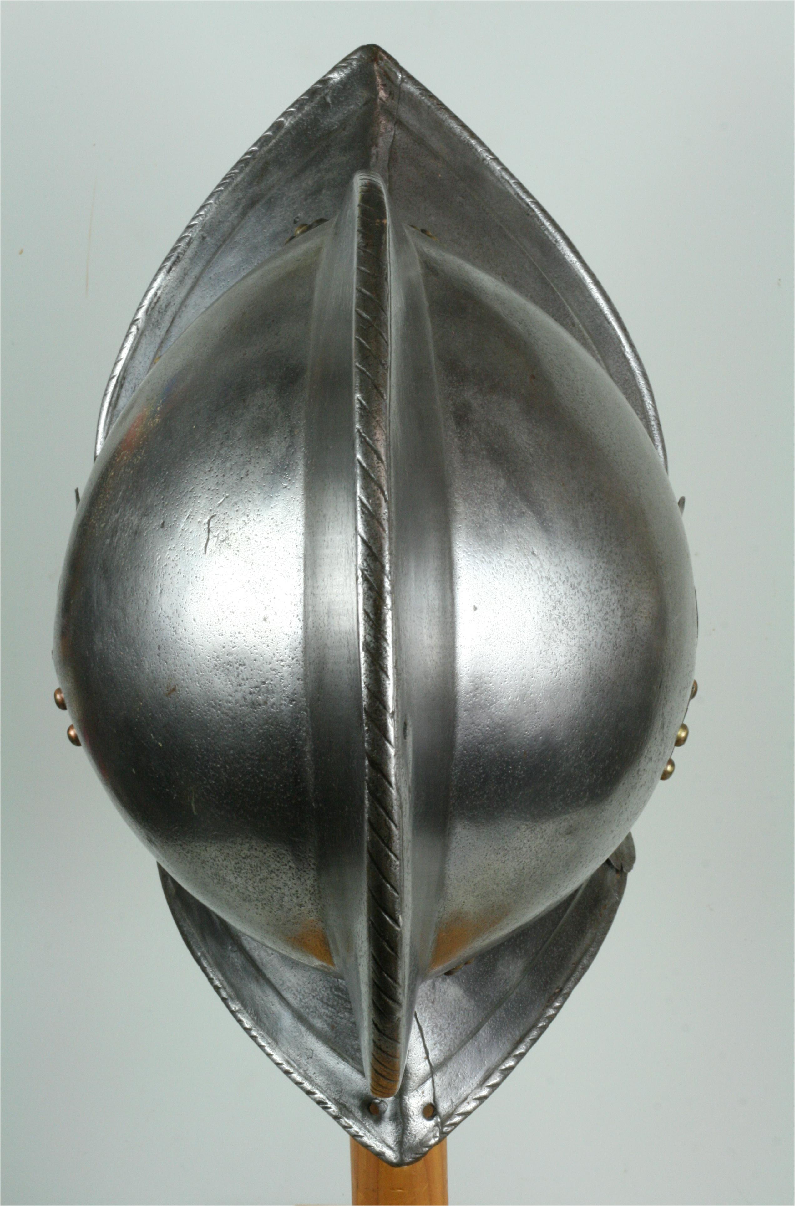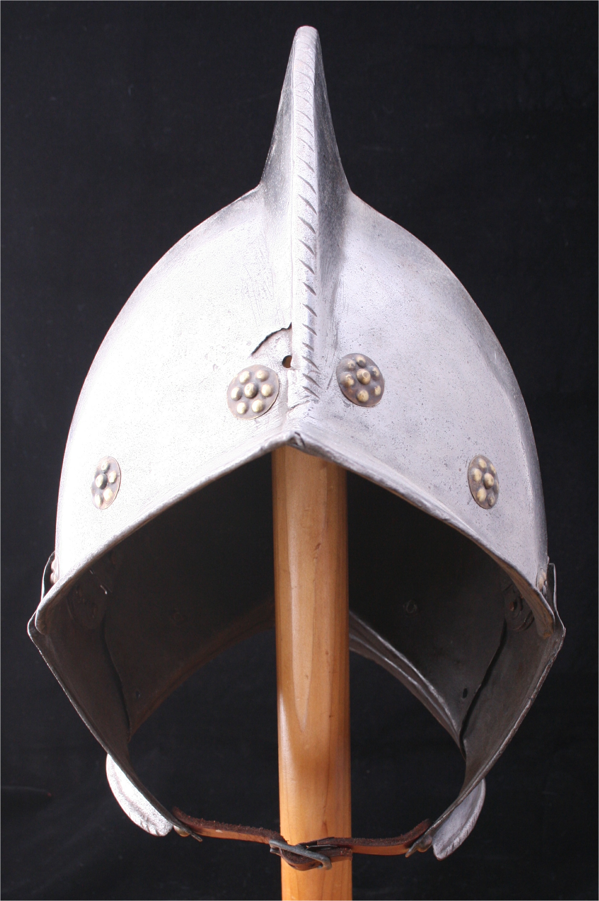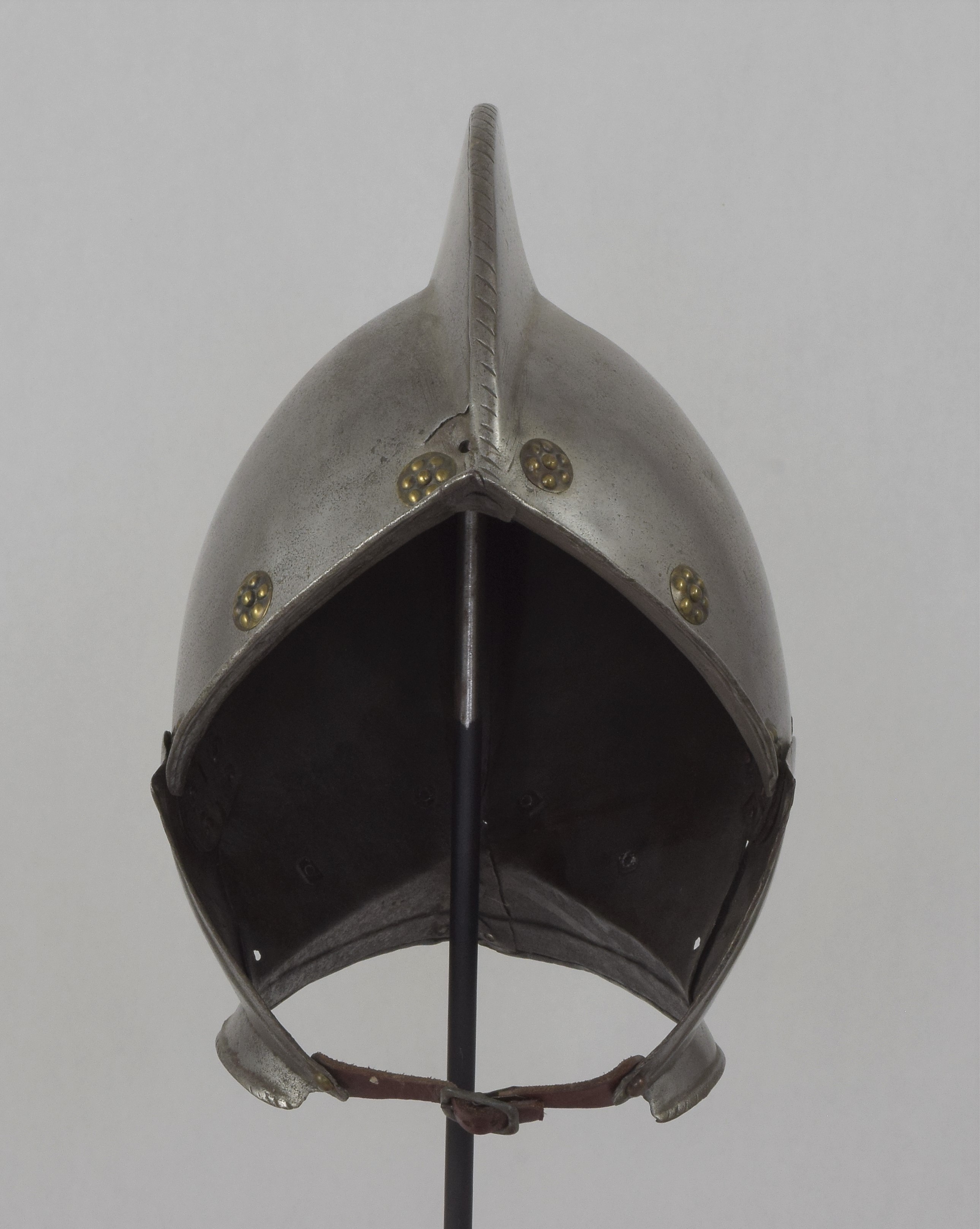 Burgonet. 2 piece skull with origninally smooth surface. Extremely high, rear-swept comb. Pointed brim and tail integral to the bowl, each with rolled, roped and recessed borders. Small, original cheek plates with rolled, roped and recessed borders. The form of the bowl is remeniscent of morions at the time with aggressively pointed brow and neck. Shows signs of significant pitting and later cleaning. Rivets and decorative washers replaced. There seem to be some signs of likely original deep scratches from the cleanup of the piece at the back next to the crease and at the base of the comb.