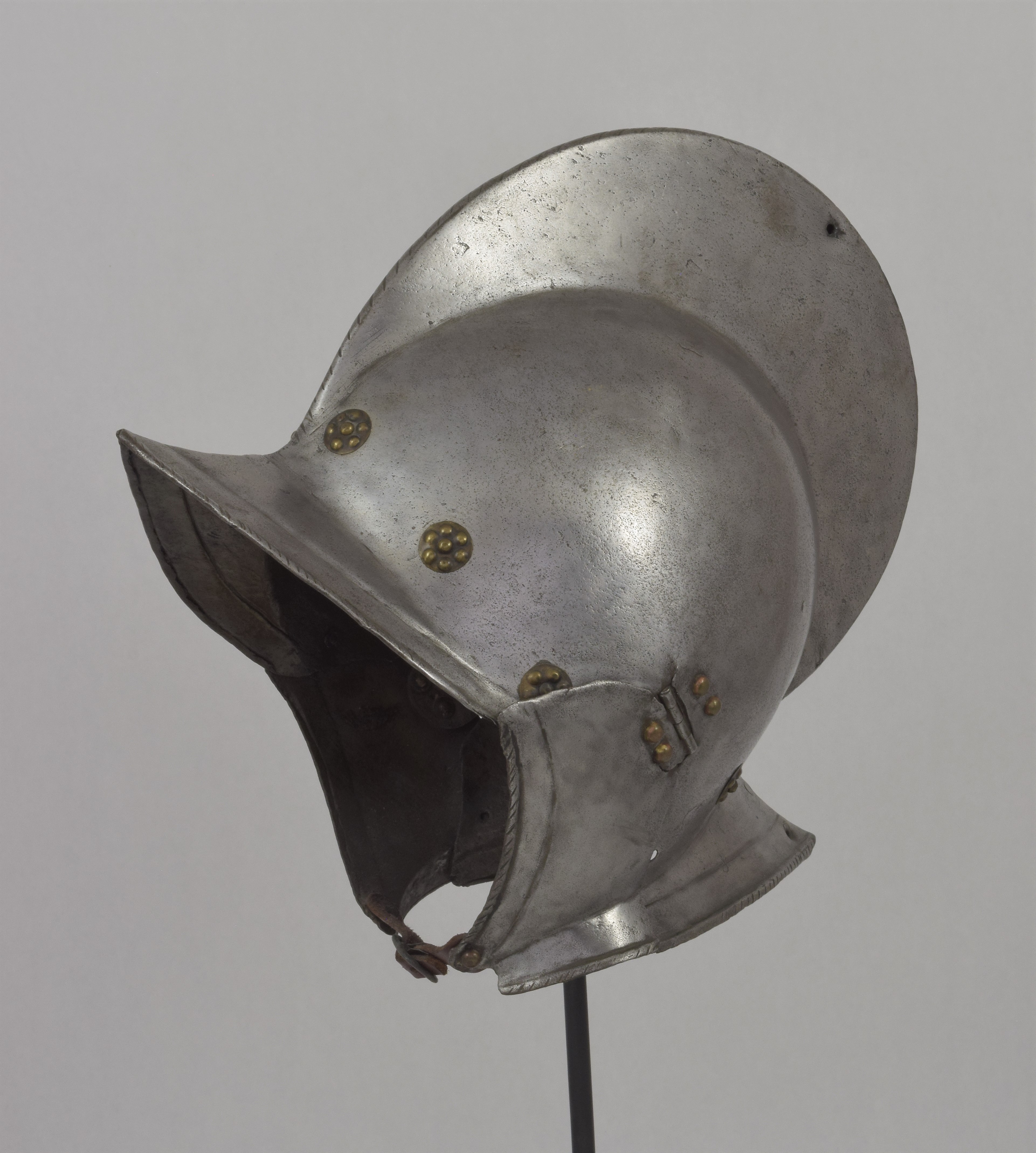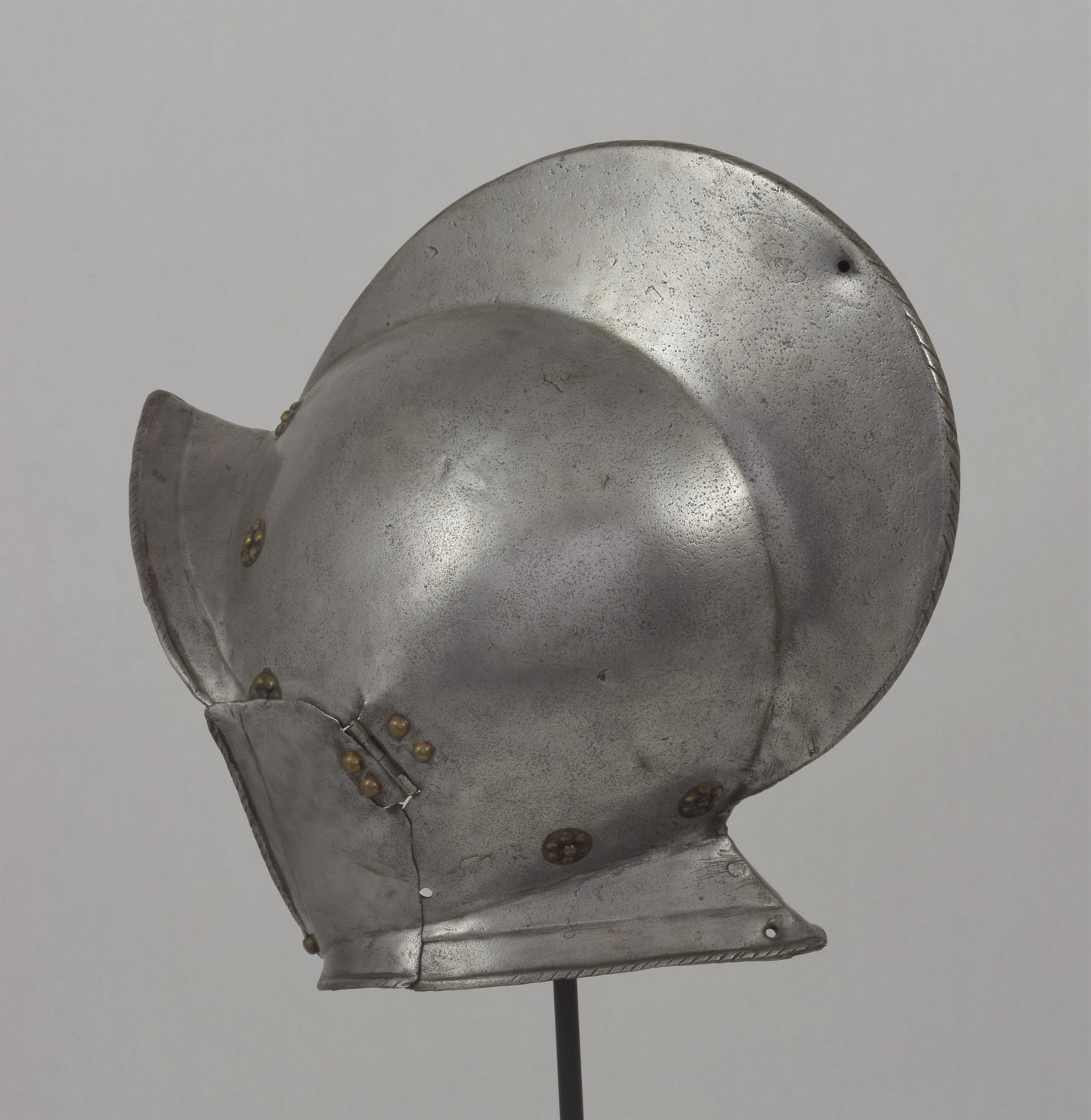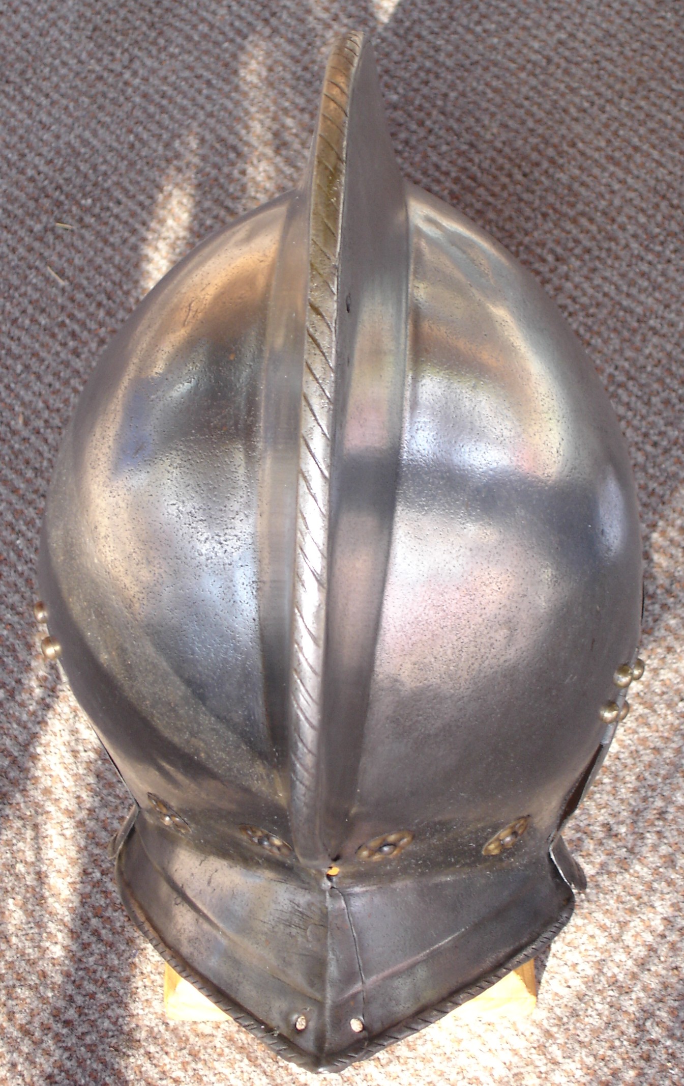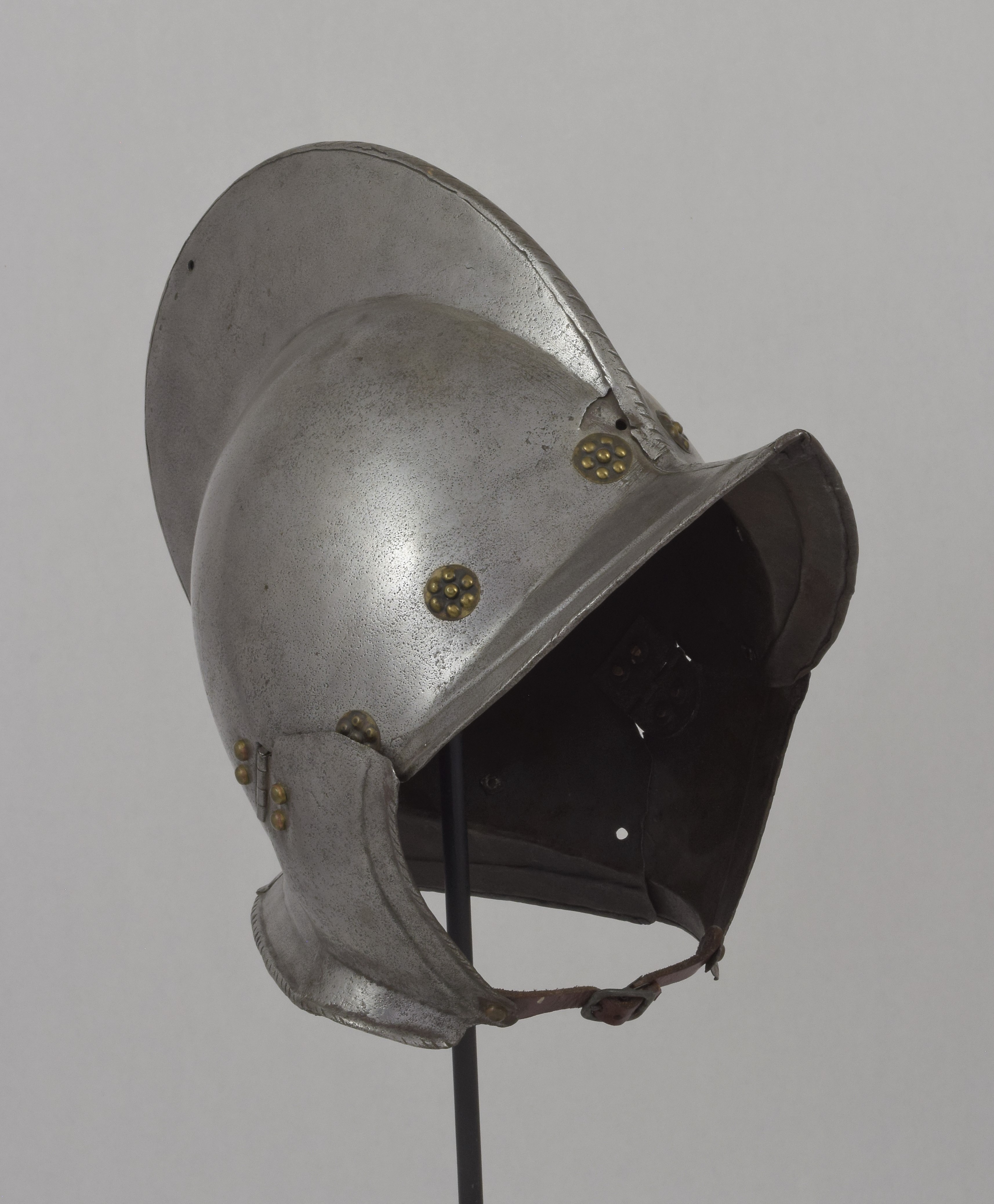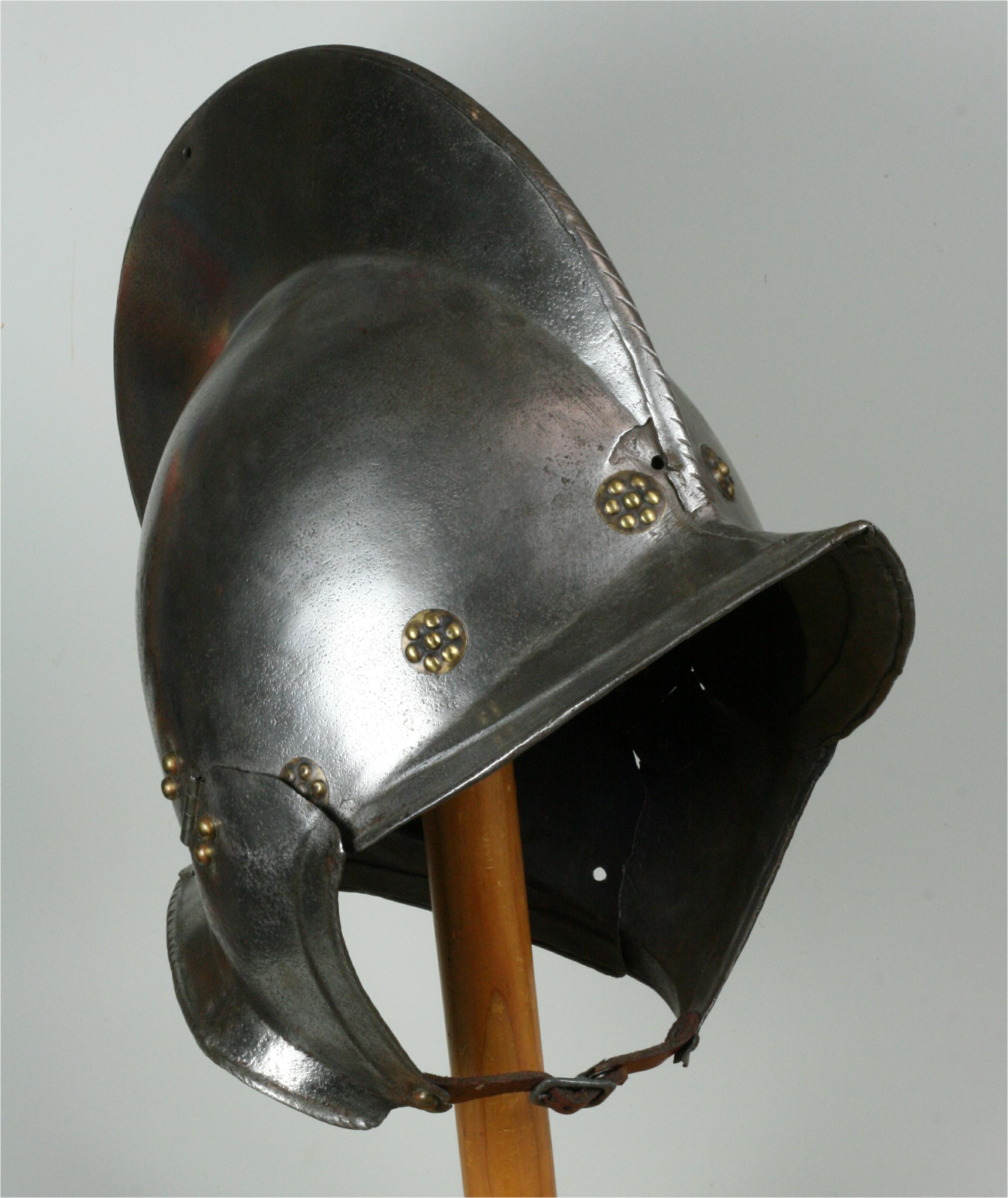 Burgonet. 2 piece skull with origninally smooth surface. Extremely high, rear-swept comb. Pointed brim and tail integral to the bowl, each with rolled, roped and recessed borders. Small, original cheek plates with rolled, roped and recessed borders. The form of the bowl is remeniscent of morions at the time with aggressively pointed brow and neck. Shows signs of significant pitting and later cleaning. Rivets and decorative washers replaced. There seem to be some signs of likely original deep scratches from the cleanup of the piece at the back next to the crease and at the base of the comb.