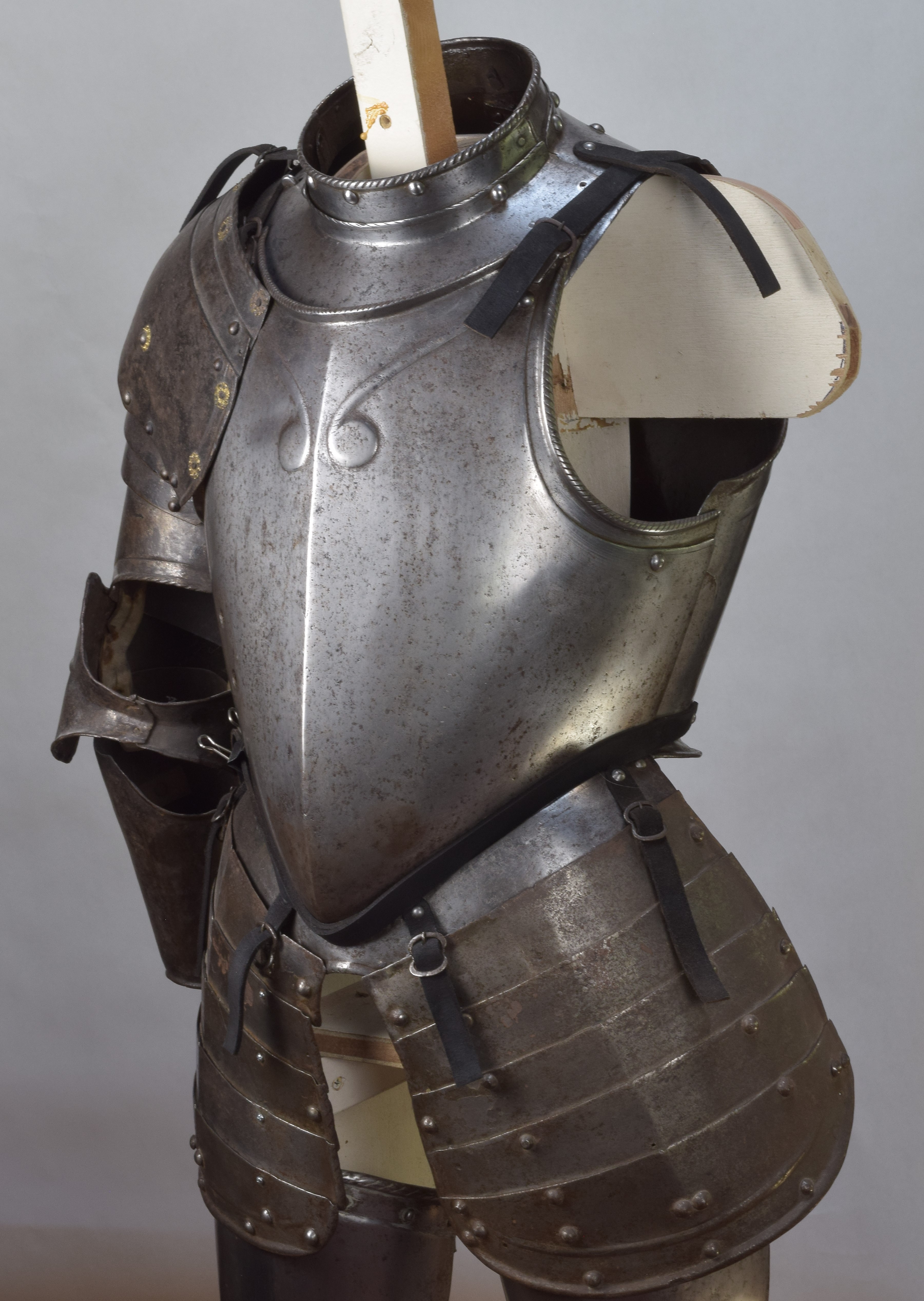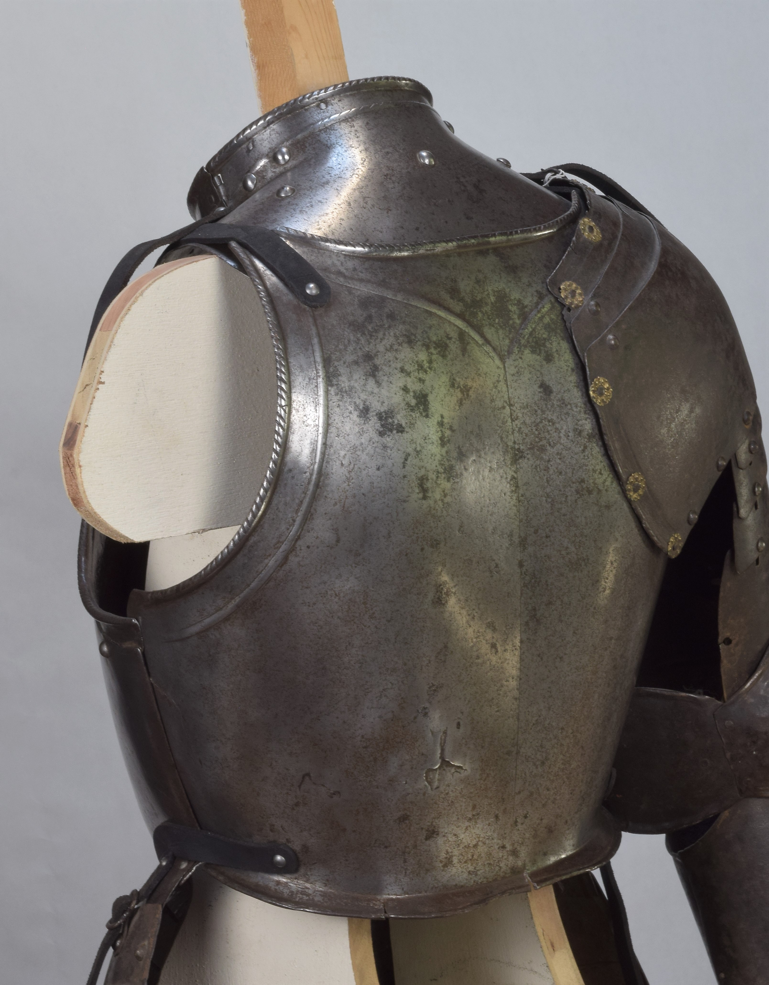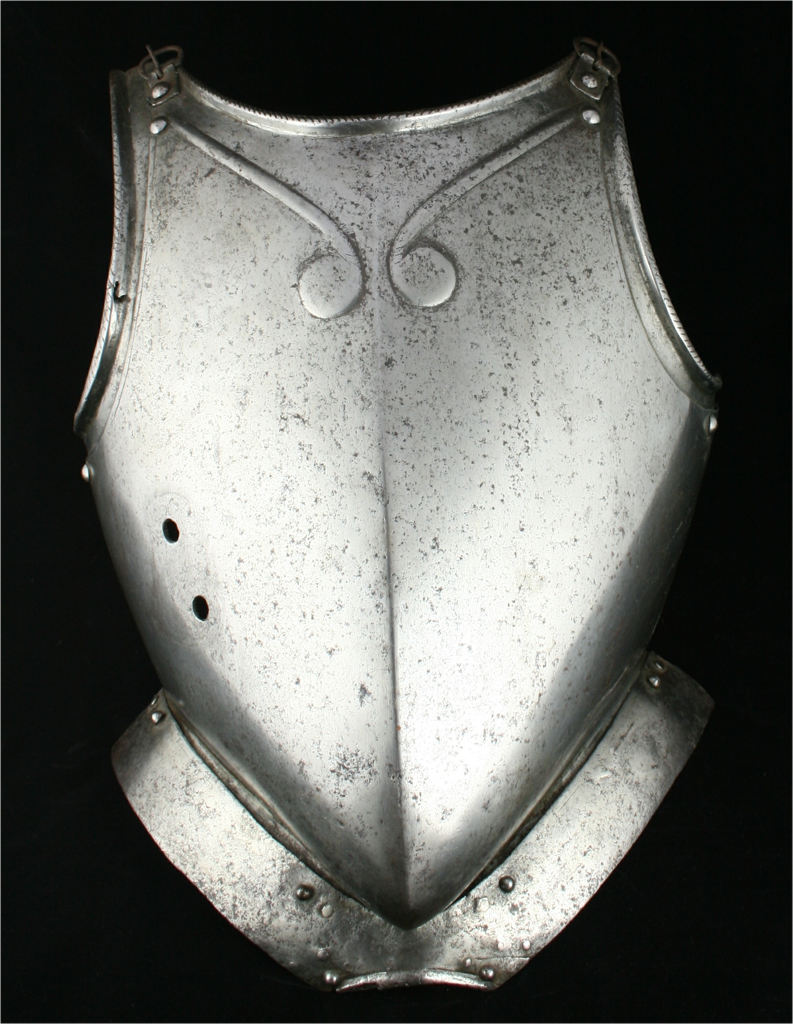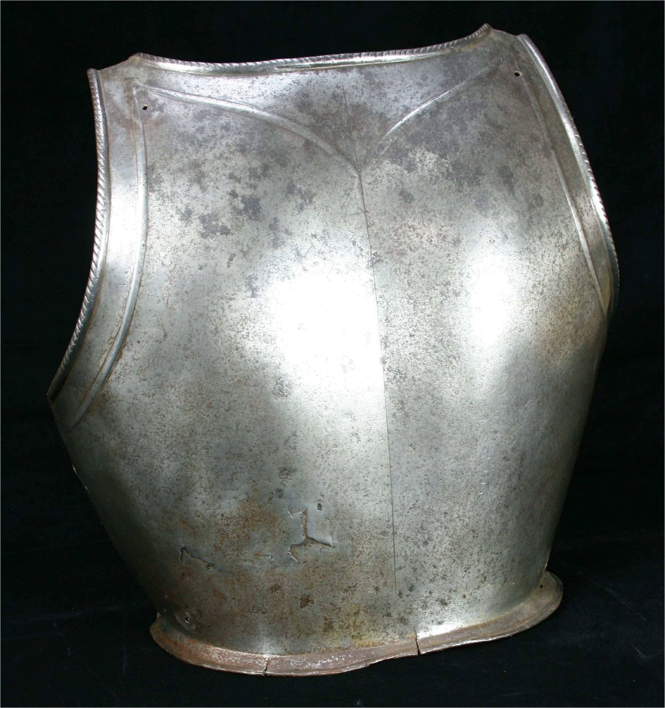Breast-plate of deep peascod form with medial ridge and two embossed volutes at the top, armhole gussets, single plate skirt, and later fixed lance-rest (removed). Tall inward-turned, finely roped rolls at the neck and armholes. The armholes on the main plate have a line incised parallel to the edge. Fauld lame with incised line parallel to the upper edge and inward-turned roped roll central arch. Steel buckles at the shoulders. Back-plate shaped to the back, embossed with rounded ribs in the form of a 'V' towards the top and parallel to the arm holes. With incised vertical line at the center. Inward-turned, roped rolls at the neck, arms and on the edge of the narrow waist flare. Breast of heavier form, consistent with those made for cavalry use. Breast and back associated. Similar to those on B-13 from Mantova. Displayed as part of item number A-114.