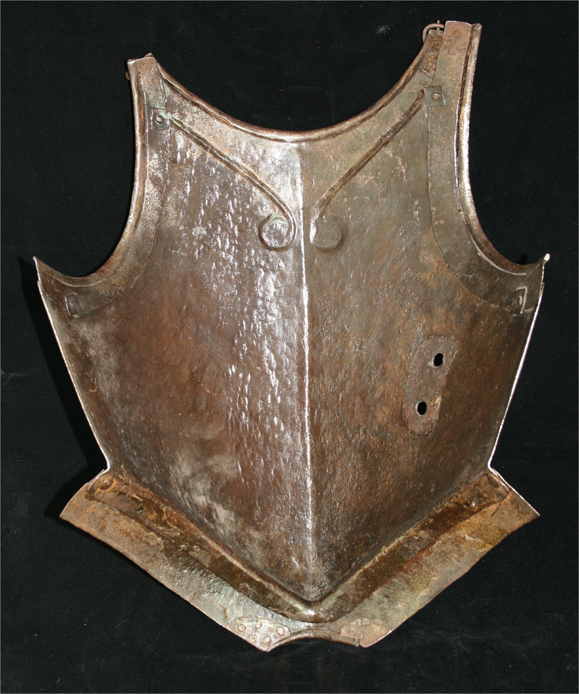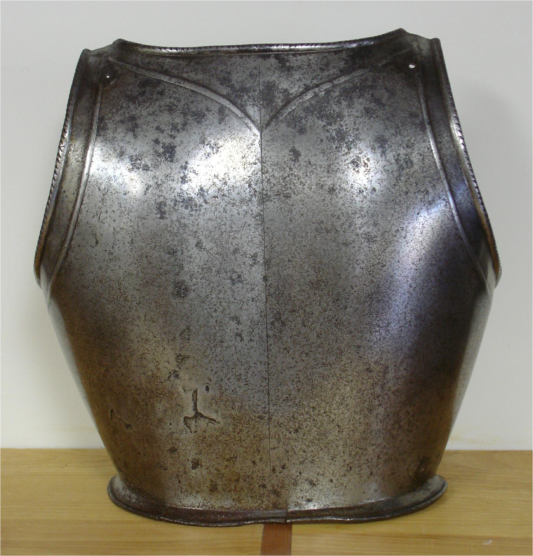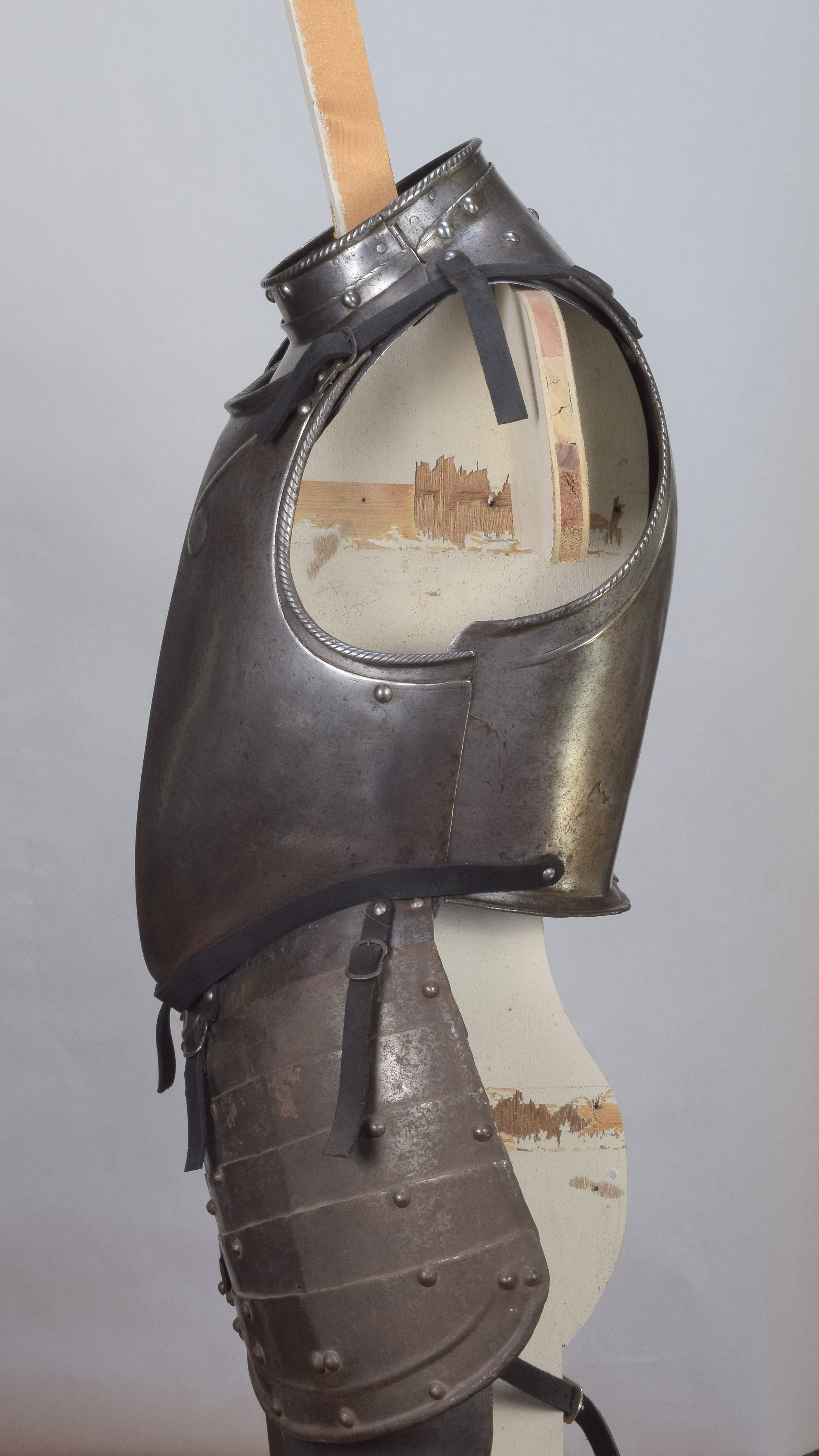 Breast-plate of deep peascod form with medial ridge and two embossed volutes at the top, armhole gussets, single plate skirt, and later fixed lance-rest (removed). Tall inward-turned, finely roped rolls at the neck and armholes. The armholes on the main plate have a line incised parallel to the edge. Fauld lame with incised line parallel to the upper edge and inward-turned roped roll central arch. Steel buckles at the shoulders. Back-plate shaped to the back, embossed with rounded ribs in the form of a 'V' towards the top and parallel to the arm holes. With incised vertical line at the center. Inward-turned, roped rolls at the neck, arms and on the edge of the narrow waist flare. Breast of heavier form, consistent with those made for cavalry use. Breast and back associated. Similar to those on B-13 from Mantova. Displayed as part of item number A-114.