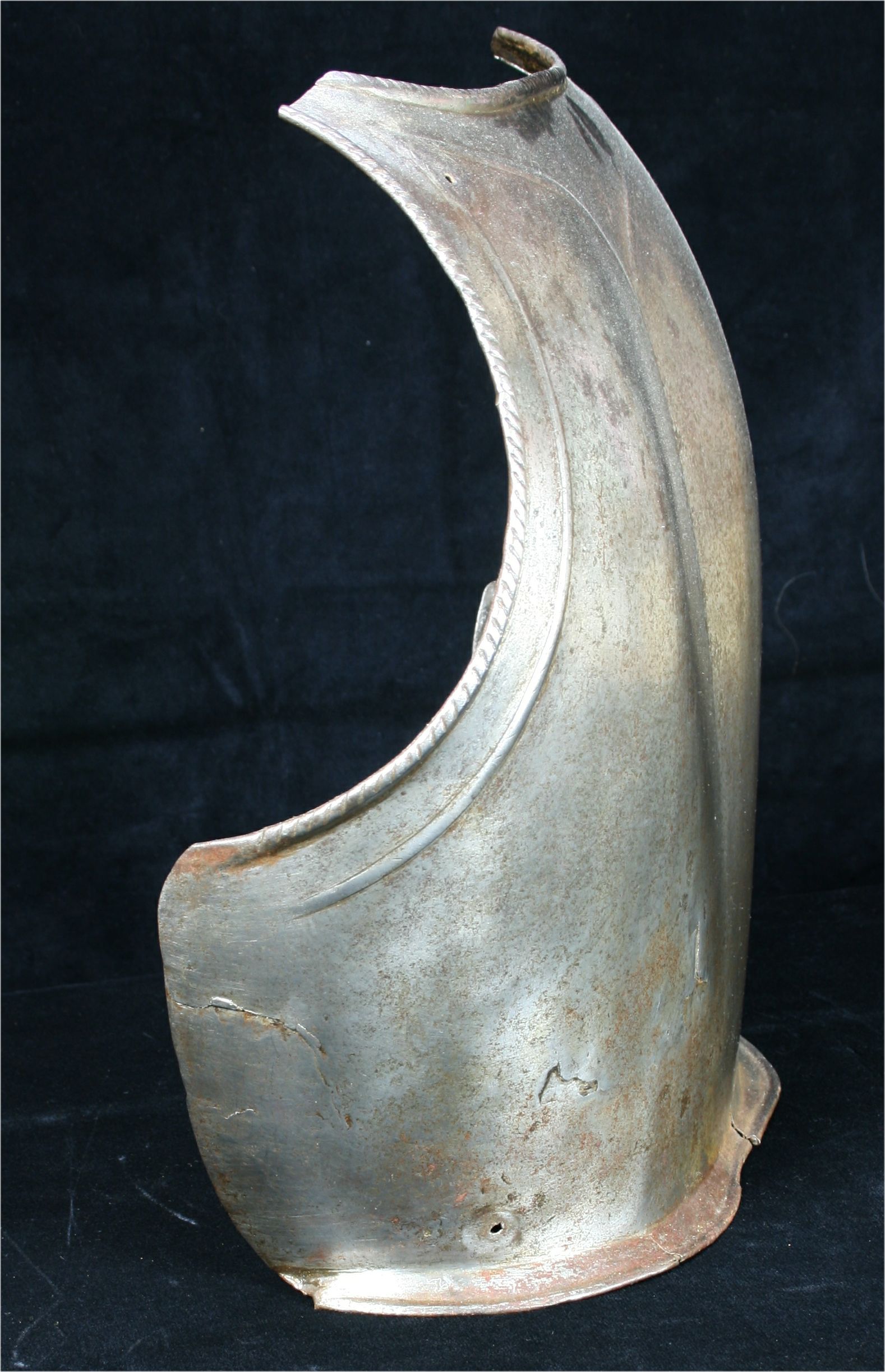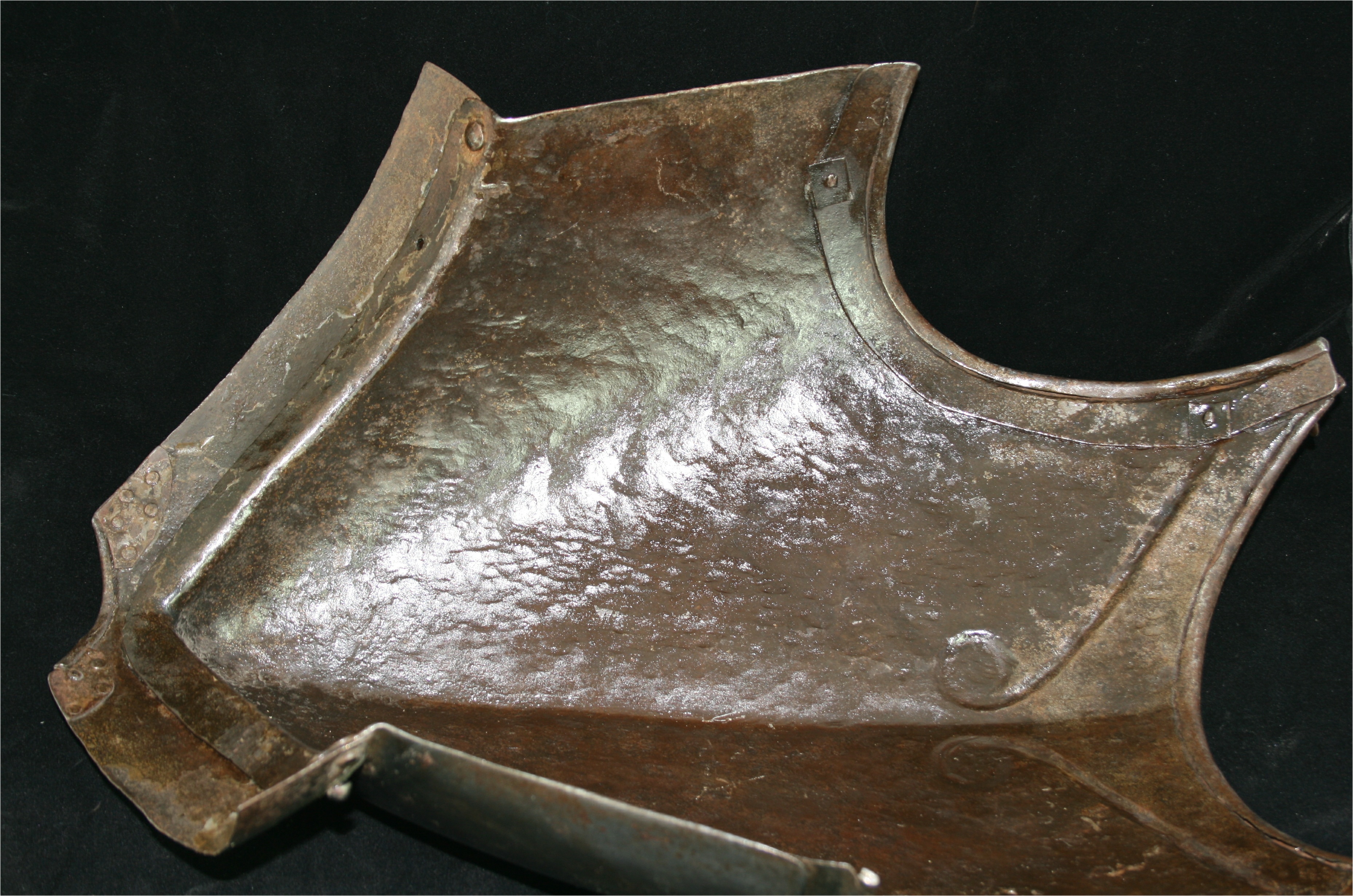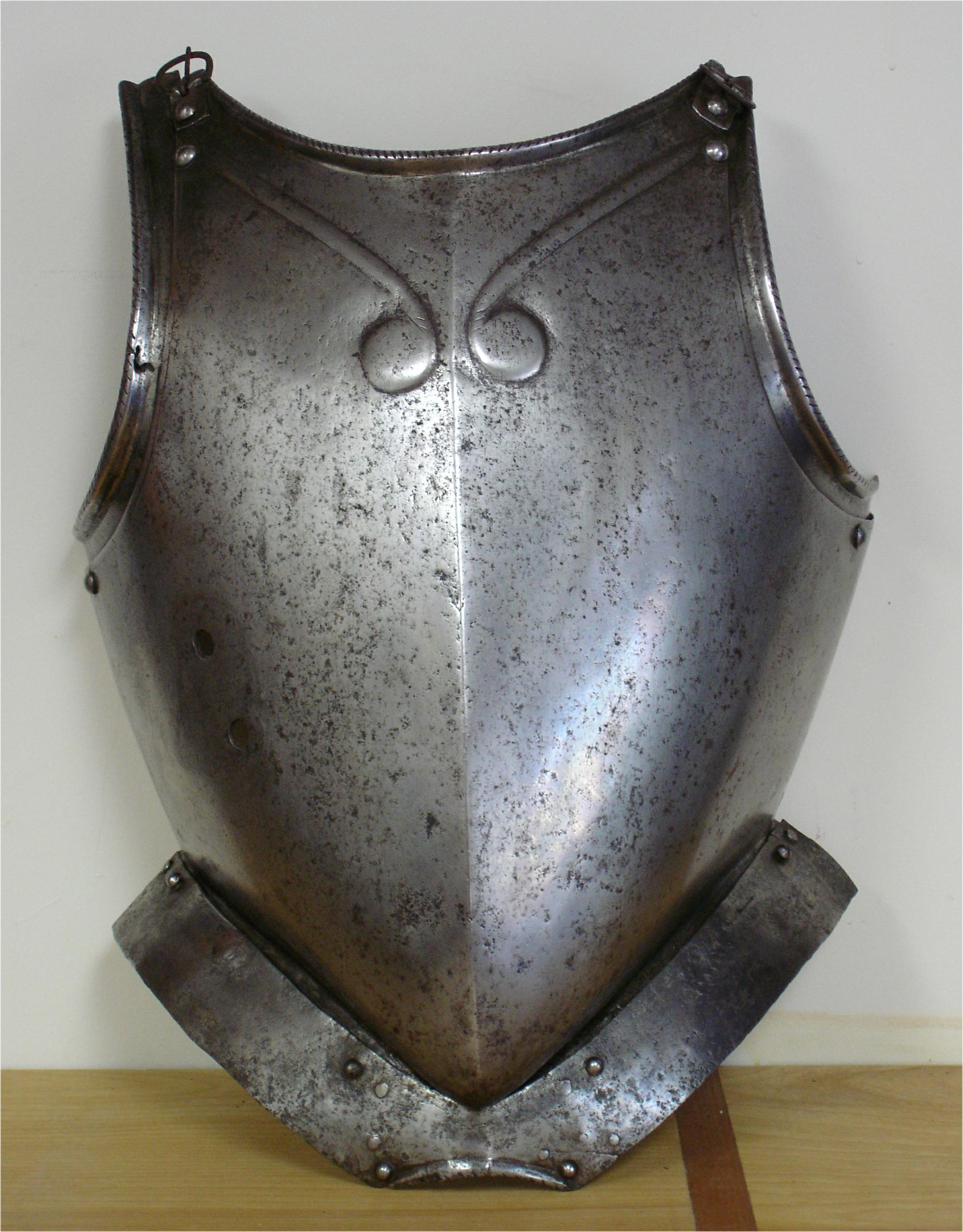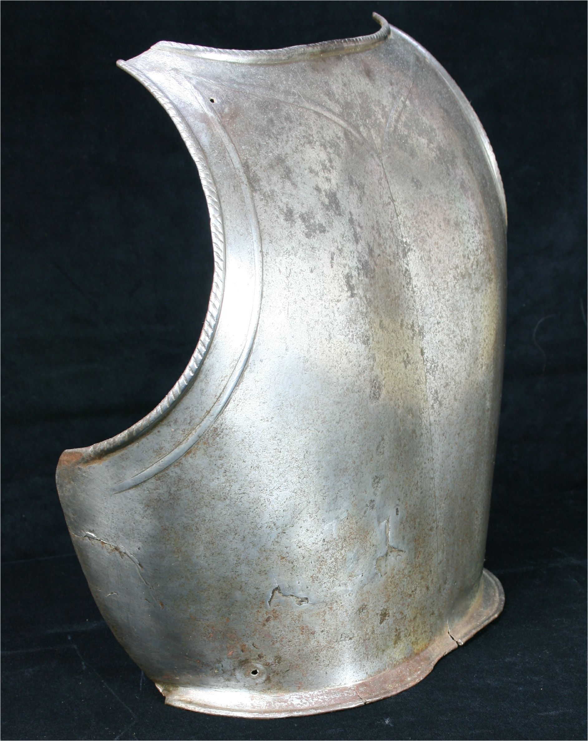 Breast-plate of deep peascod form with medial ridge and two embossed volutes at the top, armhole gussets, single plate skirt, and later fixed lance-rest (removed). Tall inward-turned, finely roped rolls at the neck and armholes. The armholes on the main plate have a line incised parallel to the edge. Fauld lame with incised line parallel to the upper edge and inward-turned roped roll central arch. Steel buckles at the shoulders. Back-plate shaped to the back, embossed with rounded ribs in the form of a 'V' towards the top and parallel to the arm holes. With incised vertical line at the center. Inward-turned, roped rolls at the neck, arms and on the edge of the narrow waist flare. Breast of heavier form, consistent with those made for cavalry use. Breast and back associated. Similar to those on B-13 from Mantova. Displayed as part of item number A-114.