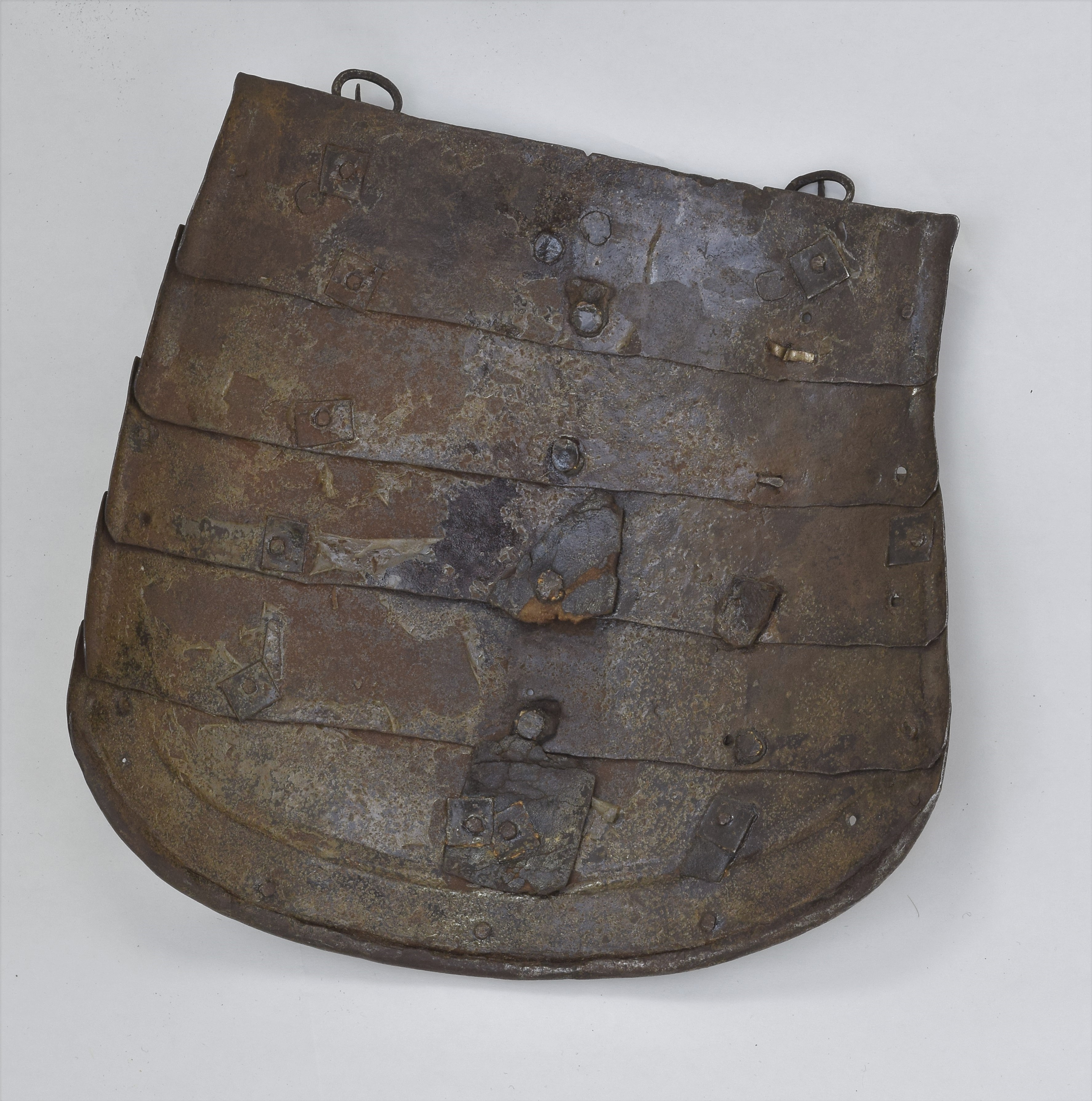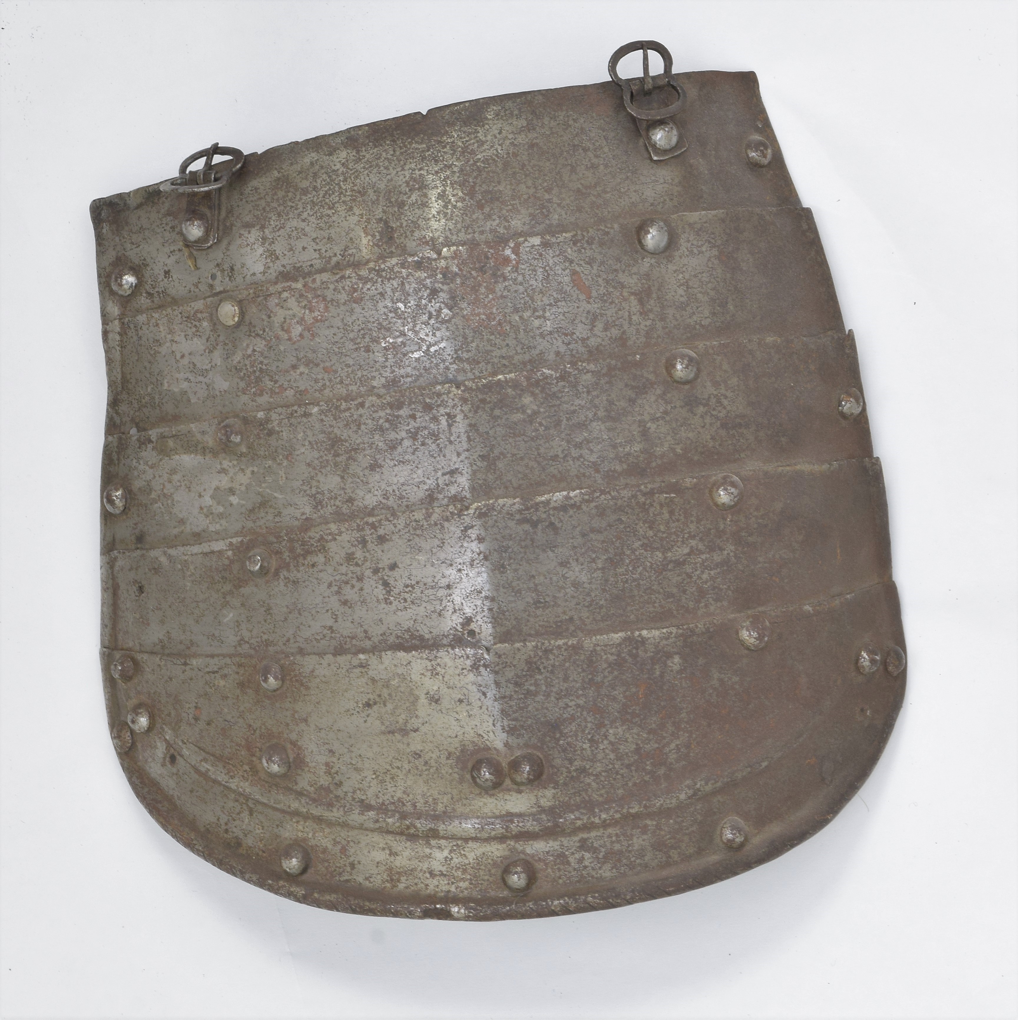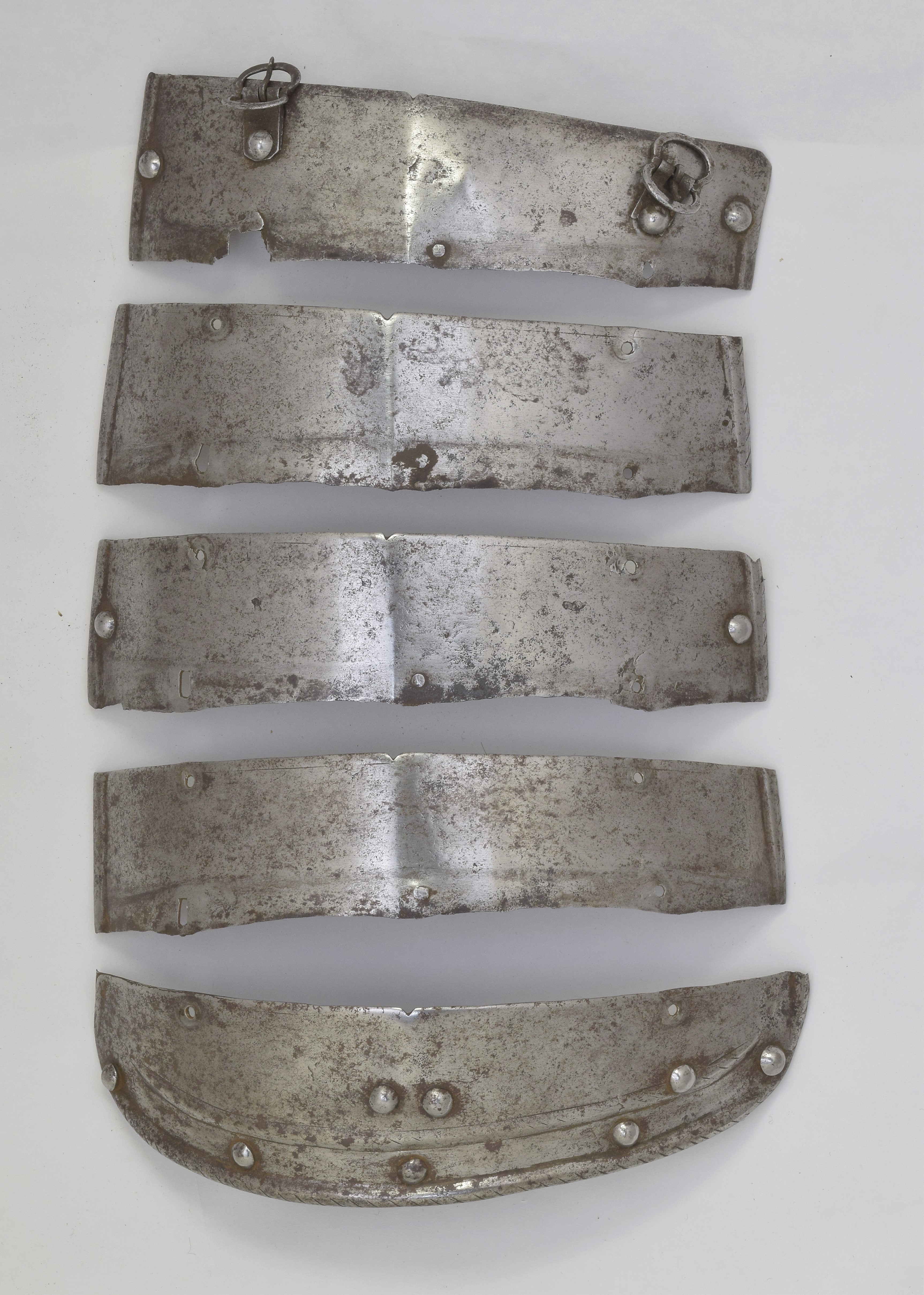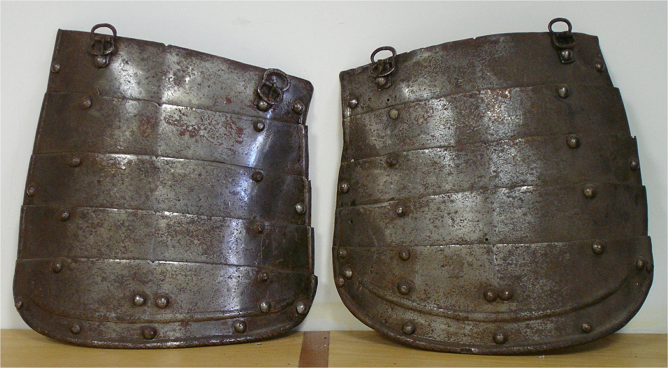 Two tassets each of five upward-lapping lames. Well matched in form, style and size. The rounded bottom edge of the final lame with a full inward turn and parallel ridge, each roped. The ends of each plate with roped half-rolls. Each tasset with a central crease and small filed notch at the center of the top edge. Remains of single engraved lines parallel to the upper edge of each plate. Upper edges also beveled. Tassets originally designed for 3 buckles, re-fitted for 2 buckles to match the fauld lame on the breastplate A-114b. Right tasset with 2 notch assembly marks on inside of the plates. These are located on the bottom of the plates - including the bottom plate where they are filed into the inside of the roll. Displayed as part of item number A-114. Right shows that the plates were originally secured by two leathers (front and center) and a line of sliding rivets at the outer edge. Left was originally different. It may have been constructed like the tassets on item number A-306 - with two lines of rivets (front and outside) and a central leather. When it was last assembled, it had two leathers (front and center) and pivoting rivets at the outside. There are enough spare holes which are empty or which contain rivets from various modern periods that the exact original configuration is not certain.