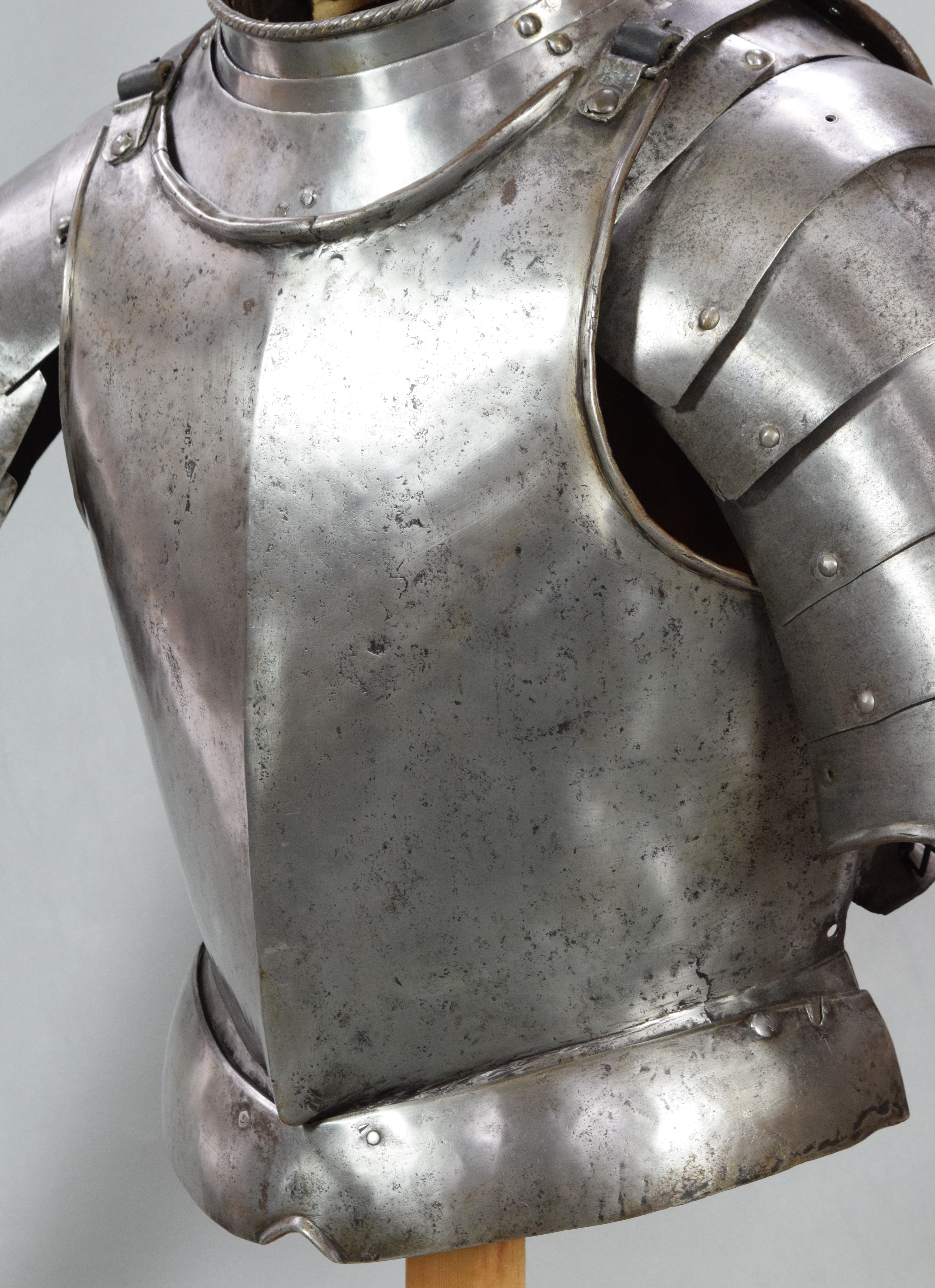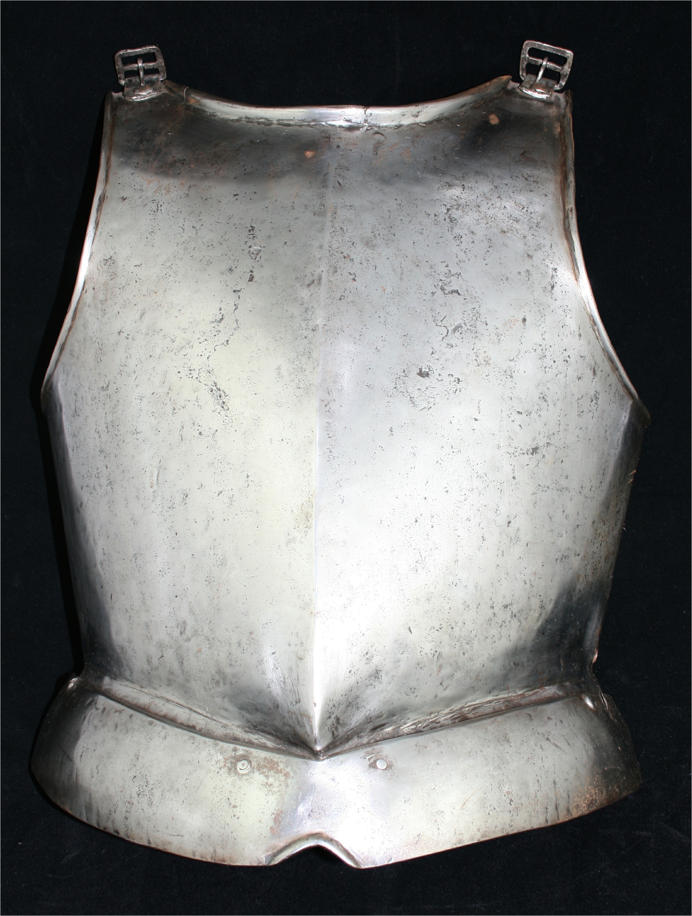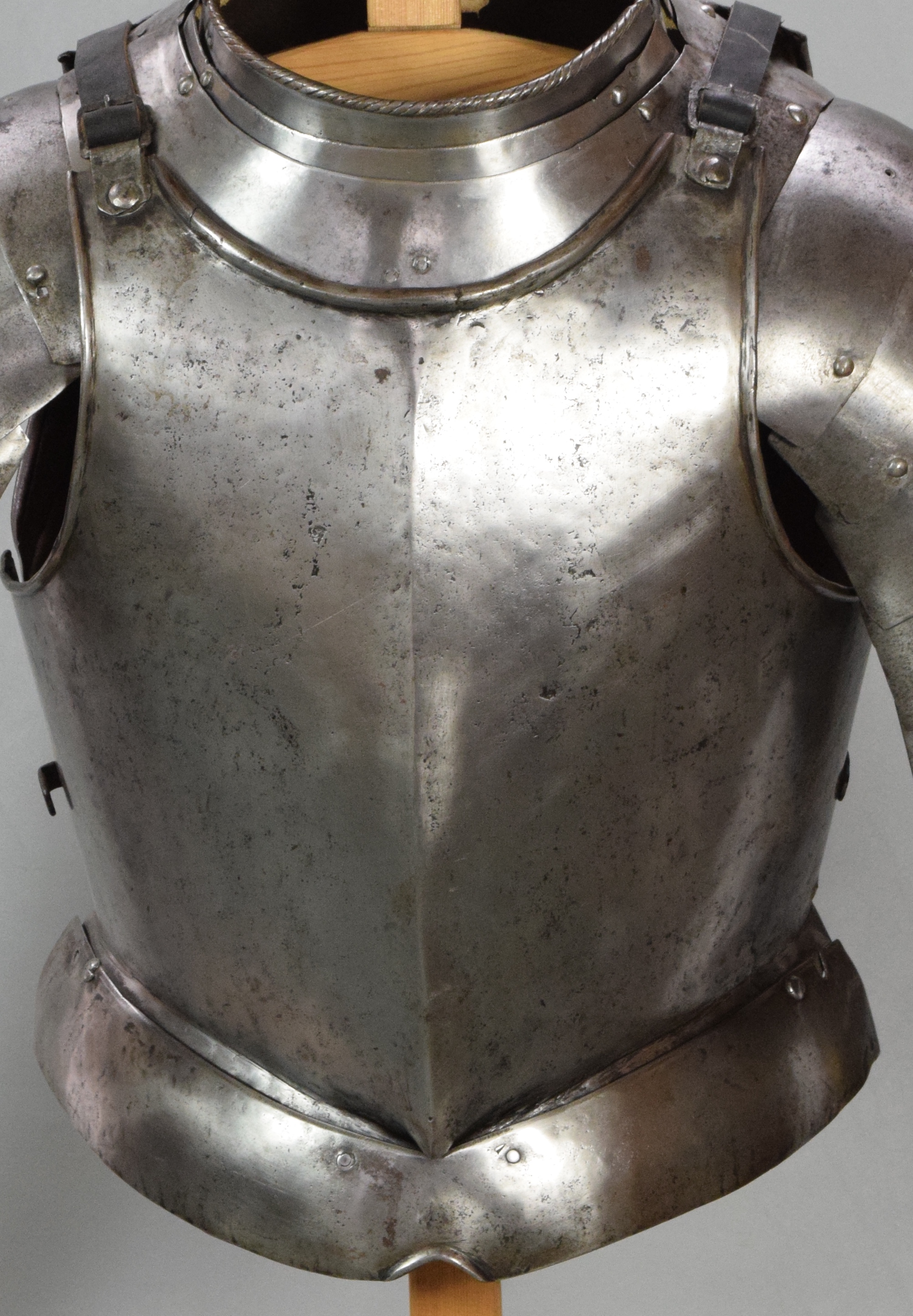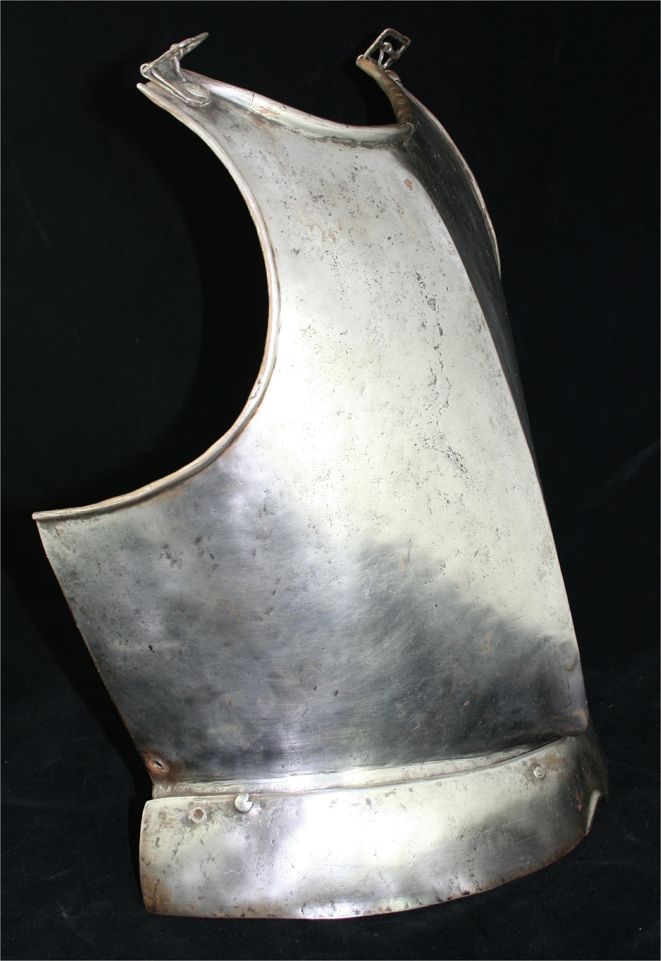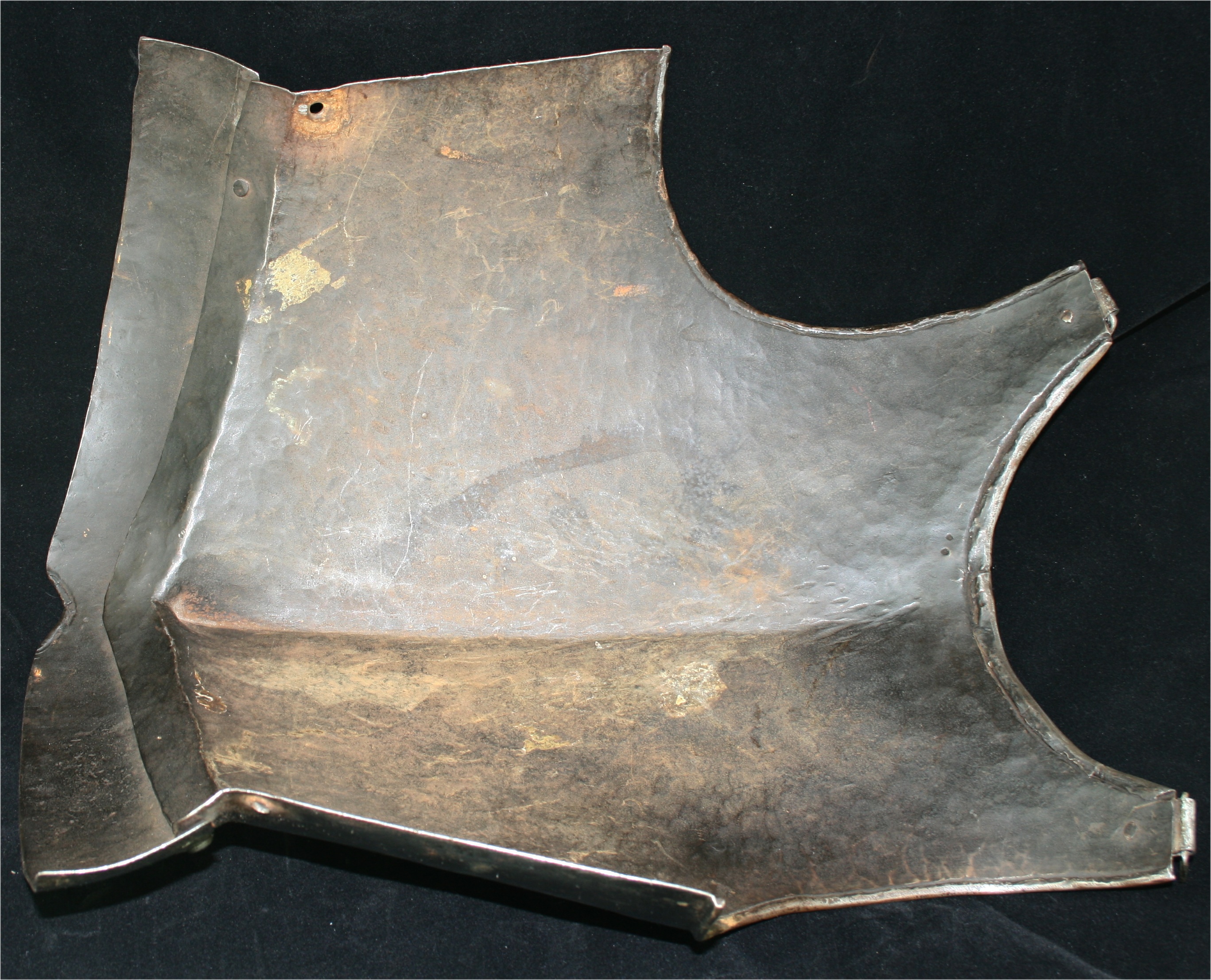 One piece breast with strong central crease terminating in a pinched peascod at the waist. Inward rolls at the arms and neck, arm rolls app. 1/4 in. diameter, the neck rolle larger, tapering from app. 3/8 in. at the center to 3/16 in. at the ends. One fauld lame attached by one rivet on each side and with a narrow arch at the center with a small inward roll. 2 old iron buckles at the shoulder. Interior of the breast (near the neck) and the fauld lame (at the center) marked with two punch assembly marks. Four holes for straps to suspend the tassts.
