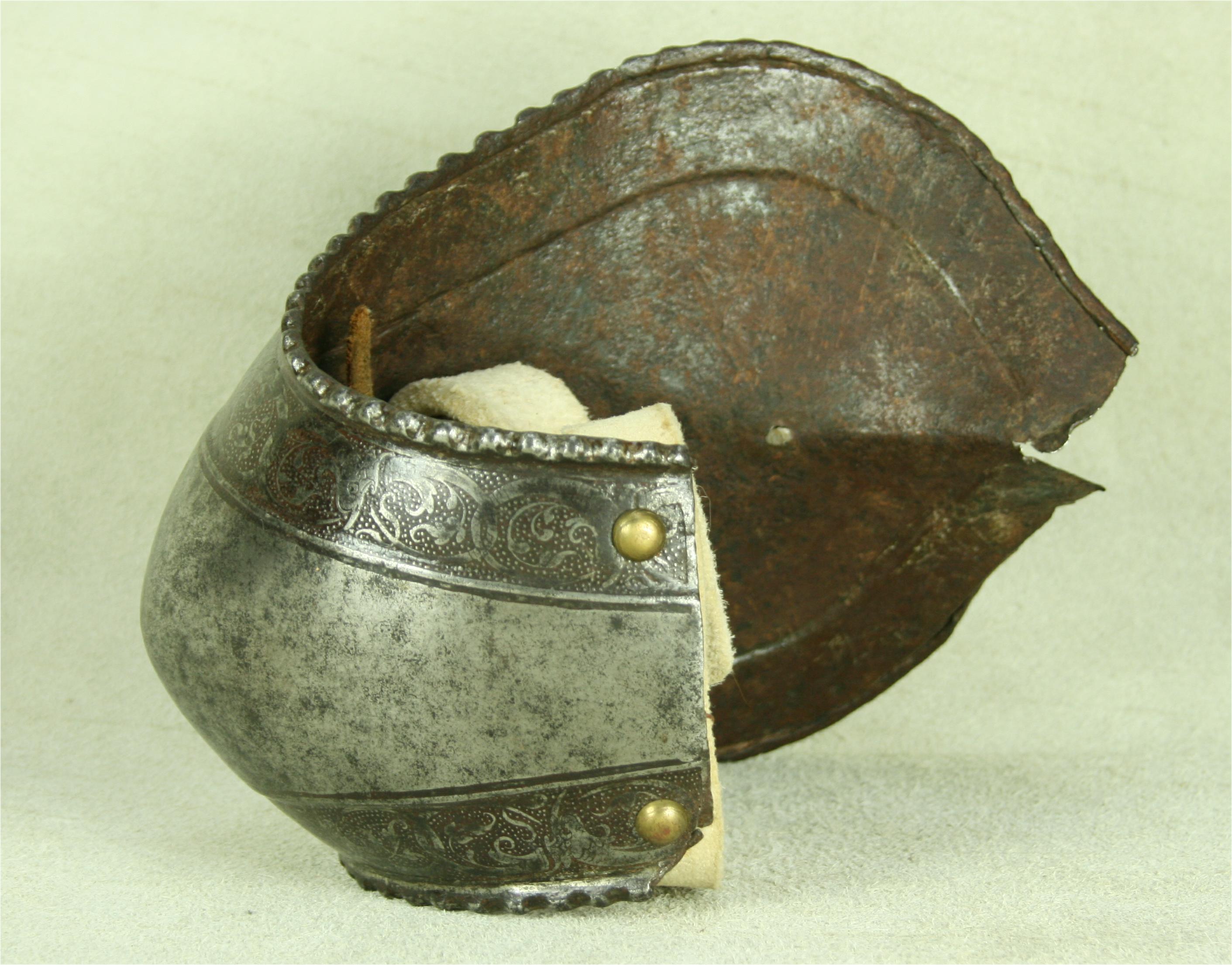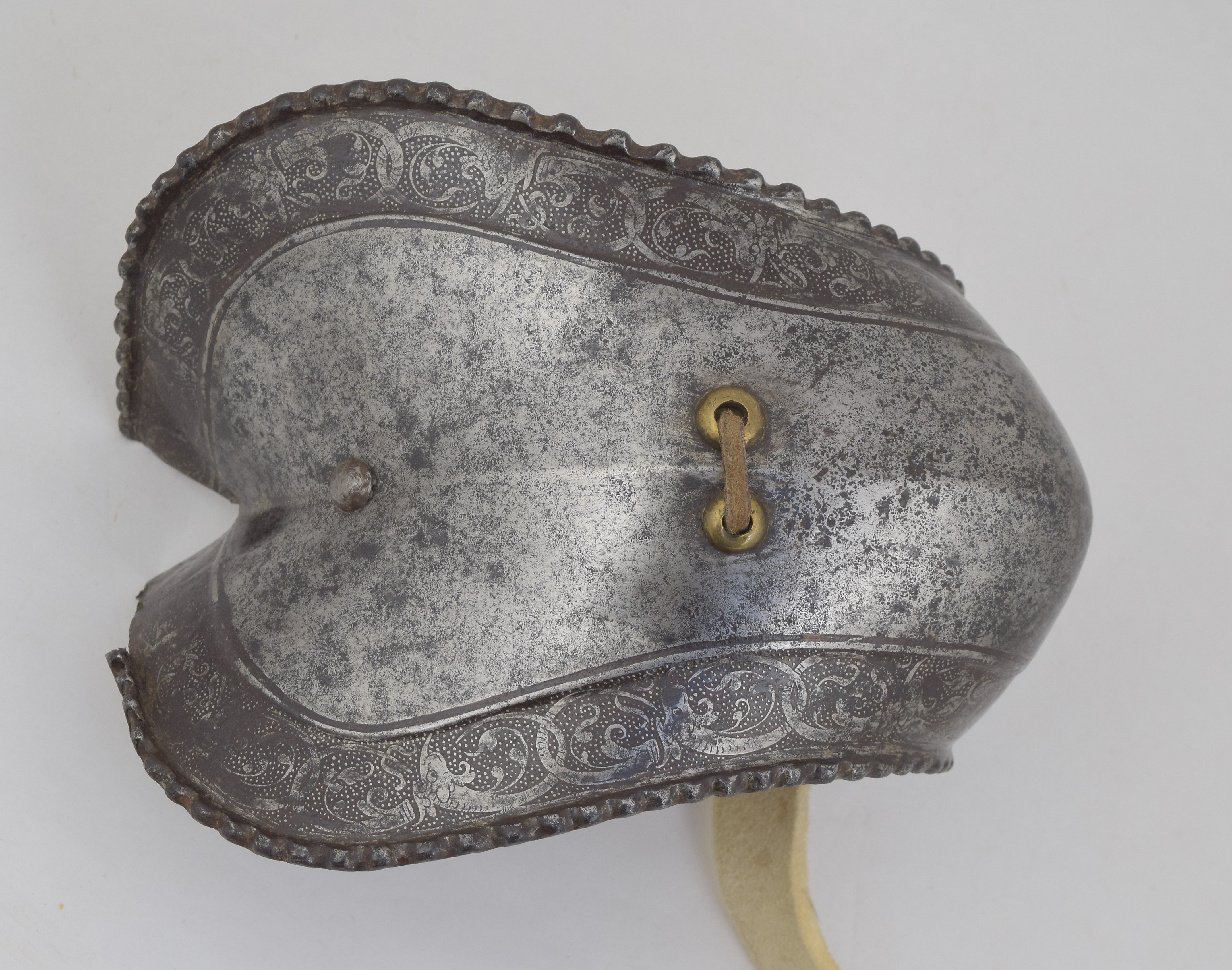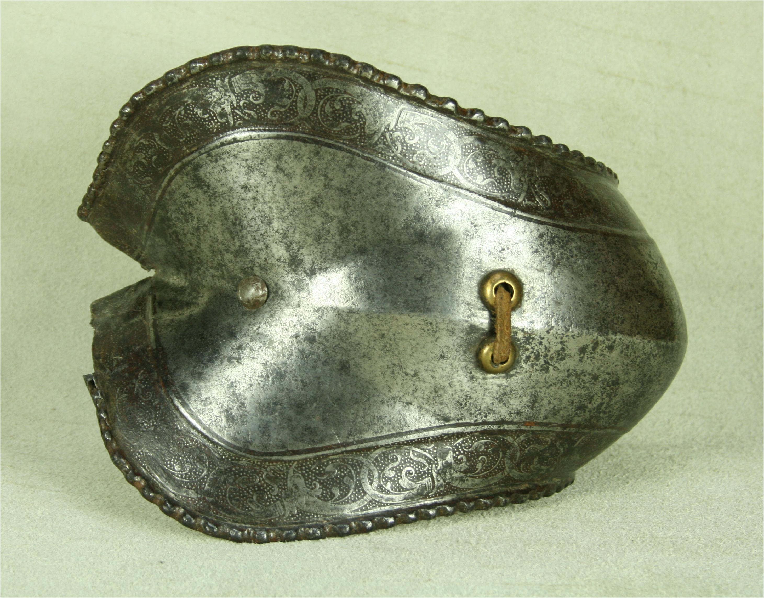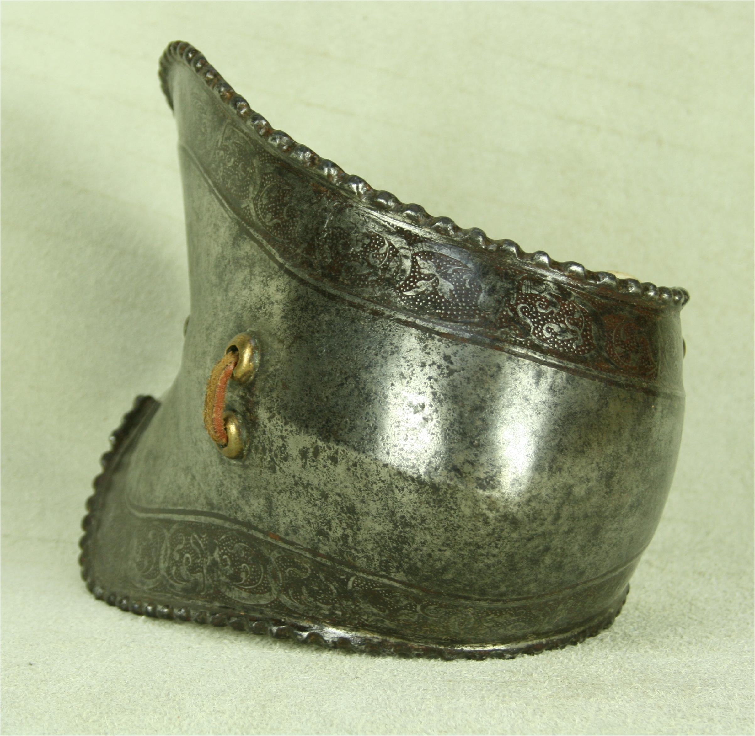 South German for light field use. Possibly Augsburg. For the left elbow. Constructed in one piece to be secured to the arming doublet by laces. Open at the rear, with a medial ridge. Edges with notched inward-turned rolls with a band of etching along the border.