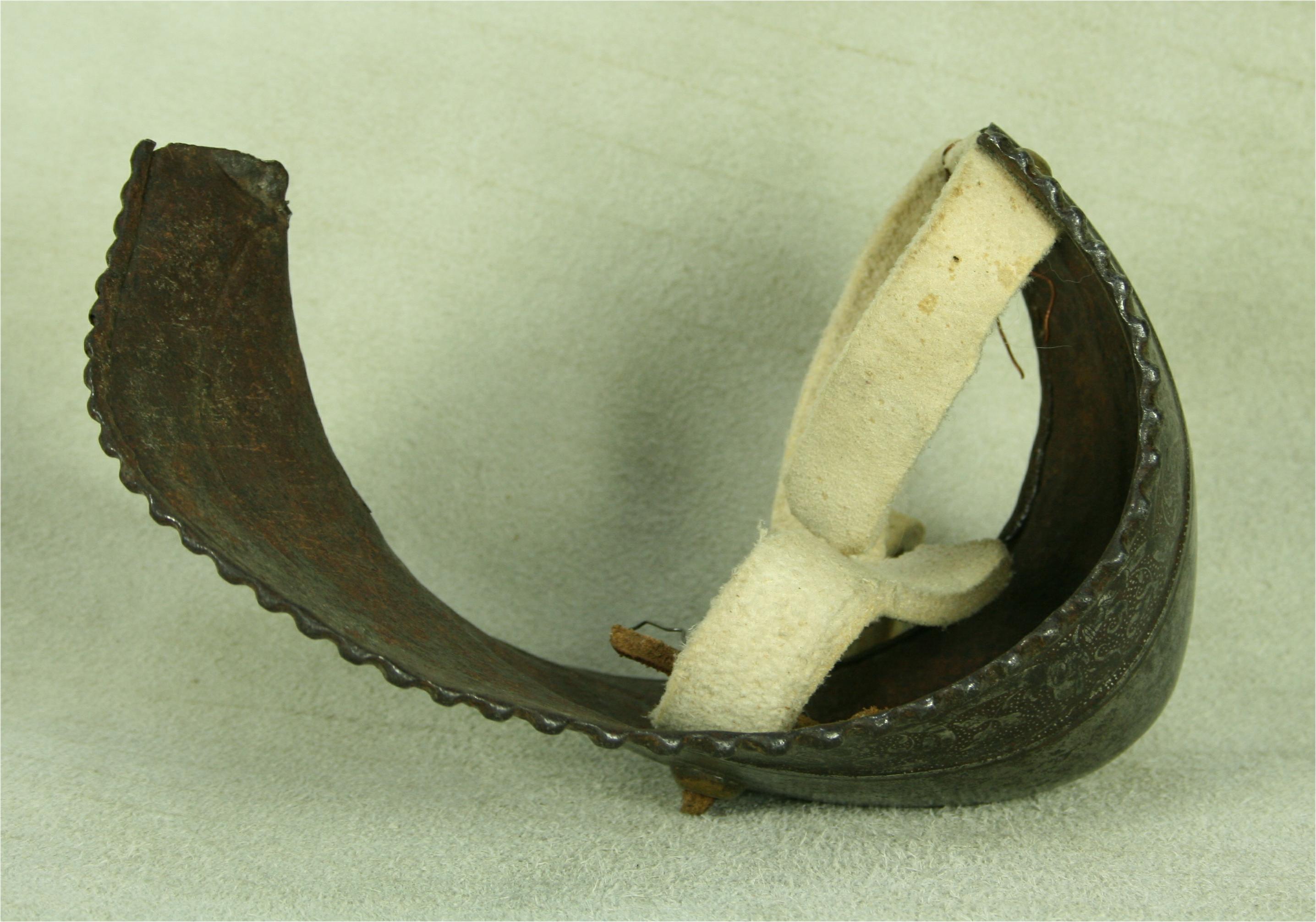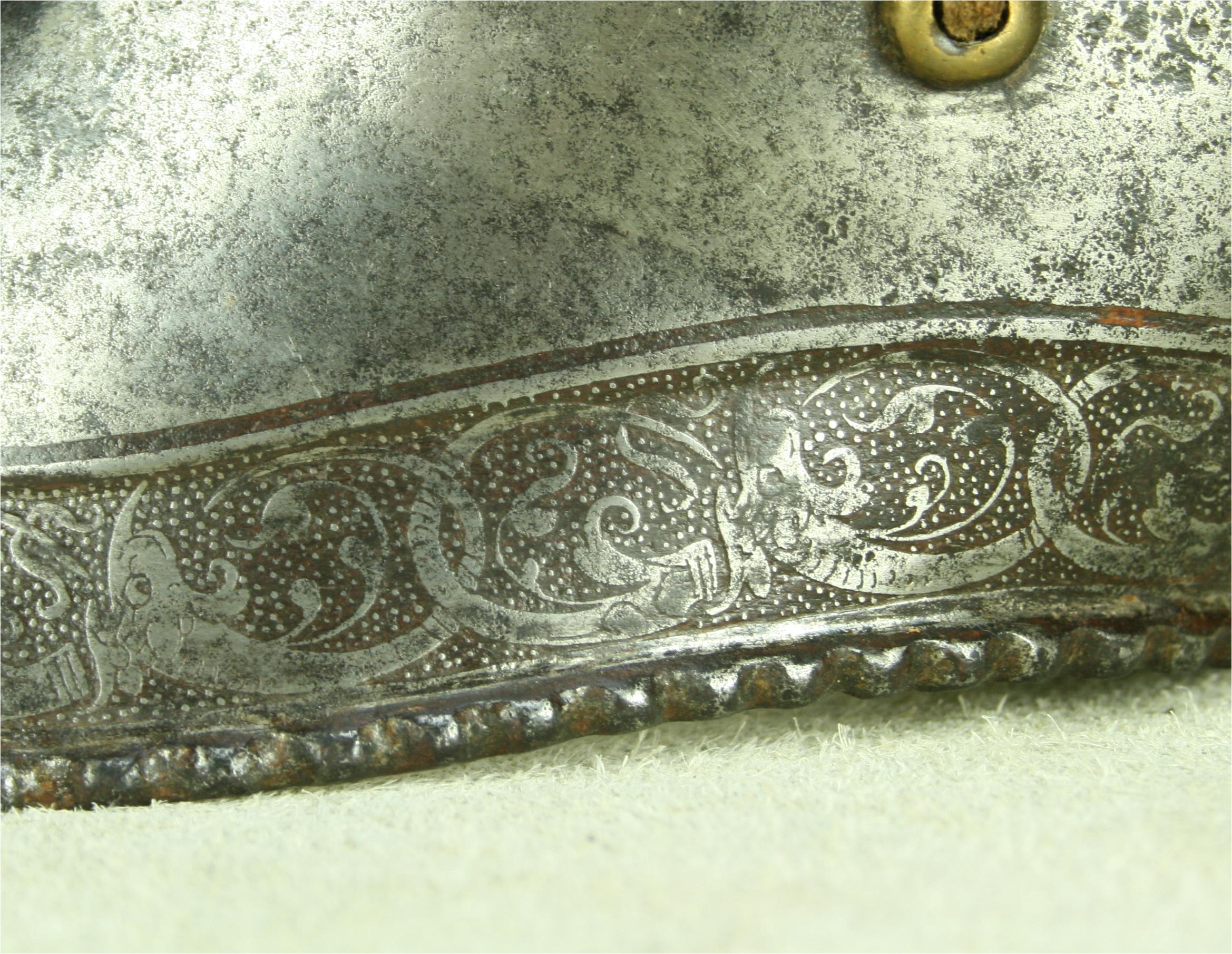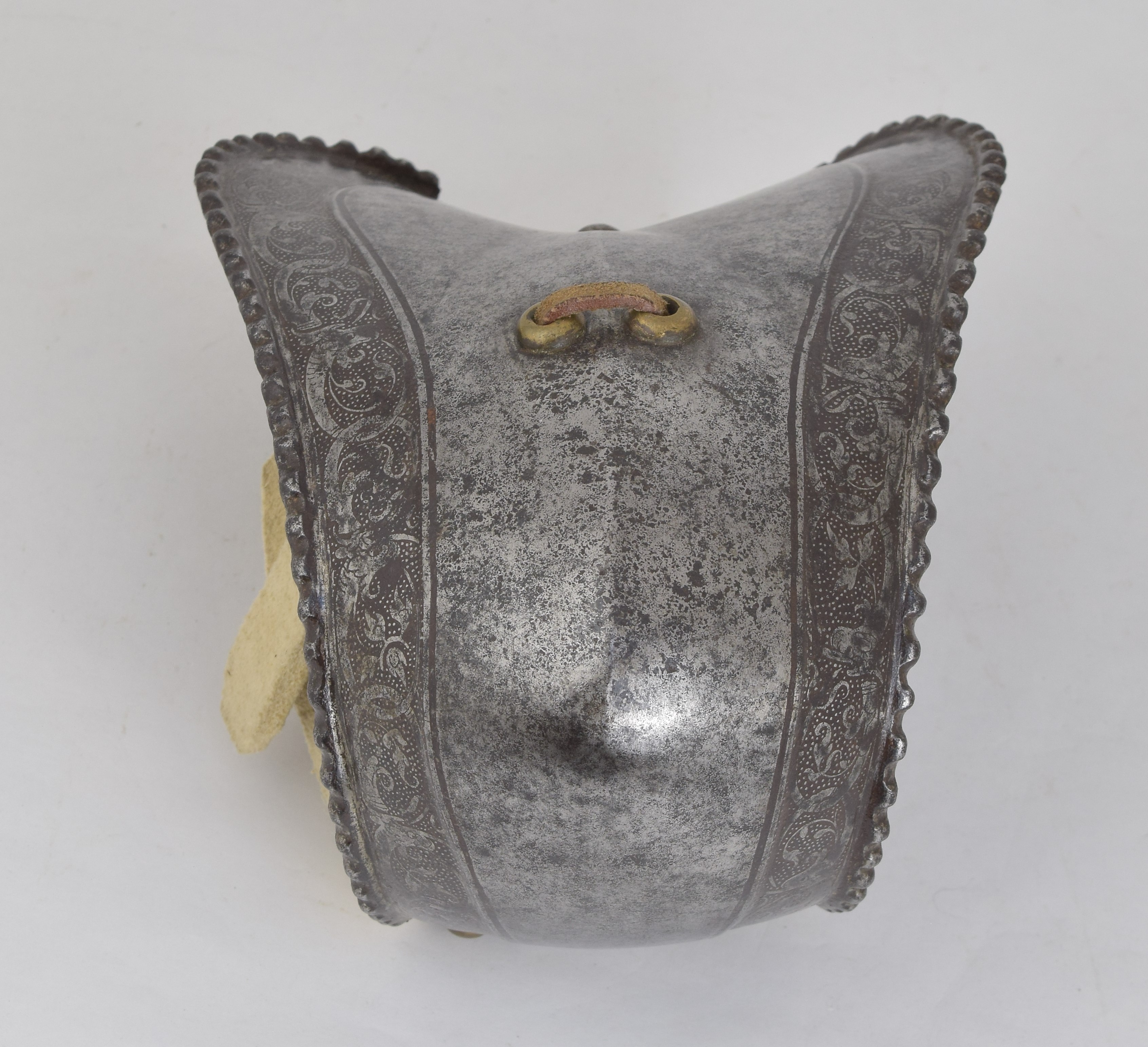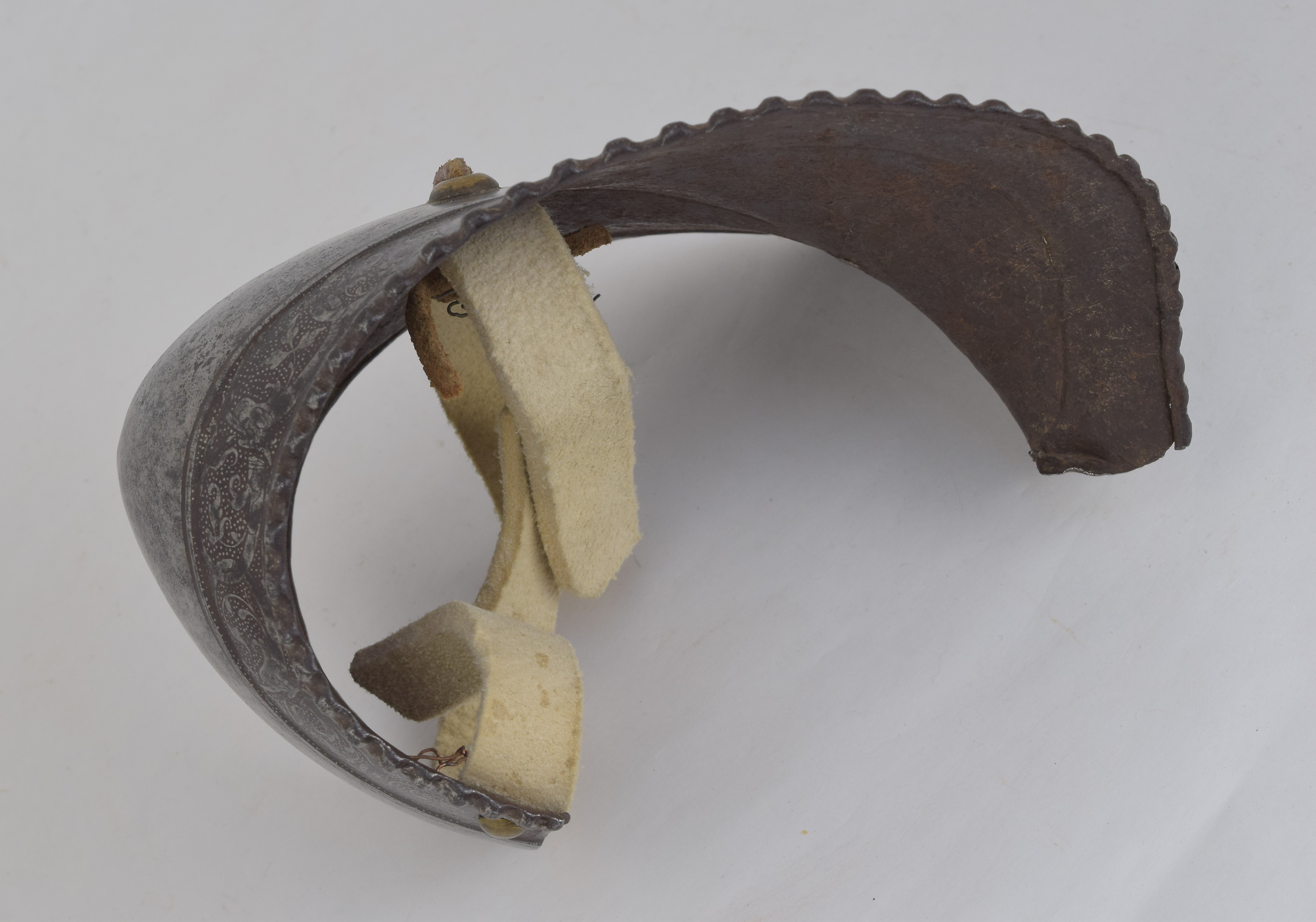 South German for light field use. Possibly Augsburg. For the left elbow. Constructed in one piece to be secured to the arming doublet by laces. Open at the rear, with a medial ridge. Edges with notched inward-turned rolls with a band of etching along the border.