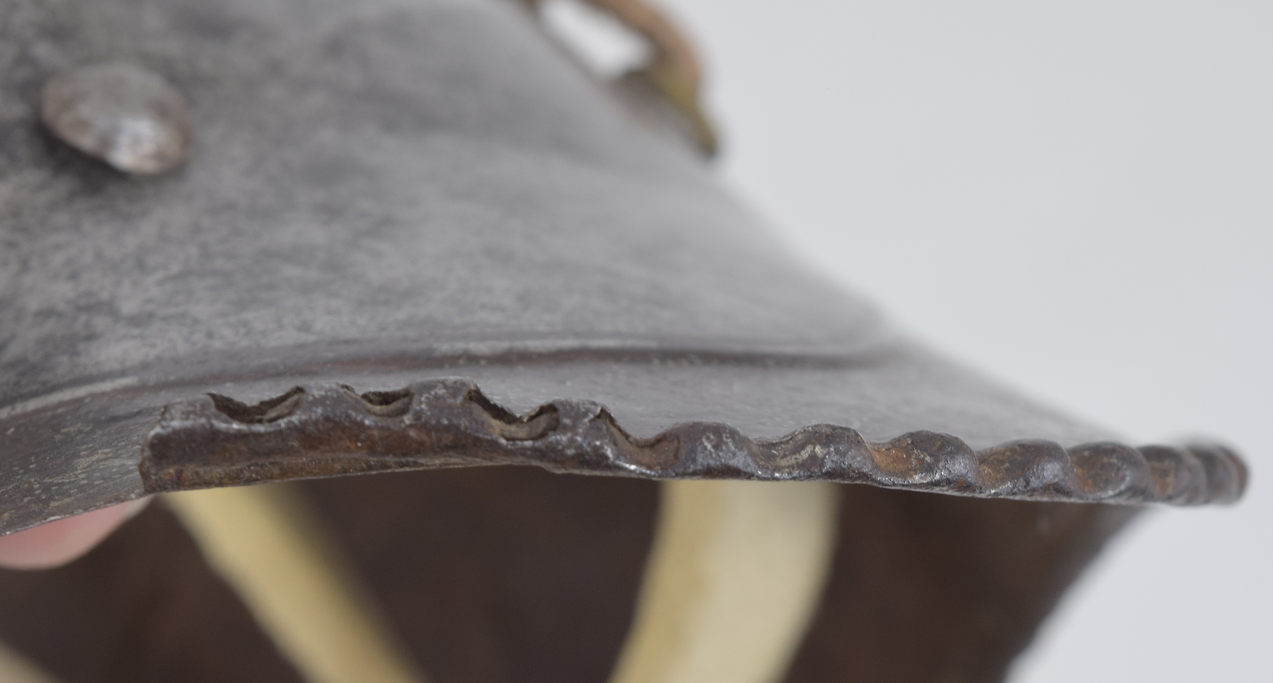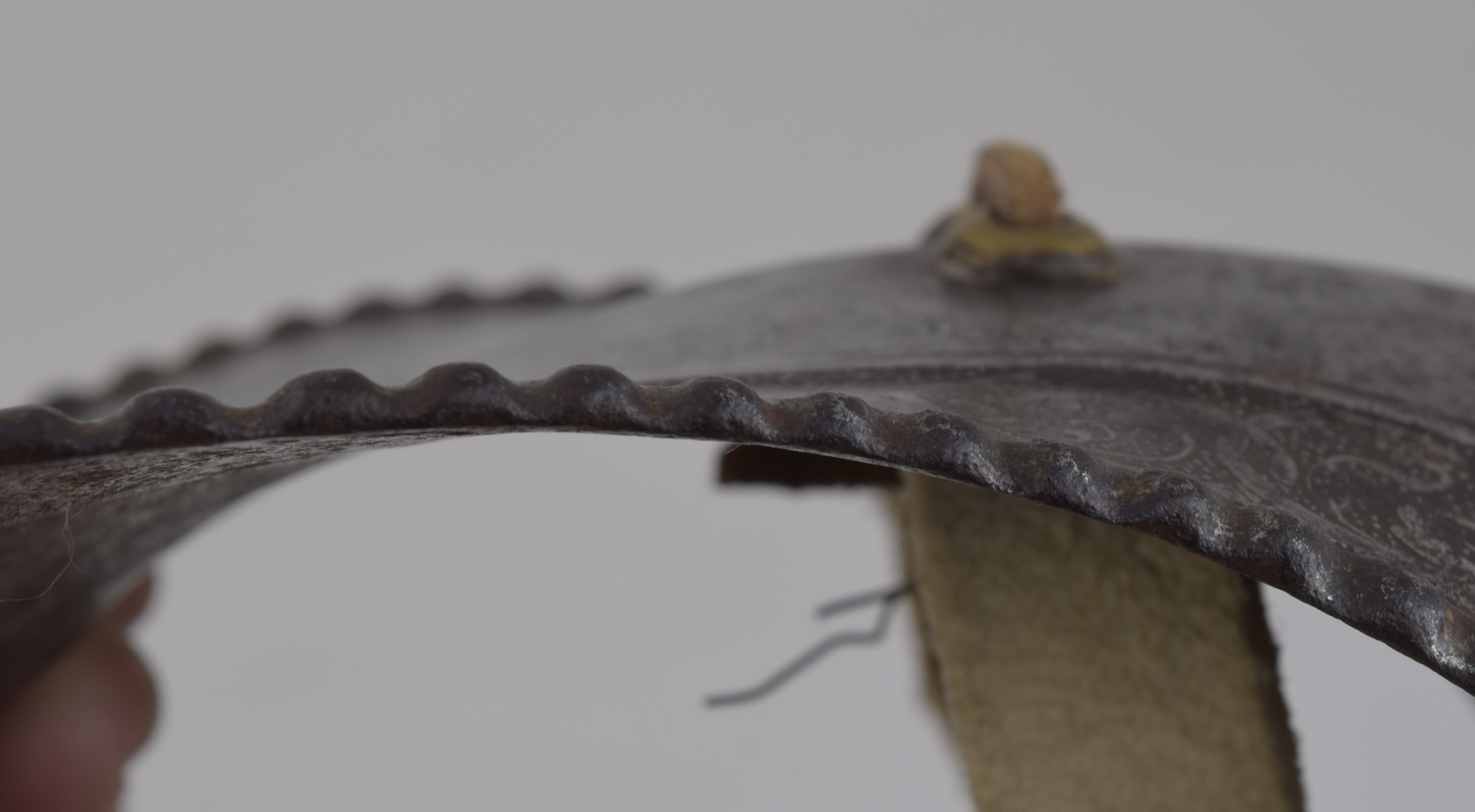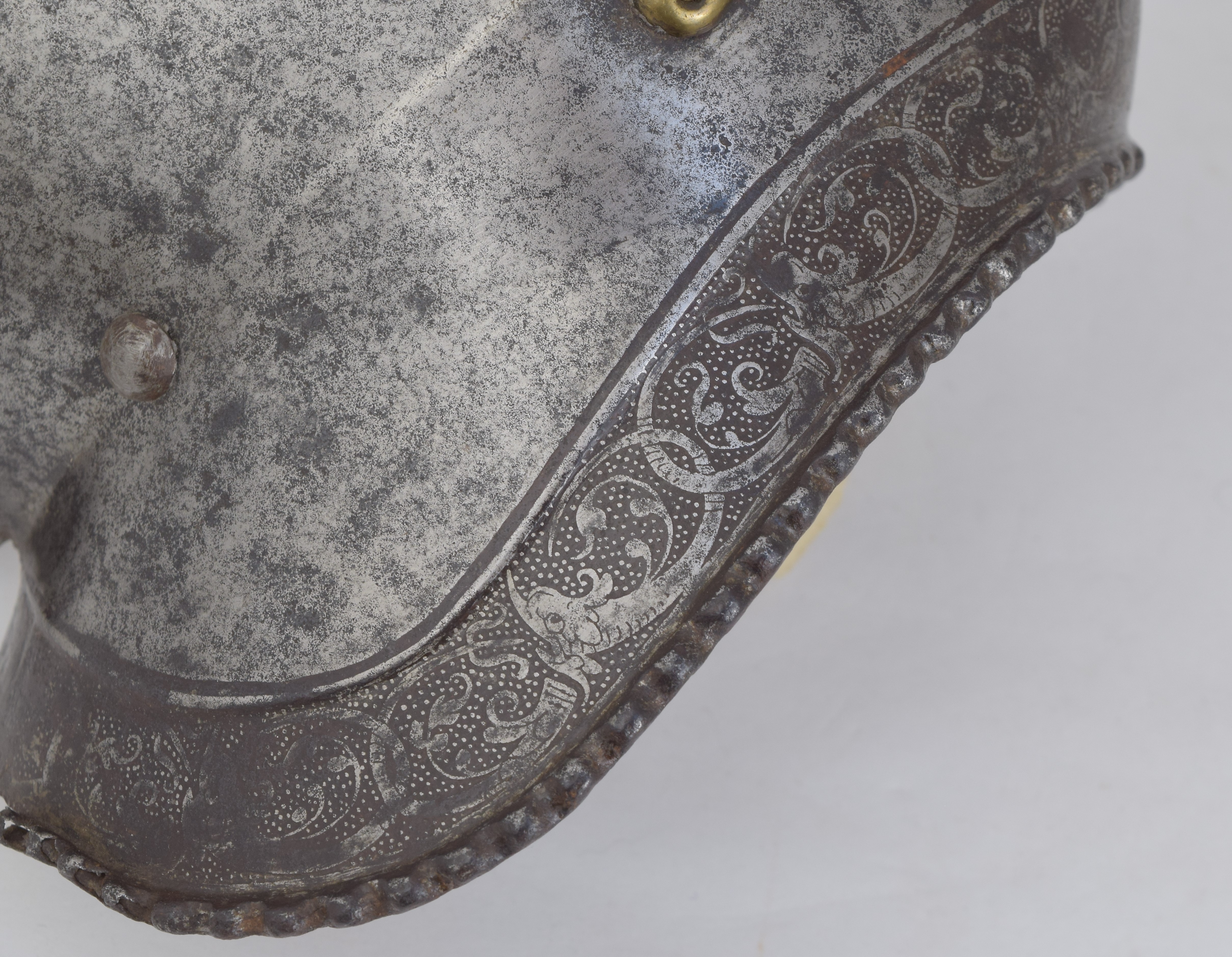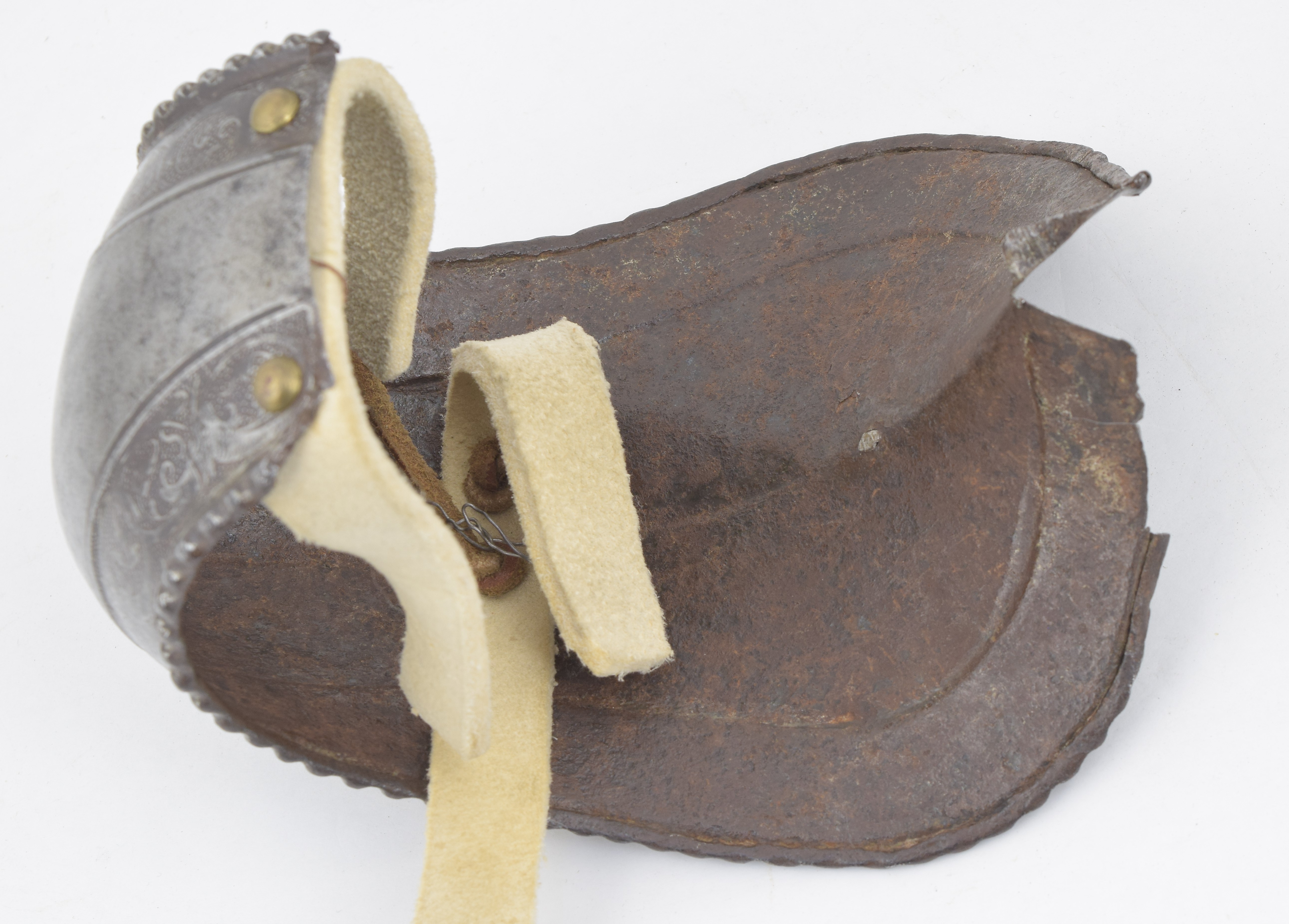 South German for light field use. Possibly Augsburg. For the left elbow. Constructed in one piece to be secured to the arming doublet by laces. Open at the rear, with a medial ridge. Edges with notched inward-turned rolls with a band of etching along the border.