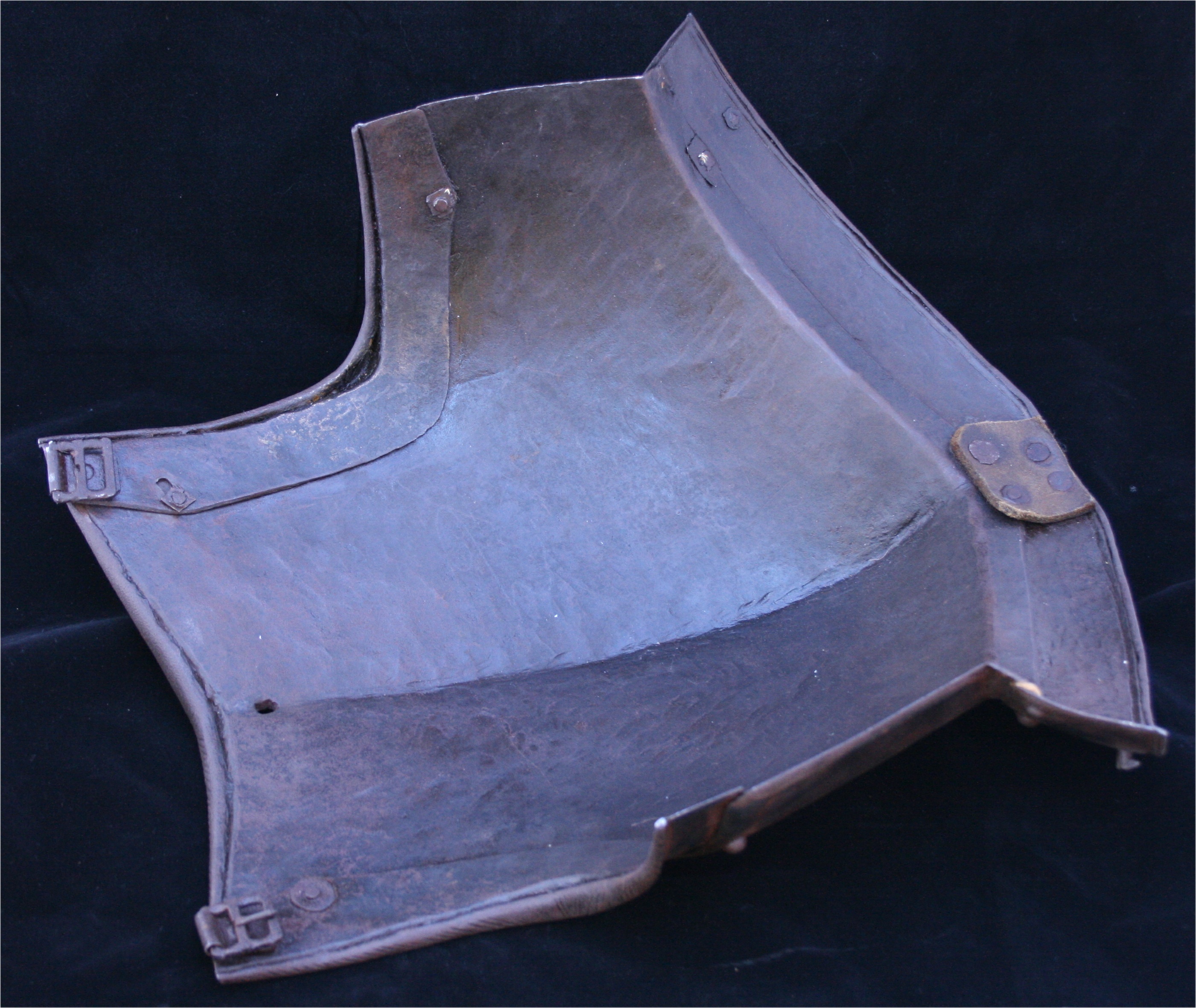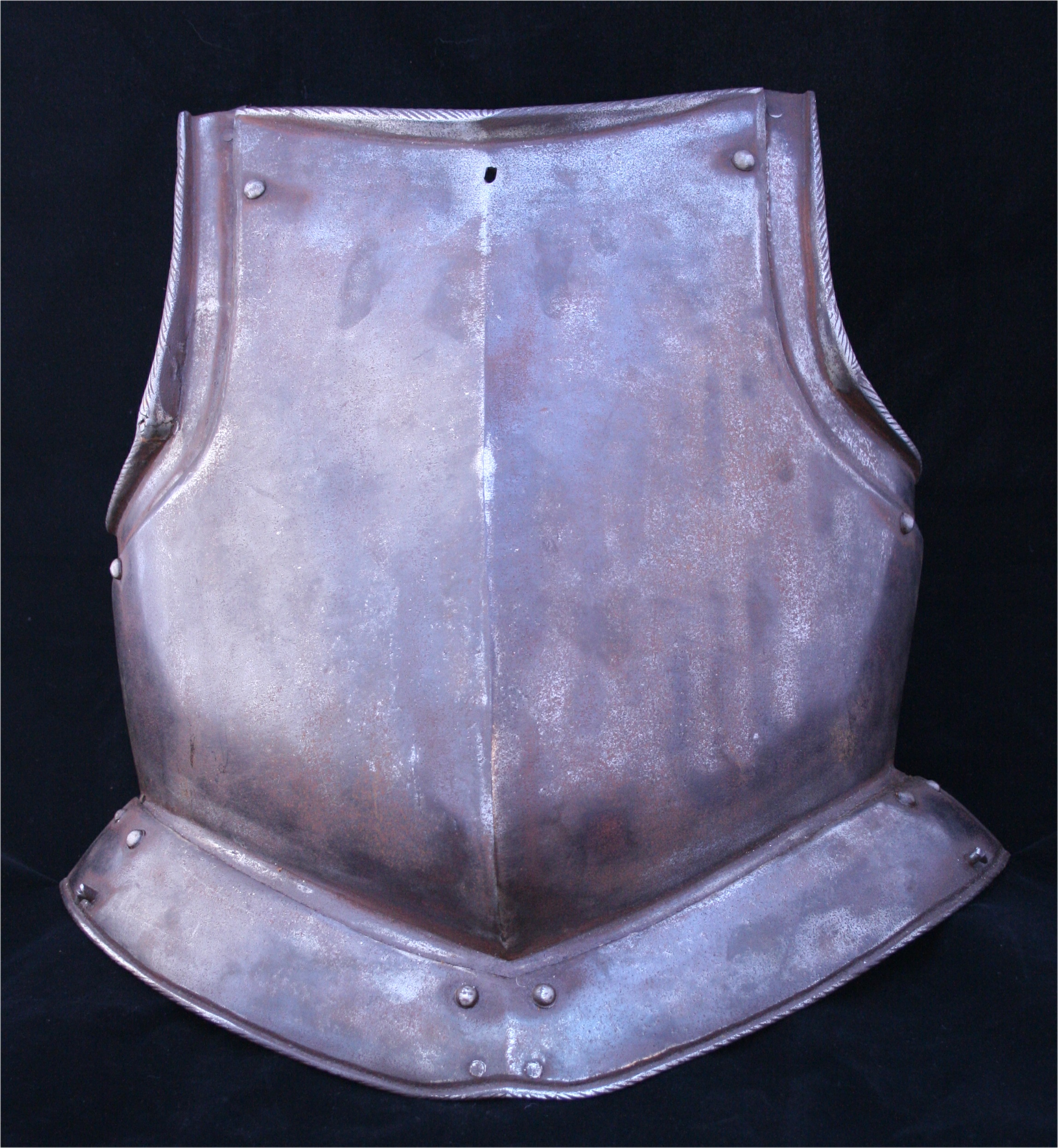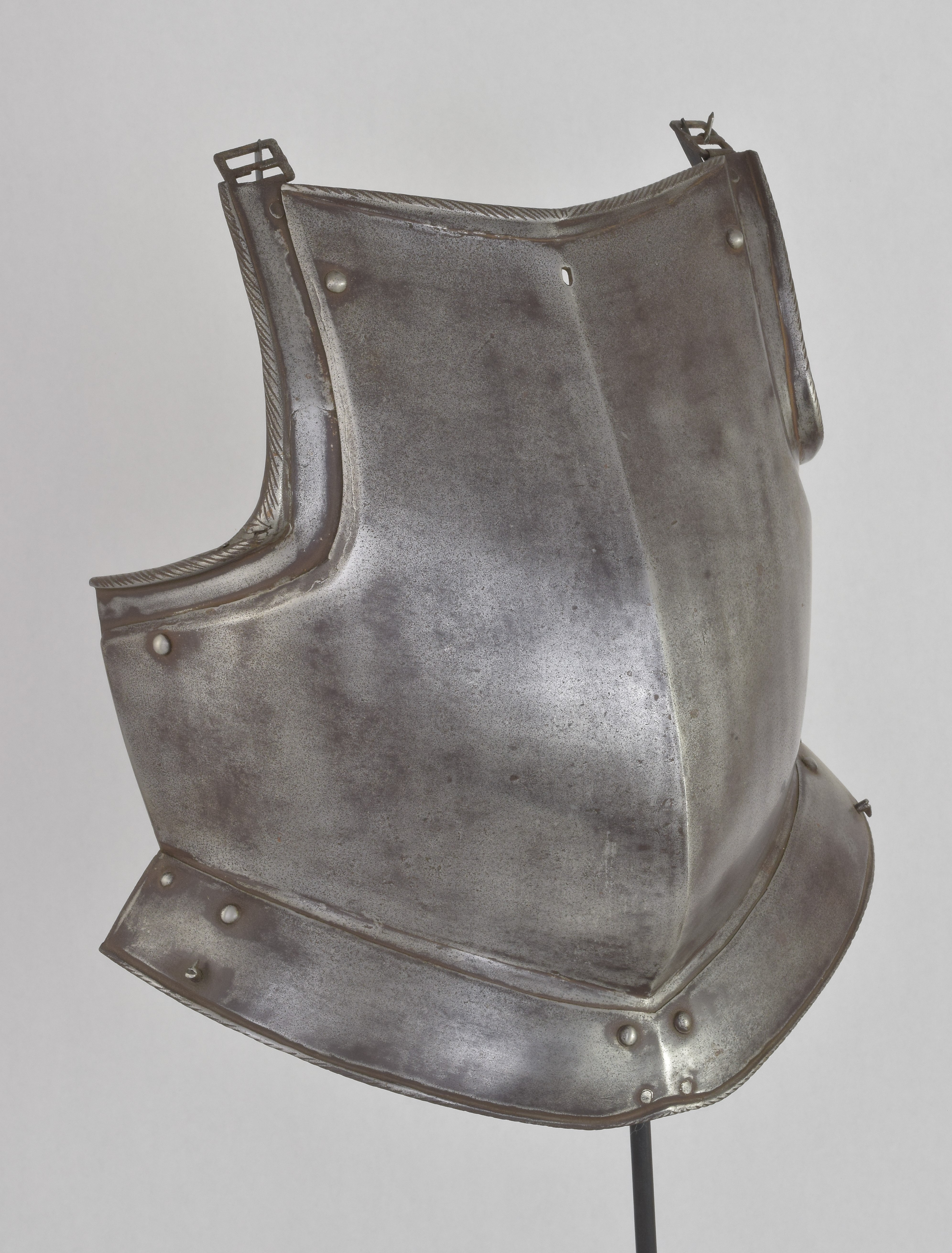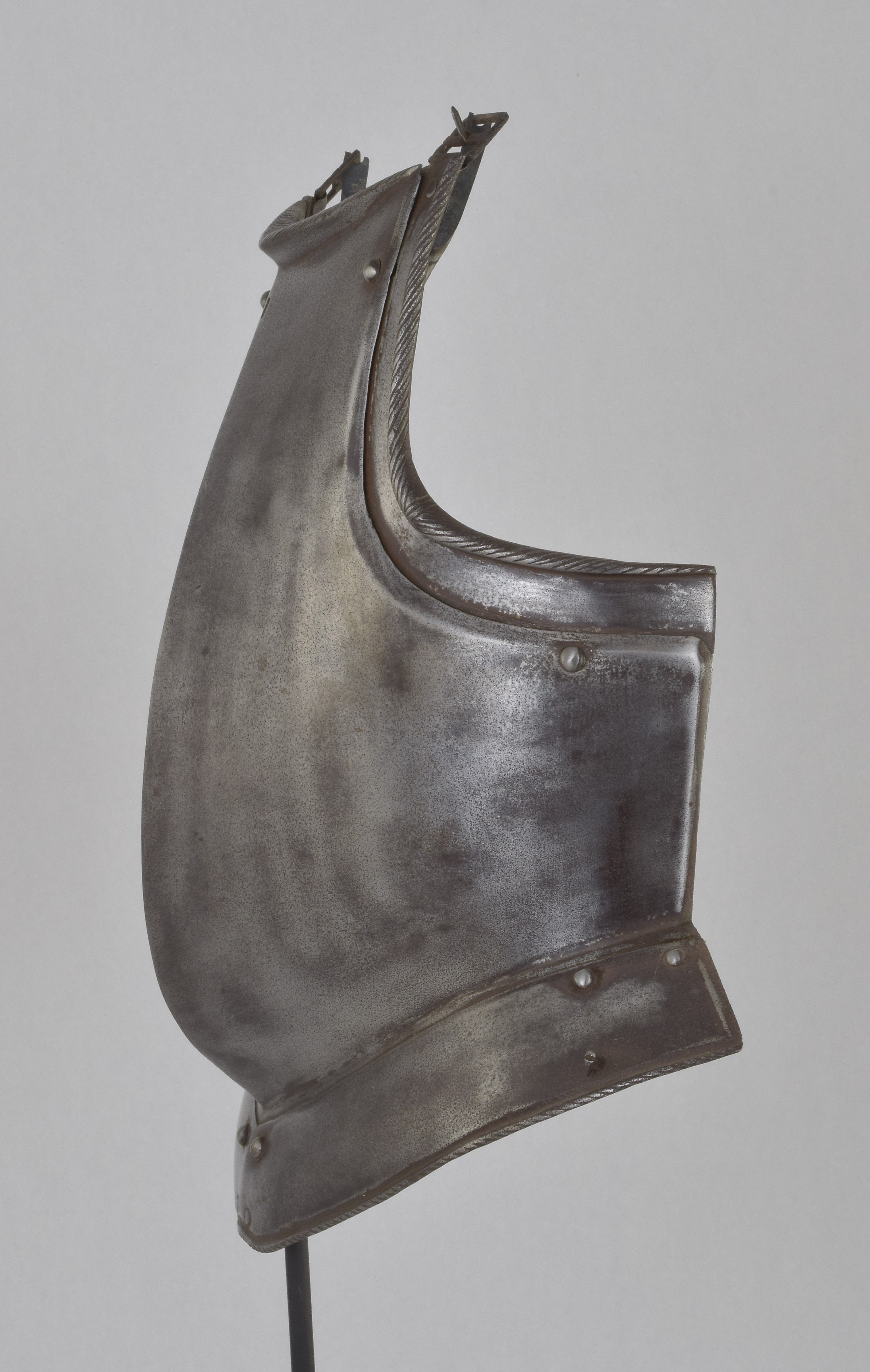 With a central crease drawn out to a rounded central point. There is a small rectangular hole near the center of the neck. This appears to be for securing the peg that would be used to secure the buff. The edges of the breastplate at the arm holes and sides are heavily beveled. Tapering inward-turned rolls at the neck and arms. Arms with sliding gussets. Gussets and upper roll with fine roping. Waist with a single lame fauld with turning pins at the sides for securing a removeable fauld. The single fauld lame has a roped roll a the bottom edge. The central hole at the neck and decorative style indicate that this is likely of Brunswick origin.