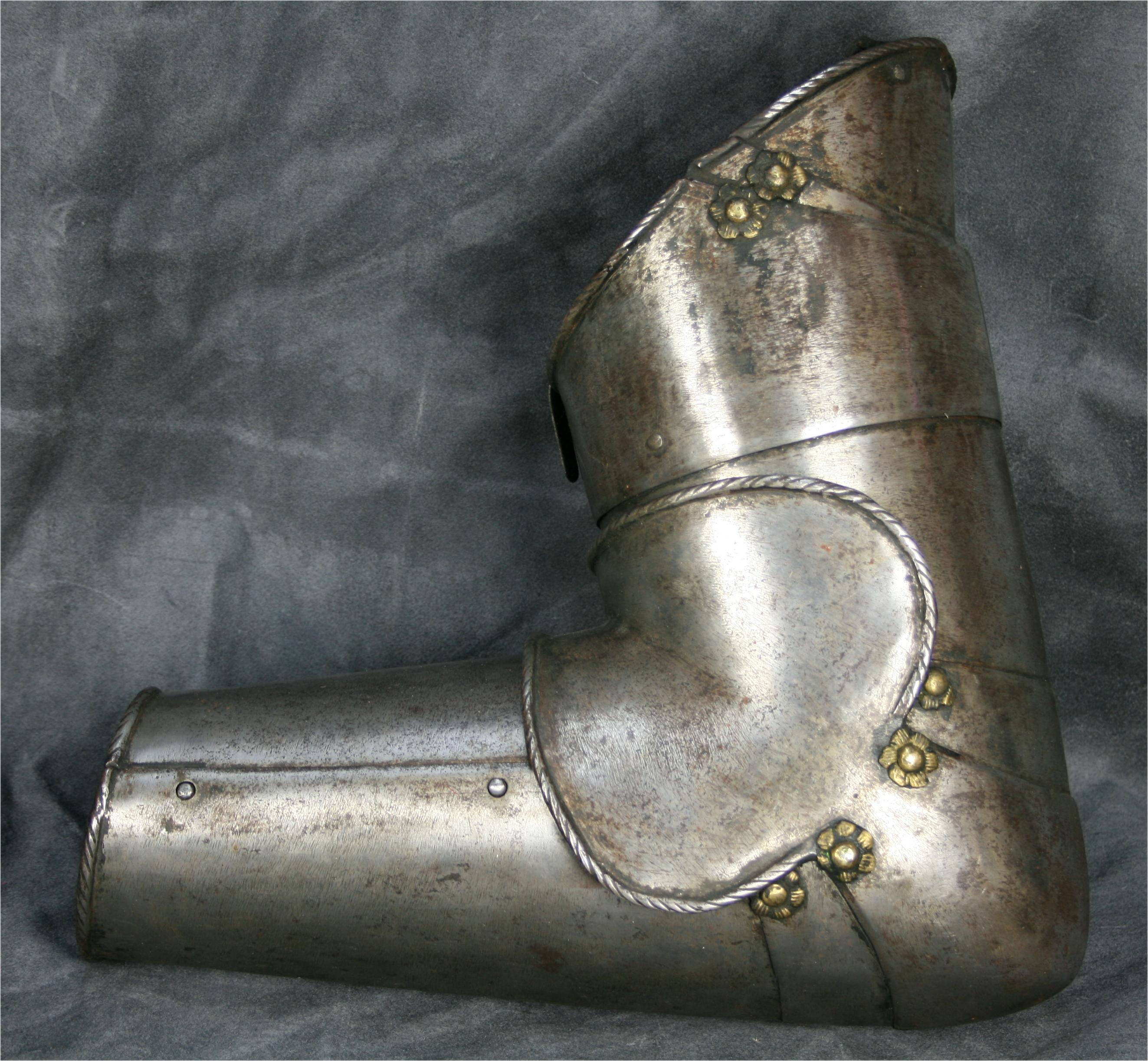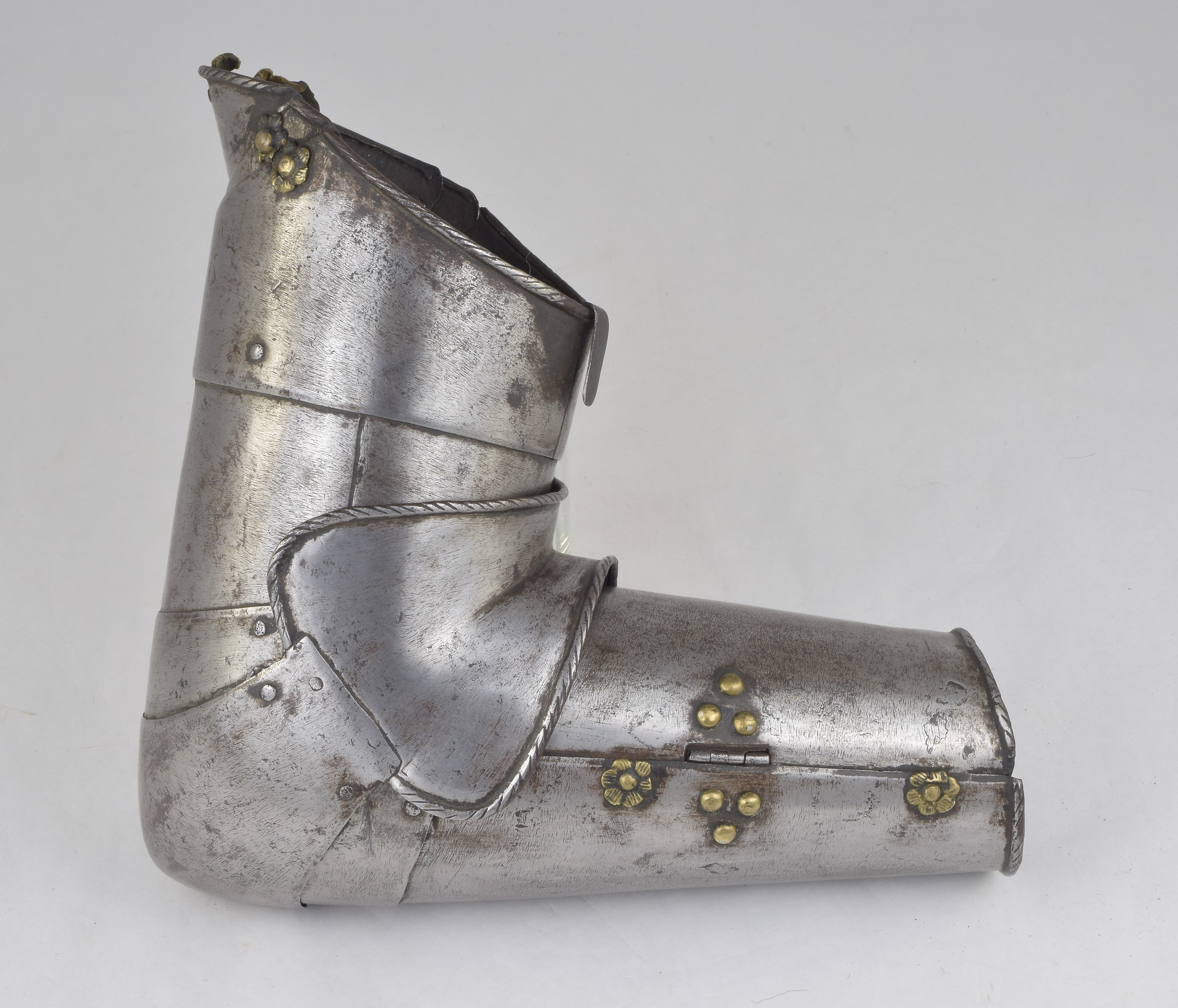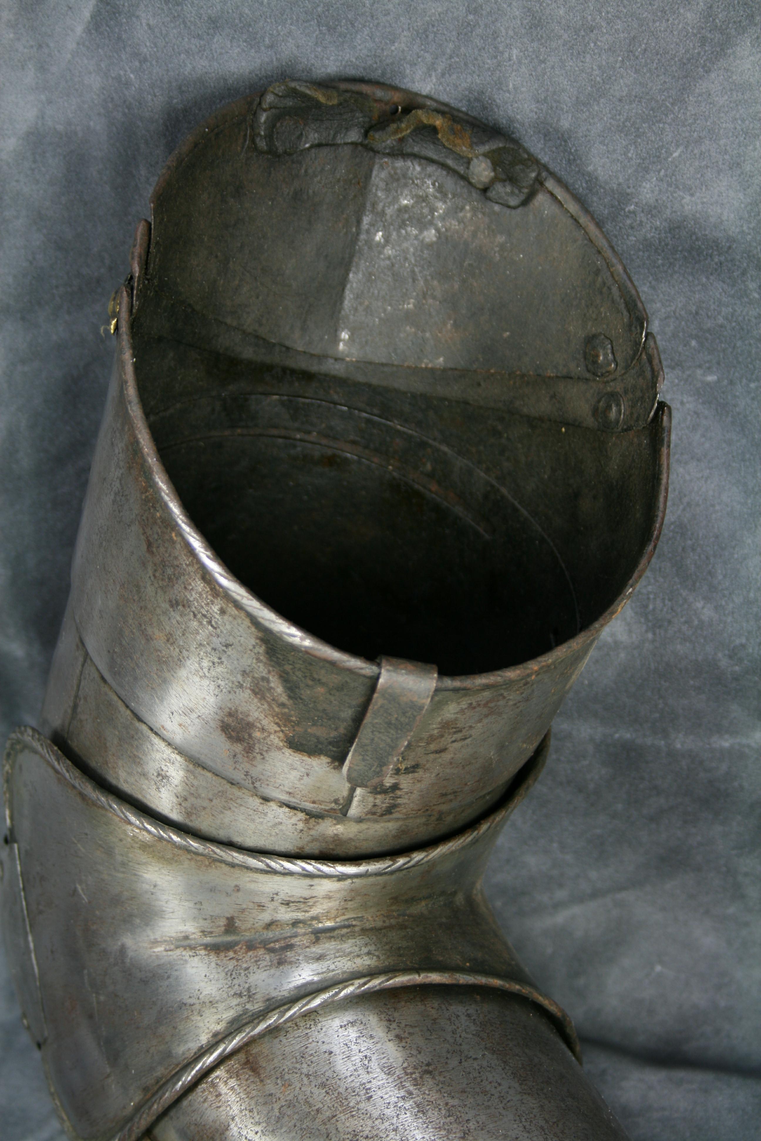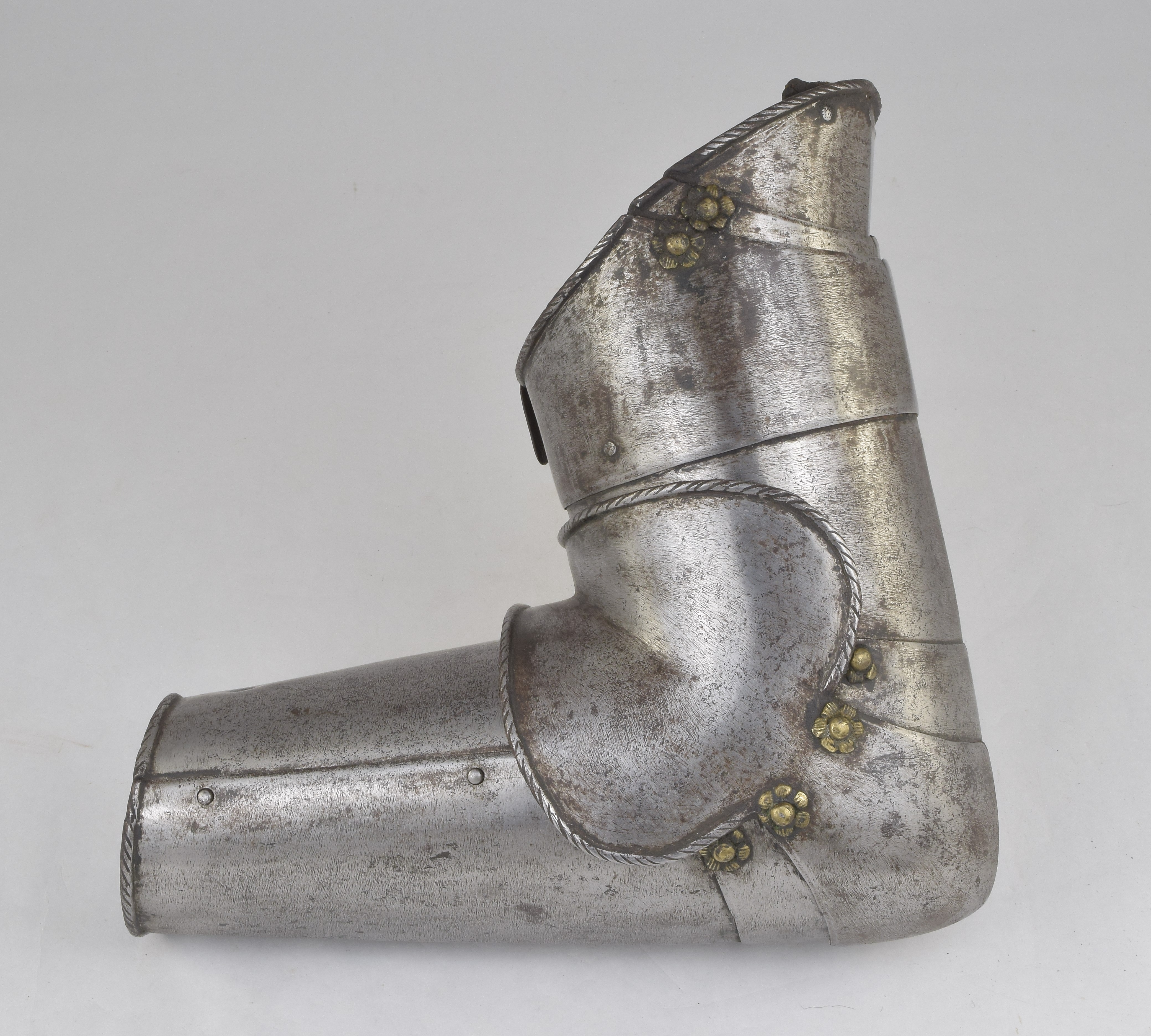 Left arm formed of a tubular upper cannon fitted with a turner of 3 lames. The upper and lower are secured by rivets which slide on long slots in the lower plate. The top edge of the turner is bordered by a narrow outward-turned roped roll . Where the plates overlap the roll is stepped to that it fits cleanly when fully extended. The two turner plates are overlapped, riveted and stepped so that the seam is flush on the outside. The cop of bracelet form which joins at the back with a single lame above and below. The vambrace formed of an inner and outer plate secured by one inset hinge on the inside (secured by 3 rivets on each side) and two pins on the outside. The main edges with roped inward turns. These have a typical Brunswick form with a crease along the outside. Most main rivets with dapped brass caps, many of them with rosette washers. There is a small clip on the inside of the turner which would secure the pauldron strap. Ex. Royal House of Hanover.