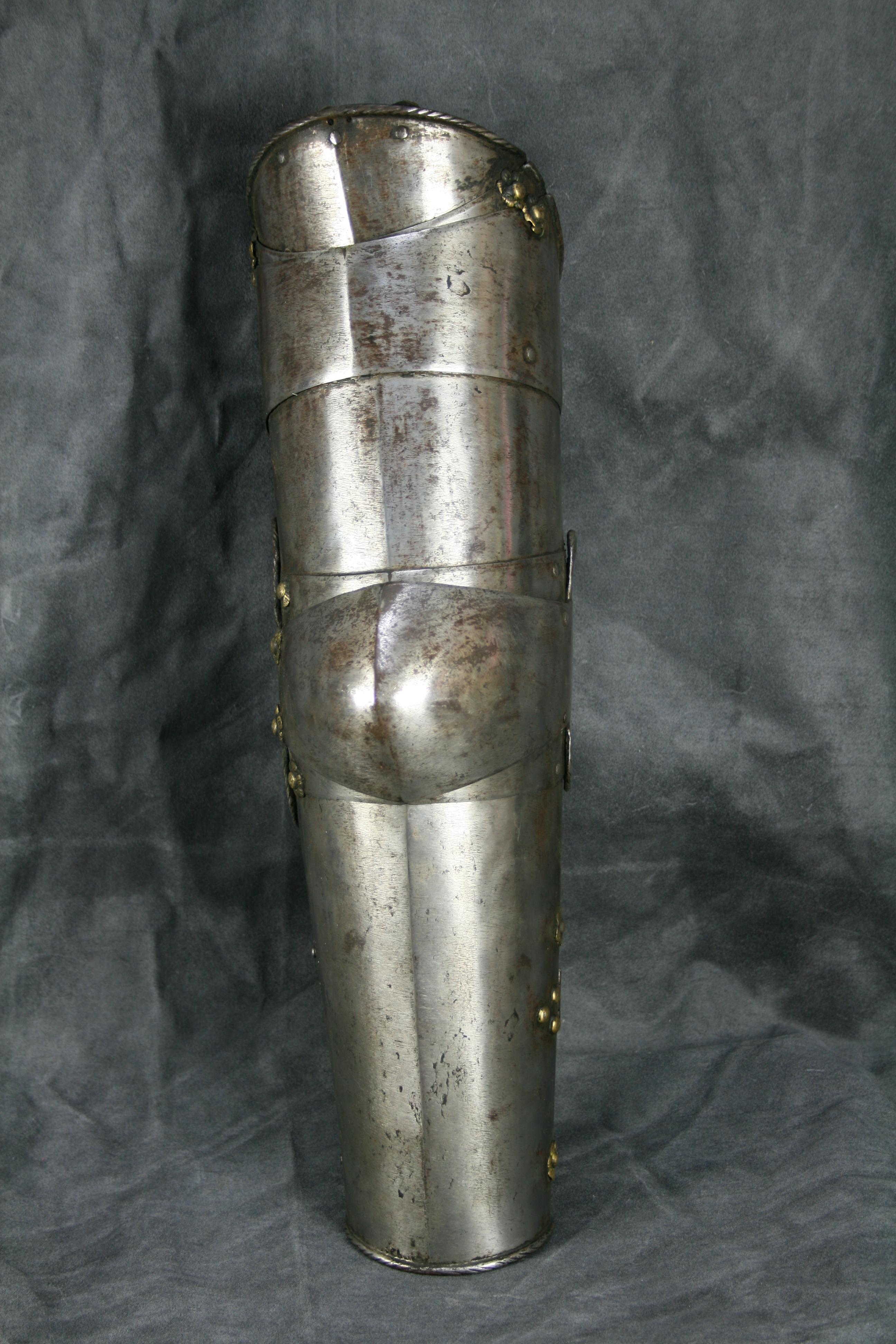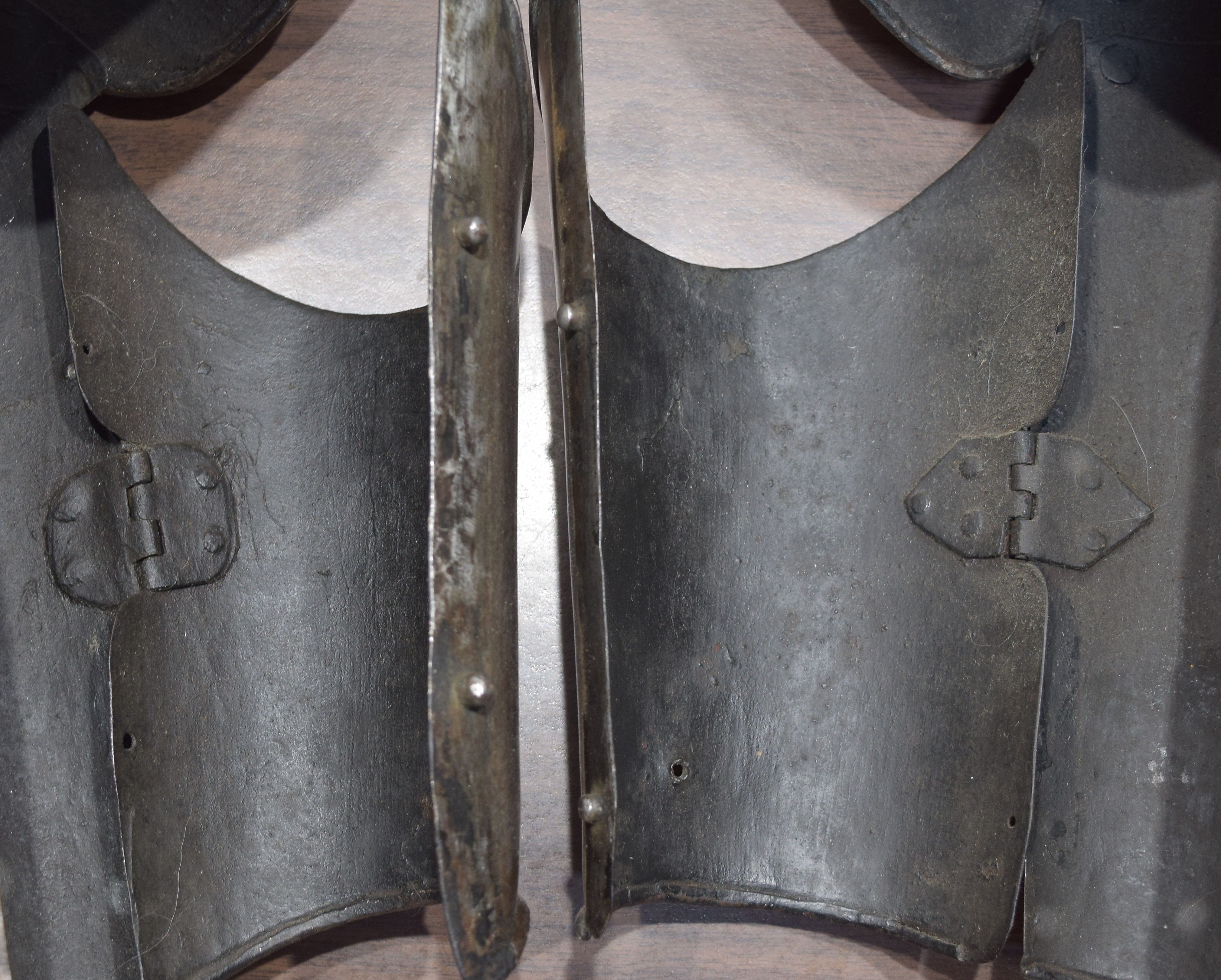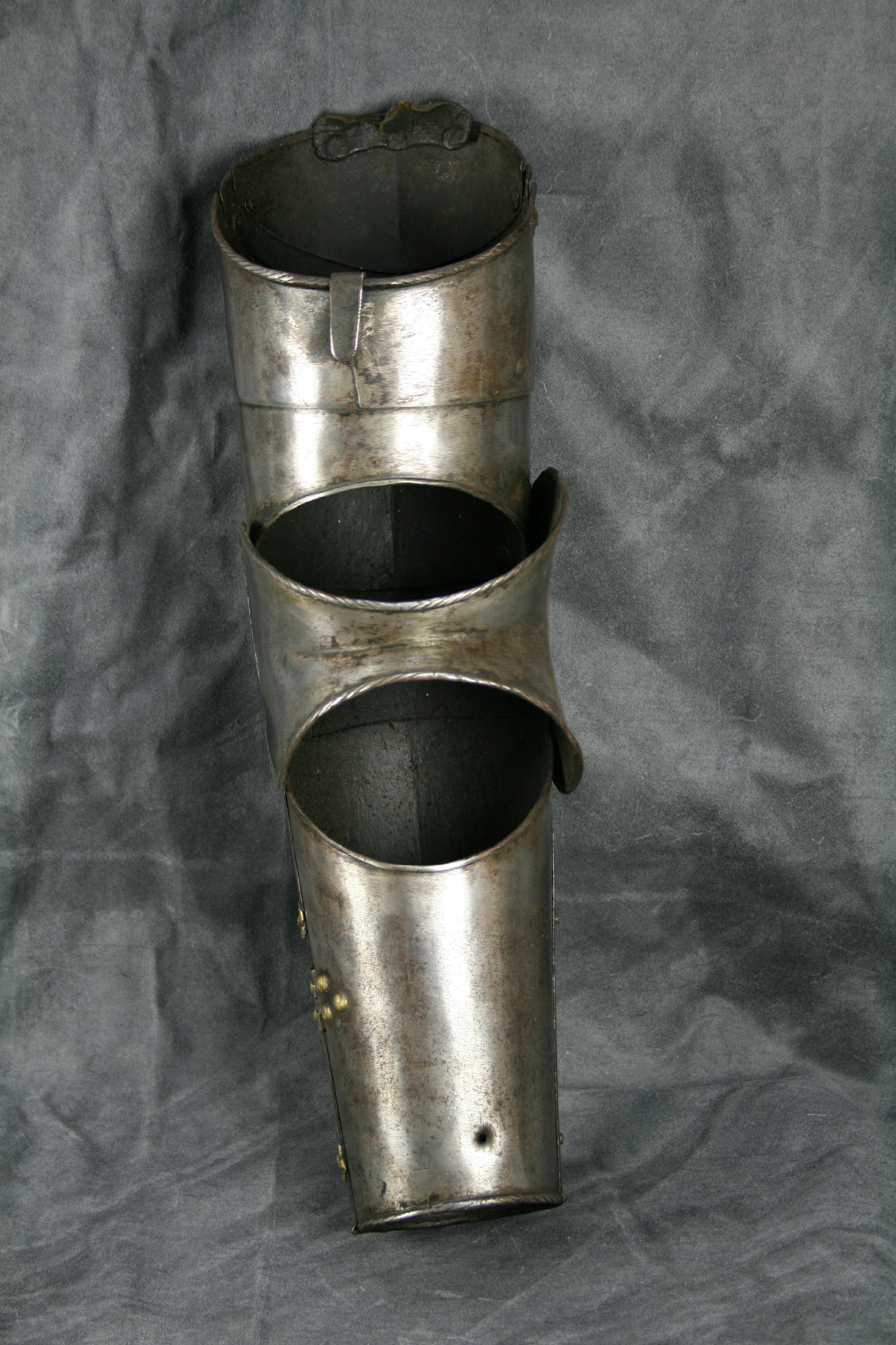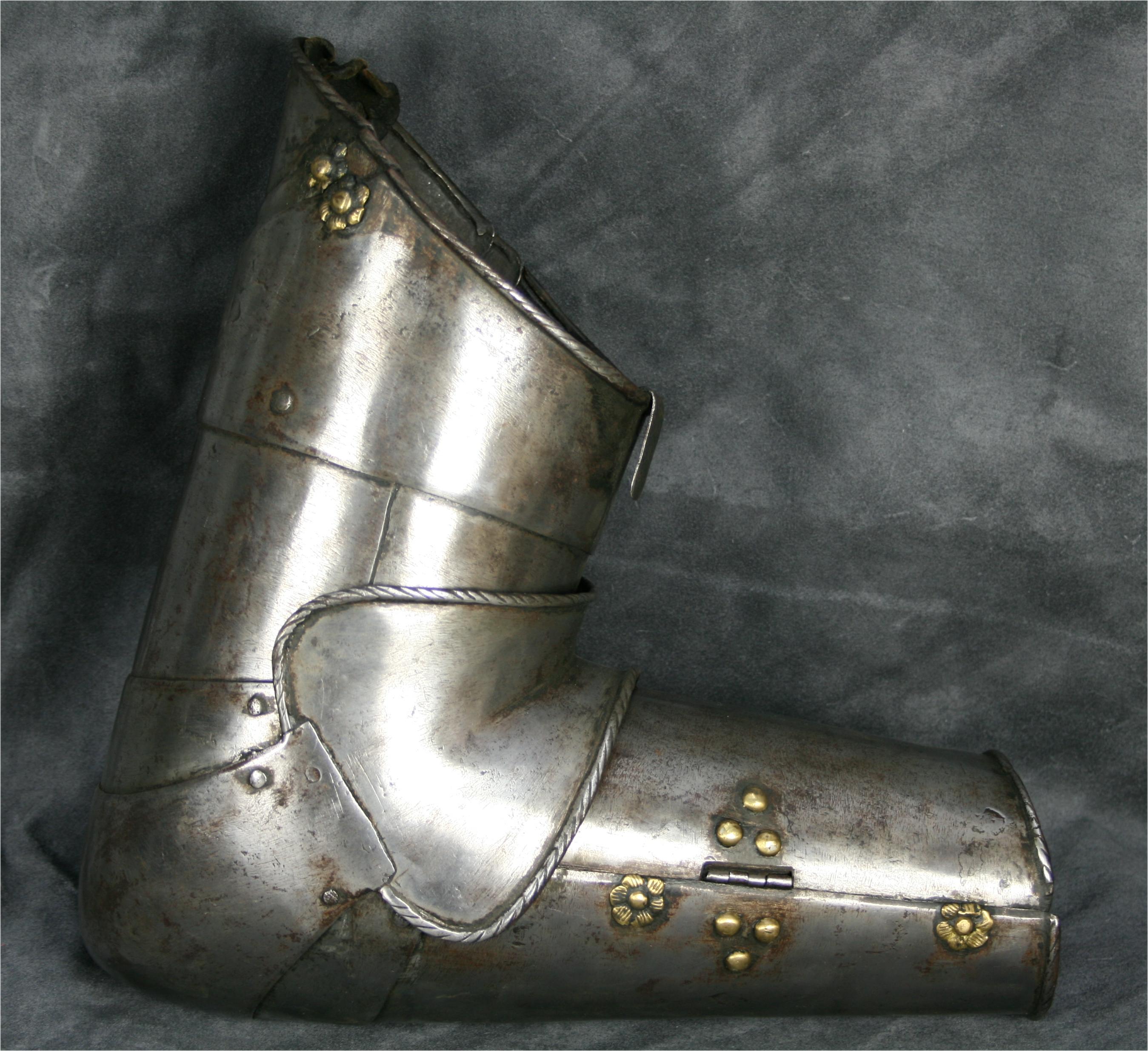 Left arm formed of a tubular upper cannon fitted with a turner of 3 lames. The upper and lower are secured by rivets which slide on long slots in the lower plate. The top edge of the turner is bordered by a narrow outward-turned roped roll . Where the plates overlap the roll is stepped to that it fits cleanly when fully extended. The two turner plates are overlapped, riveted and stepped so that the seam is flush on the outside. The cop of bracelet form which joins at the back with a single lame above and below. The vambrace formed of an inner and outer plate secured by one inset hinge on the inside (secured by 3 rivets on each side) and two pins on the outside. The main edges with roped inward turns. These have a typical Brunswick form with a crease along the outside. Most main rivets with dapped brass caps, many of them with rosette washers. There is a small clip on the inside of the turner which would secure the pauldron strap. Ex. Royal House of Hanover.