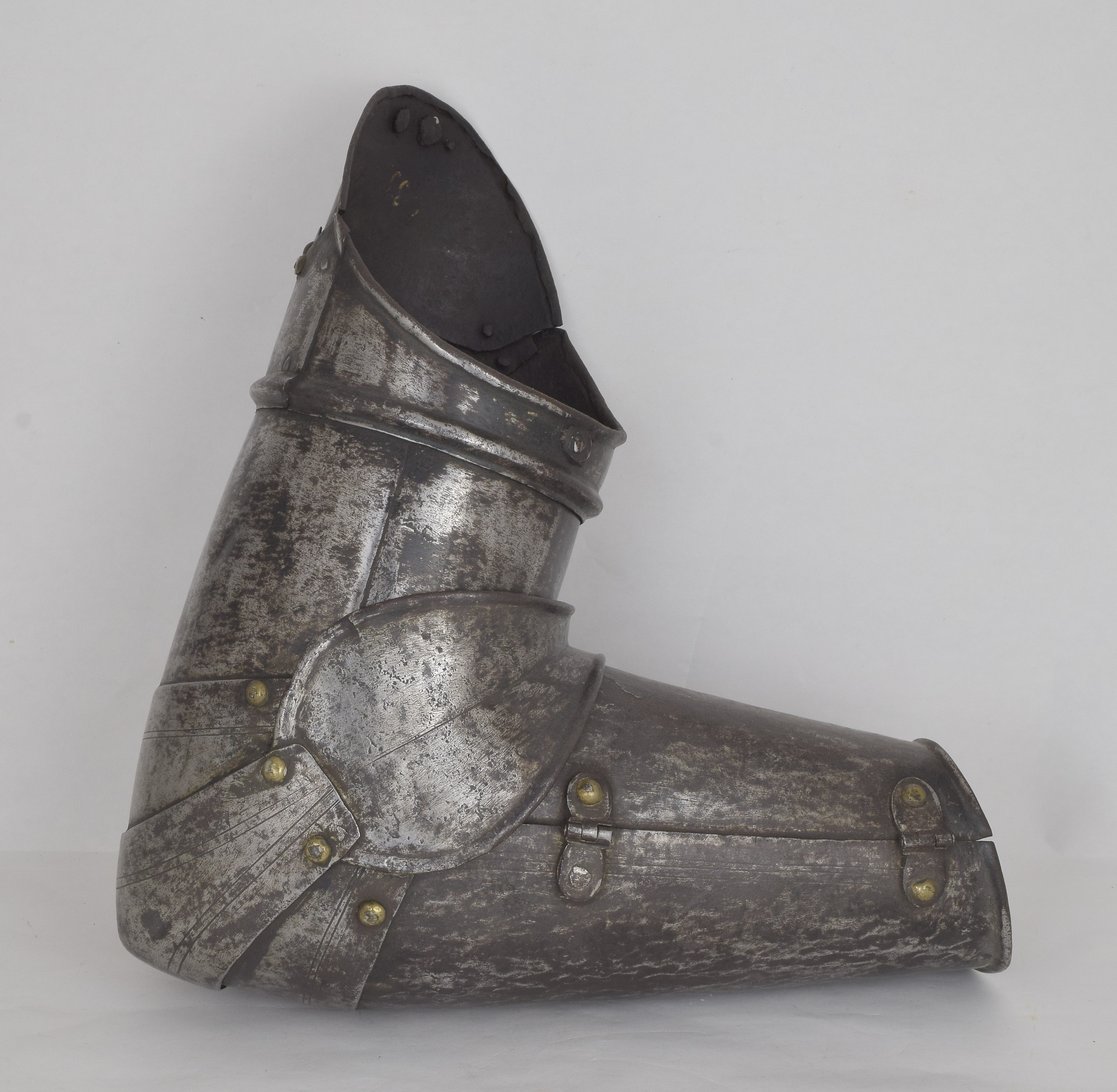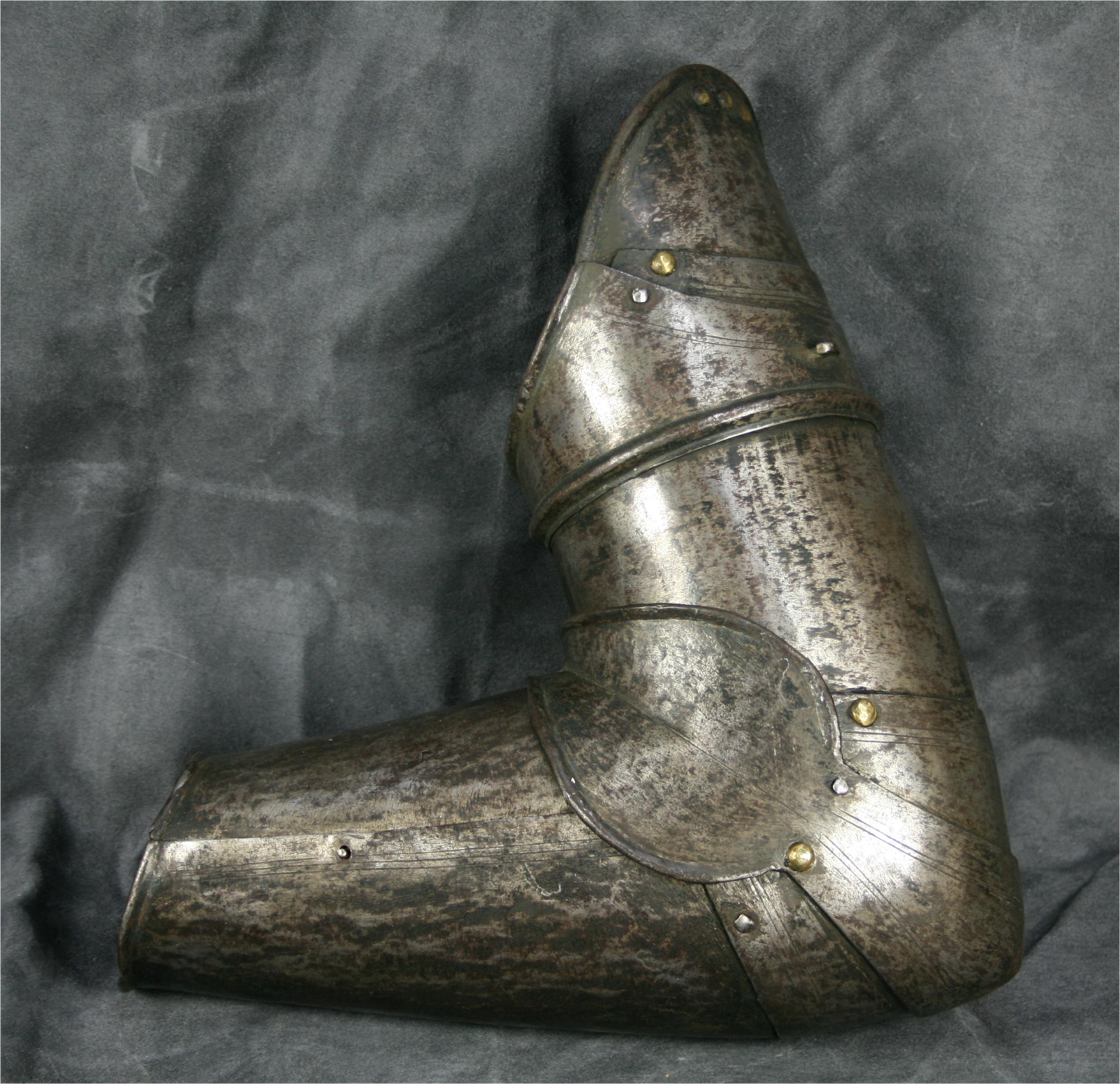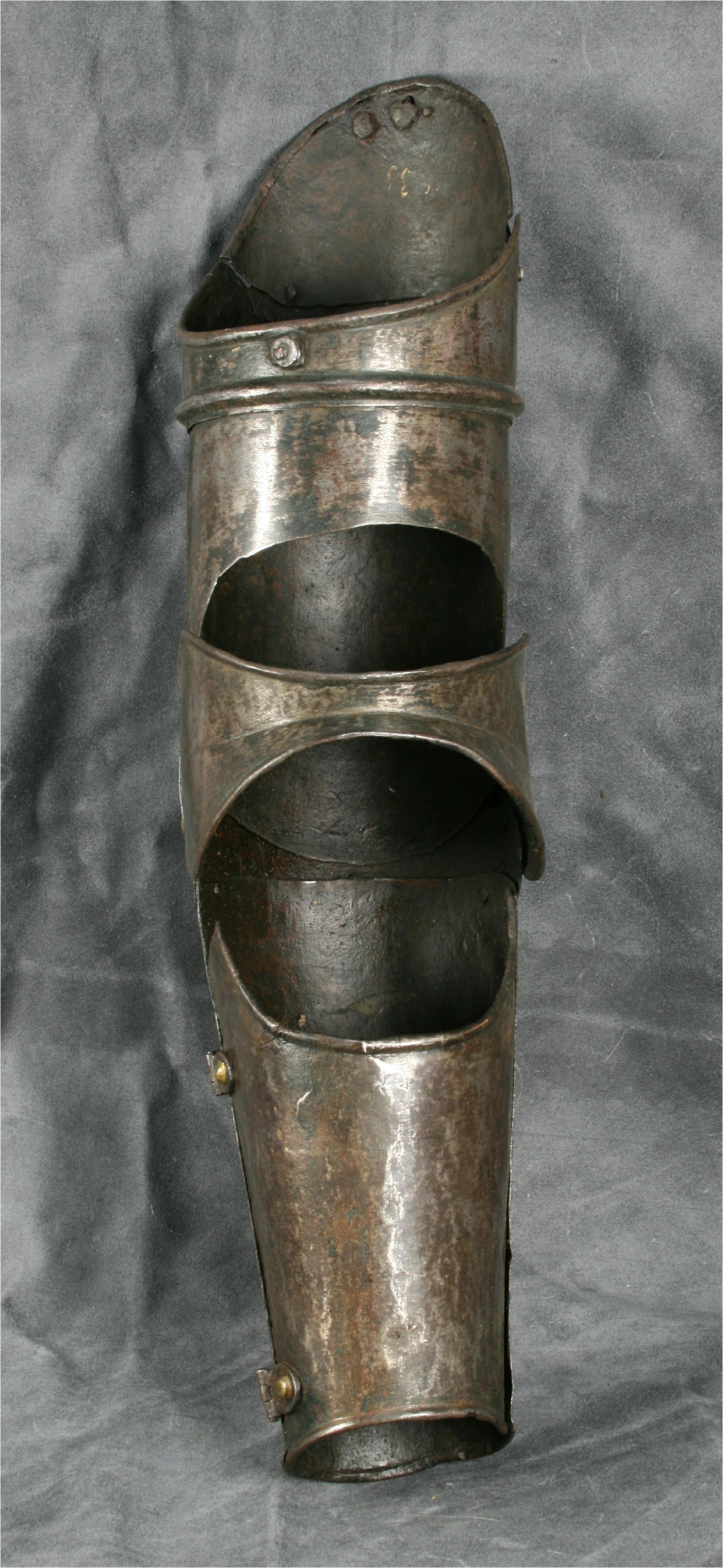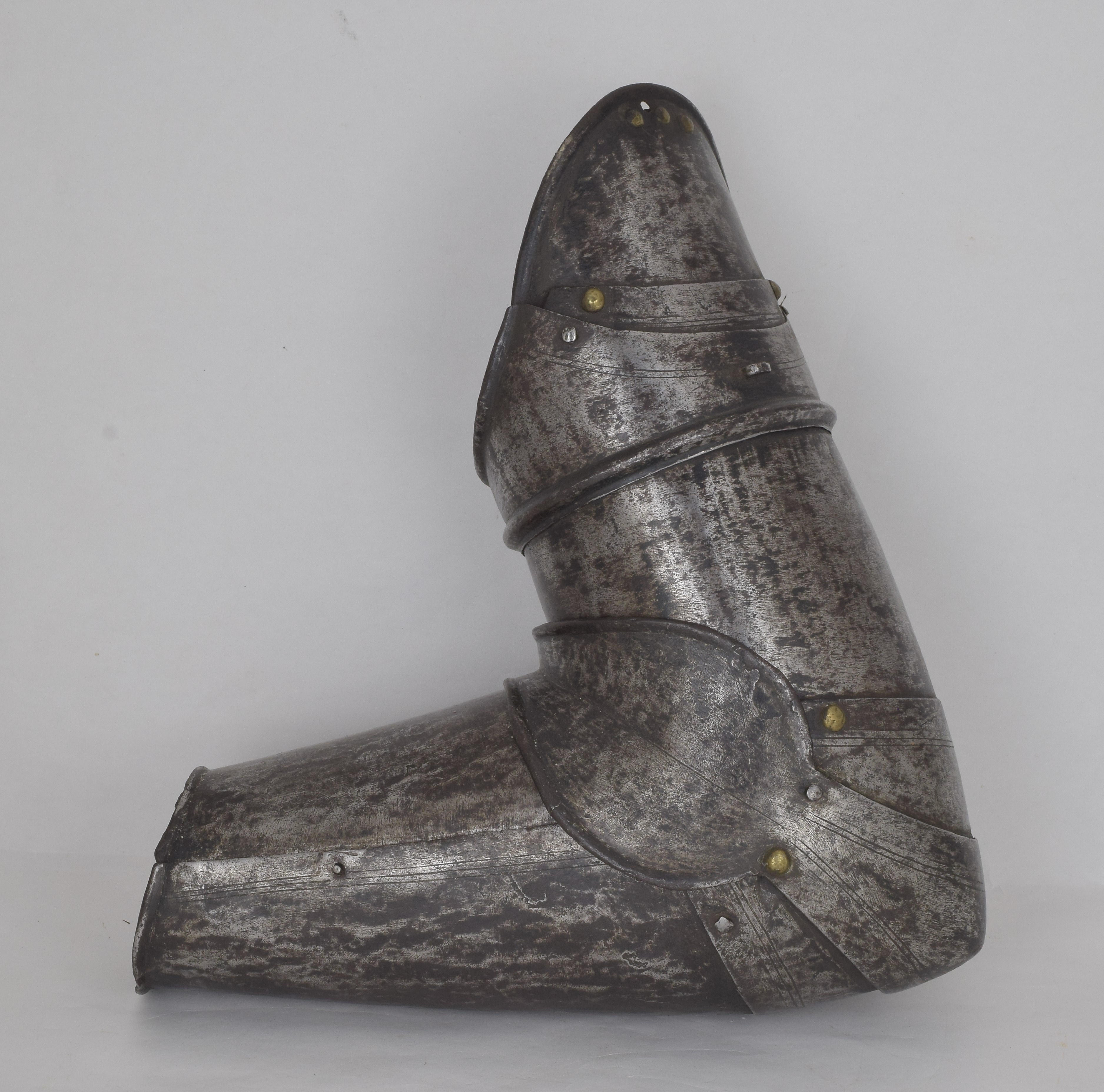 Left arm formed of a tubular upper cannon fitted with a turner of 3 lames, the upper lame retains 3 rivets which secured a leather tab to lace the arm to the sleeve. The upper and lower are secured by a raised ridge in the upper that is engaged by a flare in the lower plate. The cop of bracelet form joined at the back with a single lame above and below. The vambrace formed of an inner and outer plate secured by two external hinges on the inside and a pin on the outside. The main edges with inward turns. The surface is rough from the hammer with remains of oxide finish. There is a pin on the outside of the main plate of the turner to secure the arm to the pauldron and a rivet on the inside securing a piece of leather that would originally have been a loop to secure the pauldron strap. The main edges are decorated with incised lines. Many of the rivets retain dapped brass caps. Ex. Royal House of Hanover.