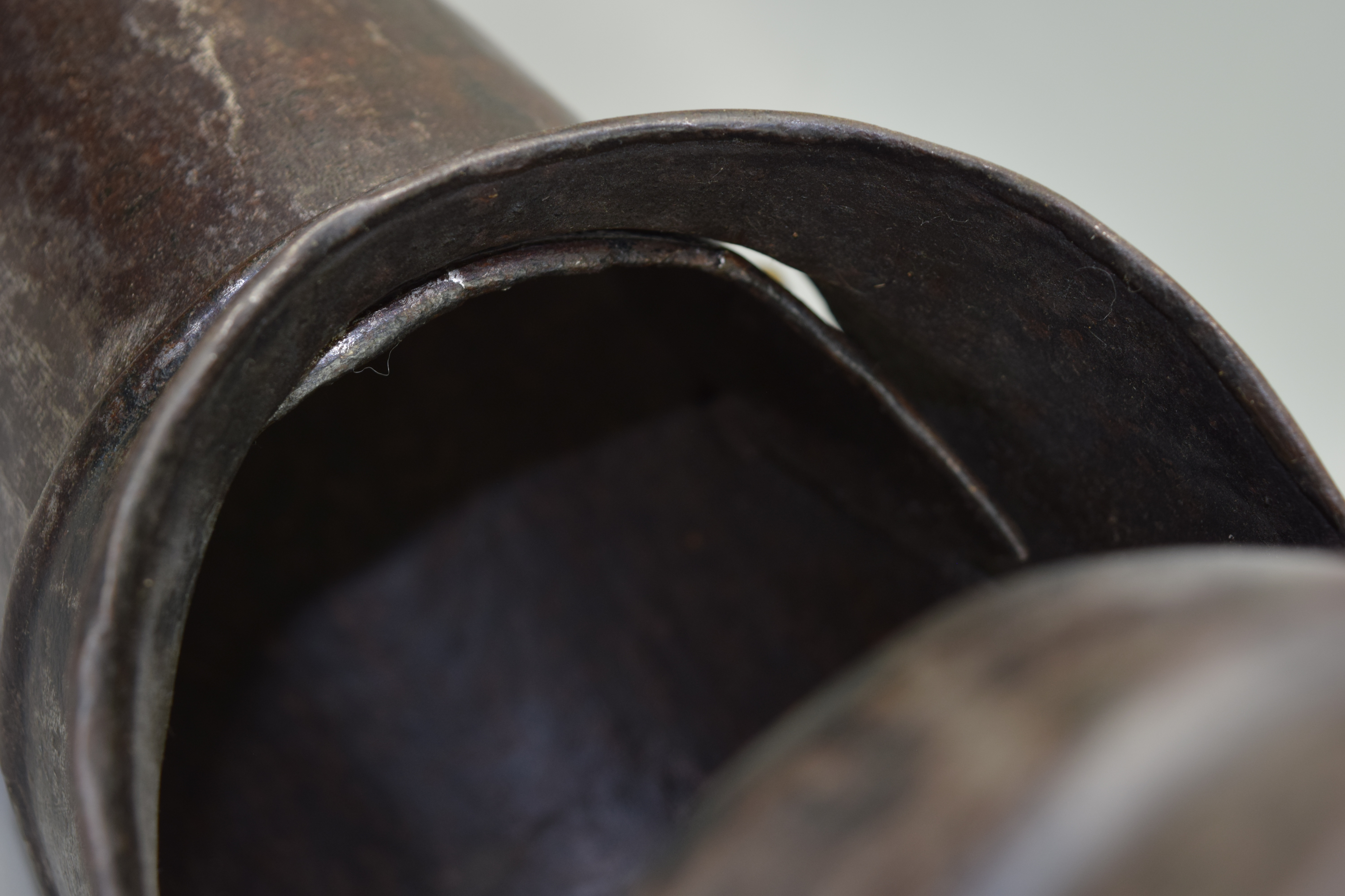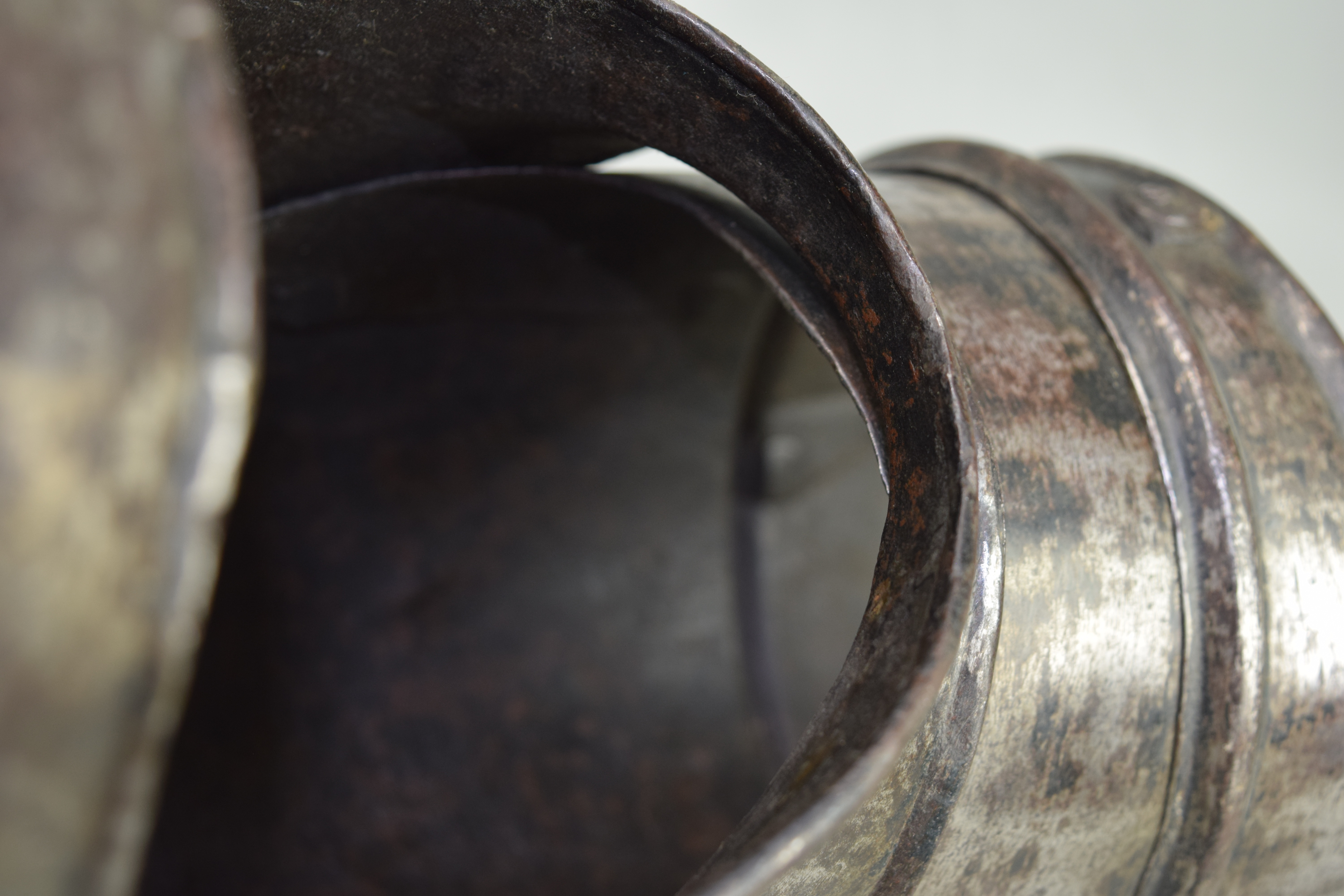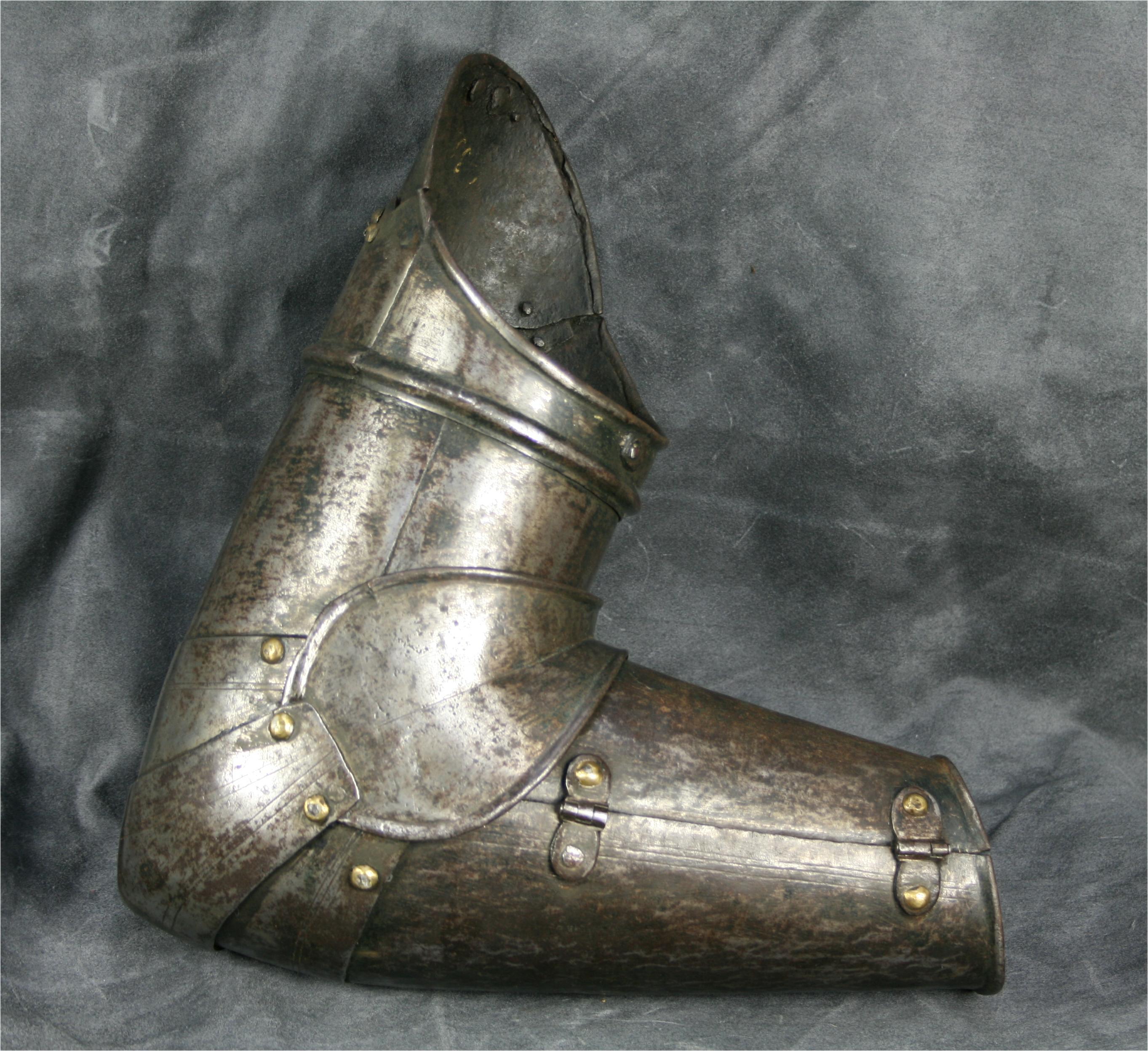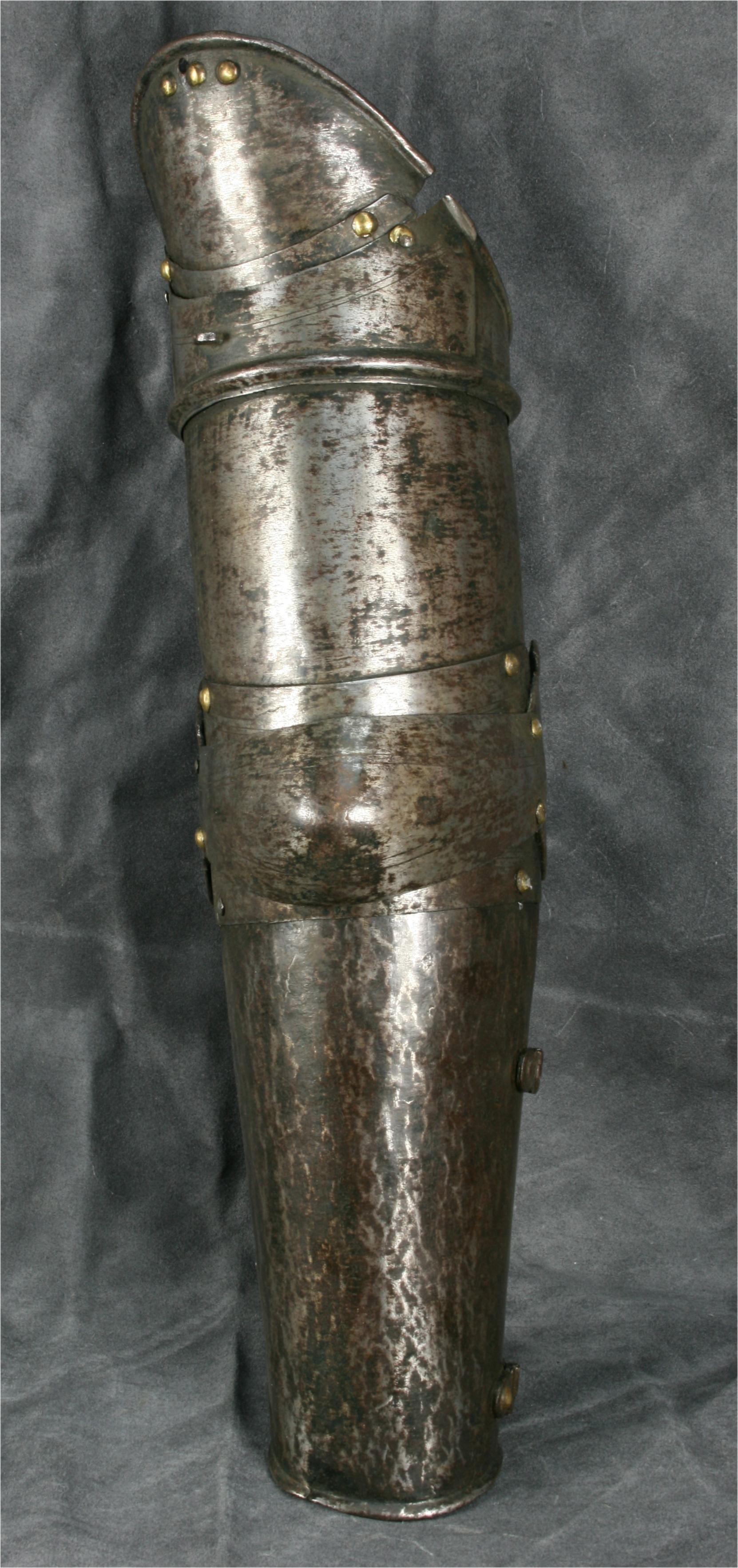 Left arm formed of a tubular upper cannon fitted with a turner of 3 lames, the upper lame retains 3 rivets which secured a leather tab to lace the arm to the sleeve. The upper and lower are secured by a raised ridge in the upper that is engaged by a flare in the lower plate. The cop of bracelet form joined at the back with a single lame above and below. The vambrace formed of an inner and outer plate secured by two external hinges on the inside and a pin on the outside. The main edges with inward turns. The surface is rough from the hammer with remains of oxide finish. There is a pin on the outside of the main plate of the turner to secure the arm to the pauldron and a rivet on the inside securing a piece of leather that would originally have been a loop to secure the pauldron strap. The main edges are decorated with incised lines. Many of the rivets retain dapped brass caps. Ex. Royal House of Hanover.