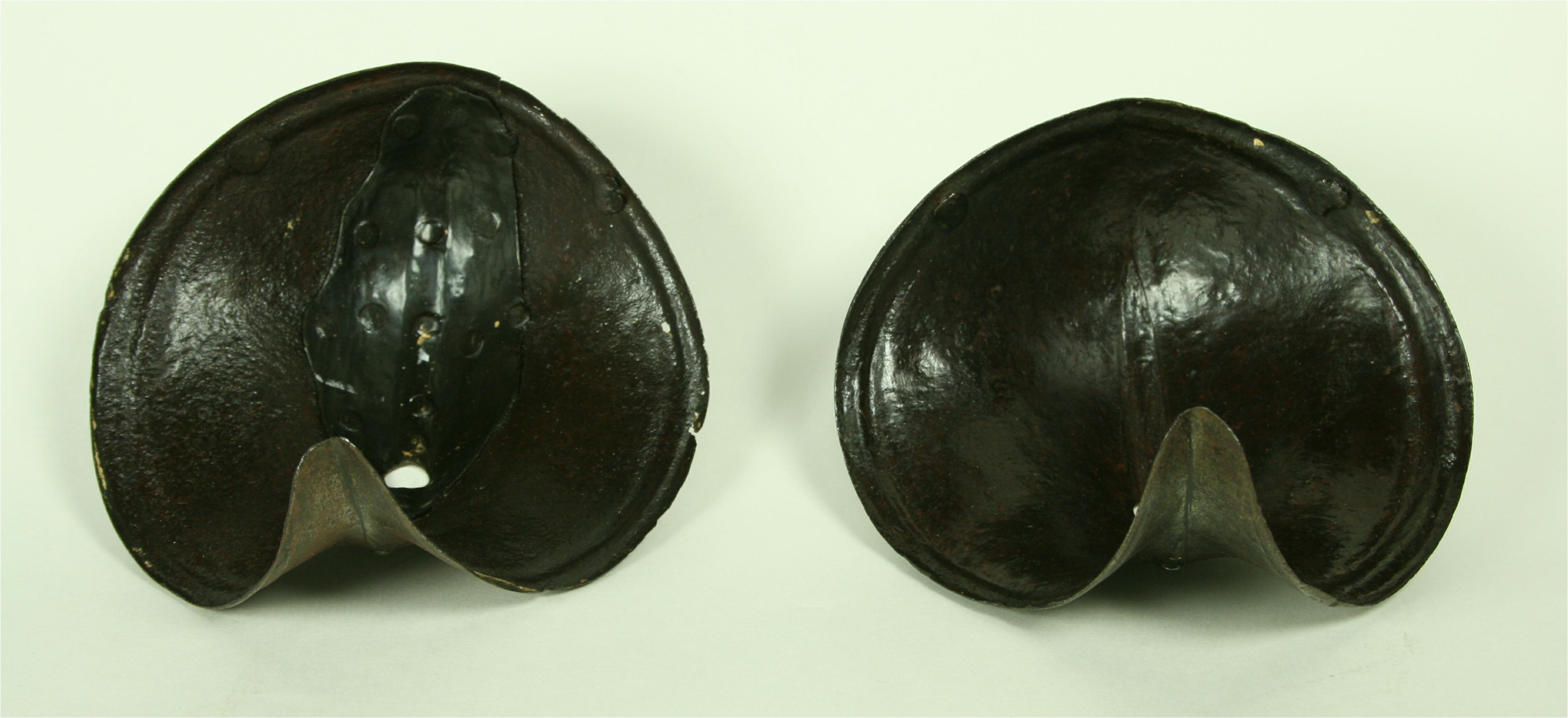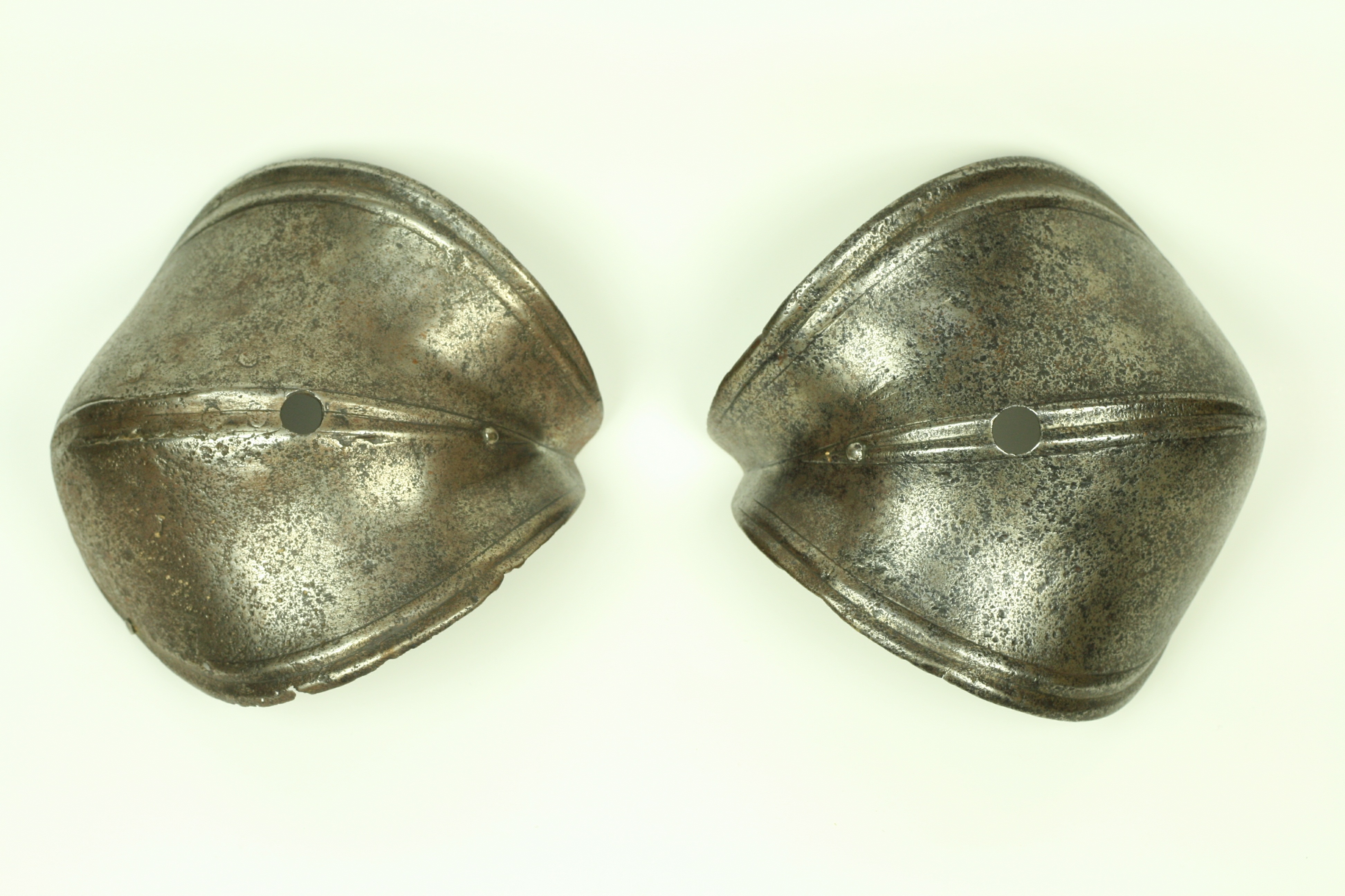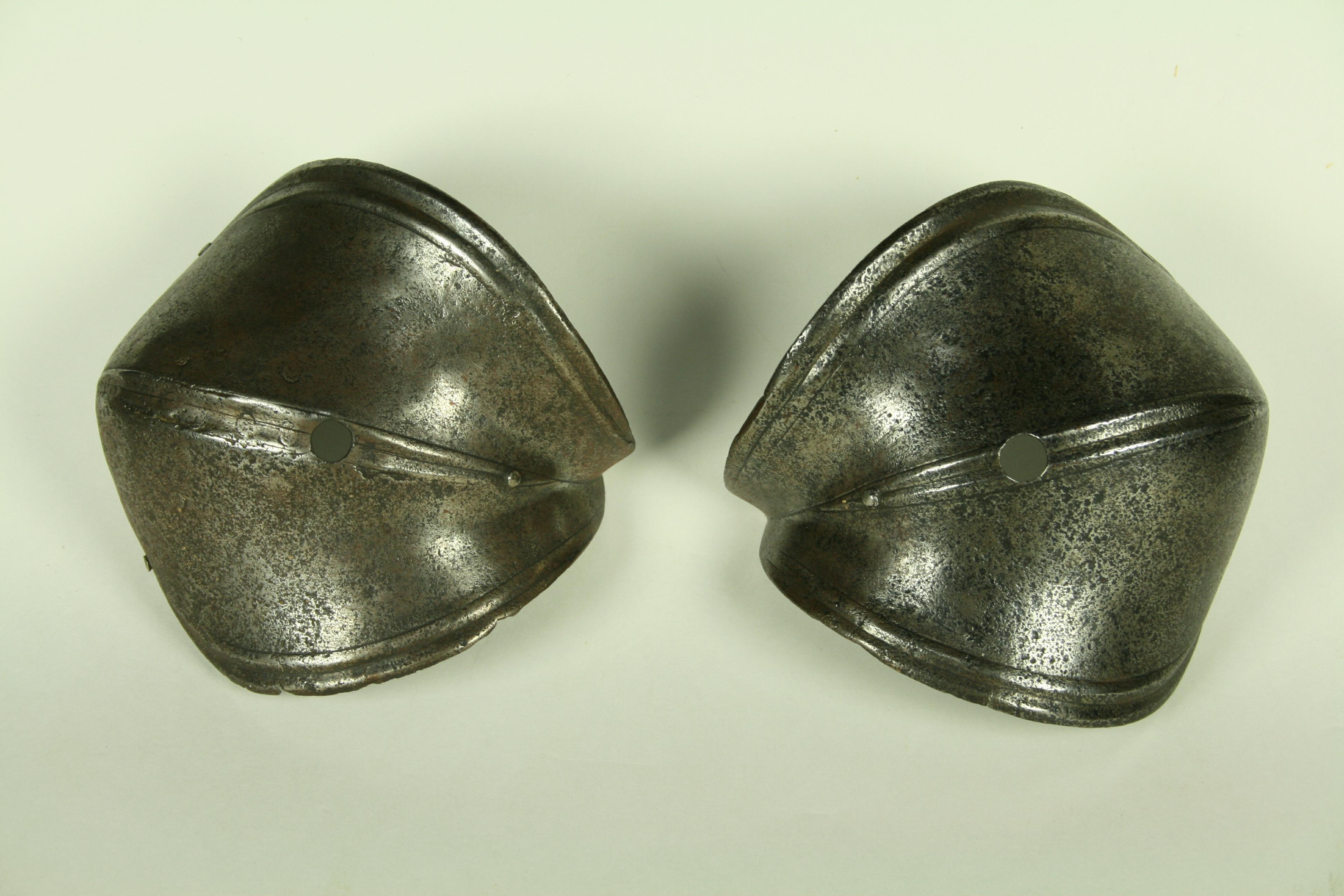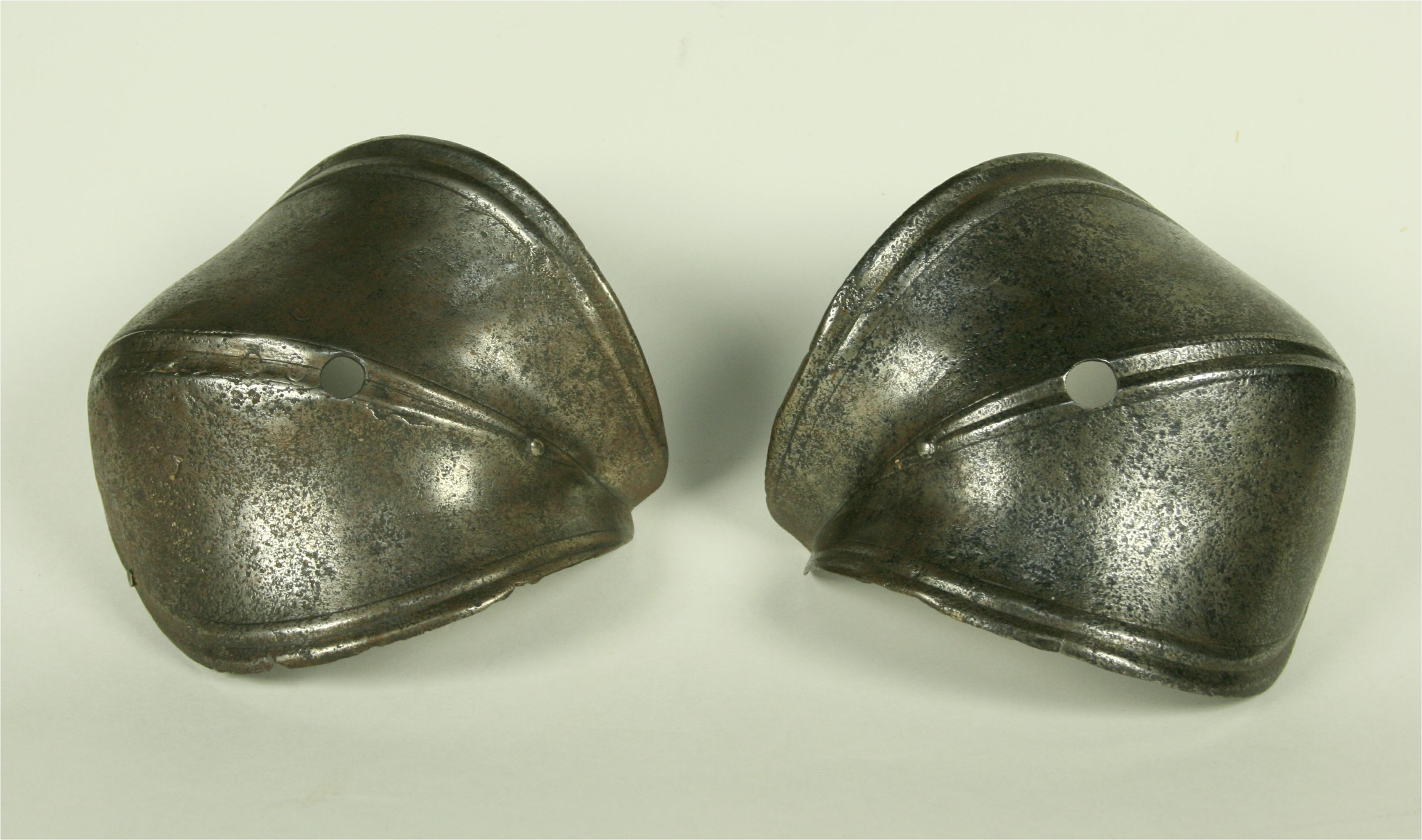 German. A pair, both pitted, one with a large internal patch. Each of small, shell form with fluted border and engraved lines. Rising to a central fluted ridge, also accented by engraved lines. There is a hole in the center which would have engaged a pin in a leather strap that connected the cops to the vambrace. There are also two rivets at the back and one in the wing to secure a strap across the inside of the elbow. Ex. Col. Dr. Peter Parsons.