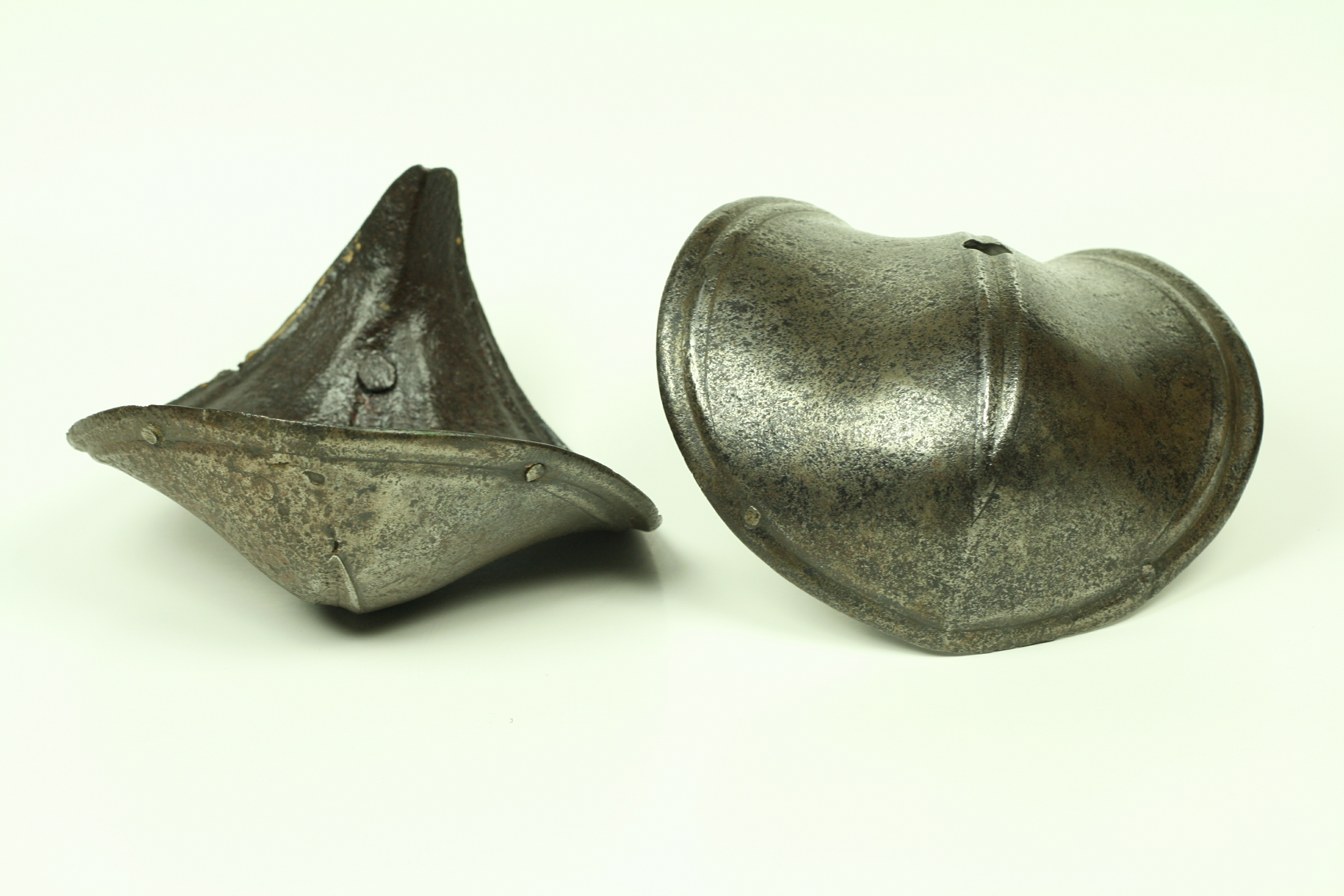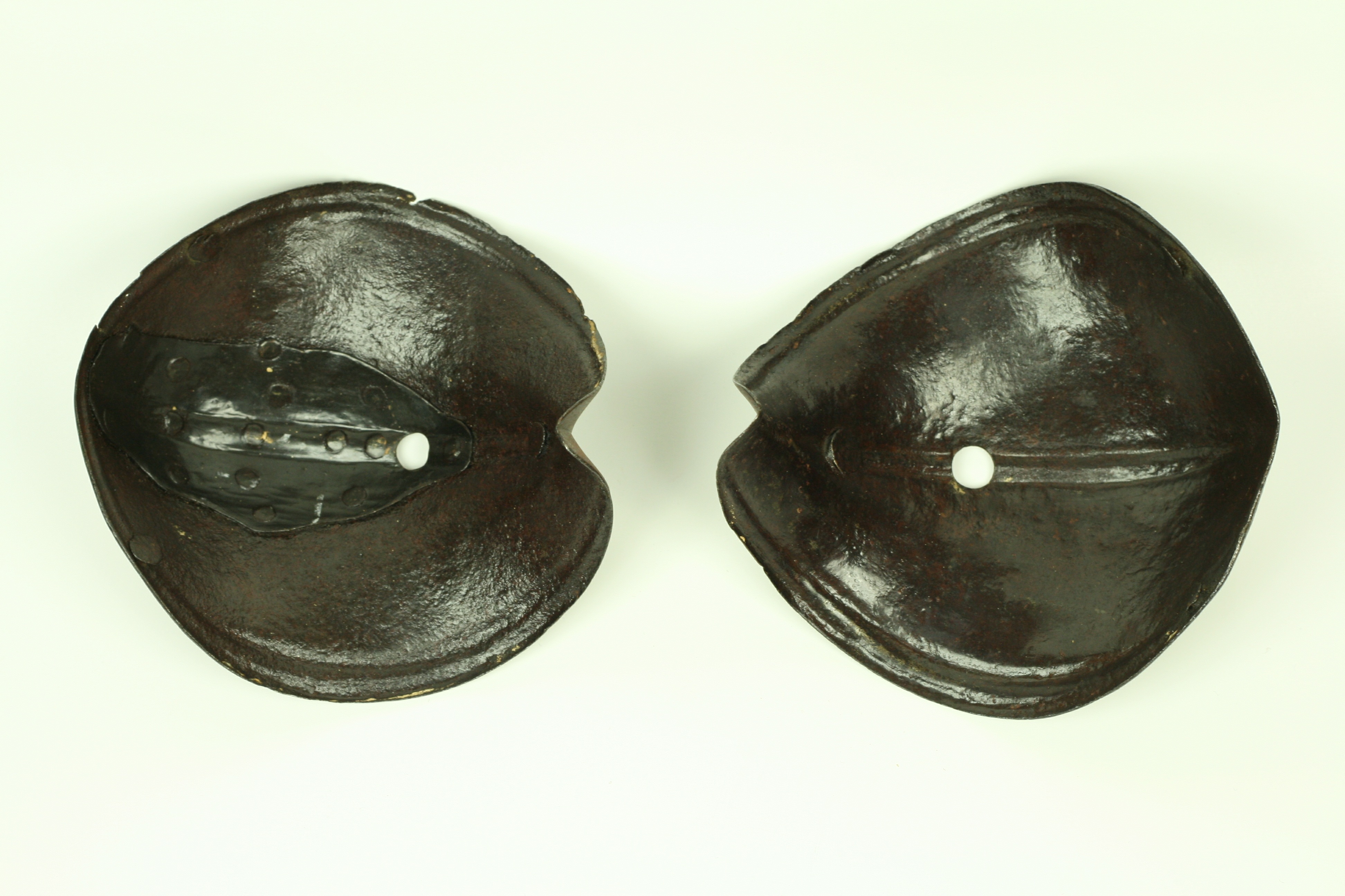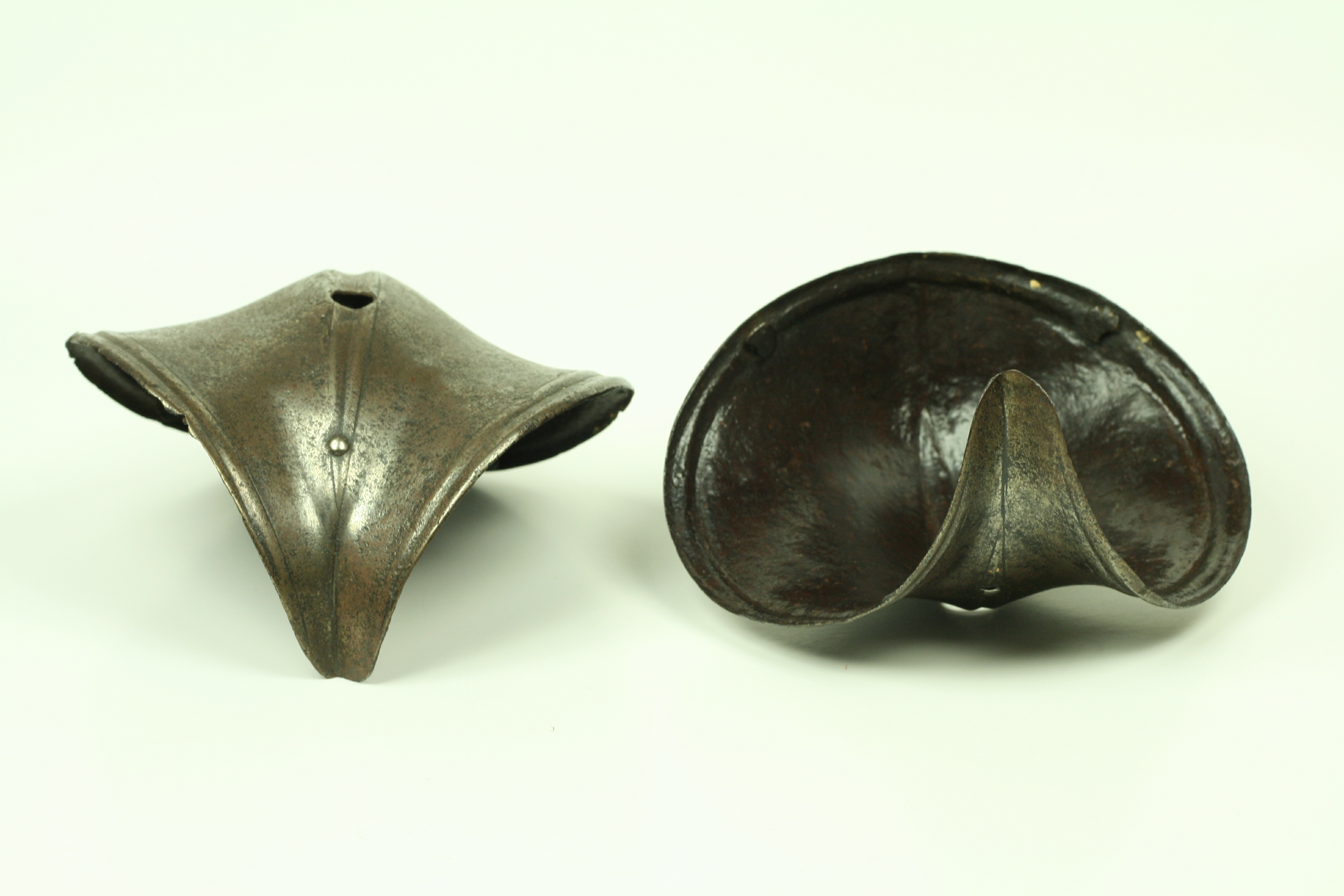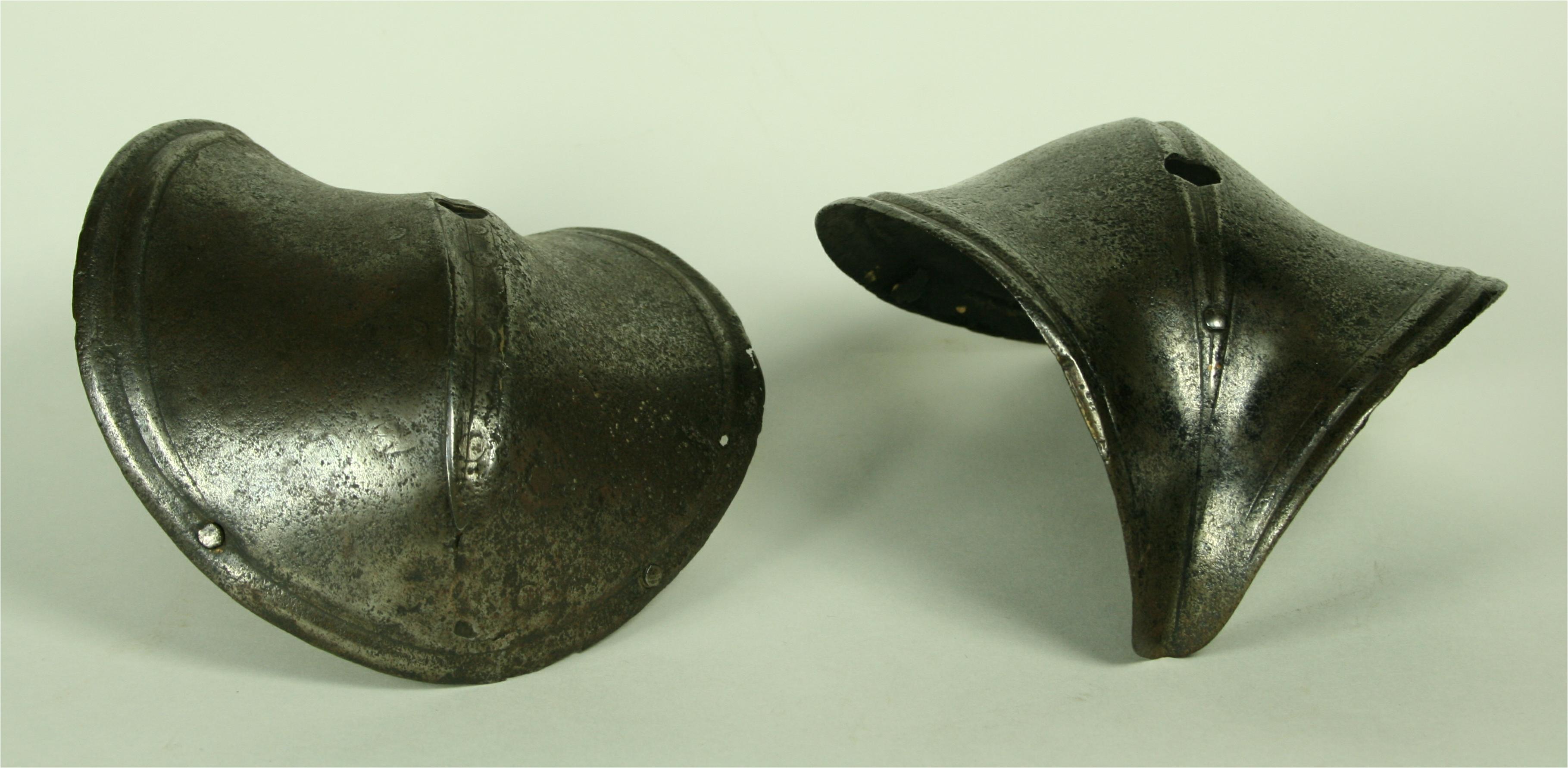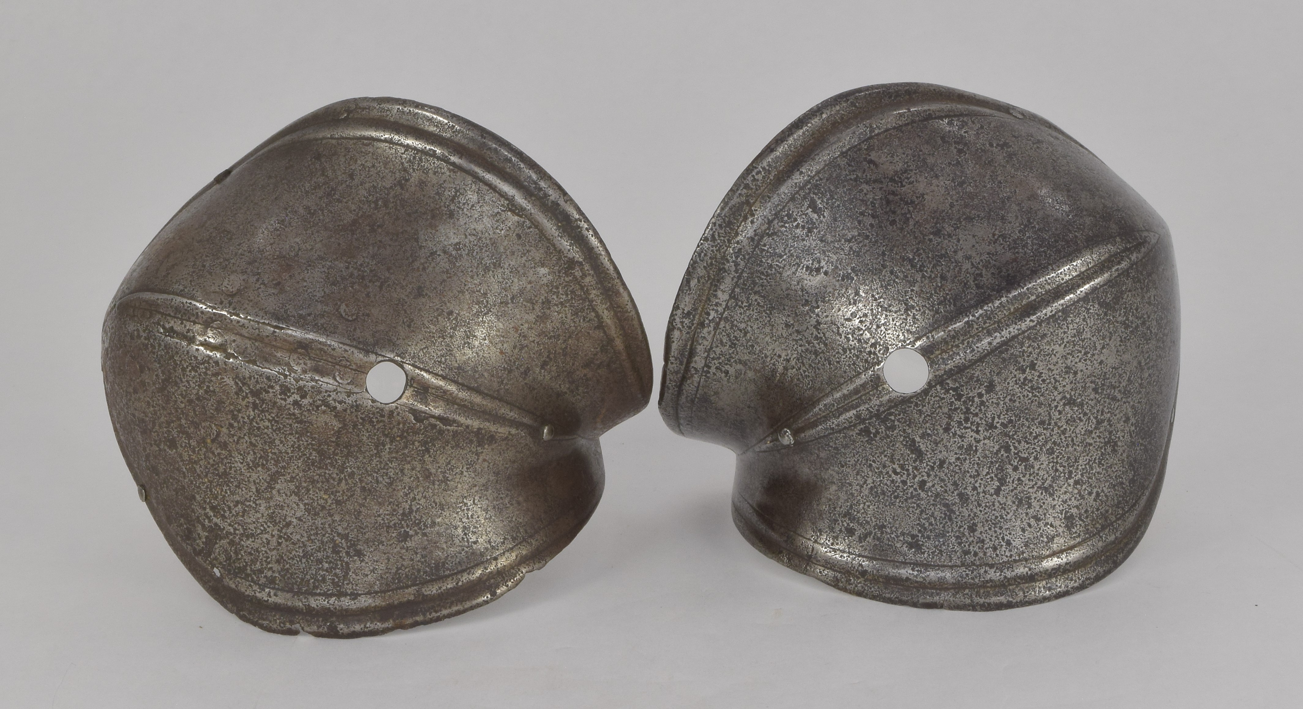 German. A pair, both pitted, one with a large internal patch. Each of small, shell form with fluted border and engraved lines. Rising to a central fluted ridge, also accented by engraved lines. There is a hole in the center which would have engaged a pin in a leather strap that connected the cops to the vambrace. There are also two rivets at the back and one in the wing to secure a strap across the inside of the elbow. Ex. Col. Dr. Peter Parsons.