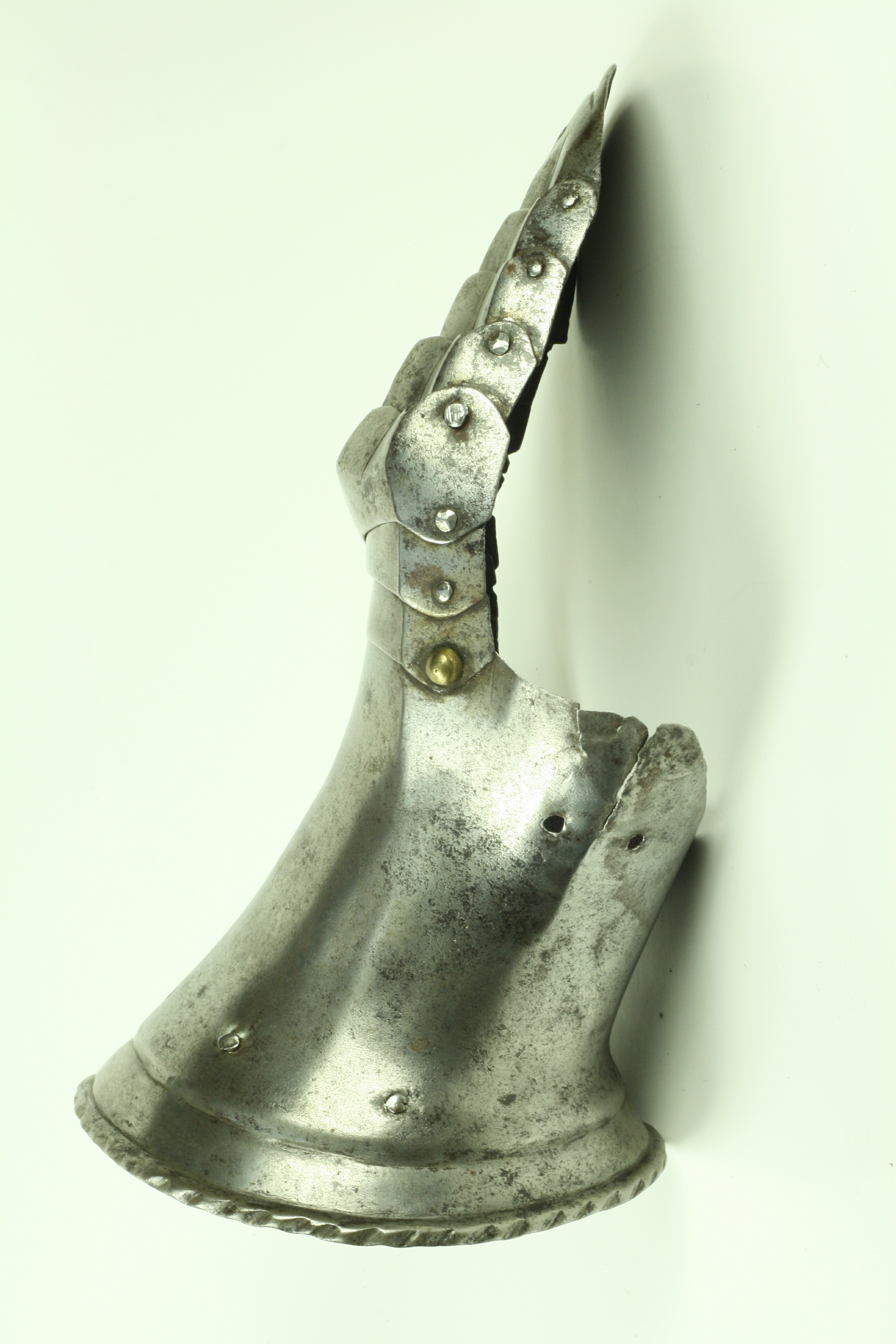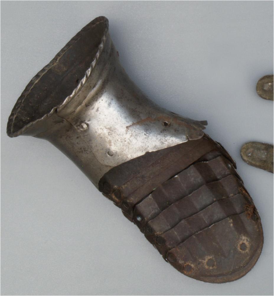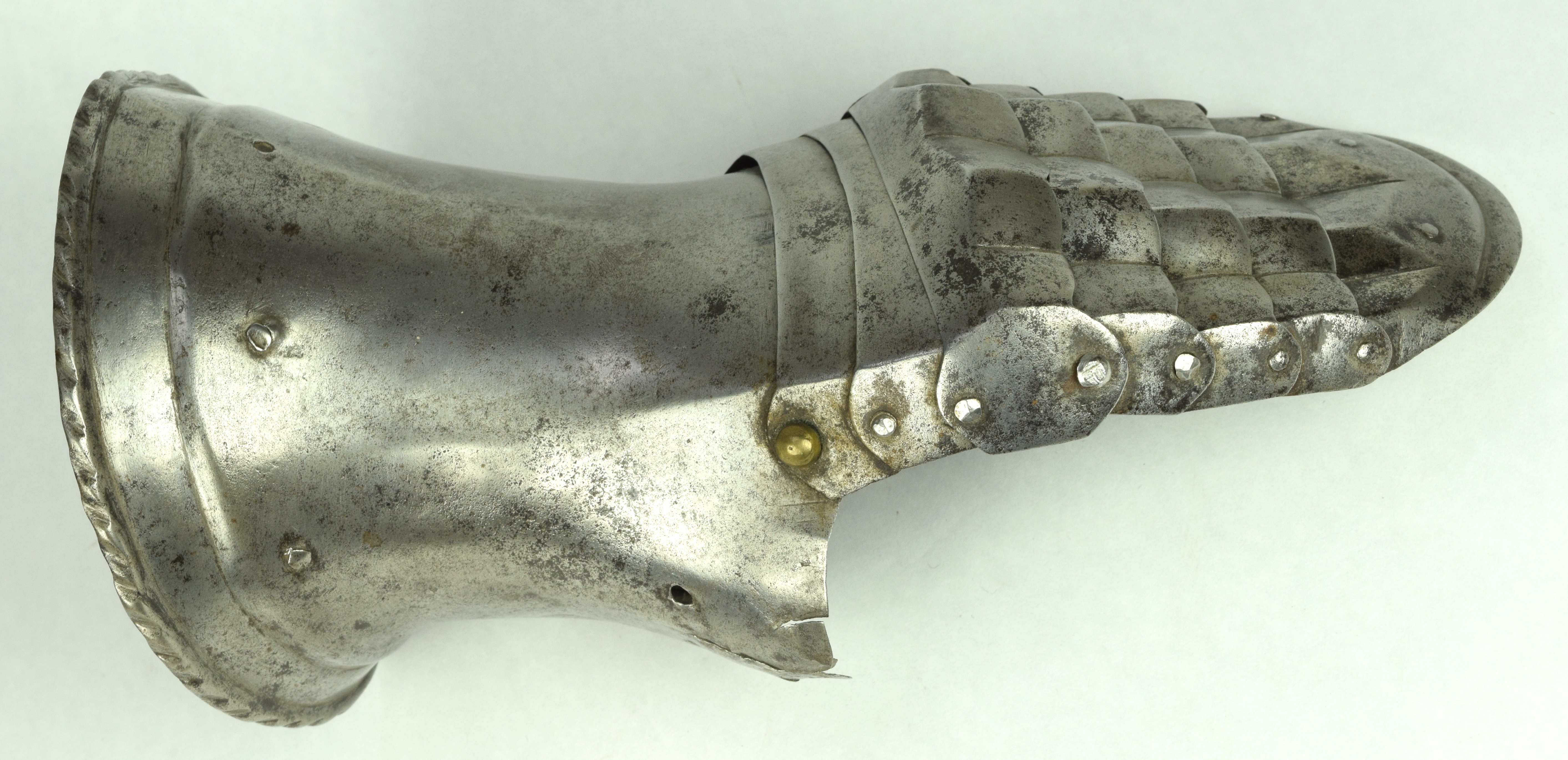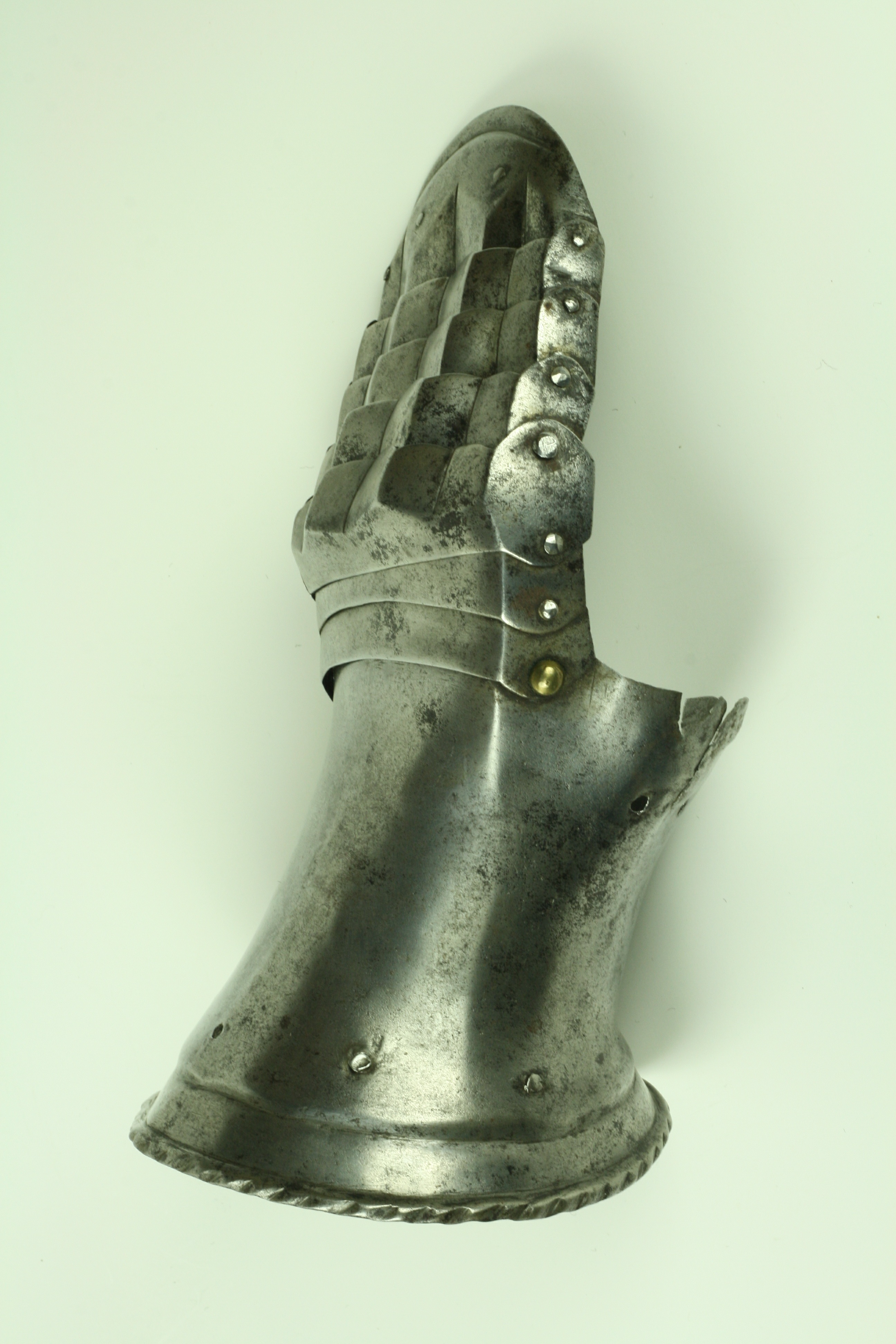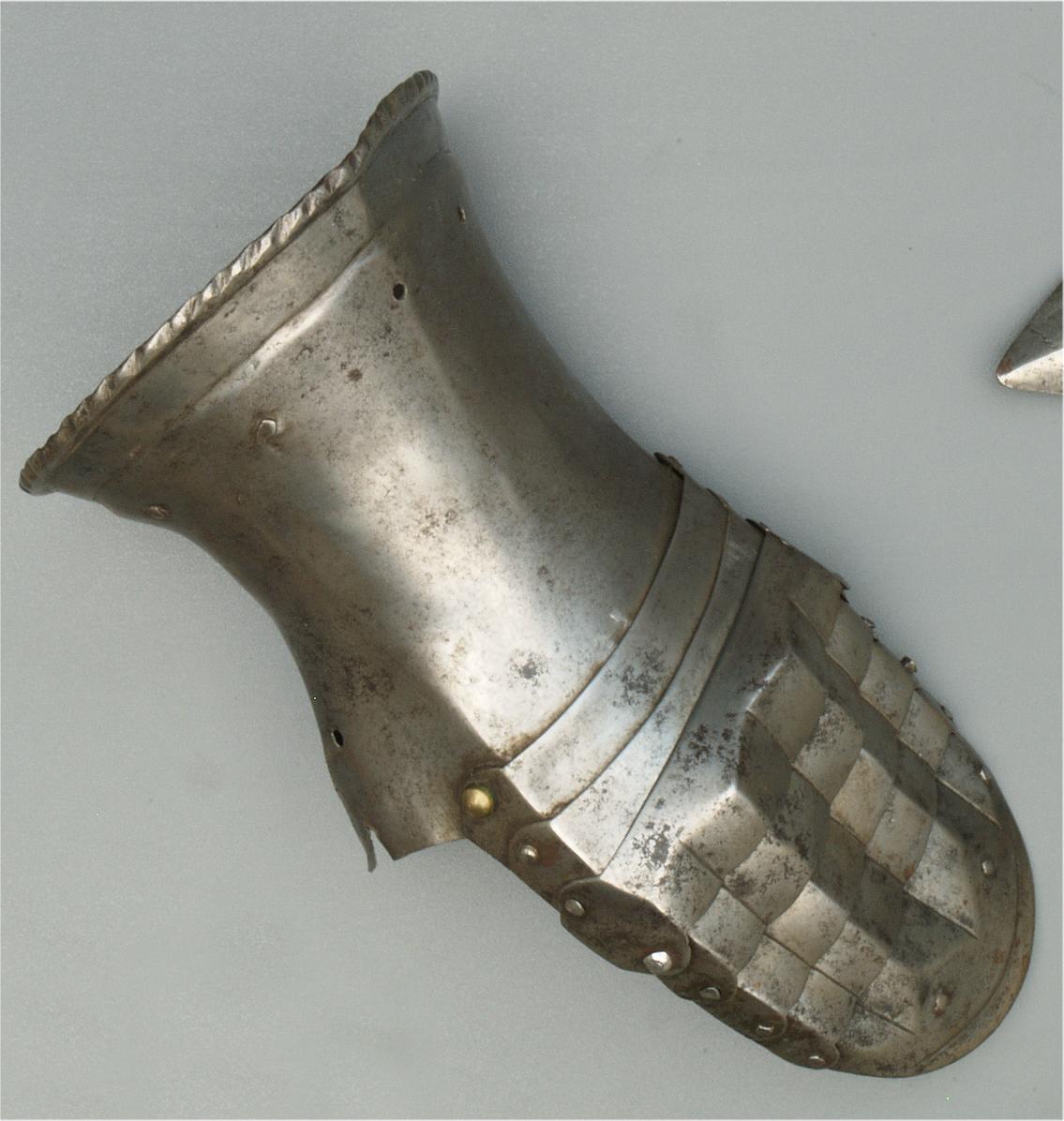 One piece cuff flaring from the wrist. Outer edge with an inward-turned, roped roll with a parallel recessed band. Central crease in the cuff. The main plate extends to cover half of the back of the hand and over the base of the thumb. The remainder of the back of the hand covered by 2 plates. The back of hand creased at the corners and at the center of the base of the thumb. Fingers covered by four plates, joined to the back of hand by a knuckle rider. The front of the knuckle rider and the fingers with fluted creases over the fingers. The end of the final finger plate with a hollow inward partial turn. The base line between the fingers accented by engraved lines. The ends of the plates are decorated with a filed notch on the end opposite the thumb. The thumb area is cracked. The form of the cracks and stiffness indicate it may have been tempered. Some original rivets remain, some replaced. The rivets on the terminal plate, articulation rivets between the last 3 plates, two of the metacarpal lame rivets, two rivets for securing the glove to the cuff and one of the rivets securing the inside of the wrist appear original. There are some small remains of fabric under some of the rivet heads. These appear to have been used to secure the glove.
