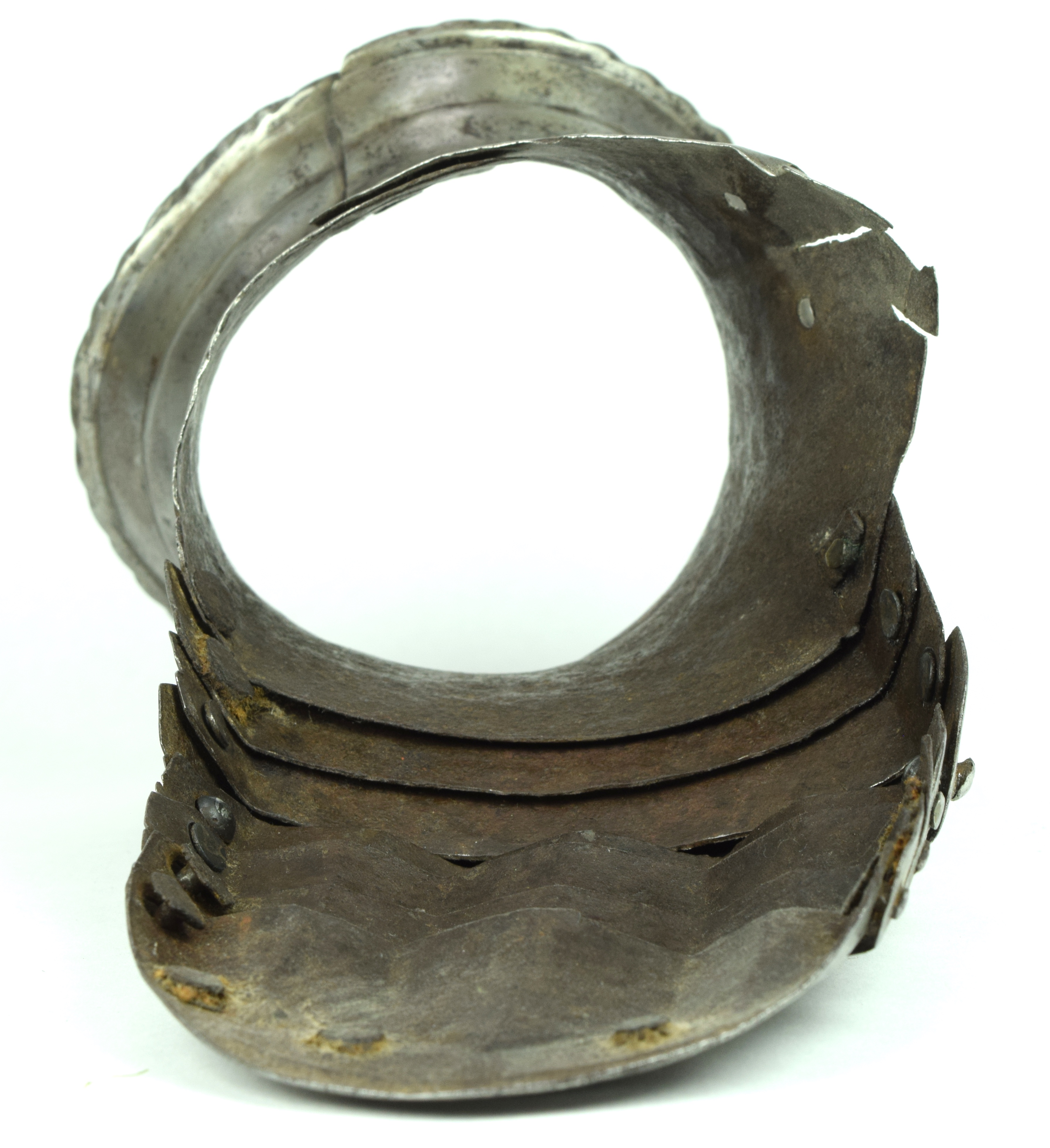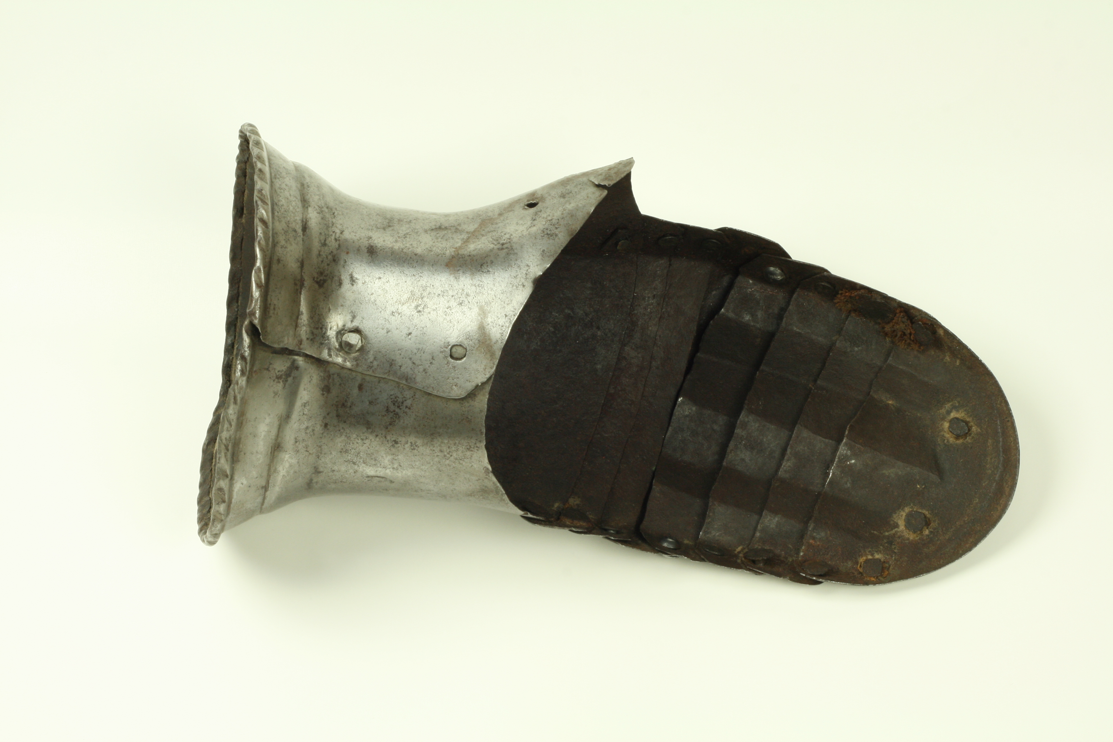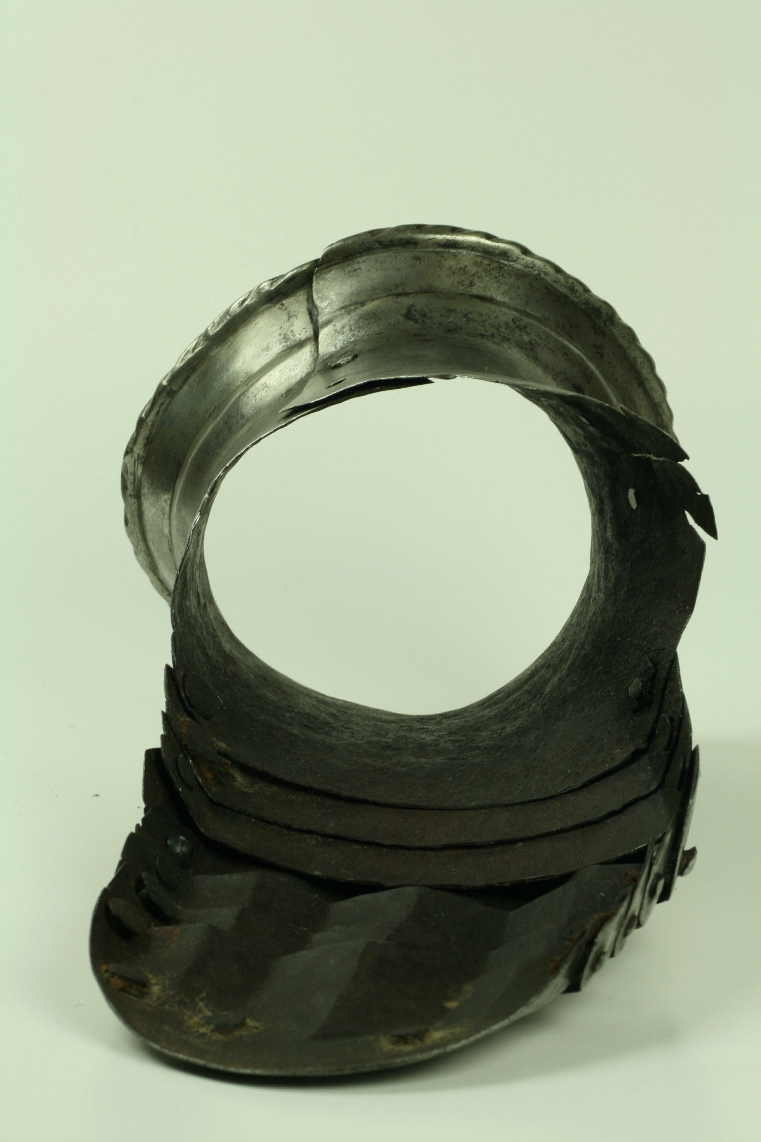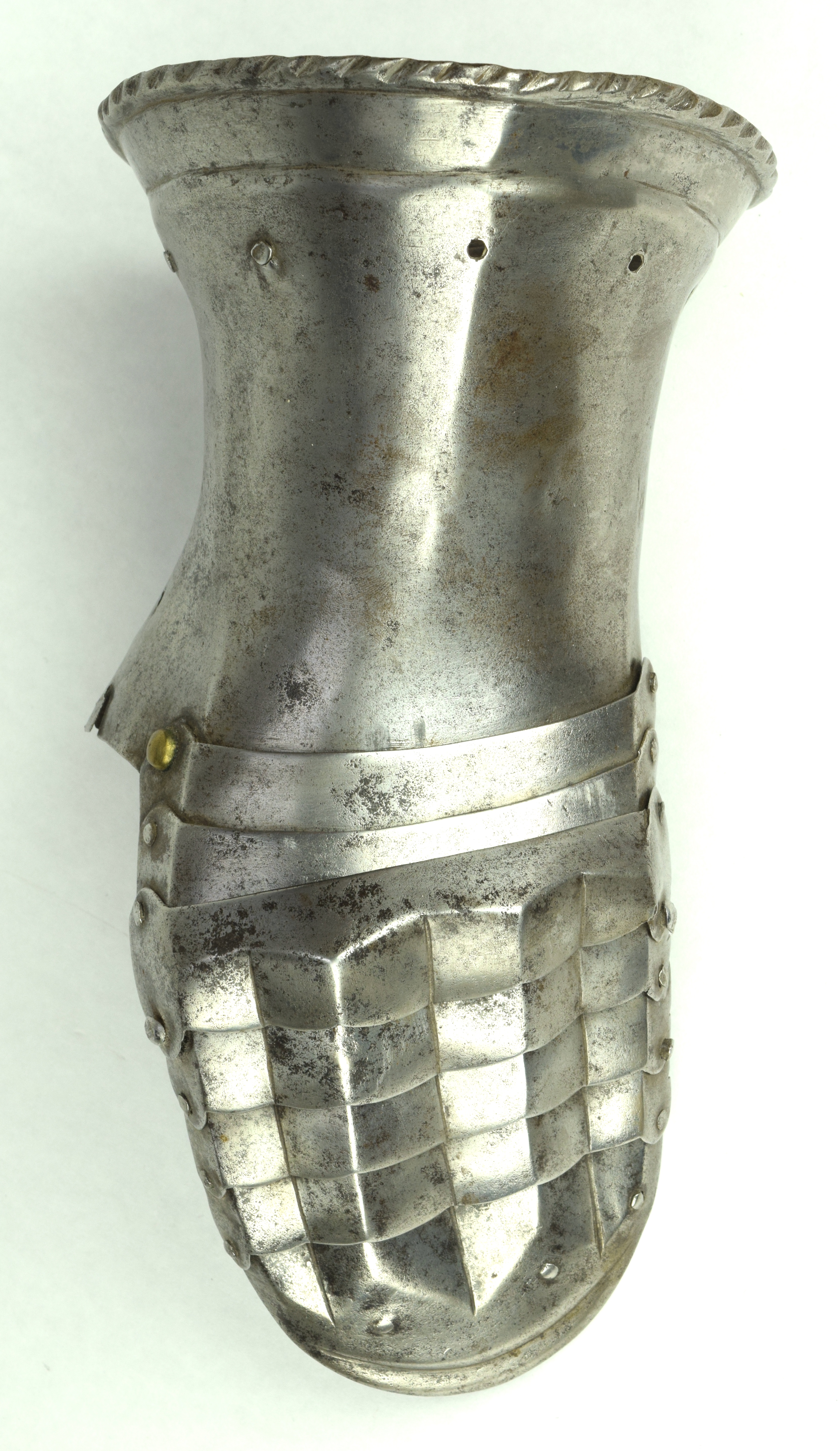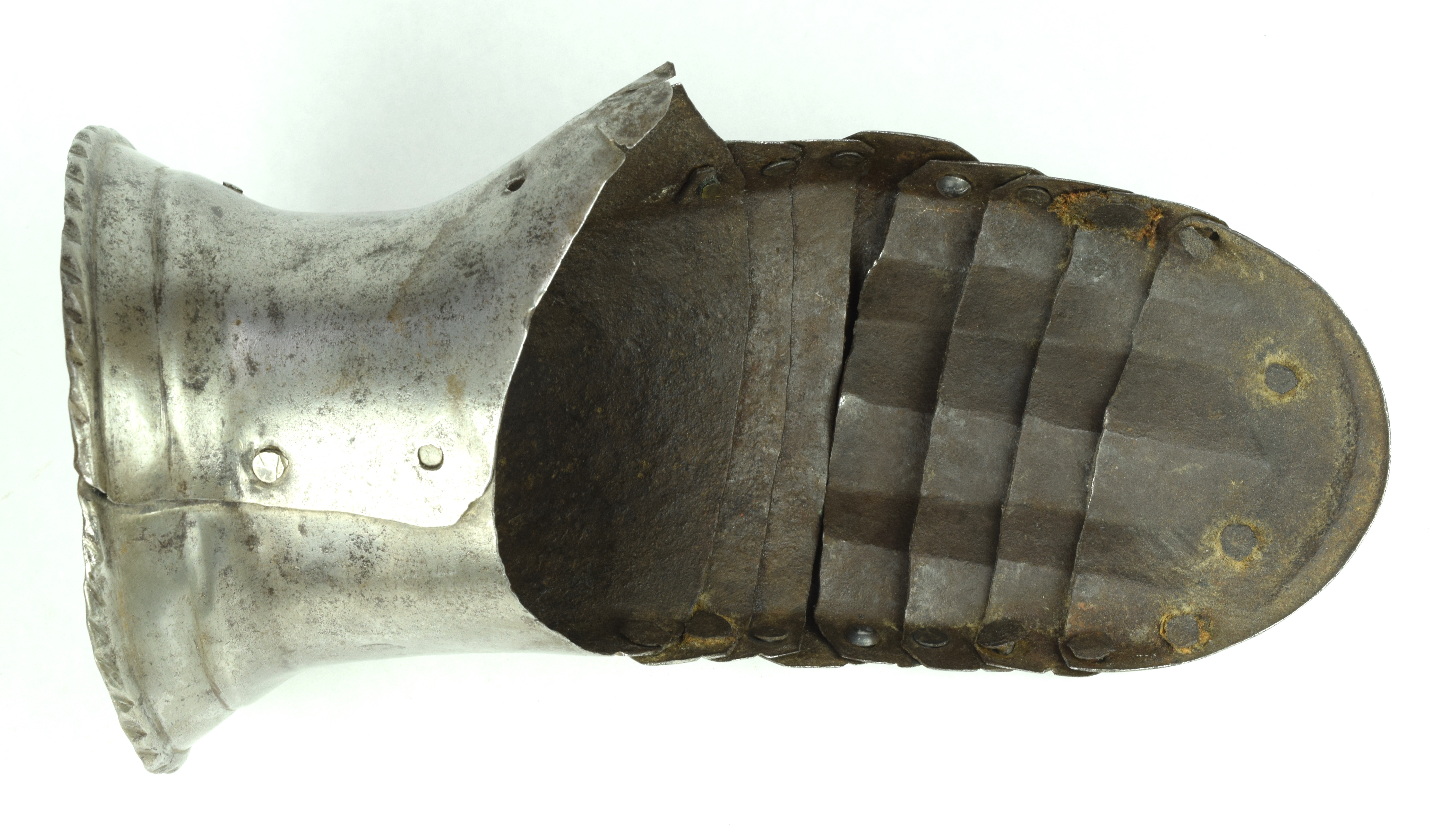 One piece cuff flaring from the wrist. Outer edge with an inward-turned, roped roll with a parallel recessed band. Central crease in the cuff. The main plate extends to cover half of the back of the hand and over the base of the thumb. The remainder of the back of the hand covered by 2 plates. The back of hand creased at the corners and at the center of the base of the thumb. Fingers covered by four plates, joined to the back of hand by a knuckle rider. The front of the knuckle rider and the fingers with fluted creases over the fingers. The end of the final finger plate with a hollow inward partial turn. The base line between the fingers accented by engraved lines. The ends of the plates are decorated with a filed notch on the end opposite the thumb. The thumb area is cracked. The form of the cracks and stiffness indicate it may have been tempered. Some original rivets remain, some replaced. The rivets on the terminal plate, articulation rivets between the last 3 plates, two of the metacarpal lame rivets, two rivets for securing the glove to the cuff and one of the rivets securing the inside of the wrist appear original. There are some small remains of fabric under some of the rivet heads. These appear to have been used to secure the glove.