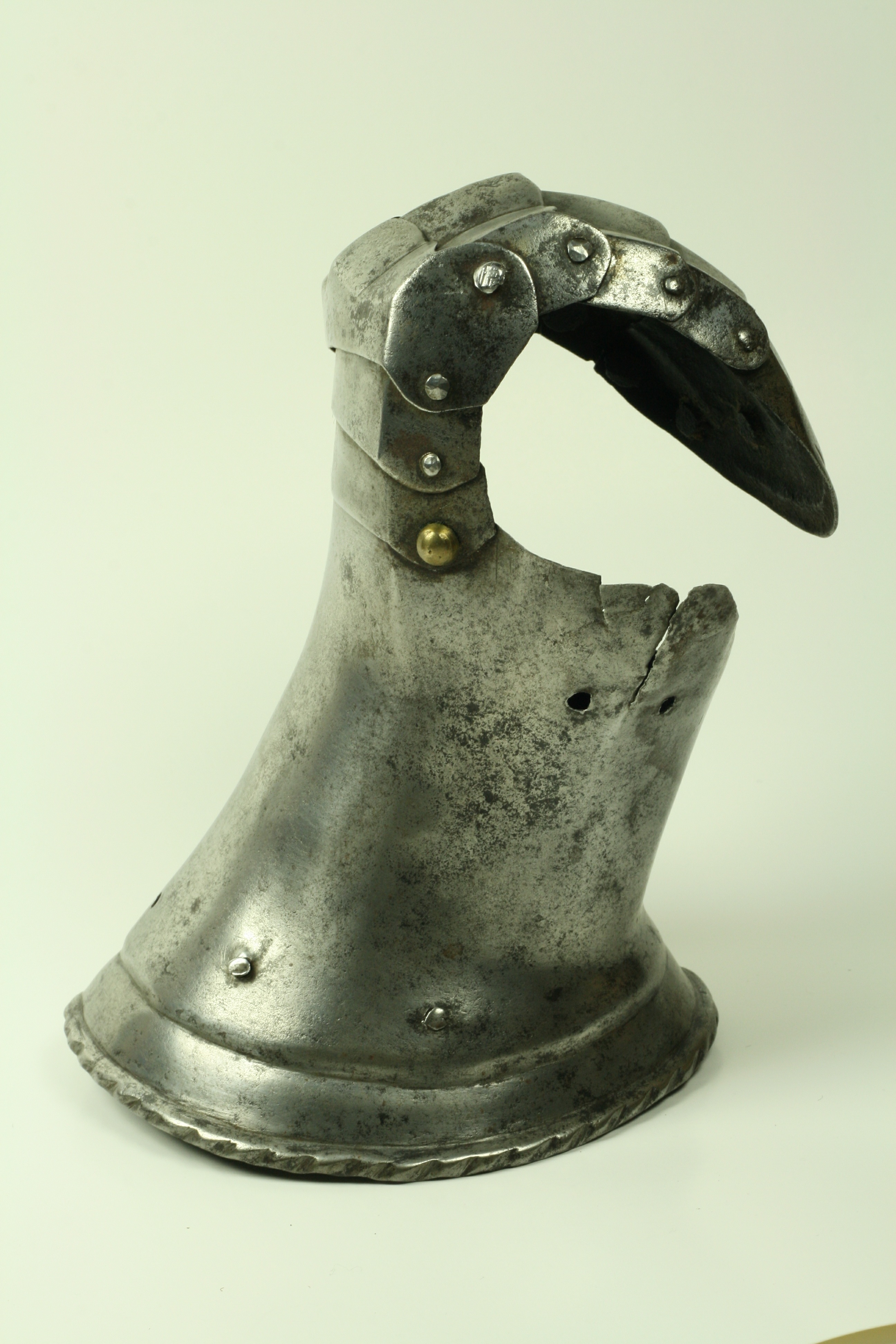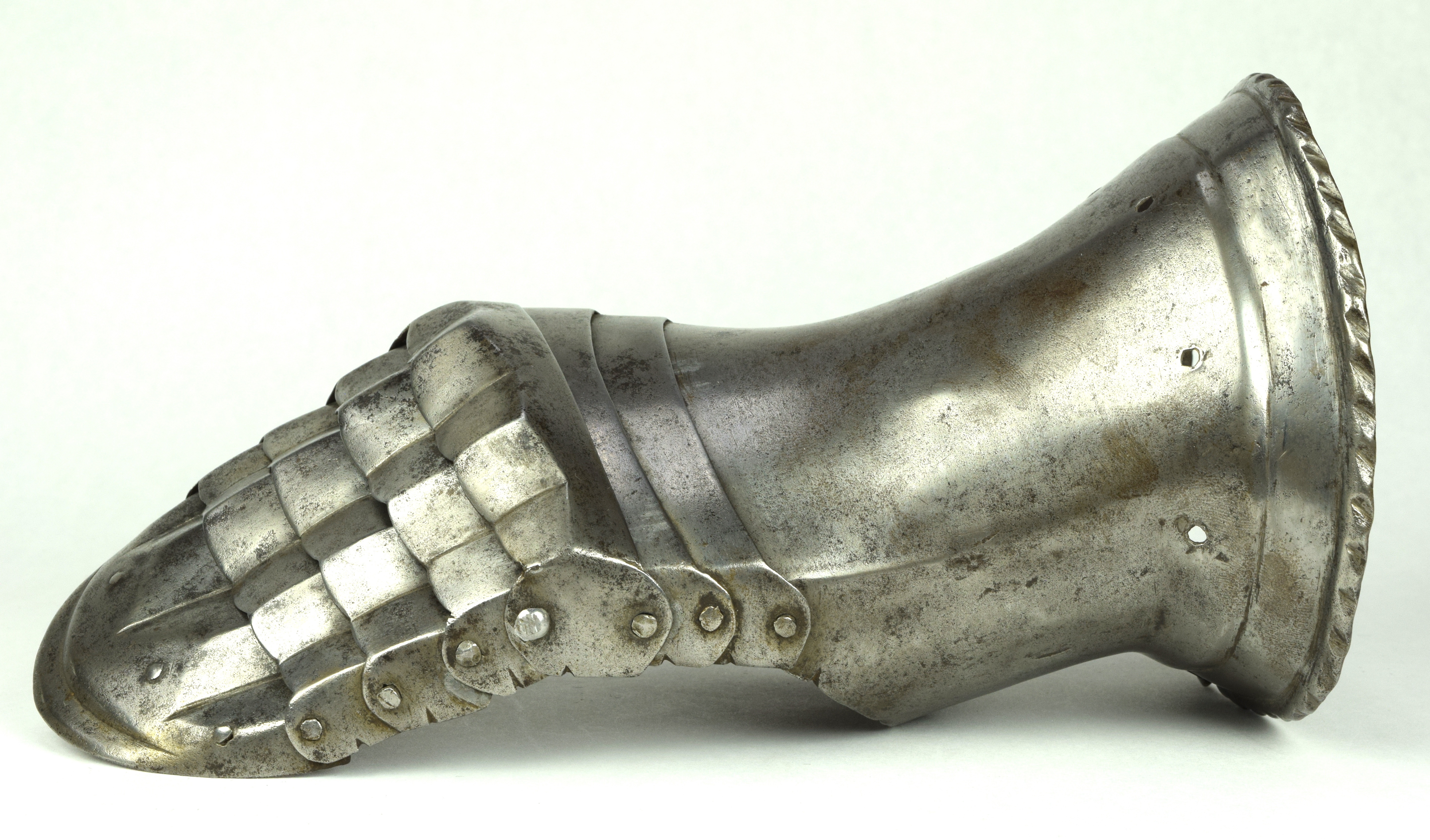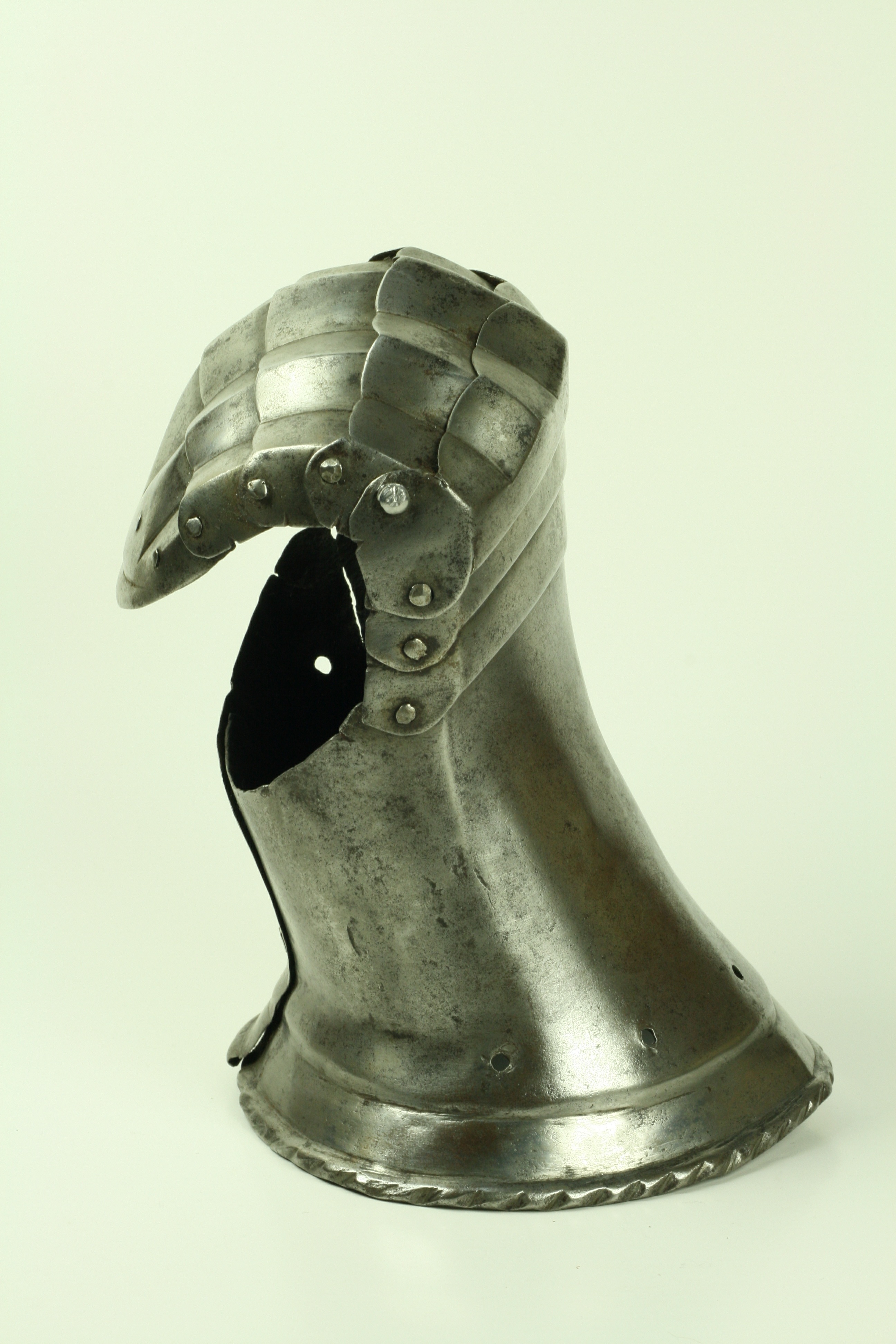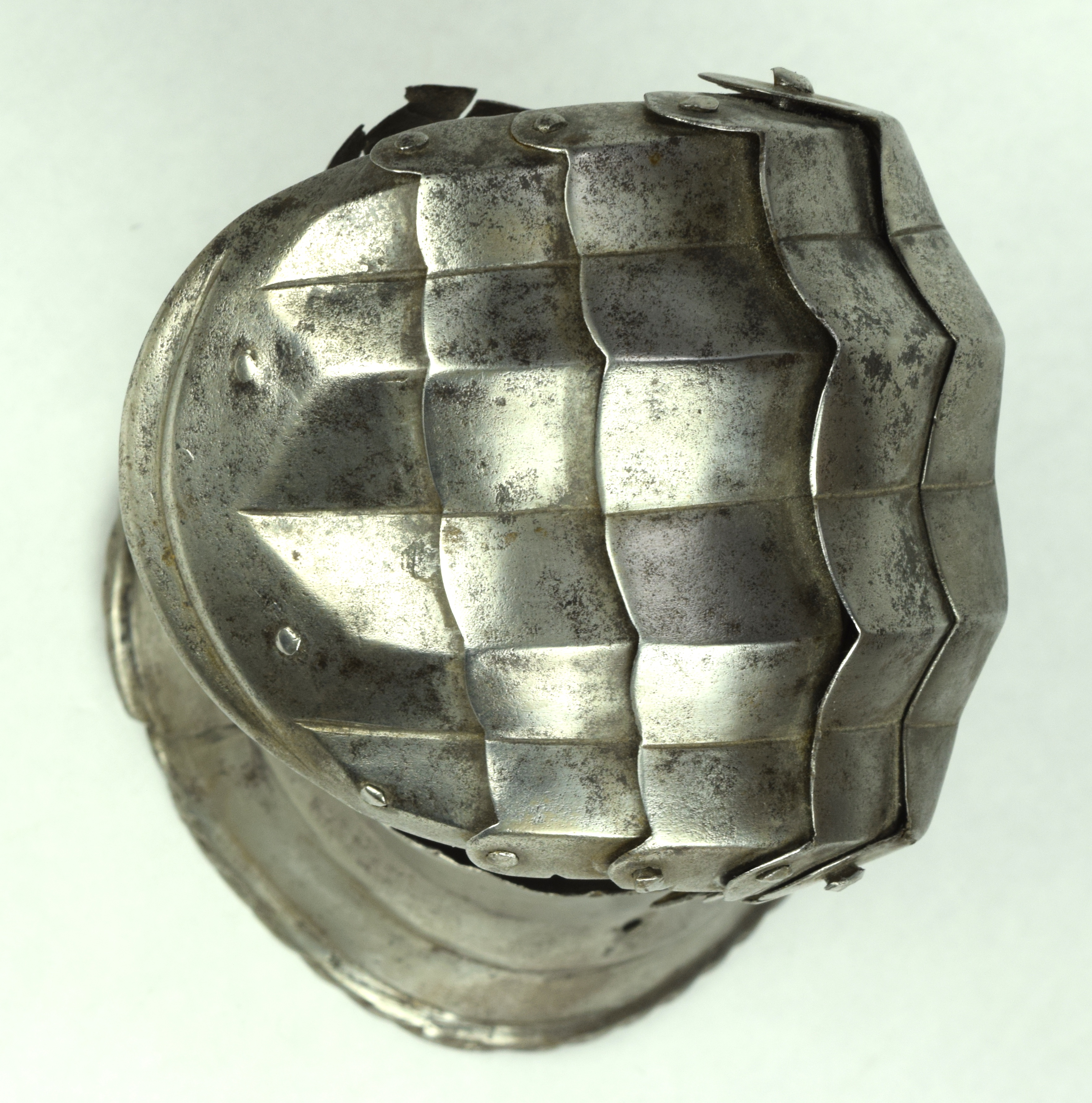 One piece cuff flaring from the wrist. Outer edge with an inward-turned, roped roll with a parallel recessed band. Central crease in the cuff. The main plate extends to cover half of the back of the hand and over the base of the thumb. The remainder of the back of the hand covered by 2 plates. The back of hand creased at the corners and at the center of the base of the thumb. Fingers covered by four plates, joined to the back of hand by a knuckle rider. The front of the knuckle rider and the fingers with fluted creases over the fingers. The end of the final finger plate with a hollow inward partial turn. The base line between the fingers accented by engraved lines. The ends of the plates are decorated with a filed notch on the end opposite the thumb. The thumb area is cracked. The form of the cracks and stiffness indicate it may have been tempered. Some original rivets remain, some replaced. The rivets on the terminal plate, articulation rivets between the last 3 plates, two of the metacarpal lame rivets, two rivets for securing the glove to the cuff and one of the rivets securing the inside of the wrist appear original. There are some small remains of fabric under some of the rivet heads. These appear to have been used to secure the glove.