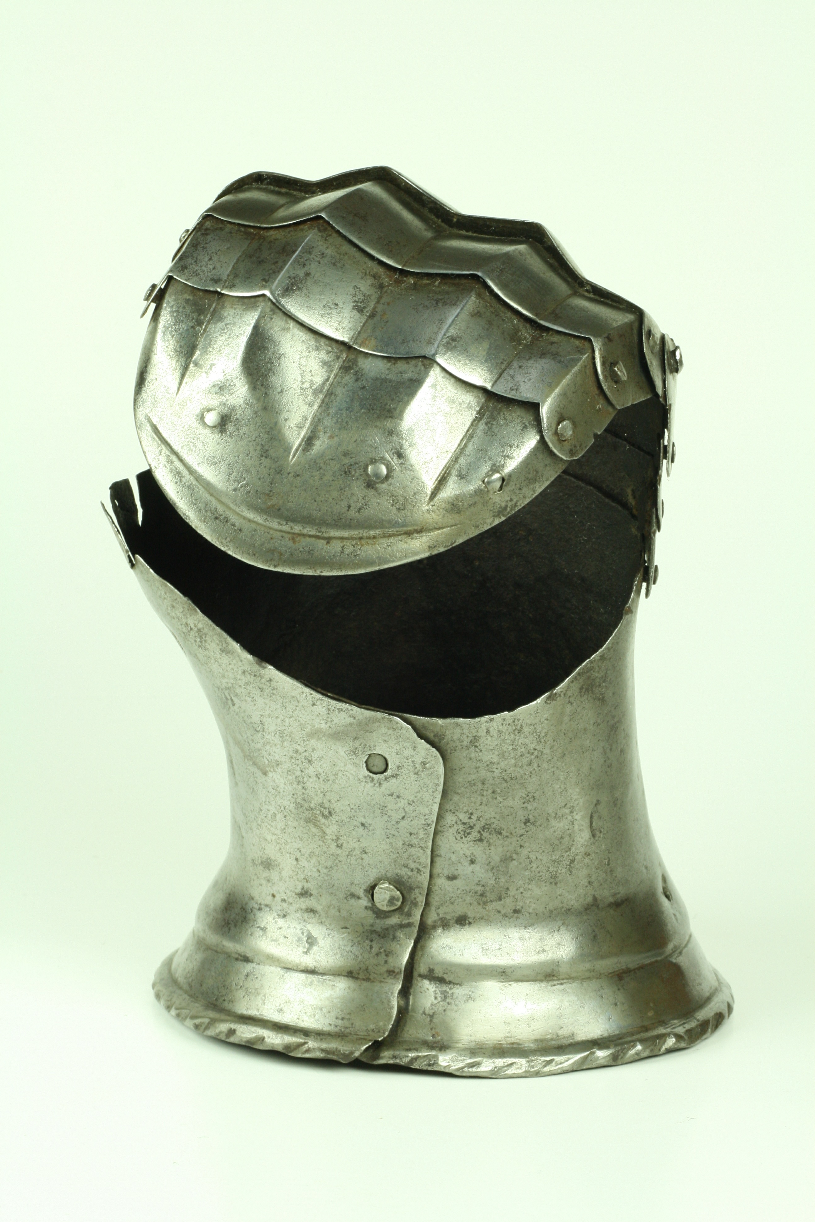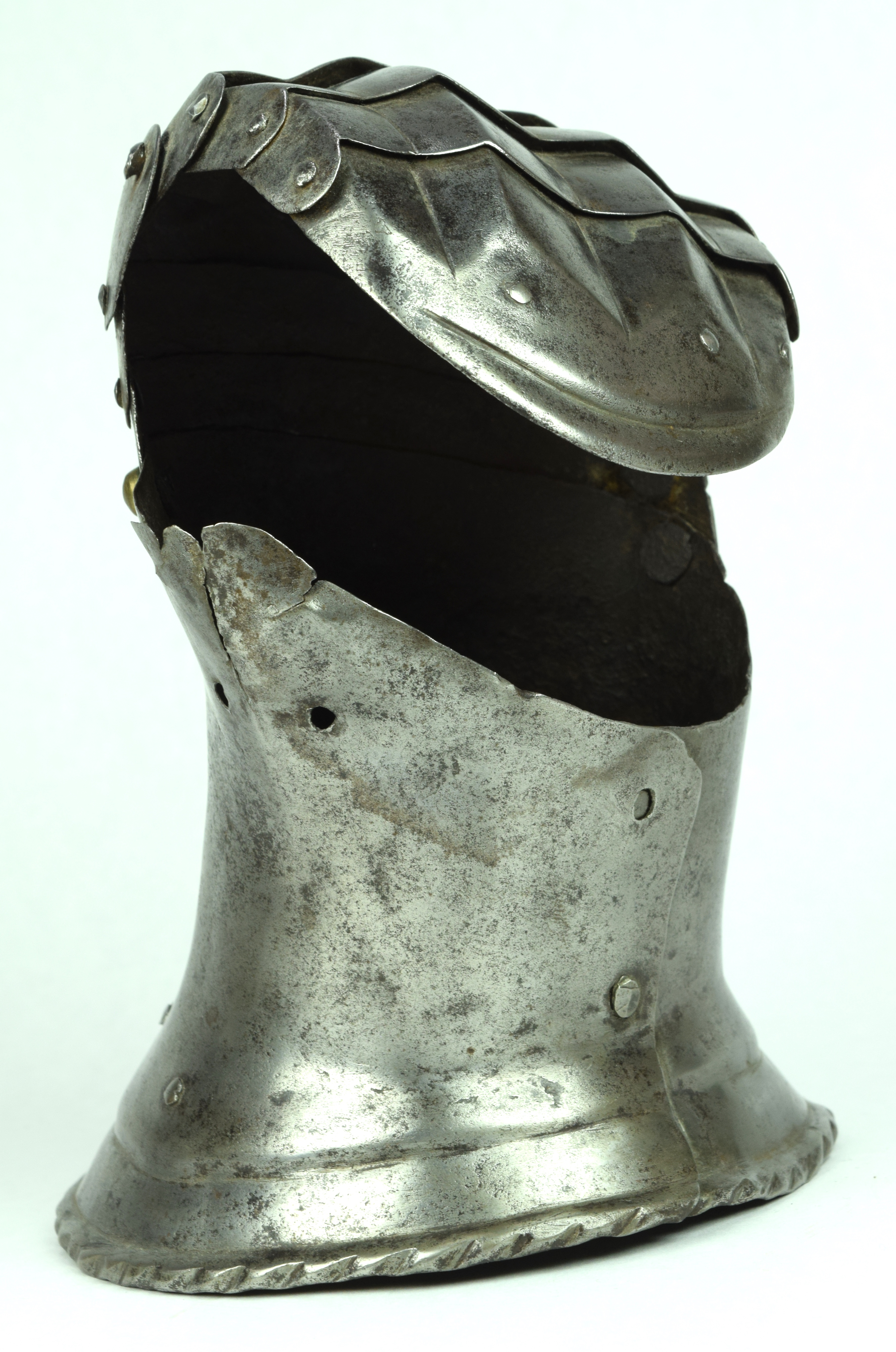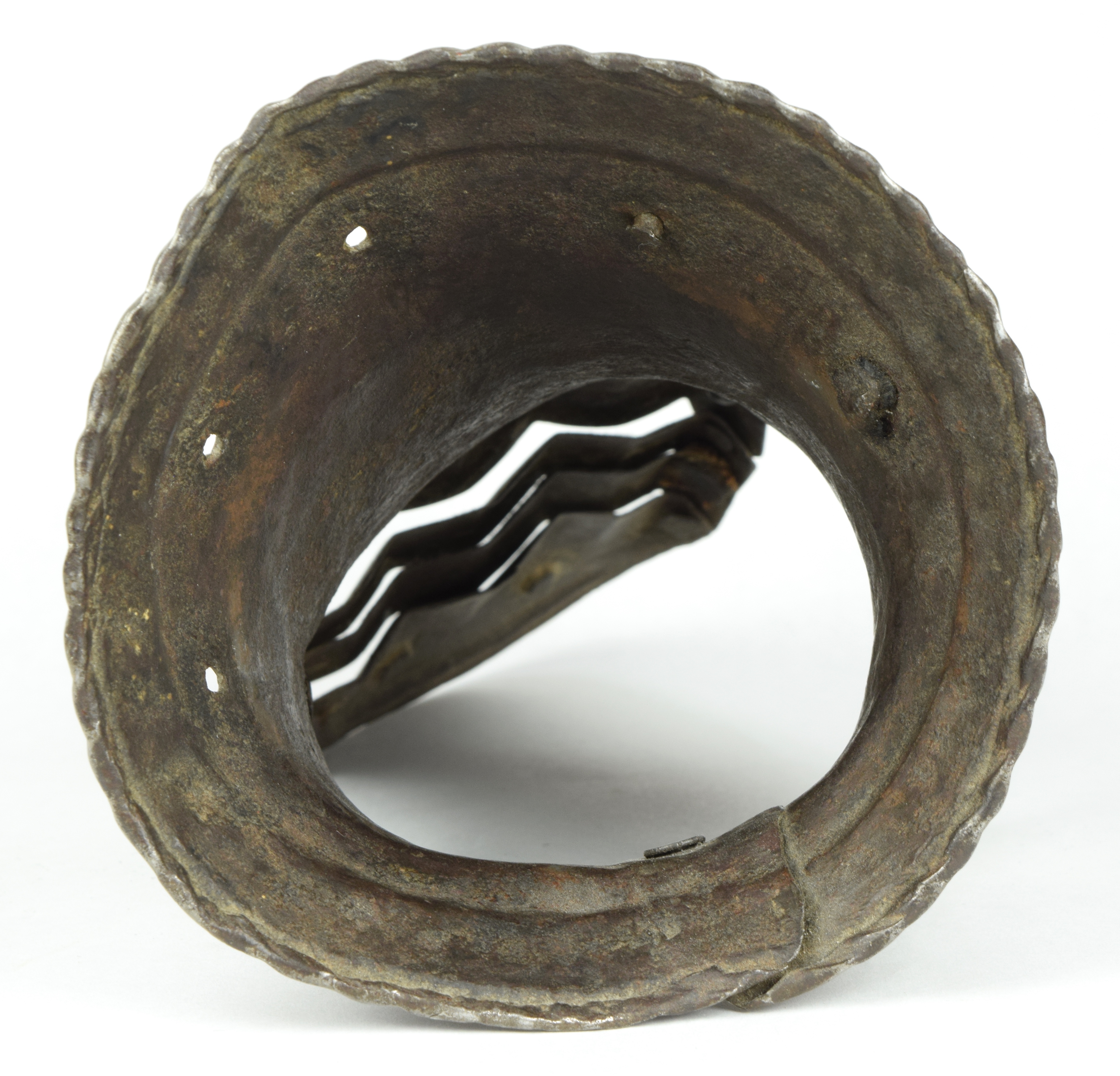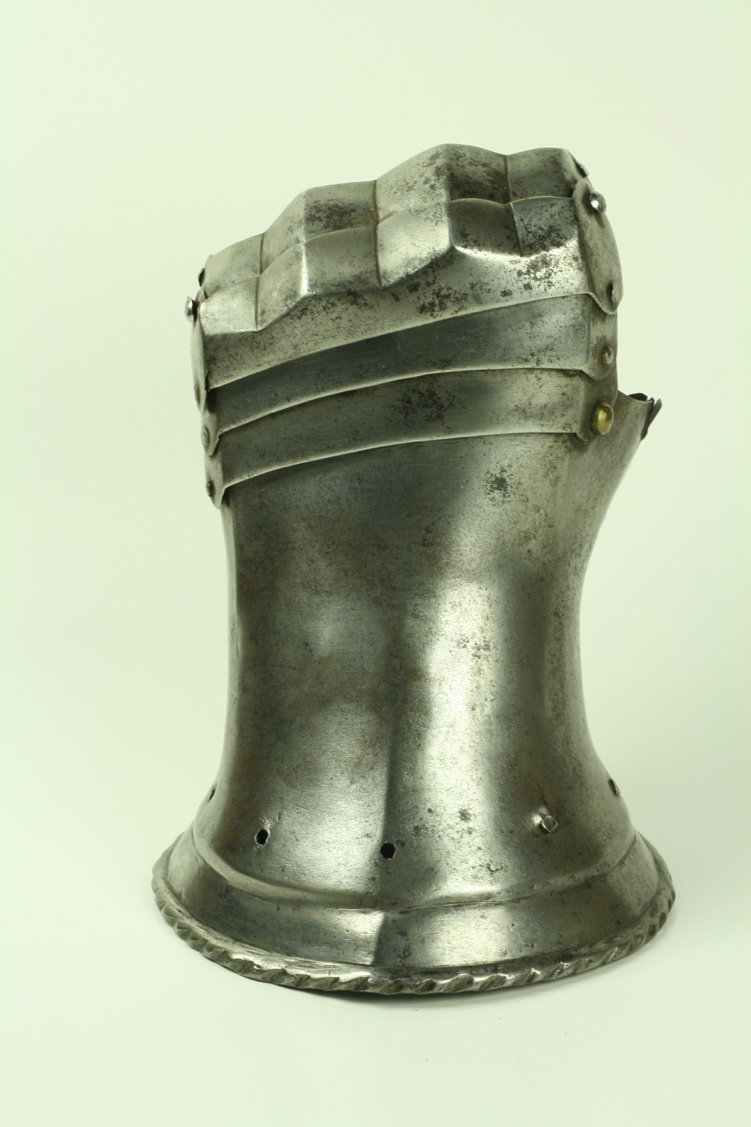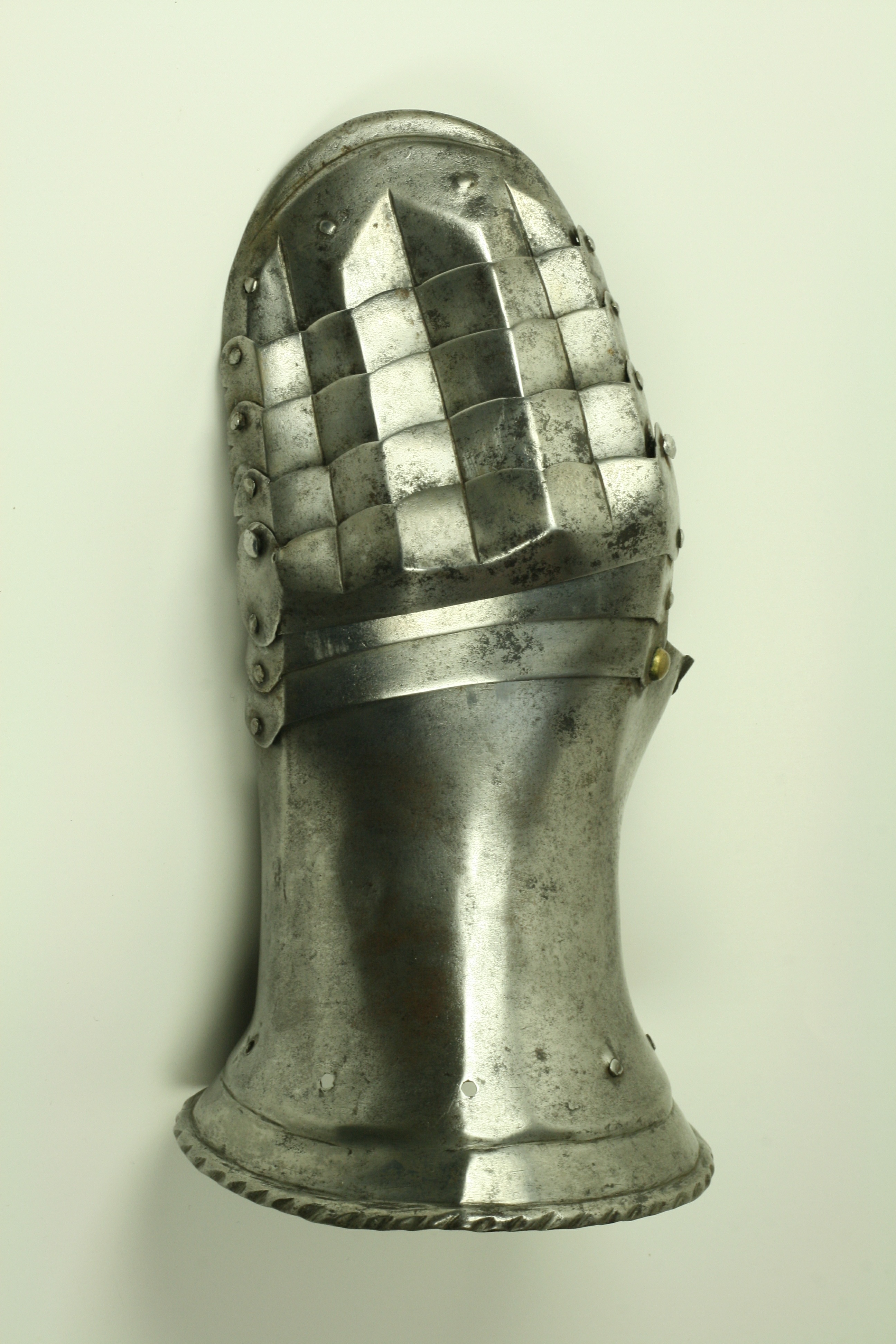 One piece cuff flaring from the wrist. Outer edge with an inward-turned, roped roll with a parallel recessed band. Central crease in the cuff. The main plate extends to cover half of the back of the hand and over the base of the thumb. The remainder of the back of the hand covered by 2 plates. The back of hand creased at the corners and at the center of the base of the thumb. Fingers covered by four plates, joined to the back of hand by a knuckle rider. The front of the knuckle rider and the fingers with fluted creases over the fingers. The end of the final finger plate with a hollow inward partial turn. The base line between the fingers accented by engraved lines. The ends of the plates are decorated with a filed notch on the end opposite the thumb. The thumb area is cracked. The form of the cracks and stiffness indicate it may have been tempered. Some original rivets remain, some replaced. The rivets on the terminal plate, articulation rivets between the last 3 plates, two of the metacarpal lame rivets, two rivets for securing the glove to the cuff and one of the rivets securing the inside of the wrist appear original. There are some small remains of fabric under some of the rivet heads. These appear to have been used to secure the glove.