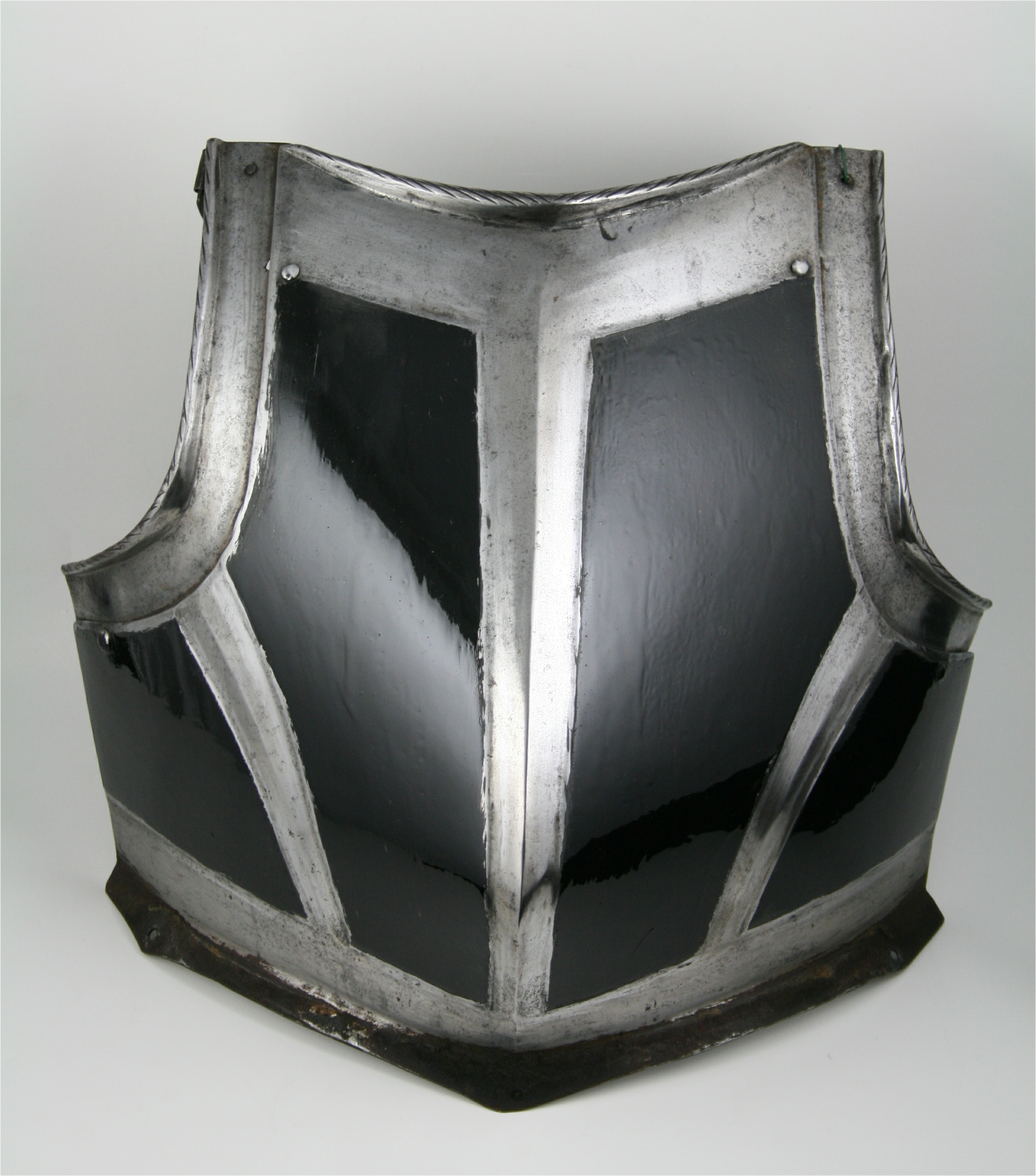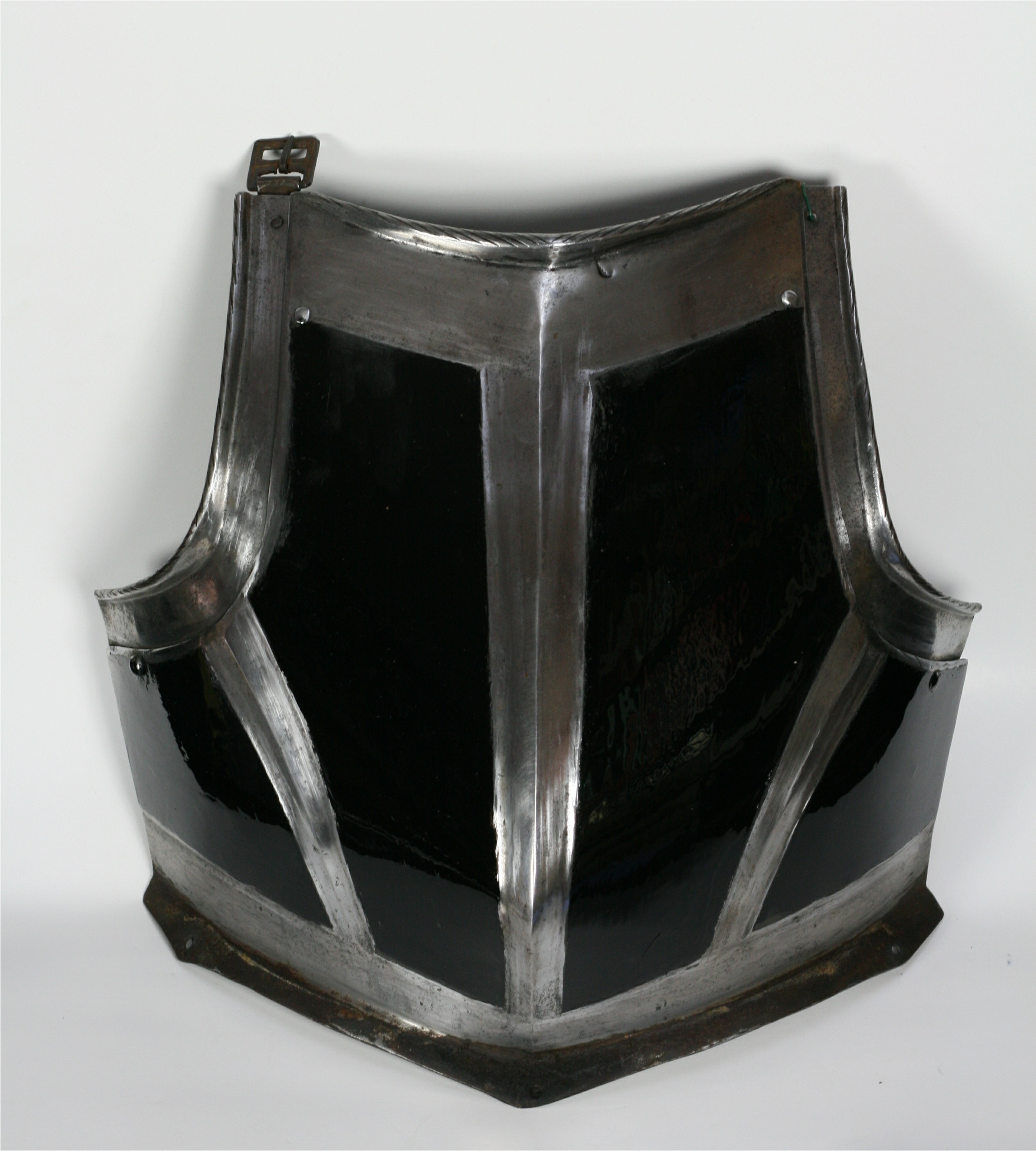 Black and white with a pronounced point below the center of the chest. Neck bordered by an inward turned, tapered, roped roll. Arm holes bordered by sliding gussets with inward turned, tapered, roped rolls. Waist flared for the fauld. Breast decorated with recessed polished bands, the overall surface rough from the hammer. There is an indistinct mark at the neck. Reblackened. There are buckles which appear to have been manufactured by being pierced from sheet at the shoulders. They attach to the inside of the gussets. This would suspend the breastplate and serve to return the gussets to the outward position. One missing its tongue and detatched.