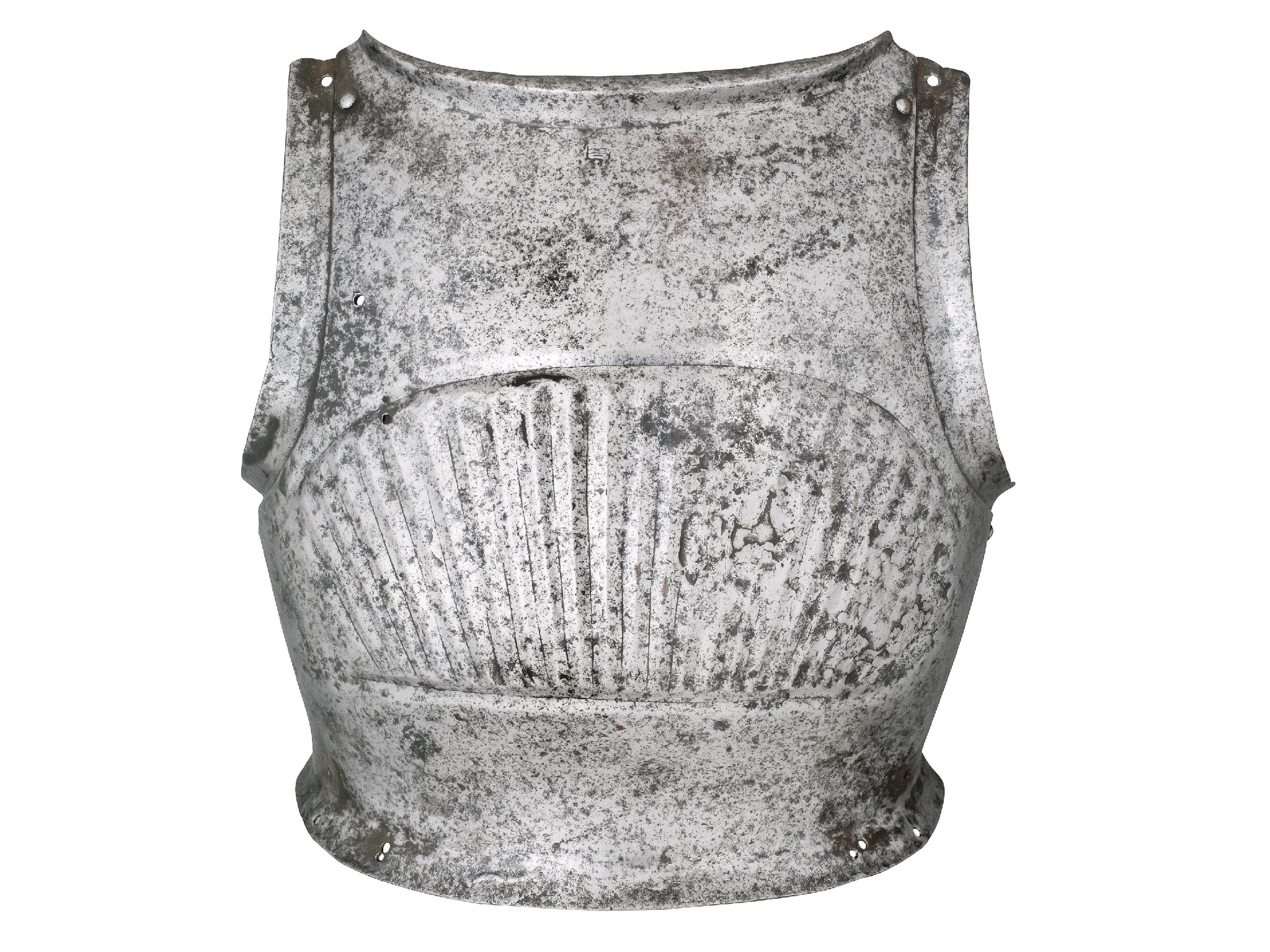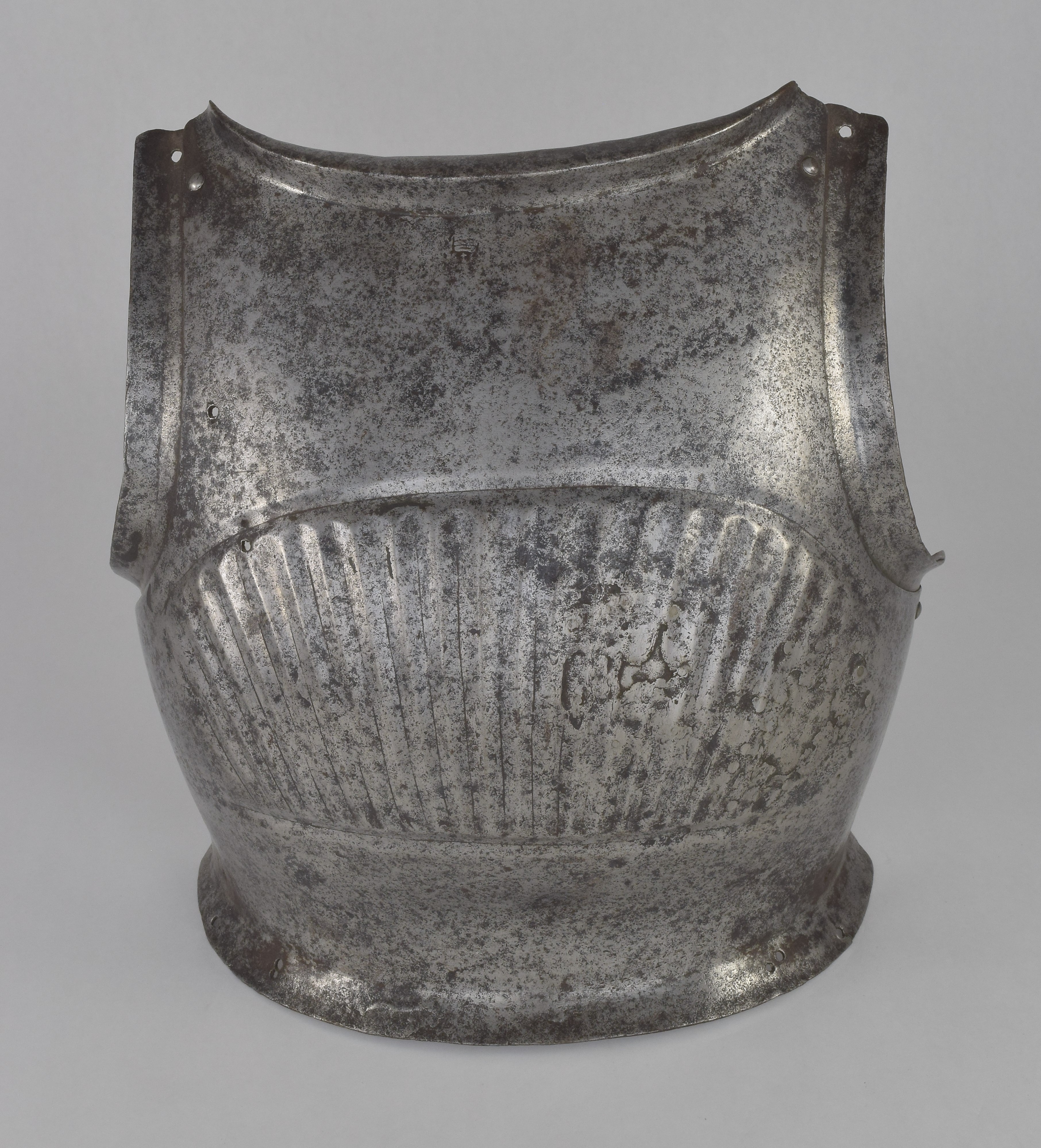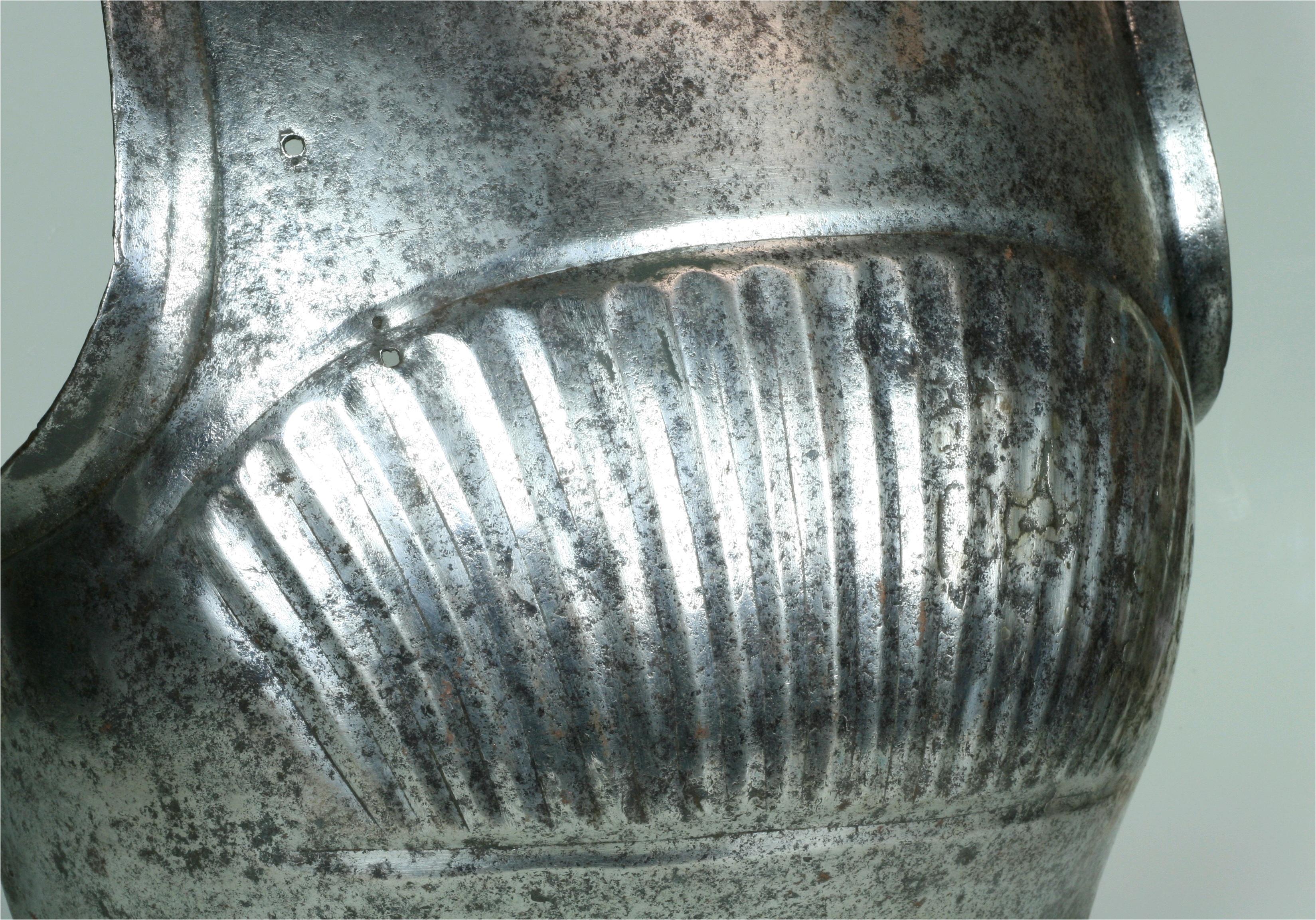 Italian fluted in a German style. Formed with a deep globose shape. Rolled at the neck with a large, angular inward turn. Arm holes bordered by gussets which are formed with a flare with the edge bent back, not a full roll. This style of simplified gusset appears on very late 15th and early 16th c. munition pieces. The waist is flared for a fauld. The center of the breastplate is fluted with a series of parallel vertical flutes terminated by a recessed band at the top and bottom. All of the flutes are accentuated by engraved lines. Marked below the center of the neck hole with a maker's mark - possibly a crowned crossbow bolt. Given the thickness this breastplate was most likely intended for infantry or light cavalry use with later holes for a lance rest. Two later internal patches. Fauld lames missing. Similar breastplates are preserved in the Museo Stibbert Florence (cat. no. 5) which is more complex and has roped rolls, Windsor castle, Mendlesham church in Suffolk, England, the Cleveland Museum of Art (with roped rolls on the gussets, inv. num. 1916.1640), Art Institute of Chicago (part of infantry armor dated 1510-15 inv. 1982.2427b-f) and the Schweizerisches Landesmuseum, Zurich - which is very similar, displayed in the arms drill display with other early 16th c. infantry armour.